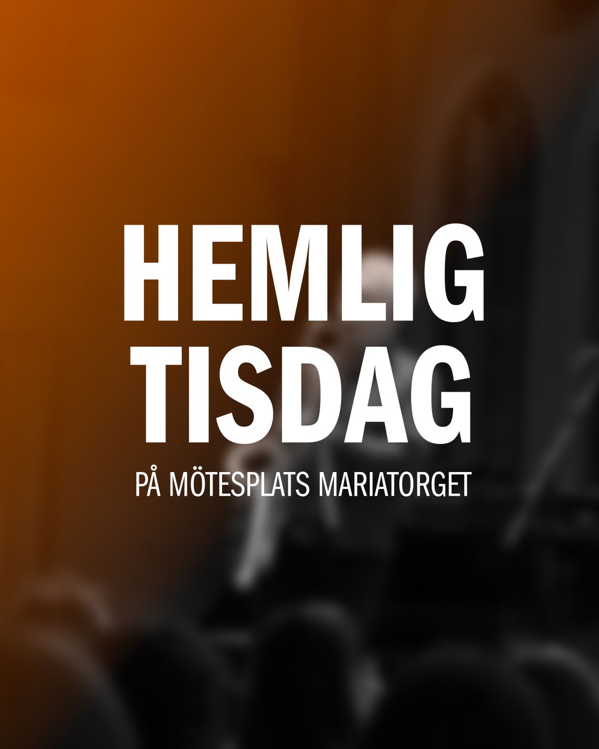 Hemlig Tisdag är kvällen där du inte vet vad som väntar – bara att det blir bra. 2–4 akter. Allt hemligt. Musik, performance, spoken word, konst eller något helt annat. Vem som helst. Vad som helst. Du får veta när det händer.