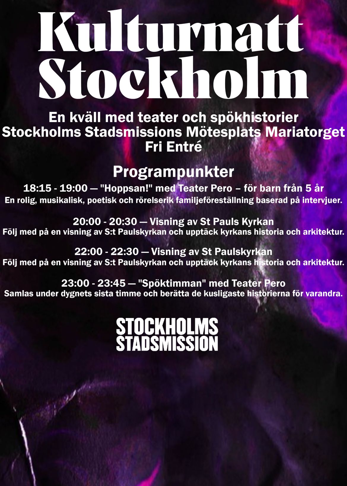 Välkommen till en kväll av musikaliska teaterföreställningar, kyrklig arkitektur och rysliga spökhistorier när Stockholms Stadsmissions Mötesplats Mariatorget slår upp dörrarna och bjuder in till Kulturnatt!