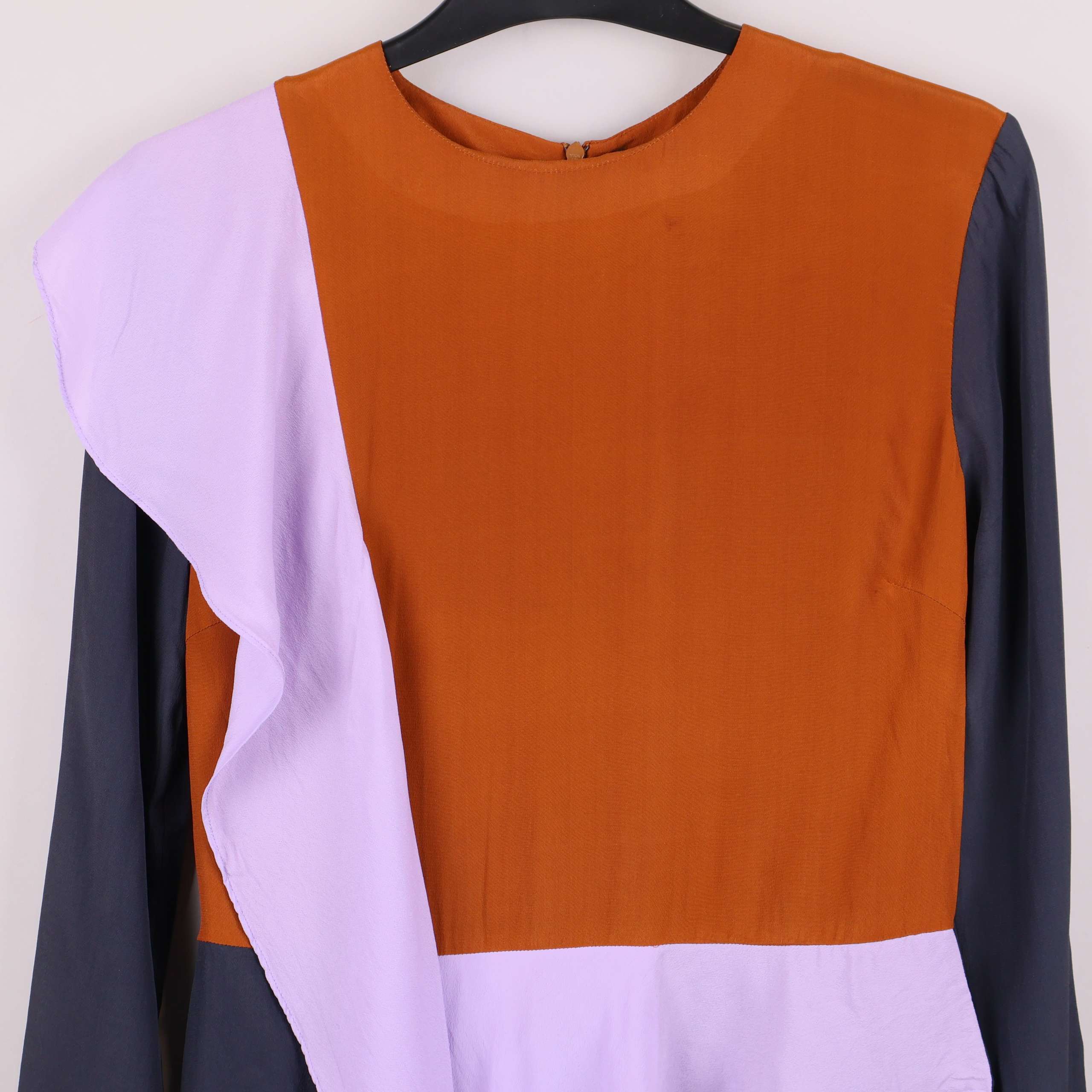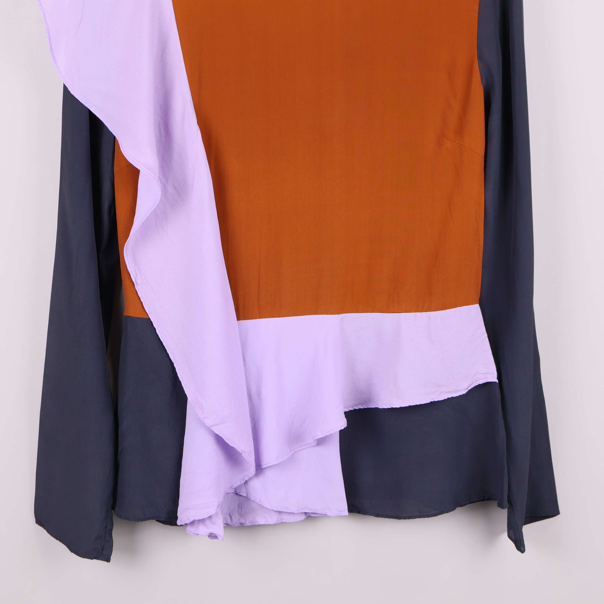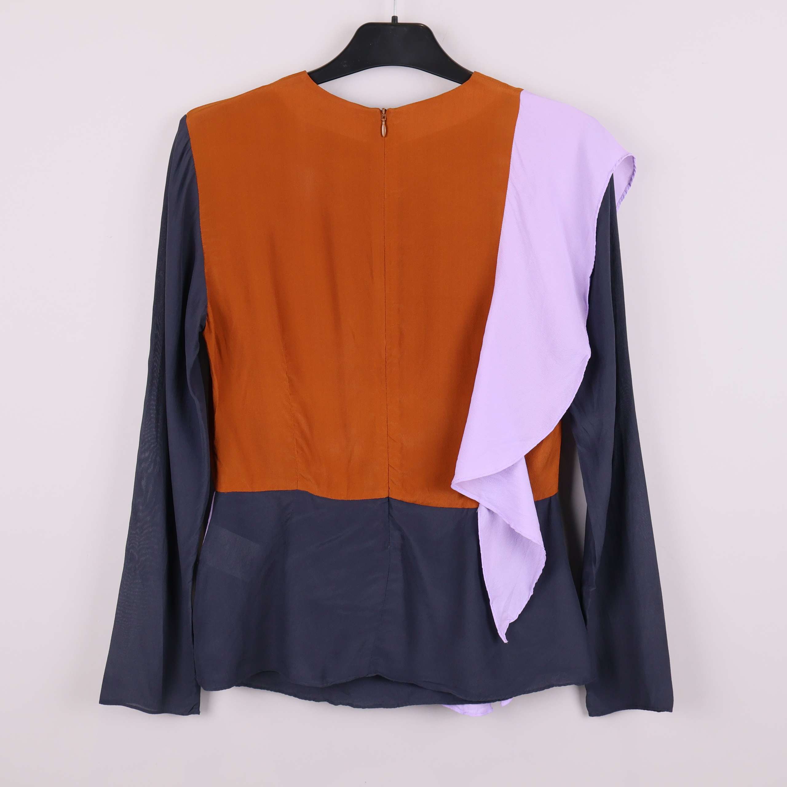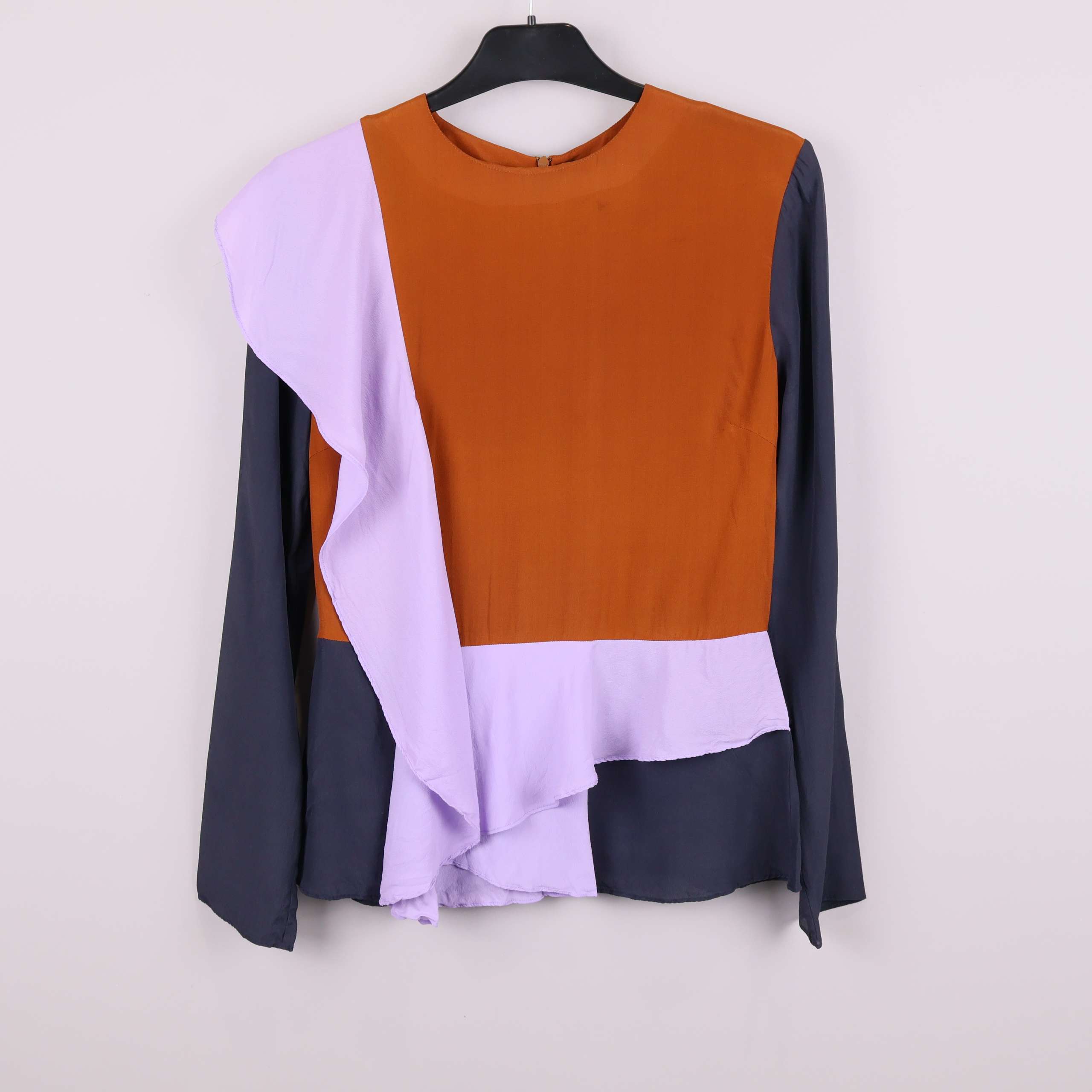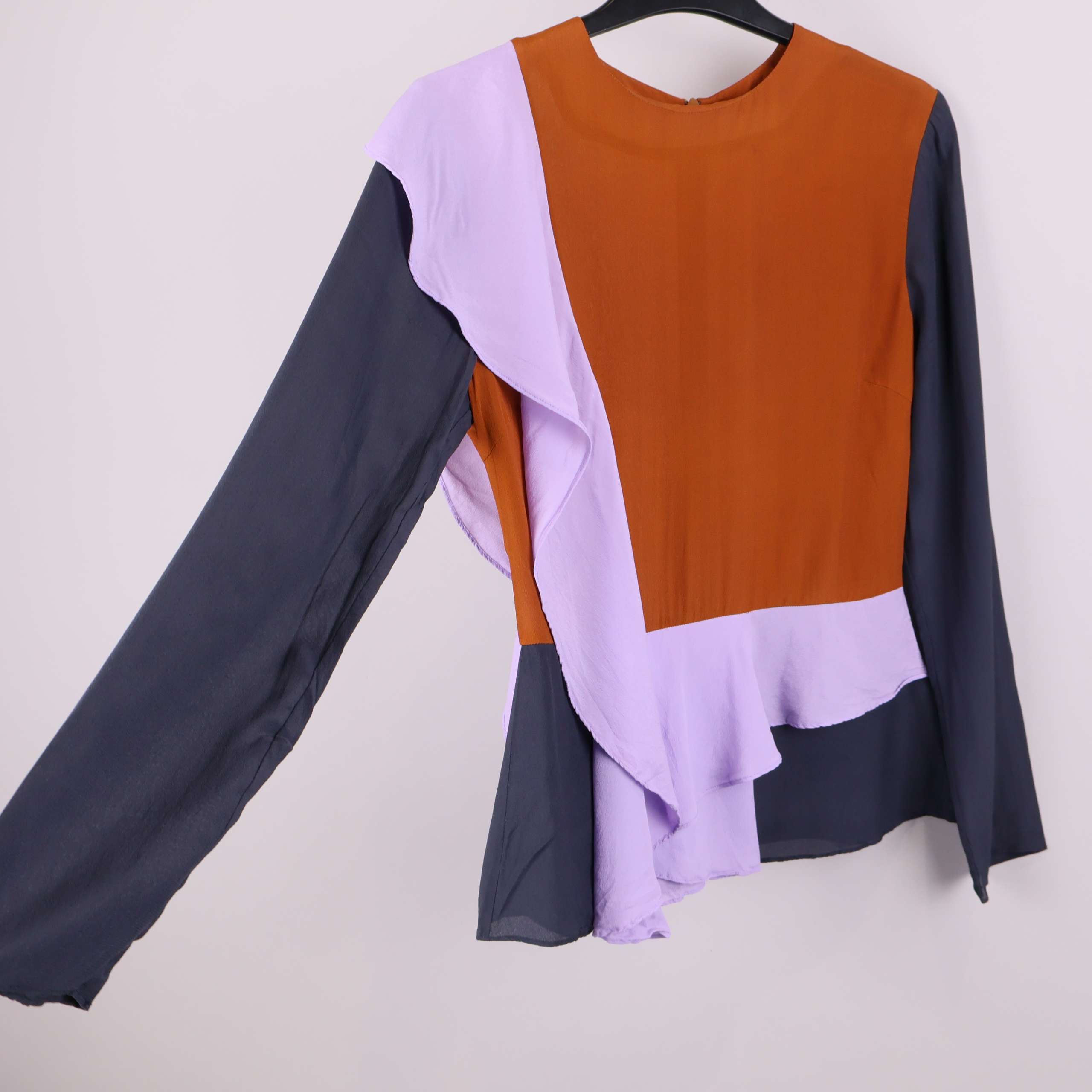 Modern blus i blockfärgad design med accent i lila, brunt och mörkblått. Den har långa ärmar, rund halsringning och en iögonfallande asymmetrisk volang som ger en unik siluett. Lätt, mjukt tyg ger en luftig känsla och blusen har dold dragkedja bak för smidig påklädning. Passar dig som vill ha ett statement-plagg med konstnärlig touch.