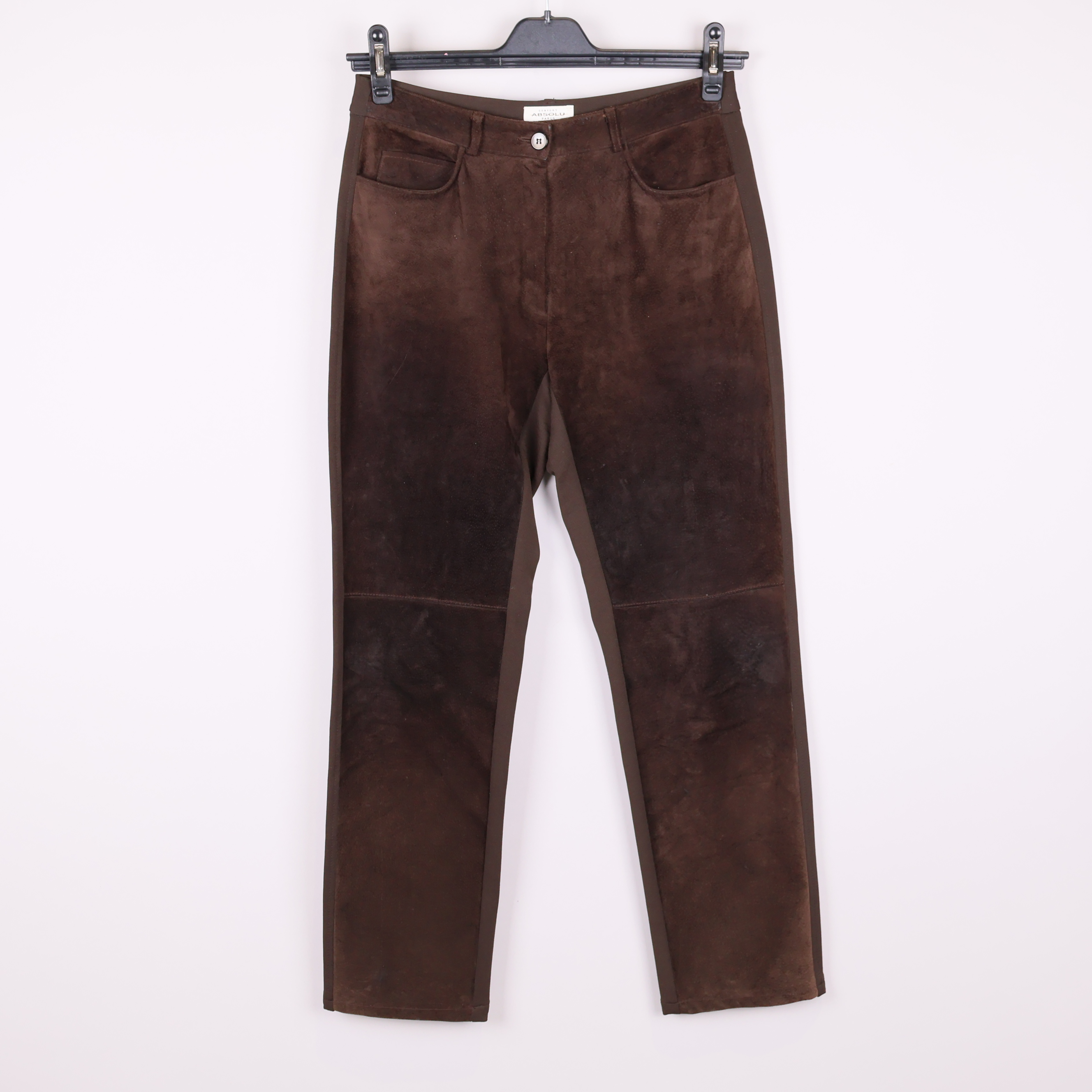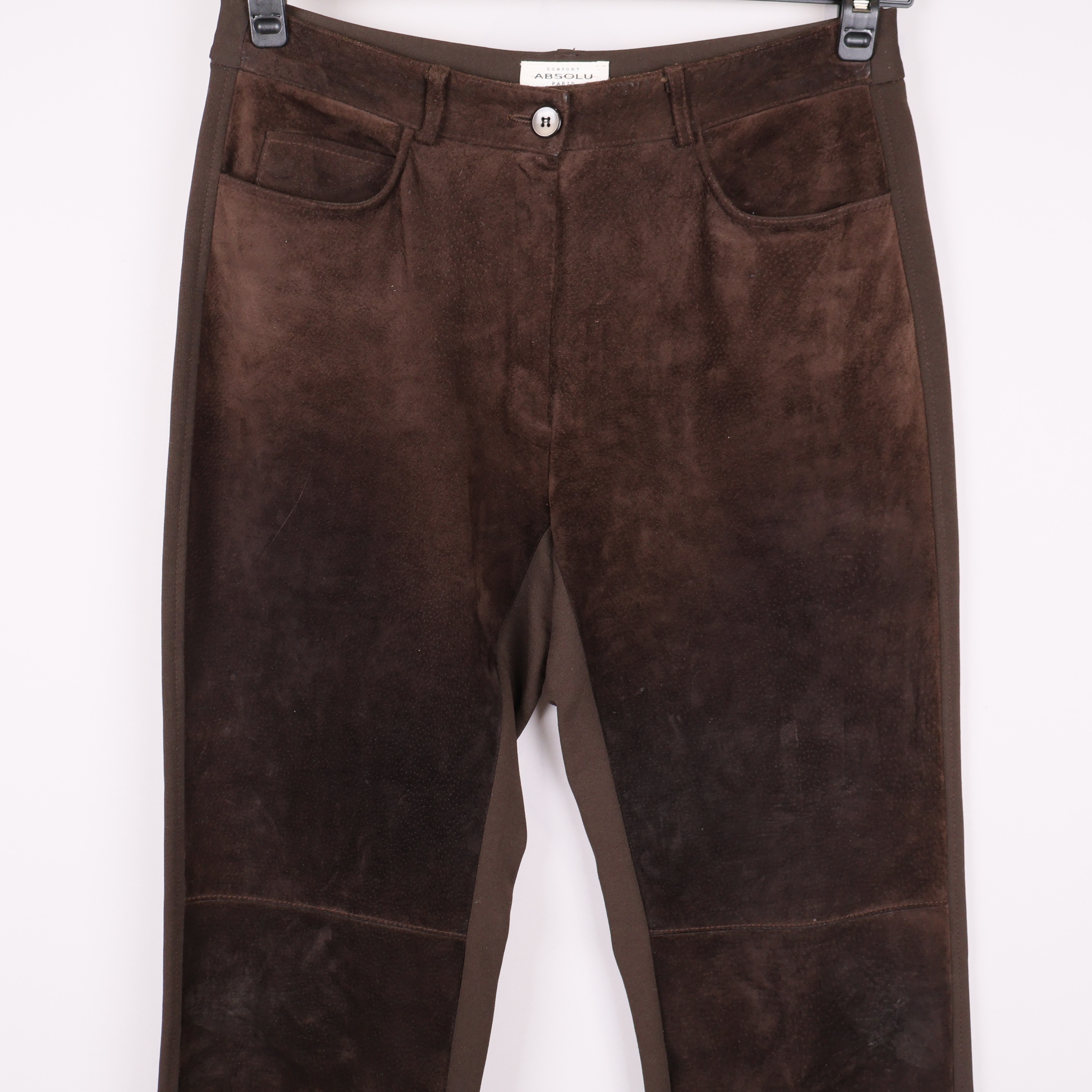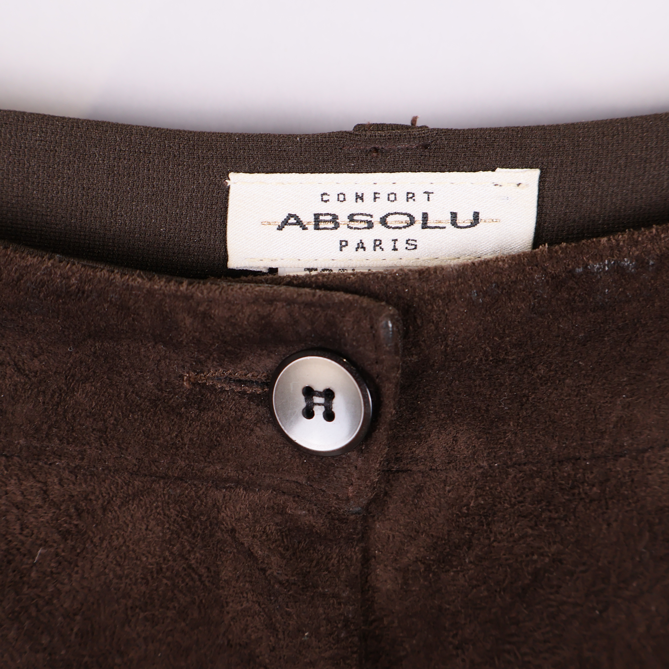 Dessa byxor från Absolu Paris har en lyxig, mjuk mocka yta frampå i övrigt velour, djup brun färg som känns både klassisk och modern. De raka benen och de synliga sömmarna ger en stilren look, medan den stretchiga kvaliteten bidrar till bekväm komfort.