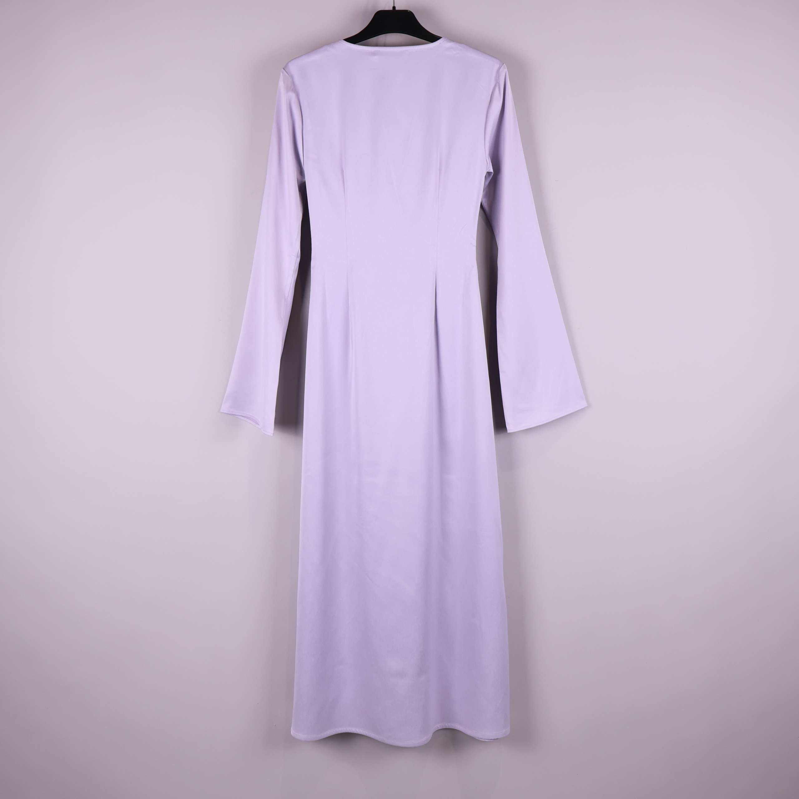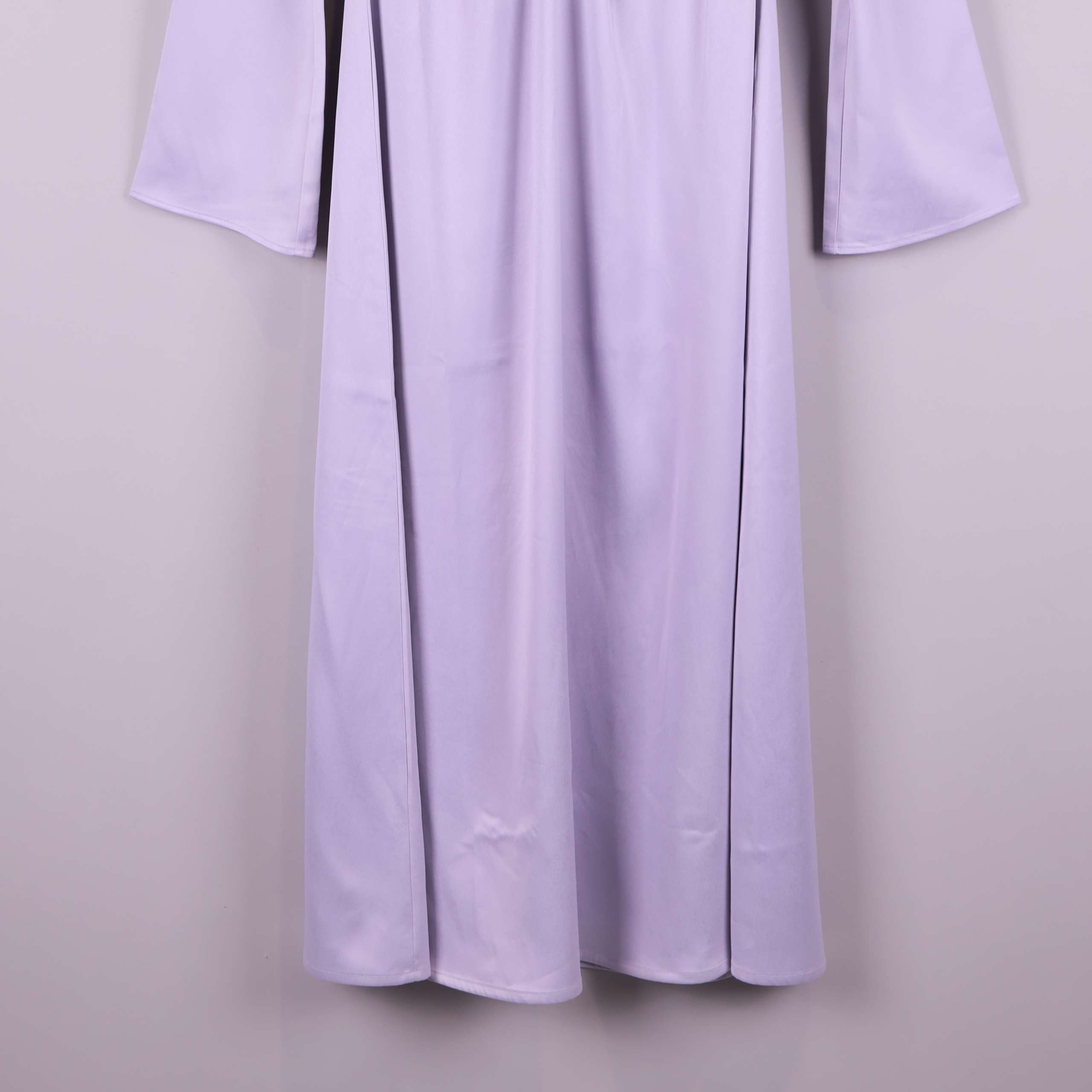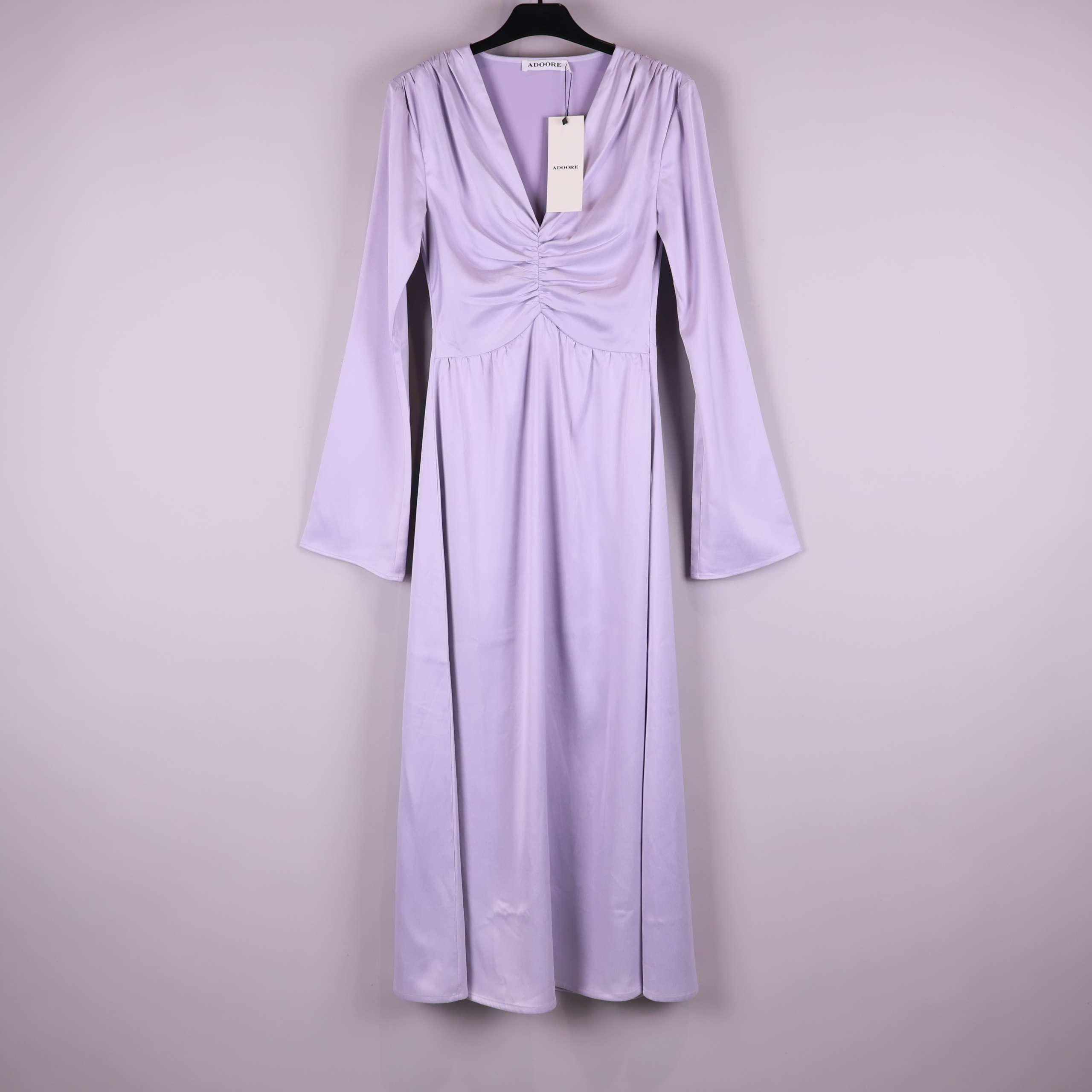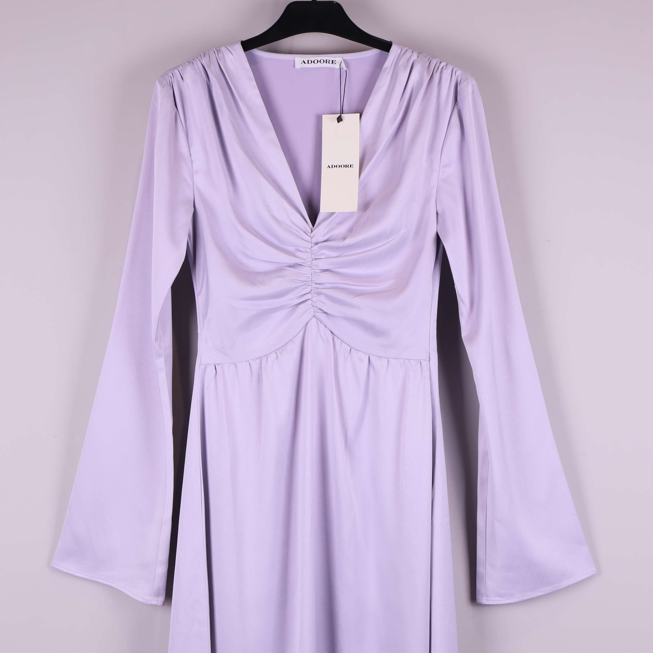 Ljuslila midi-klänning med elegant rynkad byst och långa vida ärmar. Klänningen har en mjukt fallande passform och slät, något glansig yta som ger en dressad och modern känsla. Perfekt för dig som vill ha ett stilrent plagg med en feminin siluett och en touch av vintage vibe. Enkel att bära till fest eller vardag när du vill känna dig extra fin.