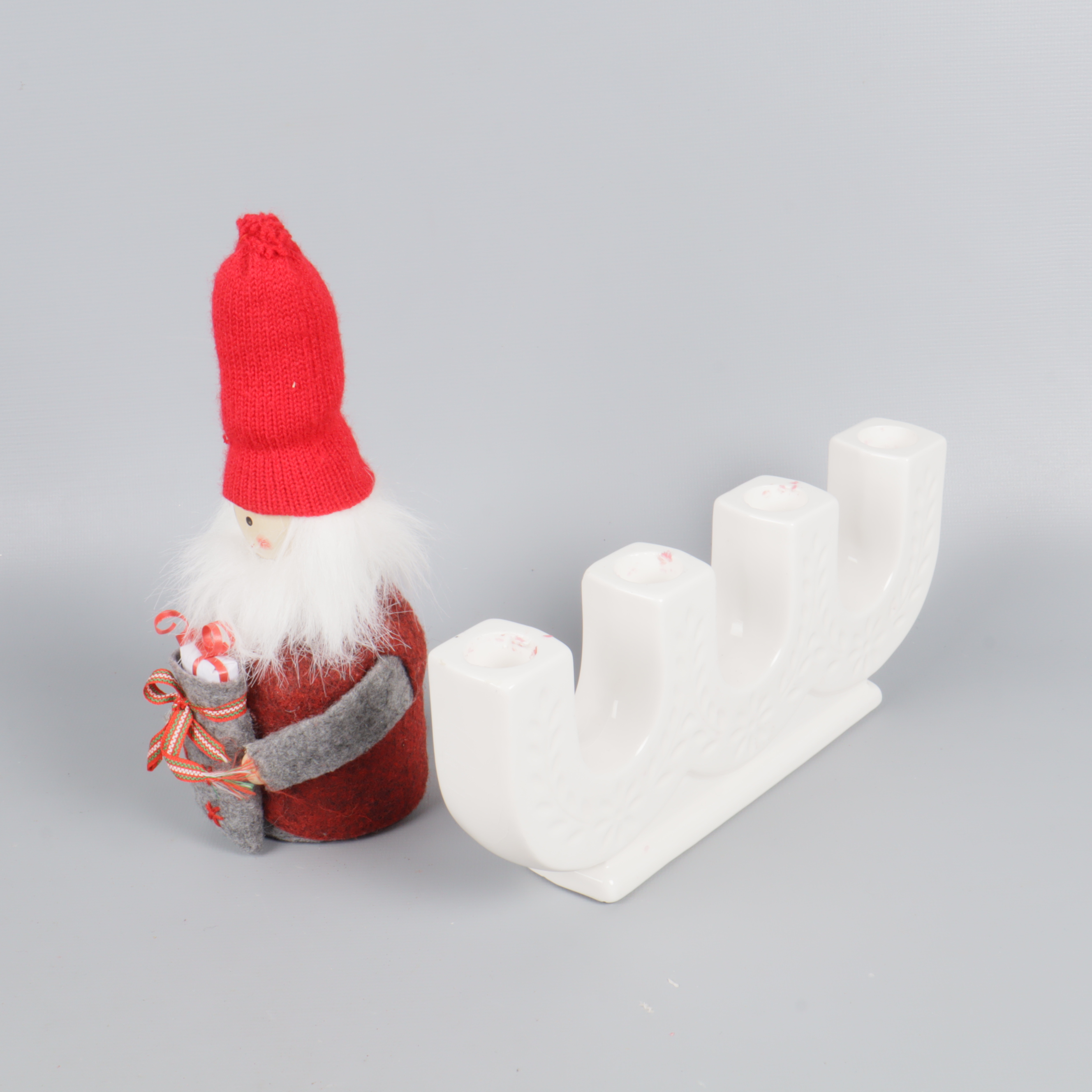 Julig adventsljusstake i vit med stilren och lekfull design, kompletterad av röda kulor och en tomtefigur. Perfekt för att skapa en mysig och festlig känsla med klassiska detaljer och färger som ger en harmonisk helhet till hemmets vinterdekor.