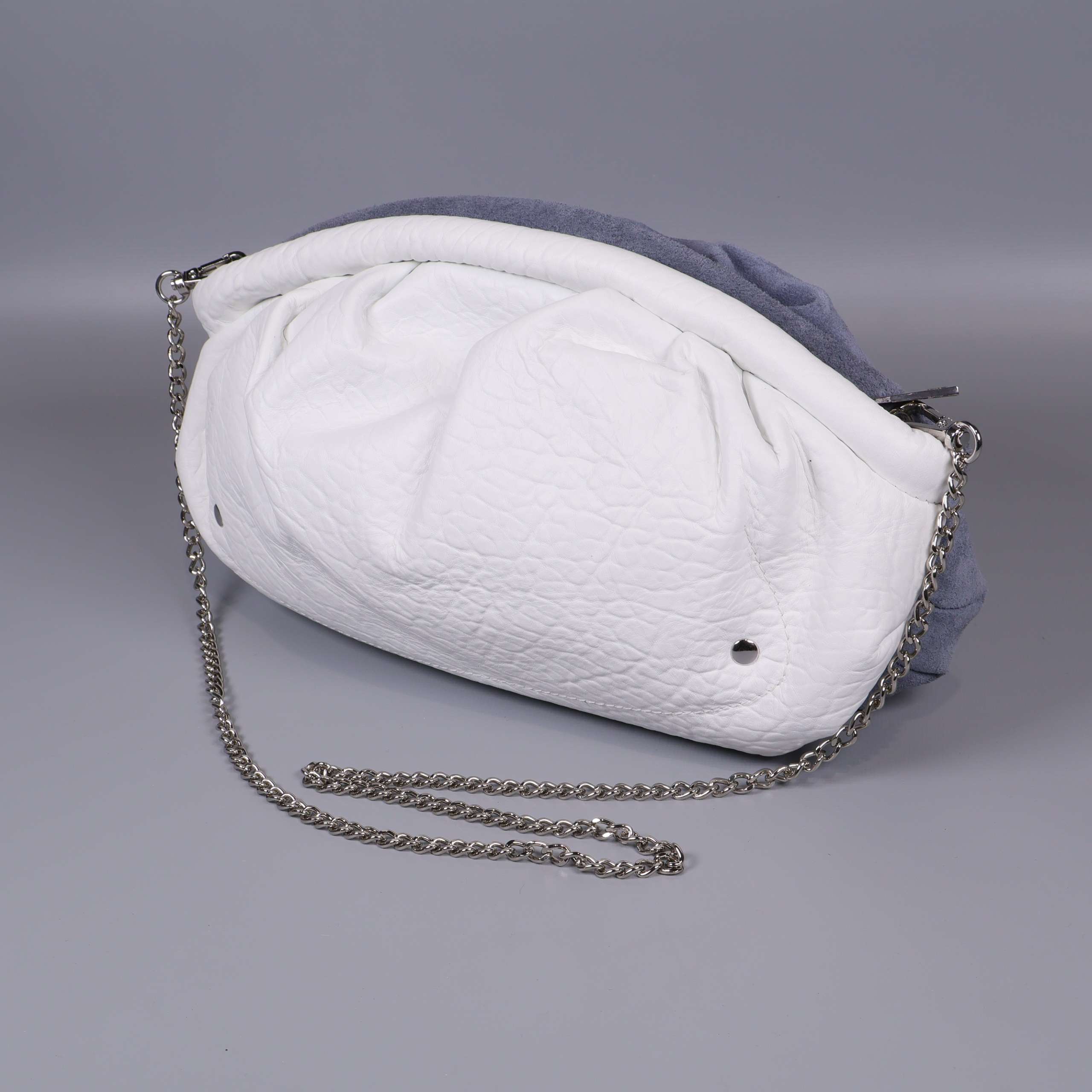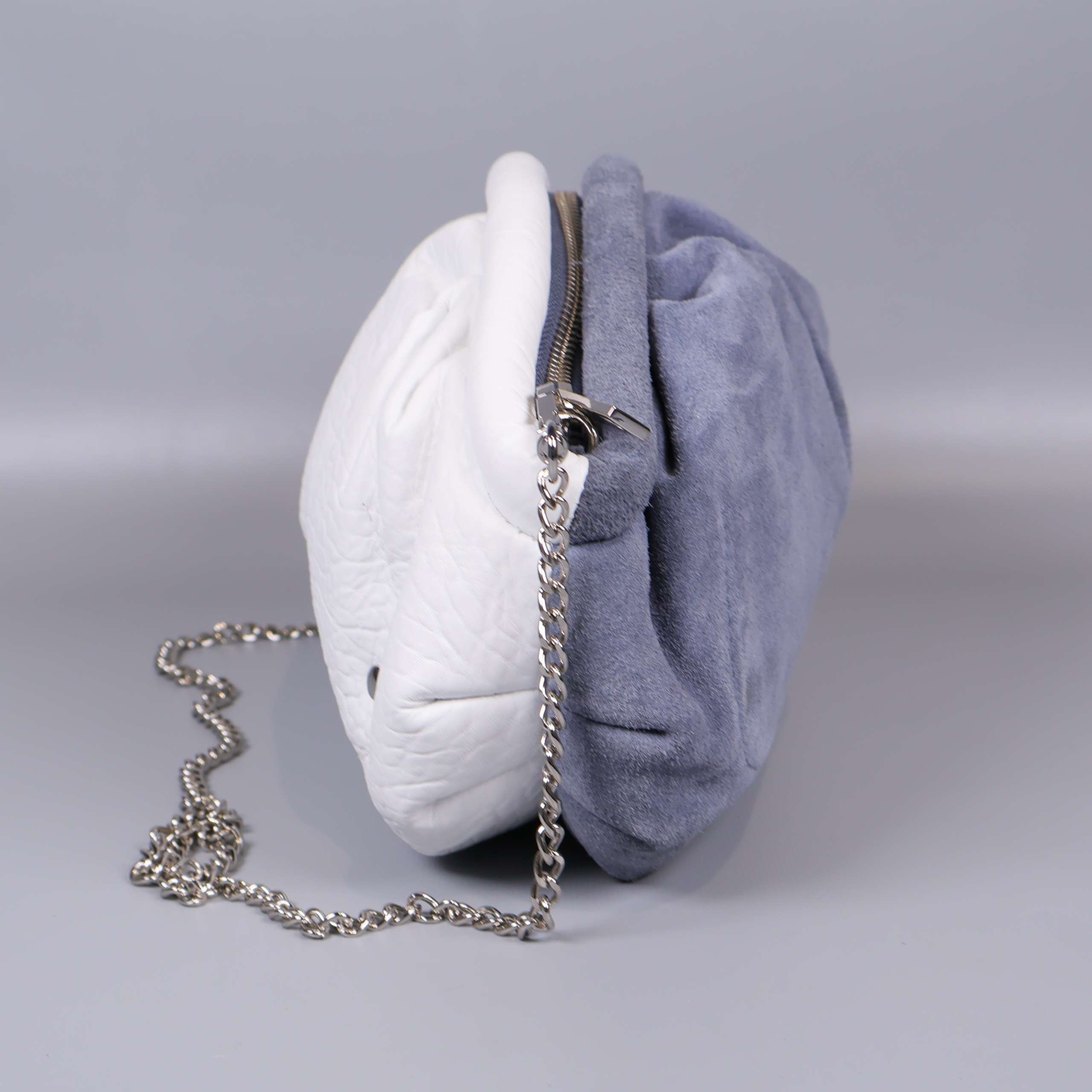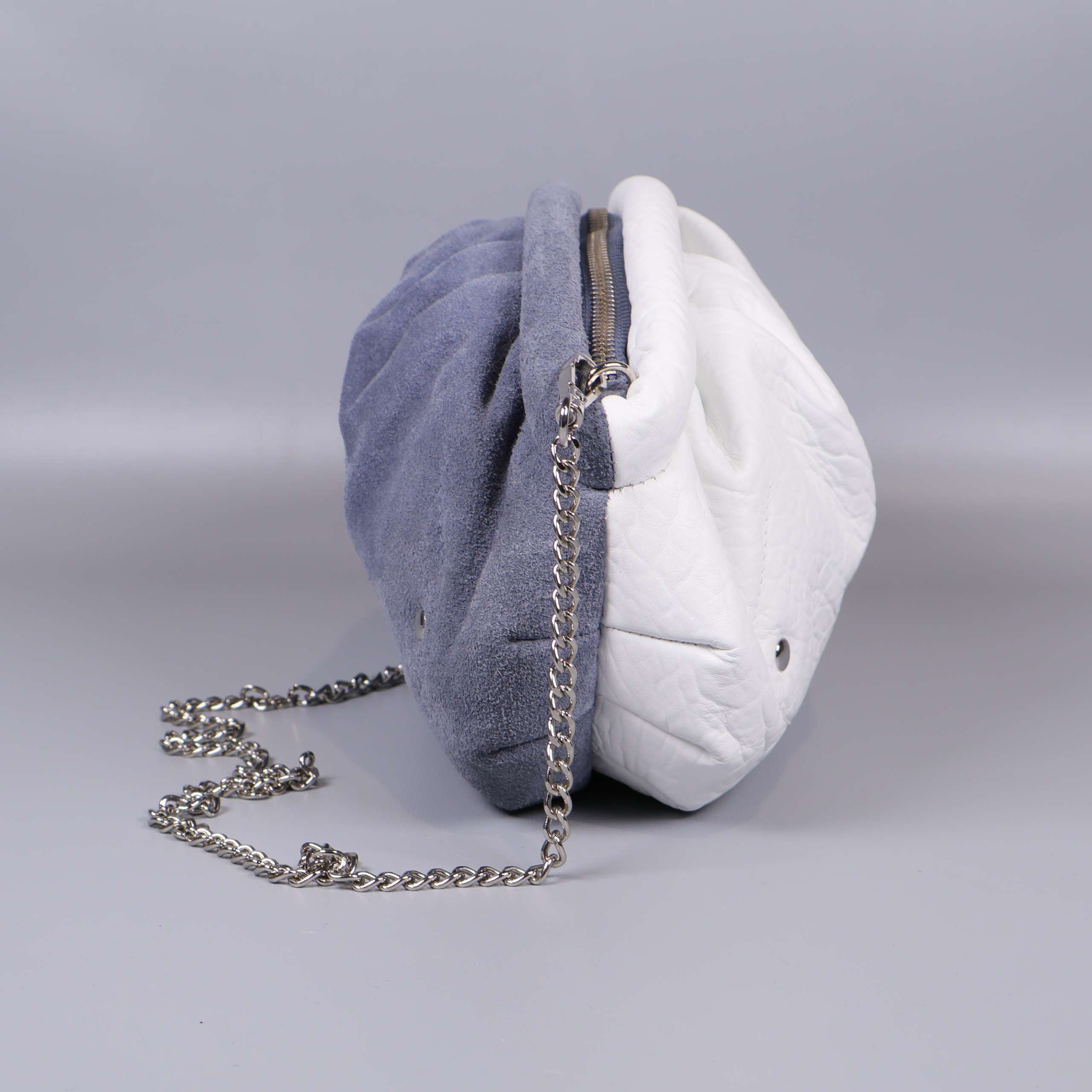 Modern clutch i en kombination av vit och ljusblå, där ena halvan har struktur i vitt material och andra halvan är mjukt, blått tyg. Väskan har en snygg kedjerem och dragkedja upptill. Den puffiga designen och materialmixen ger ett trendigt och unikt intryck.