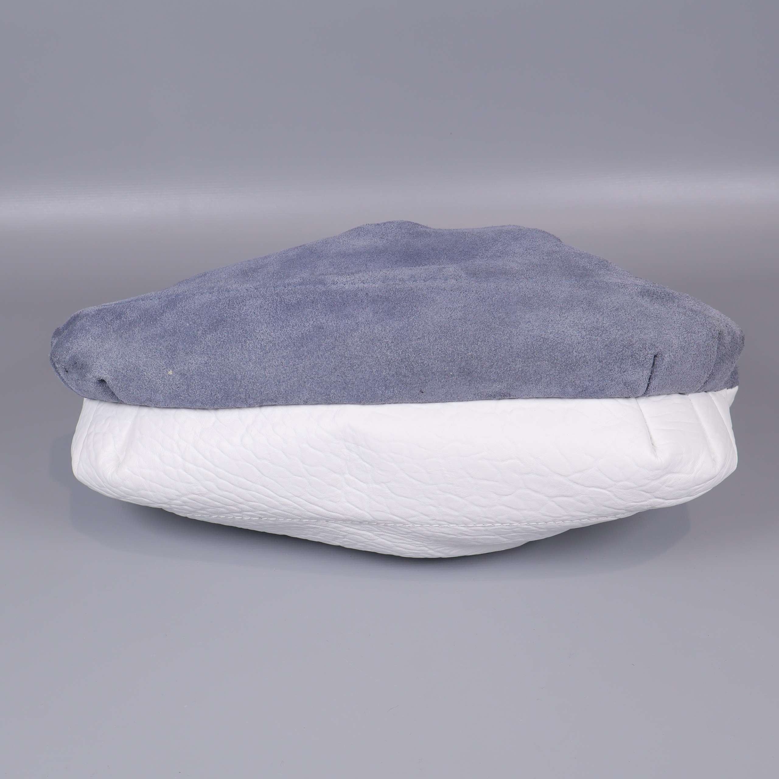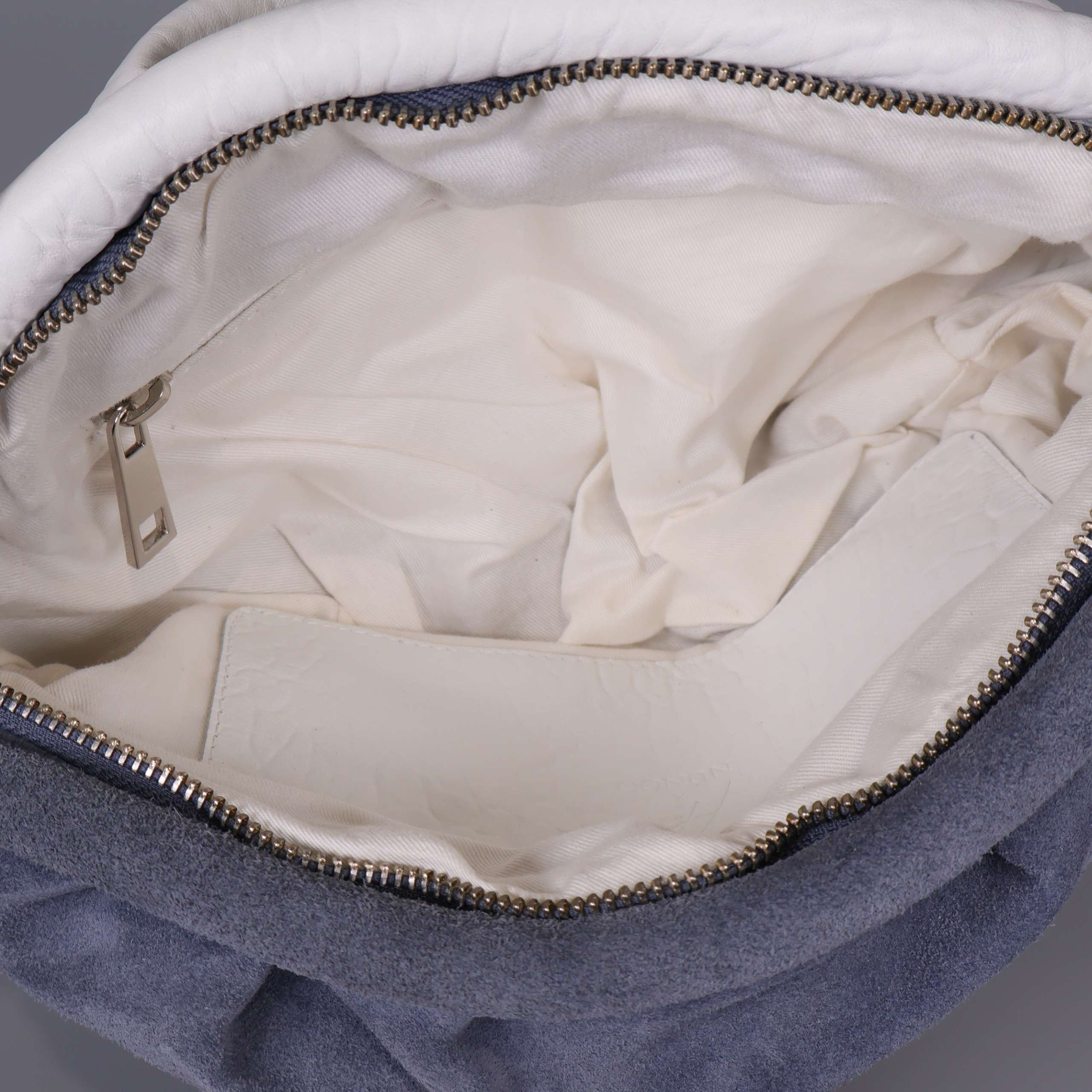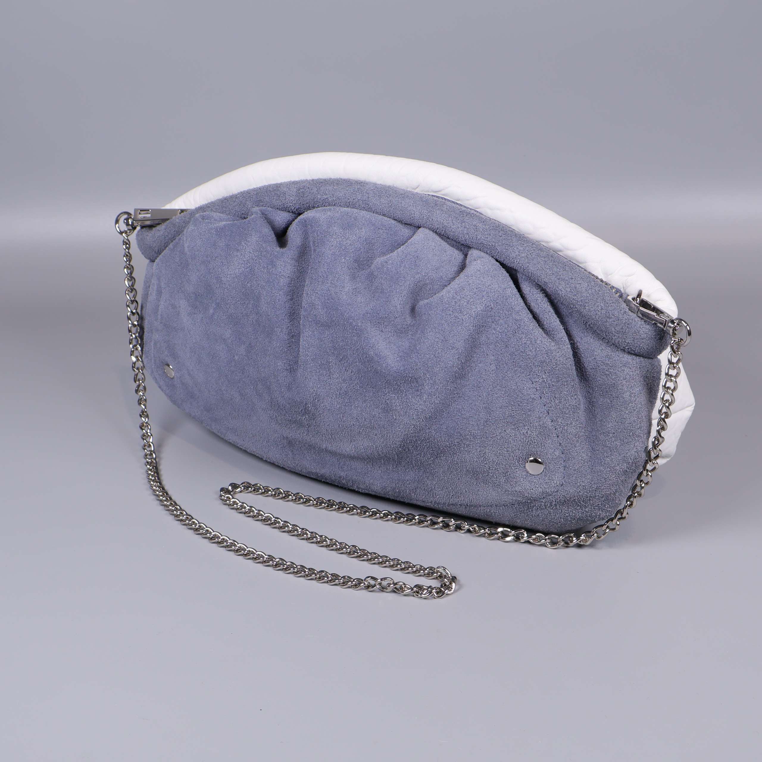 Modern clutch i en kombination av vit och ljusblå, där ena halvan har struktur i vitt material och andra halvan är mjukt, blått tyg. Väskan har en snygg kedjerem och dragkedja upptill. Den puffiga designen och materialmixen ger ett trendigt och unikt intryck.