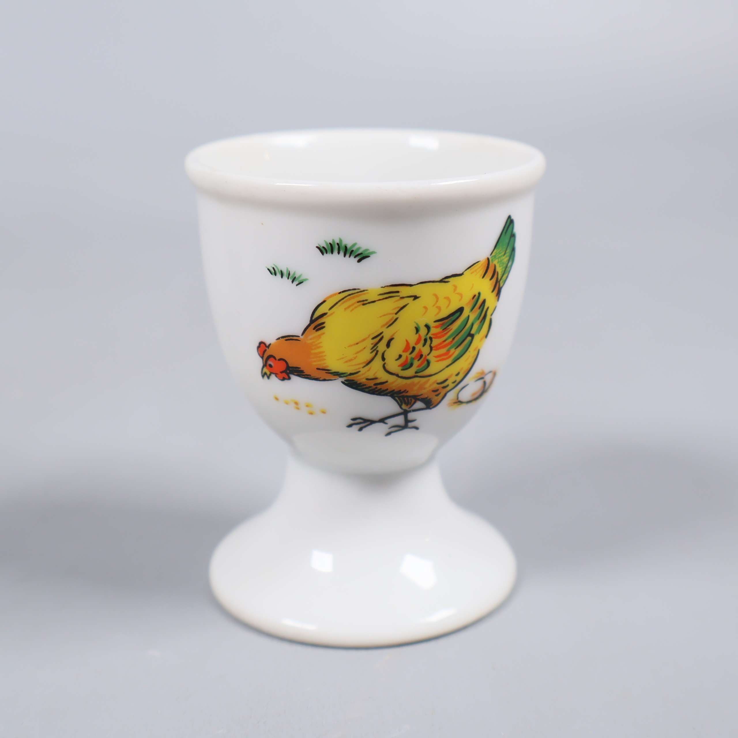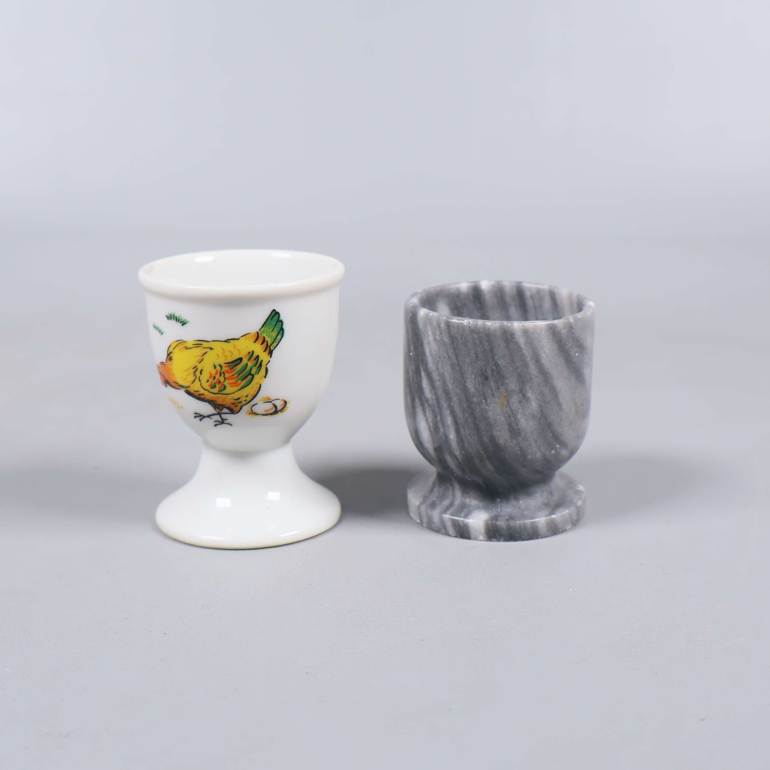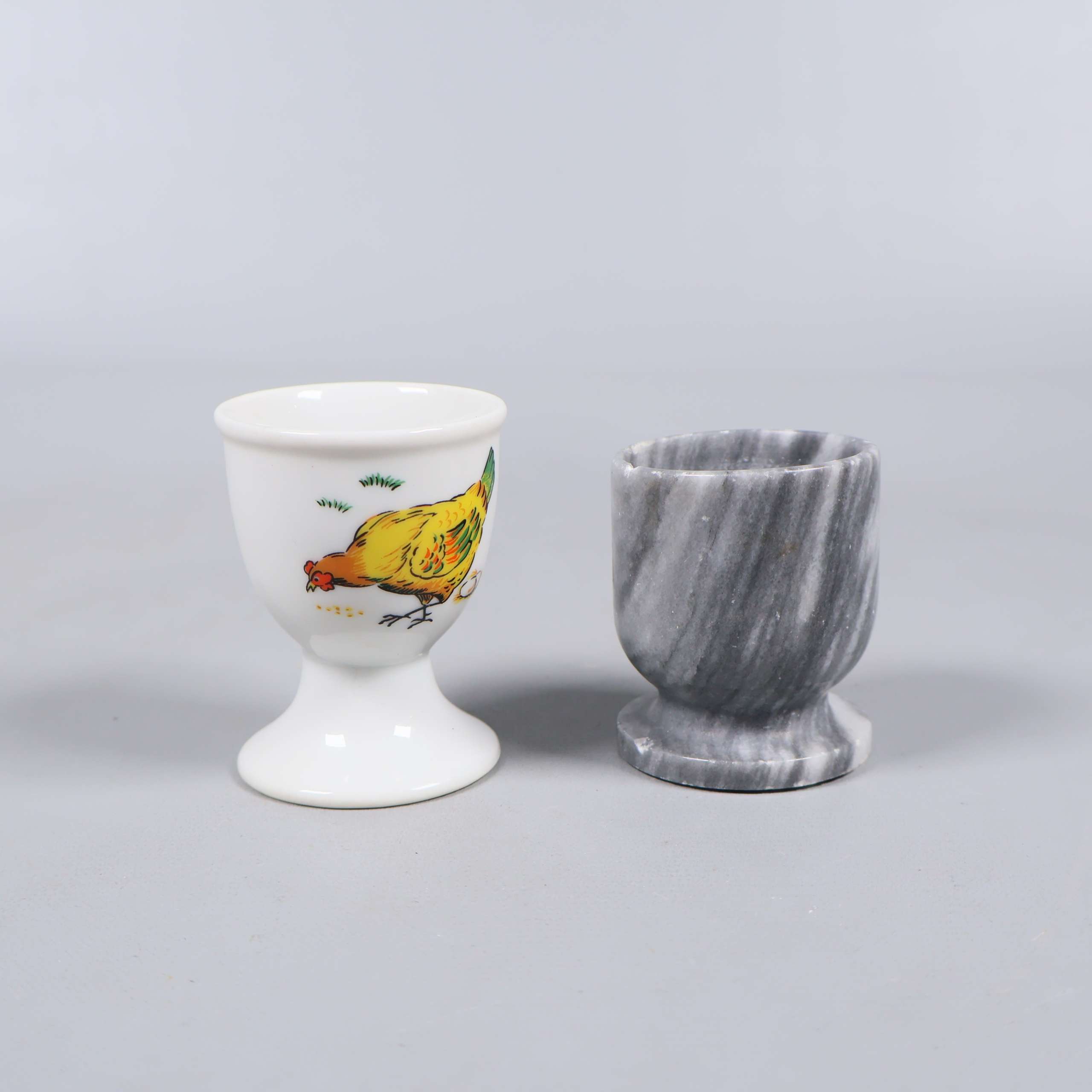 Två olika äggkoppar – en i gråmelerad sten med rundad fot och en i vit keramik prydd med en färgglad kyckling. Båda har klassisk form och passar perfekt för att ge frukostbordet både lekfull och tidlös känsla. Notera två lilla sprickor på den gråa hållaren.