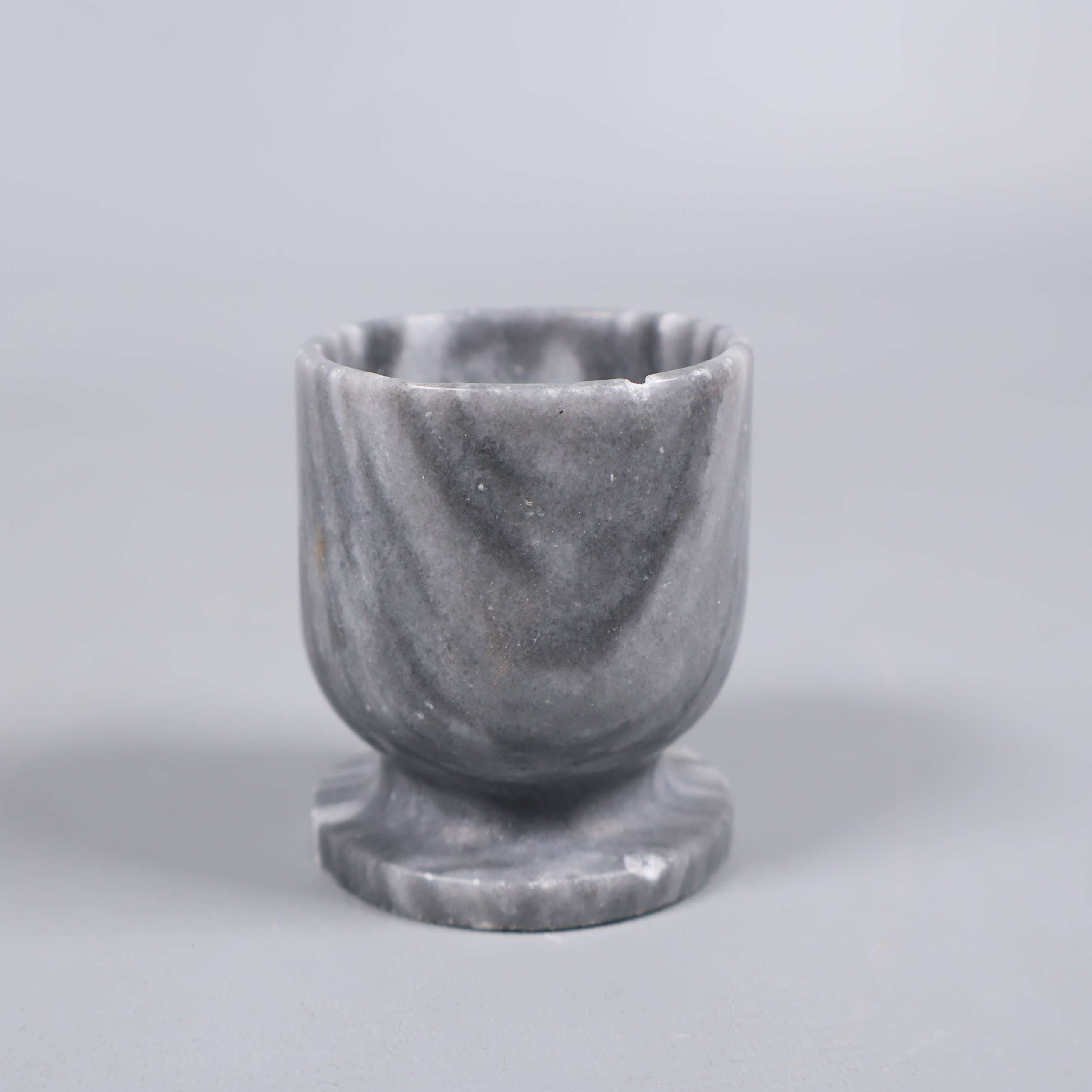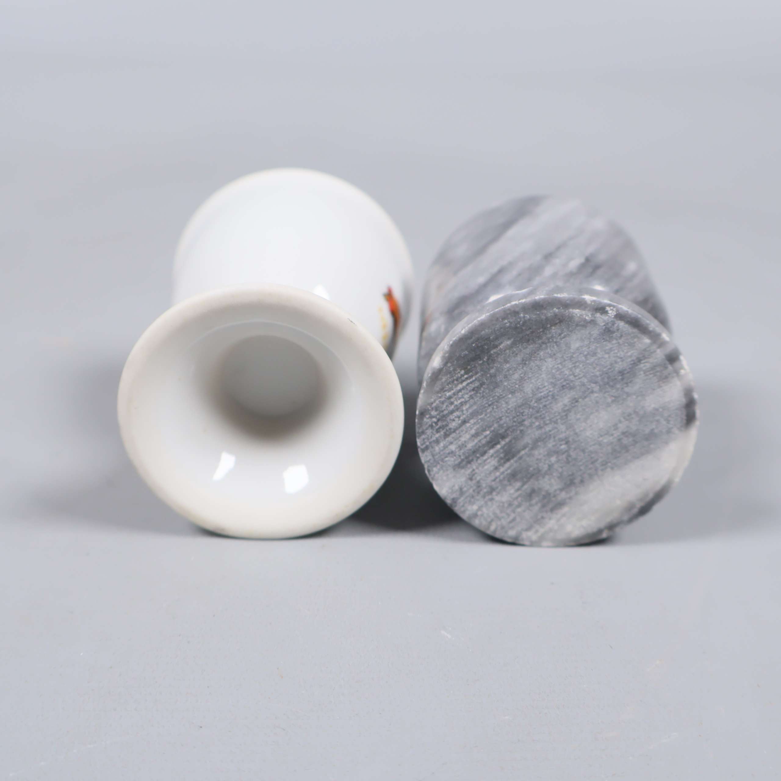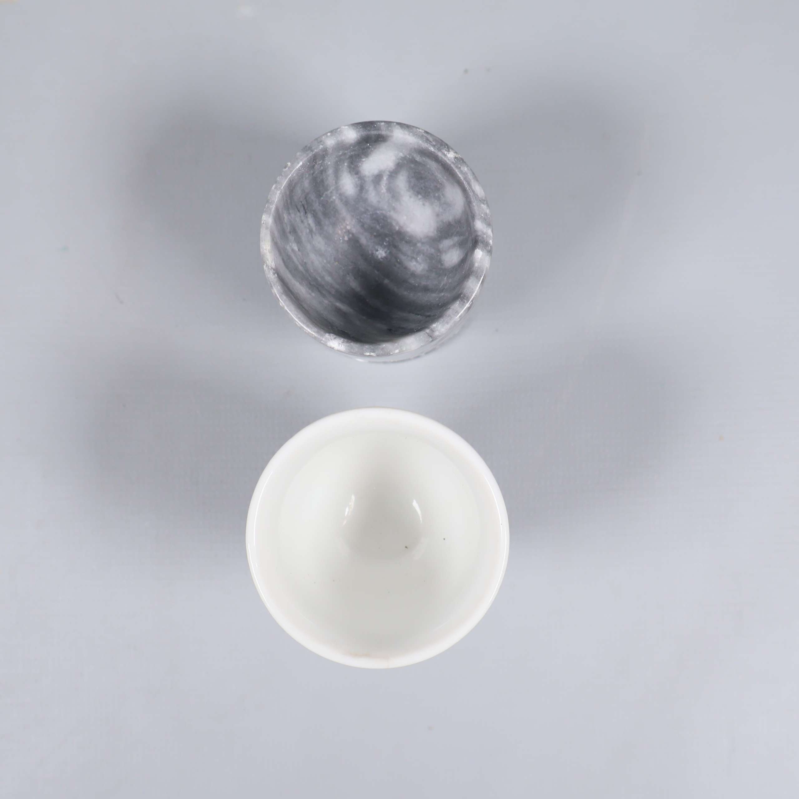 Två olika äggkoppar – en i gråmelerad sten med rundad fot och en i vit keramik prydd med en färgglad kyckling. Båda har klassisk form och passar perfekt för att ge frukostbordet både lekfull och tidlös känsla. Notera två lilla sprickor på den gråa hållaren.