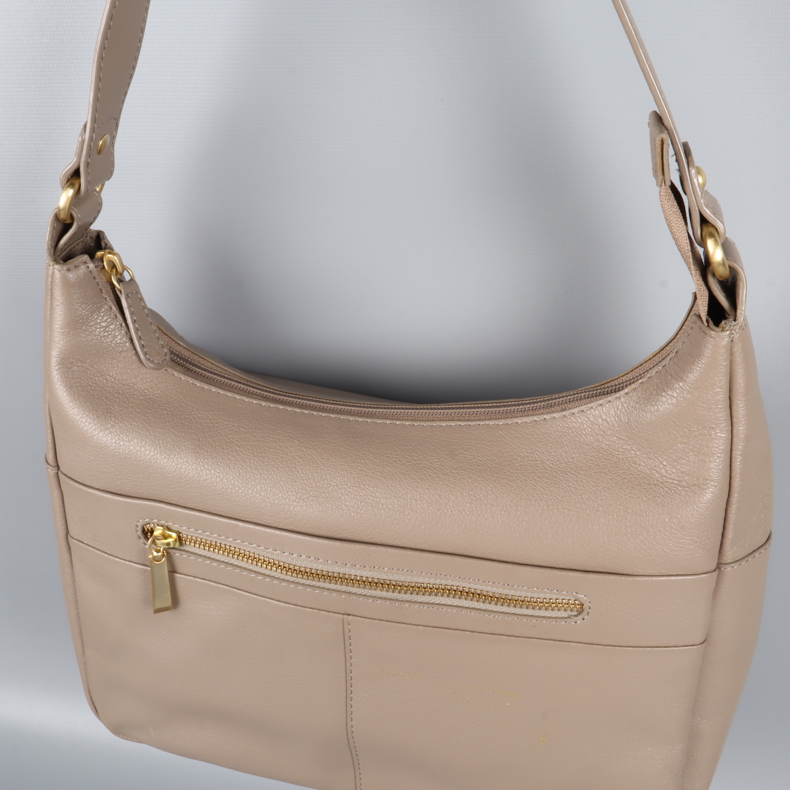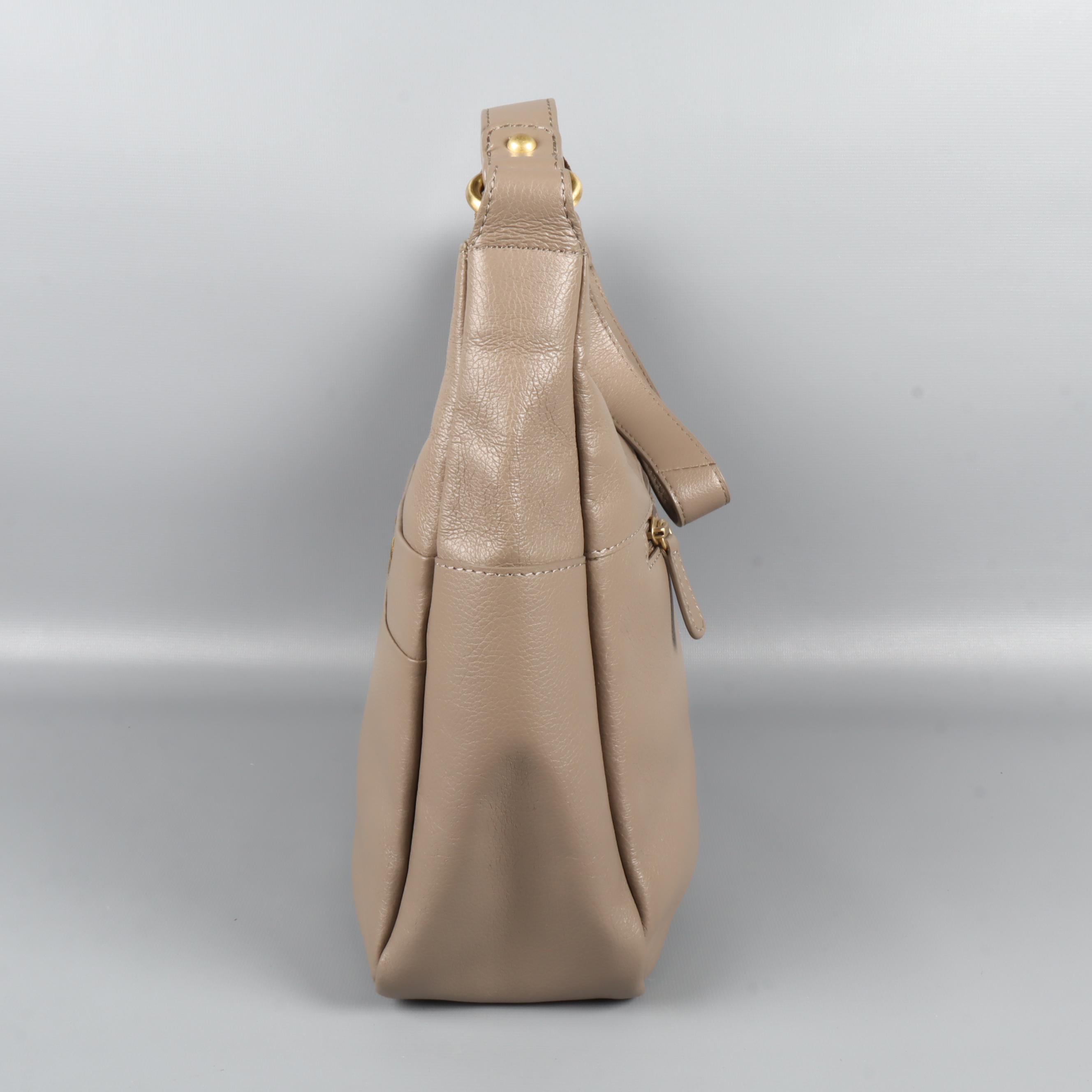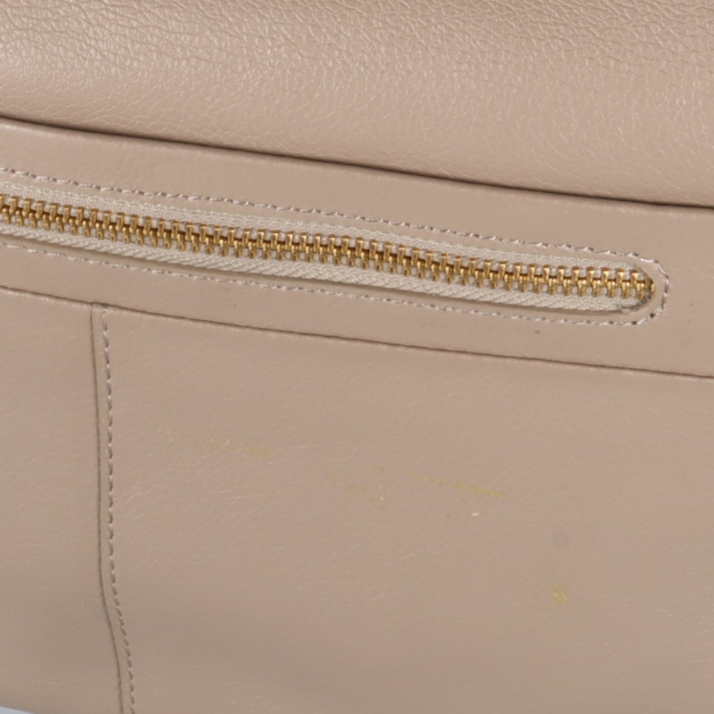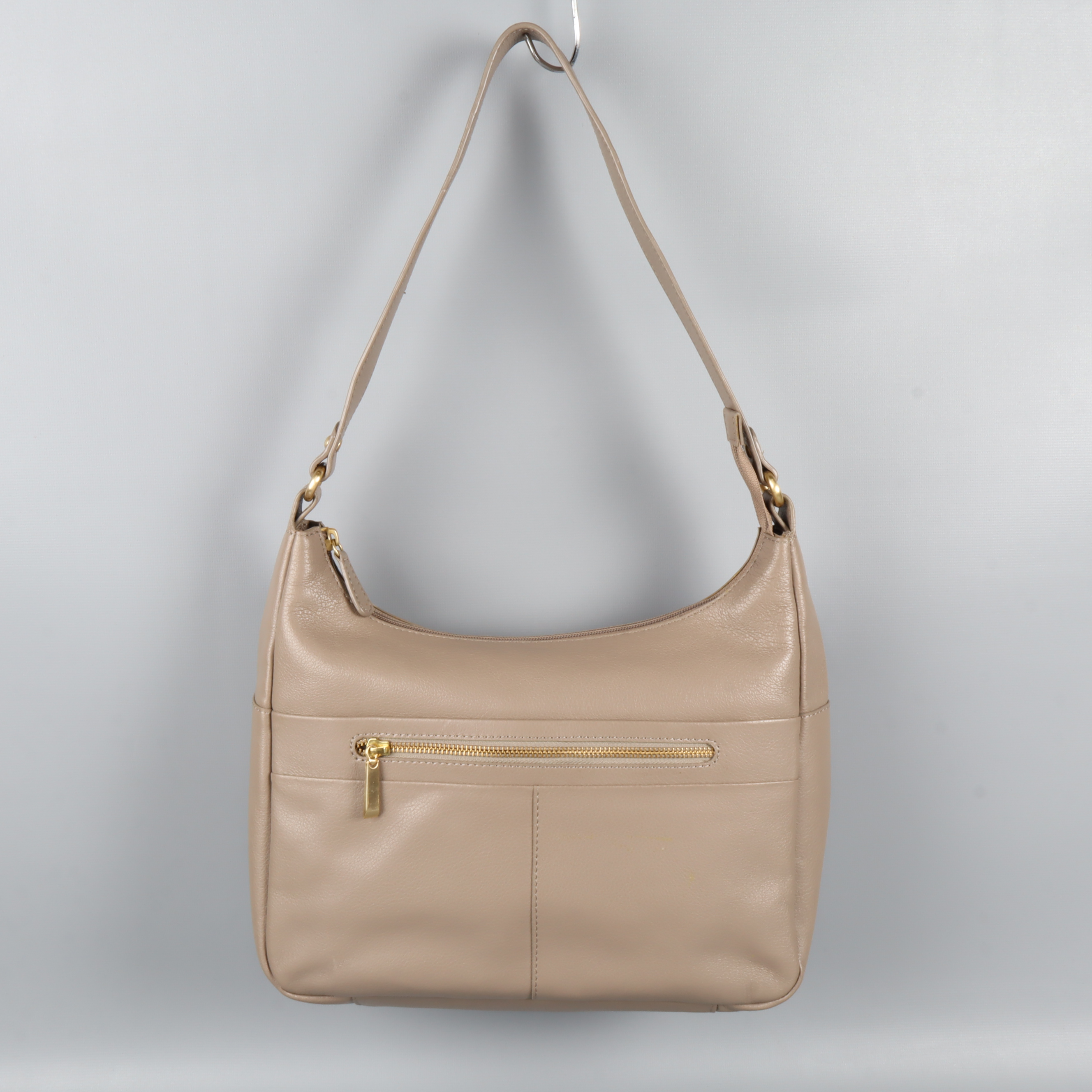 Elegant beigefärgad axelväska med justerbar rem och gulddetaljer för ett stilrent intryck. Väskan har flera fack inklusive en yttre dragkedja för enkel åtkomst.