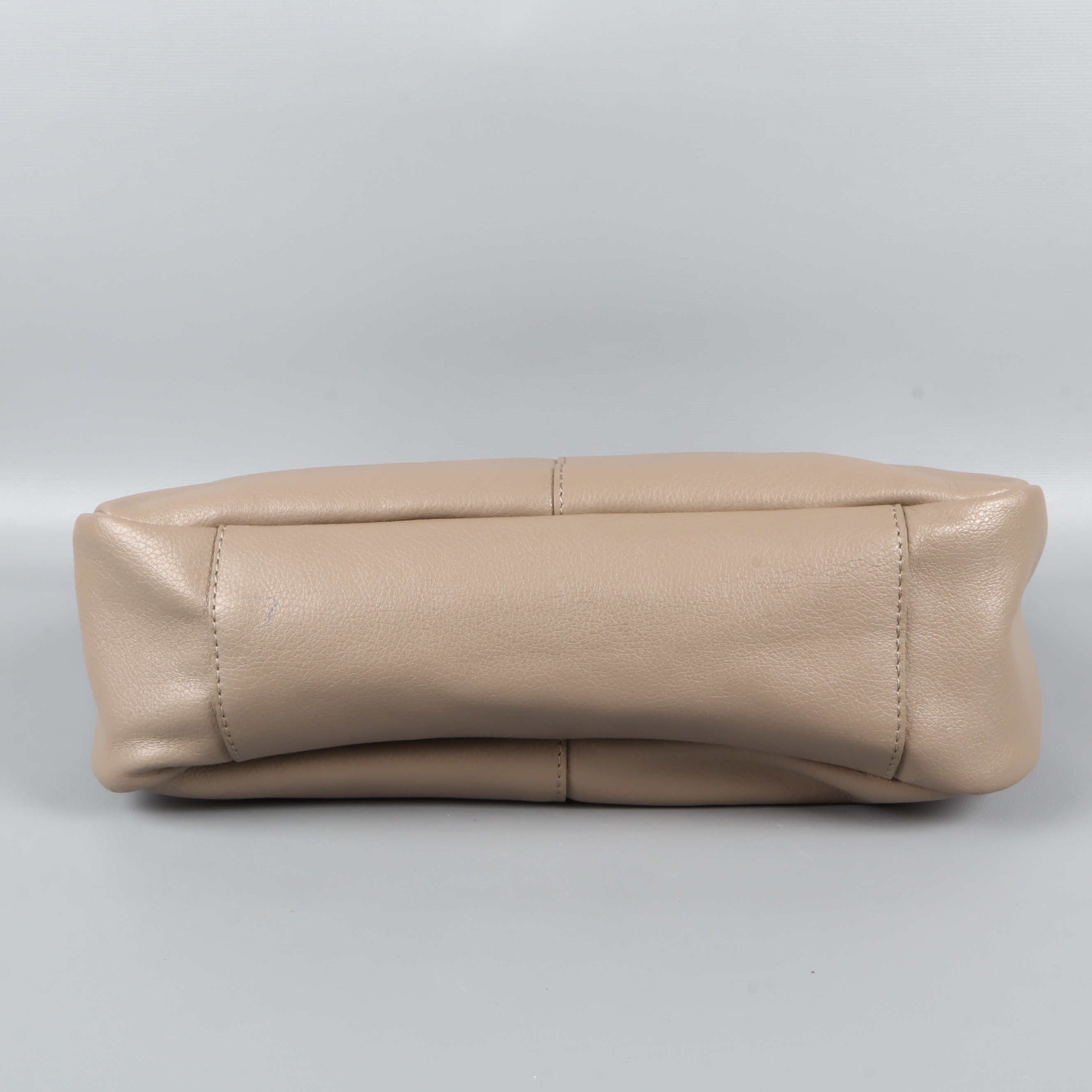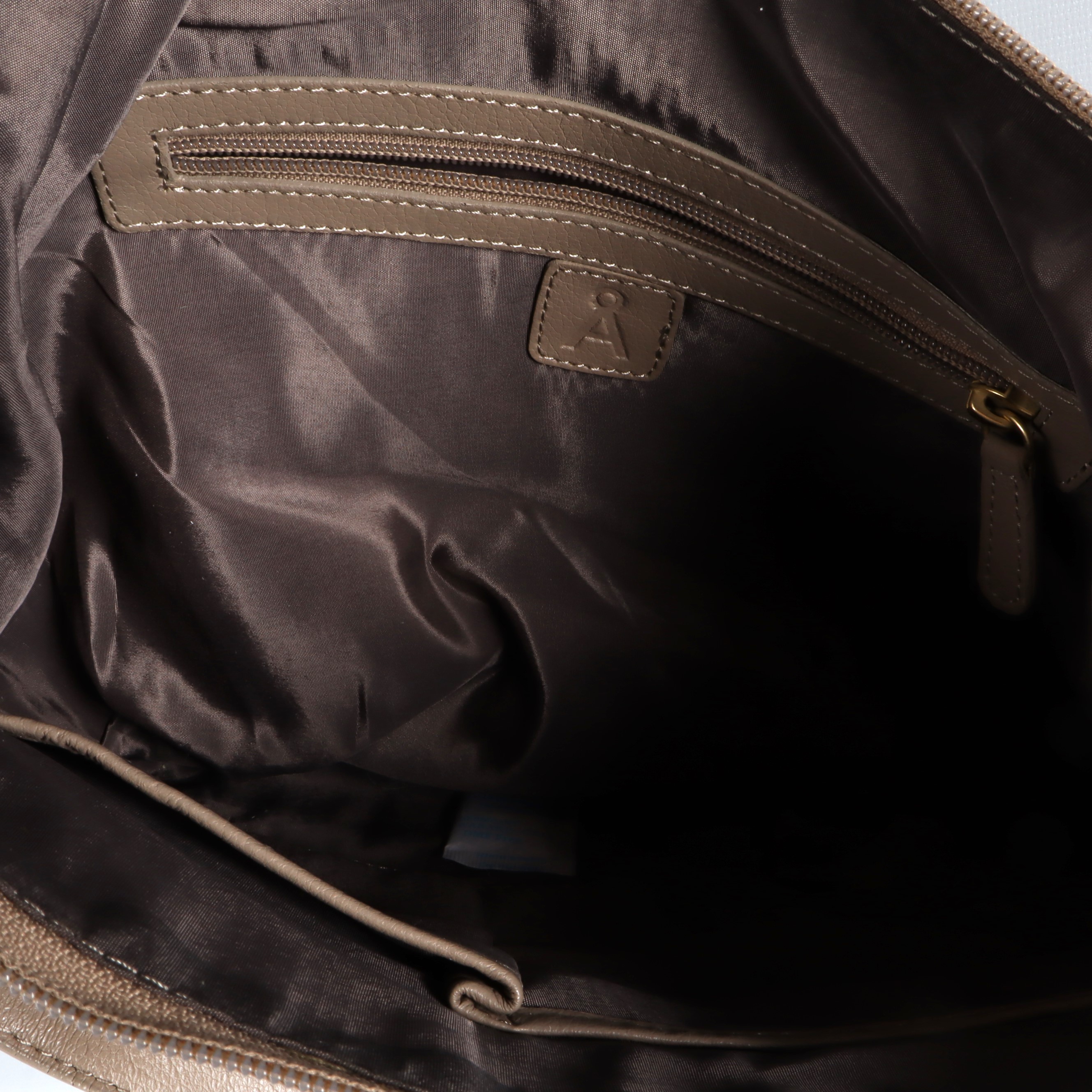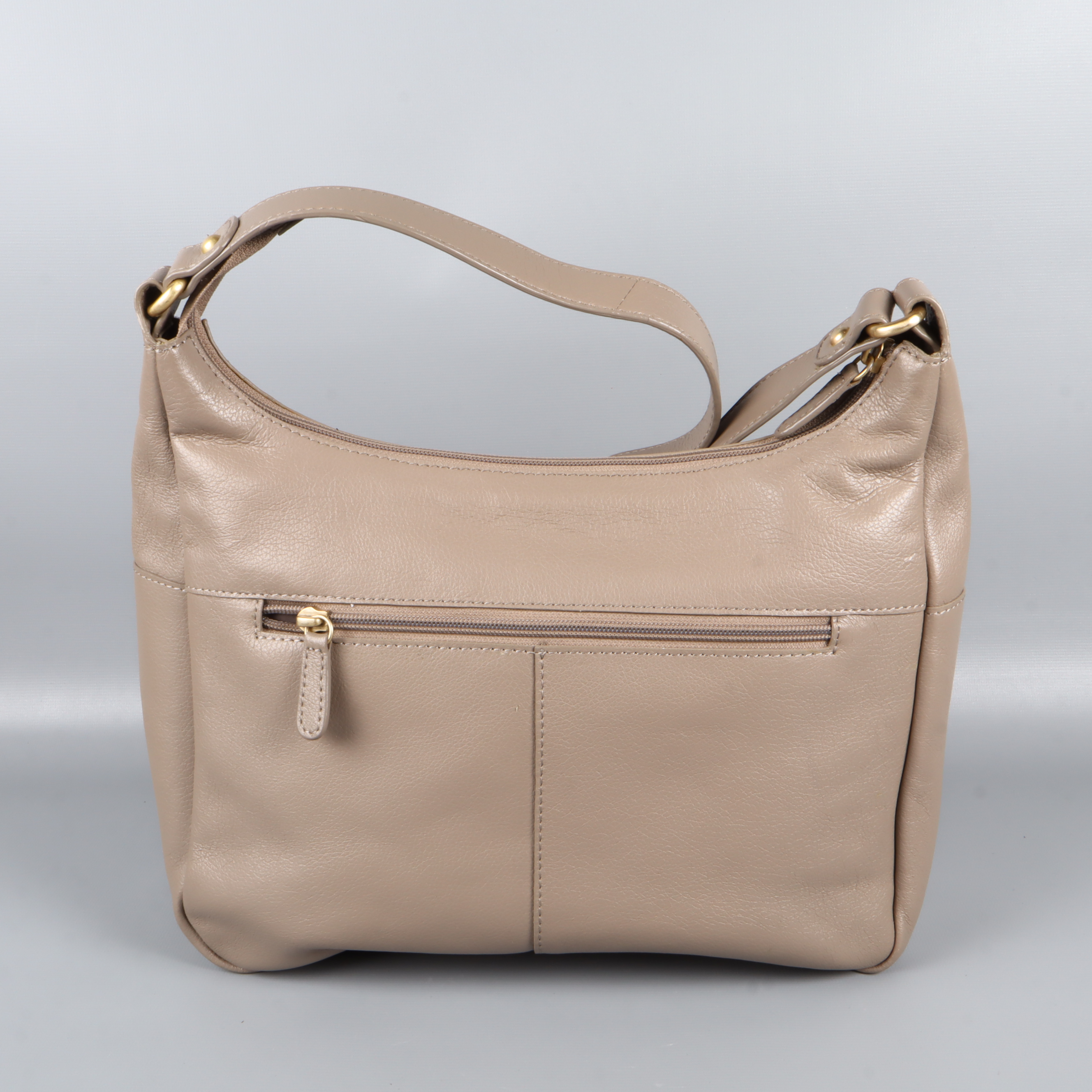 Elegant beigefärgad axelväska med justerbar rem och gulddetaljer för ett stilrent intryck. Väskan har flera fack inklusive en yttre dragkedja för enkel åtkomst.