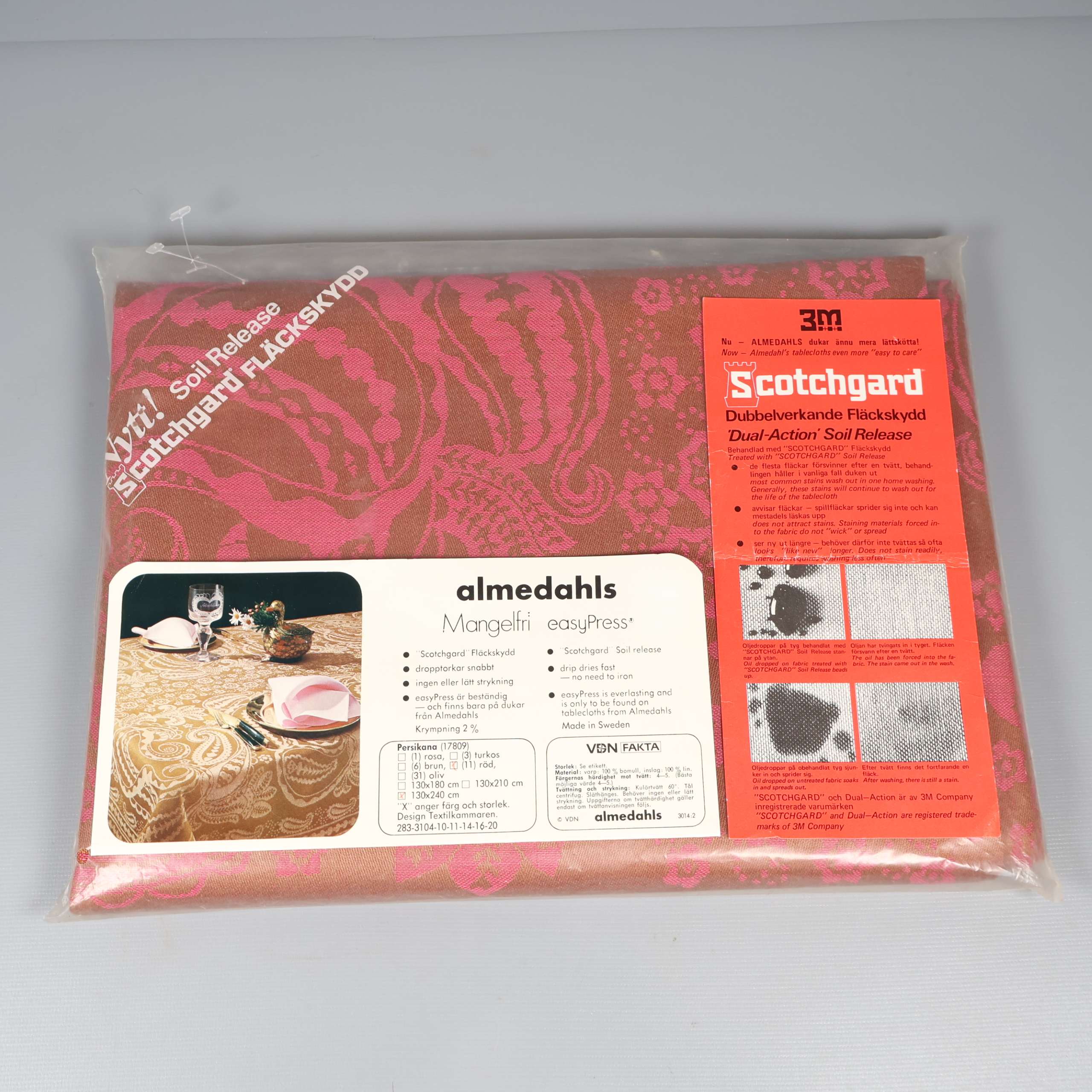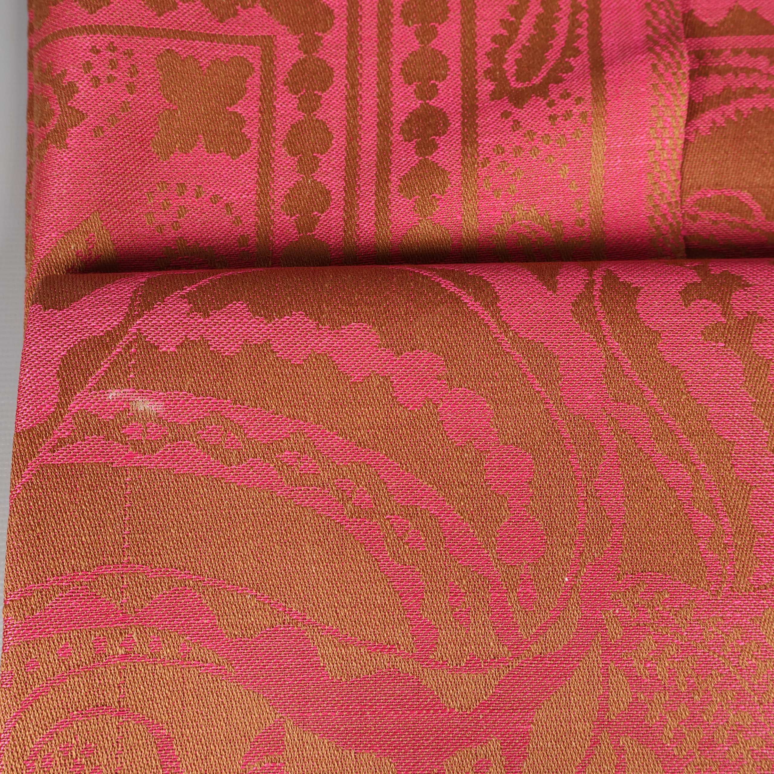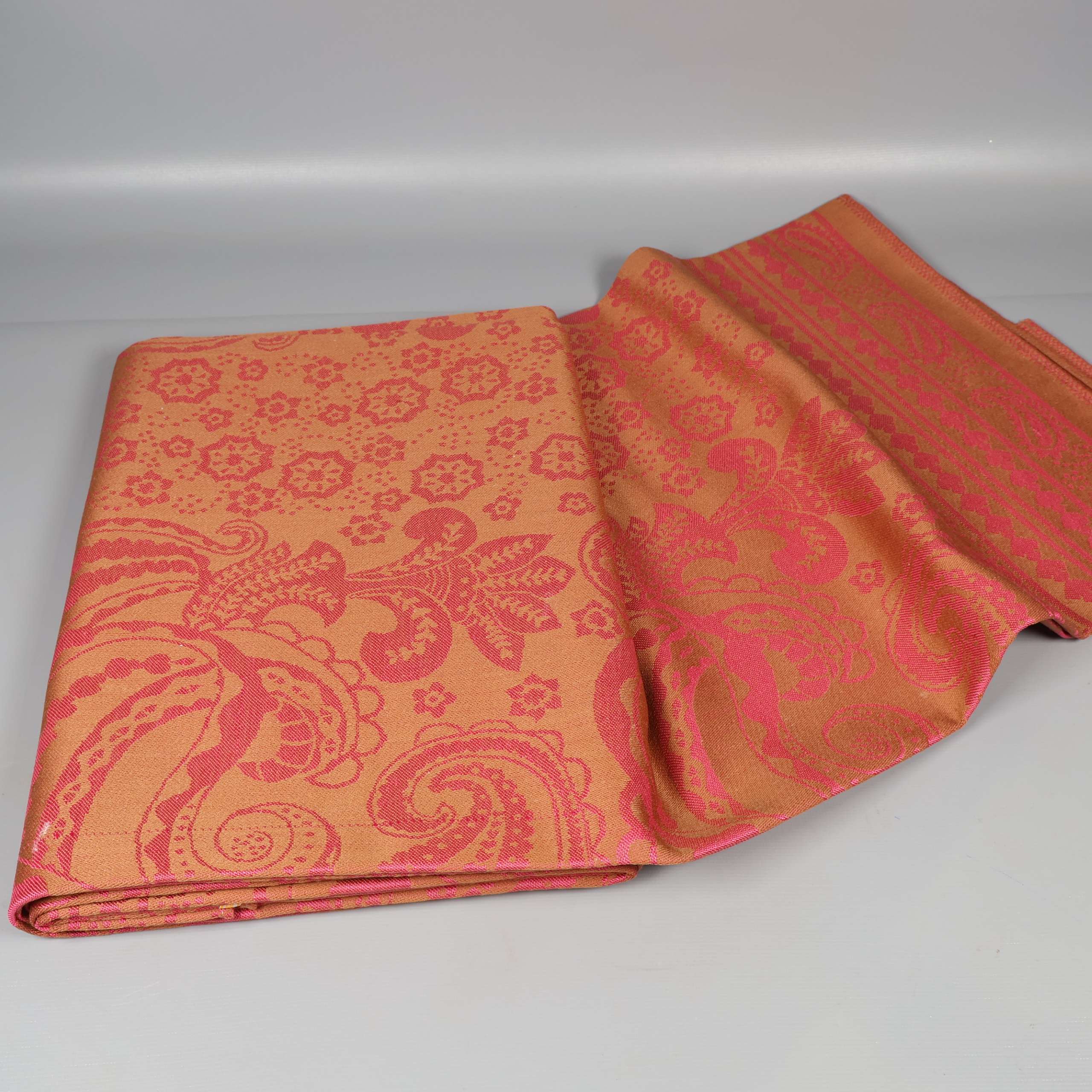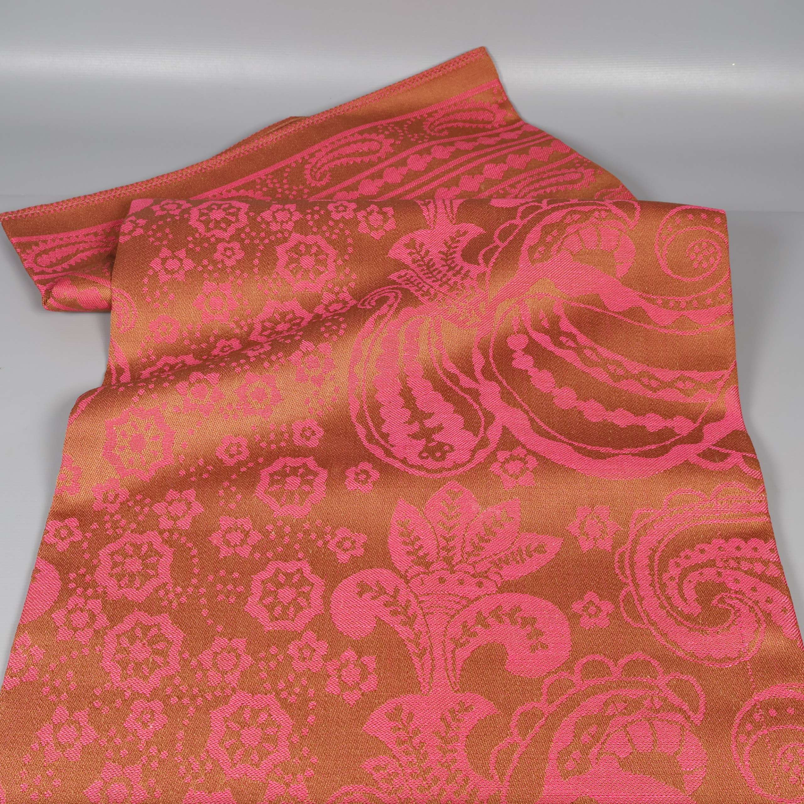 Duk med paisley-inspirerat mönster i livfull rosa och brunorange ton. Tyg med tydligt jacquardmönster ger en elegant och dekorativ känsla till bordet, perfekt för att lyfta stämningen vid middagen. Känns både klassisk och trendig med en unik färgkombination. Lite vit fläck, se bild.