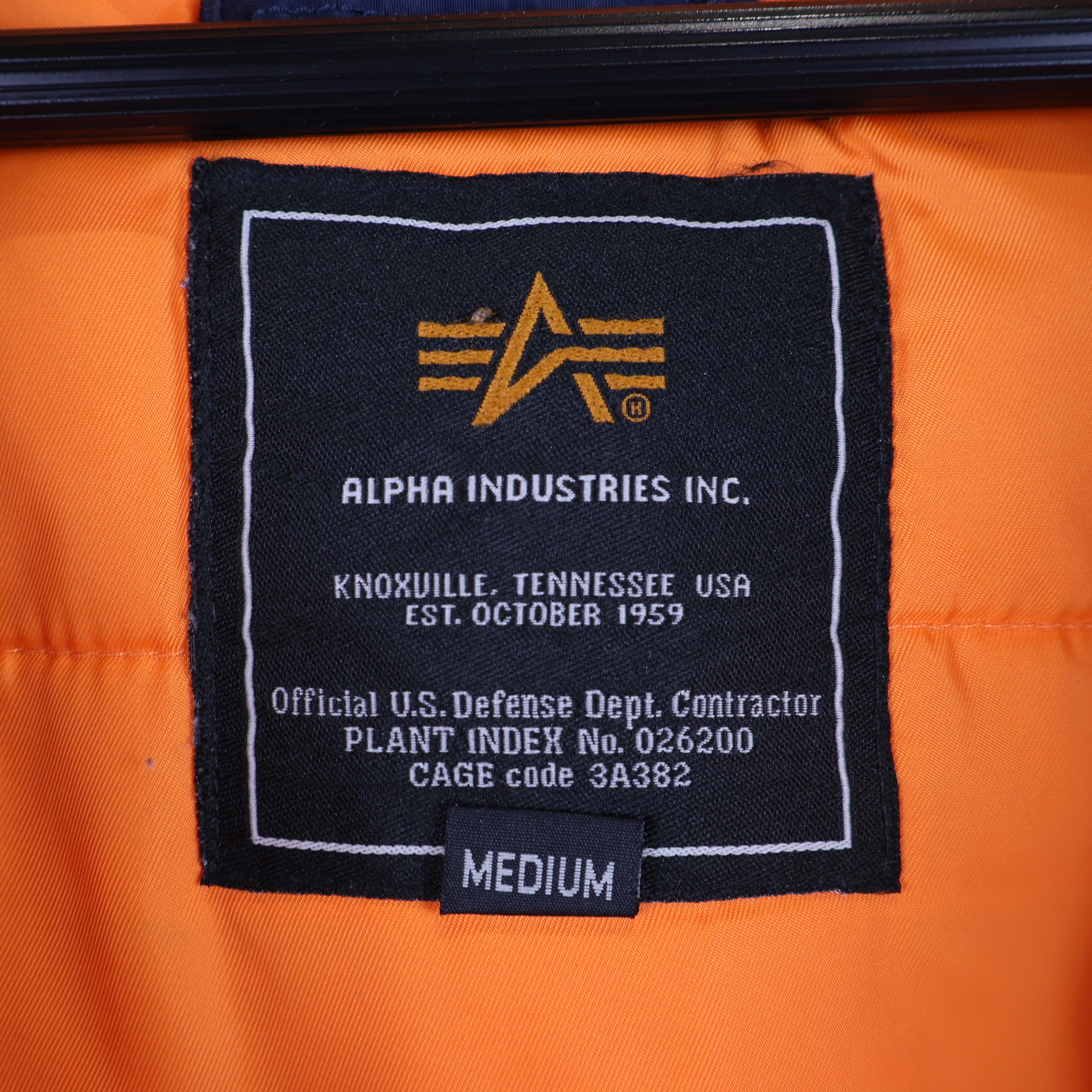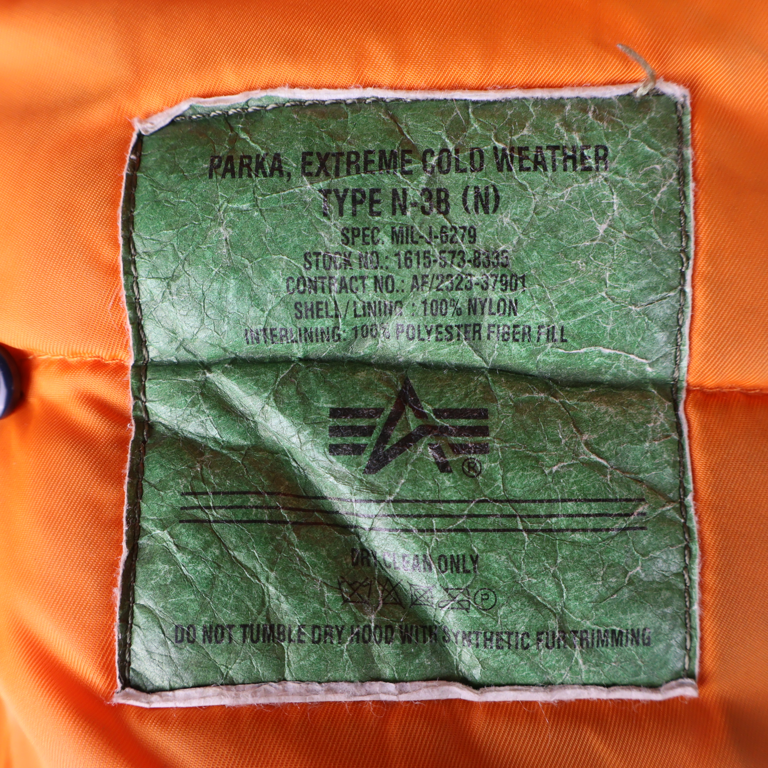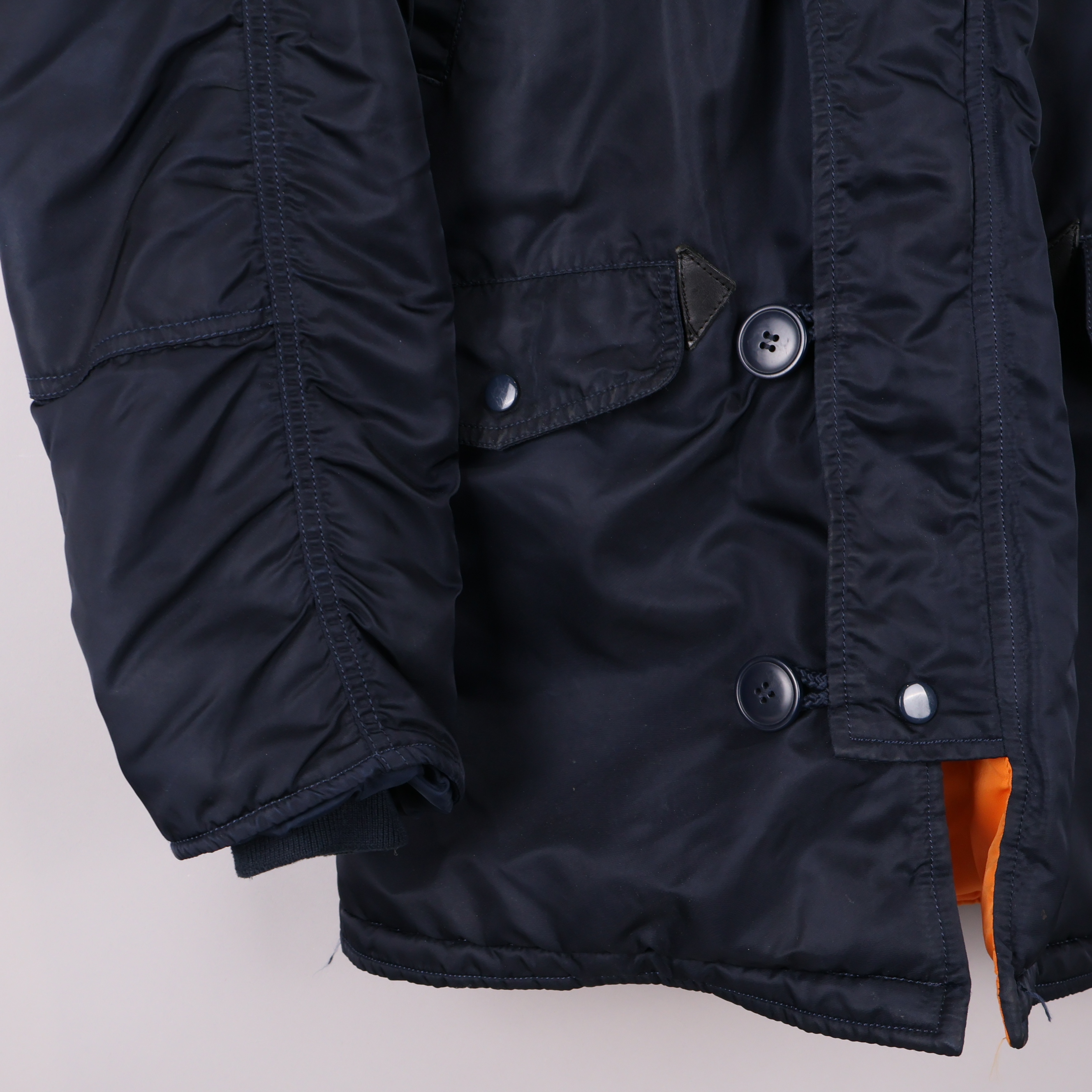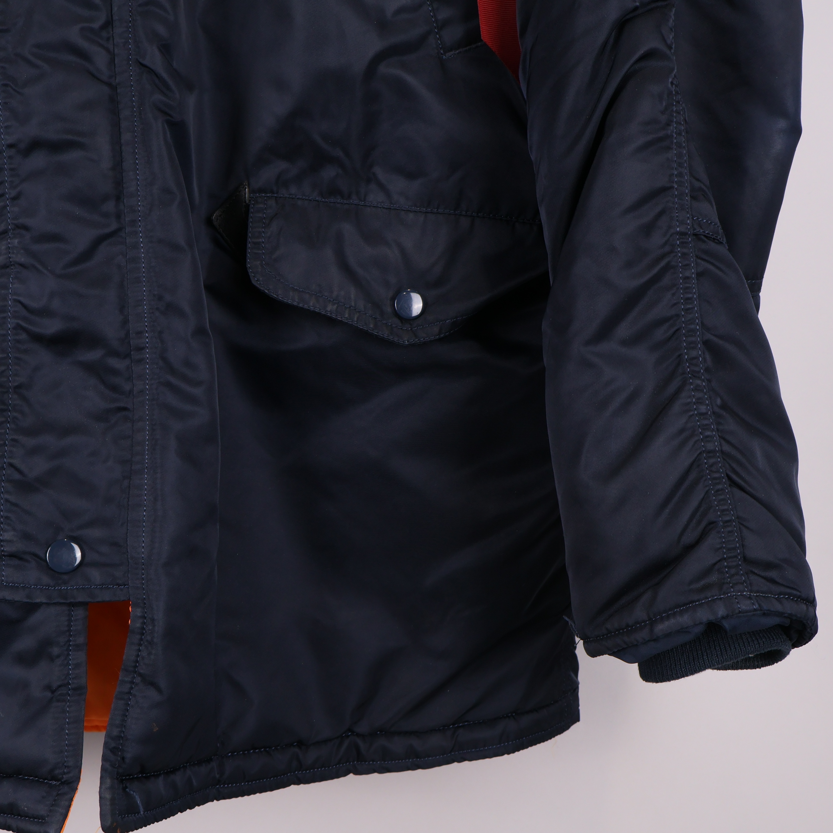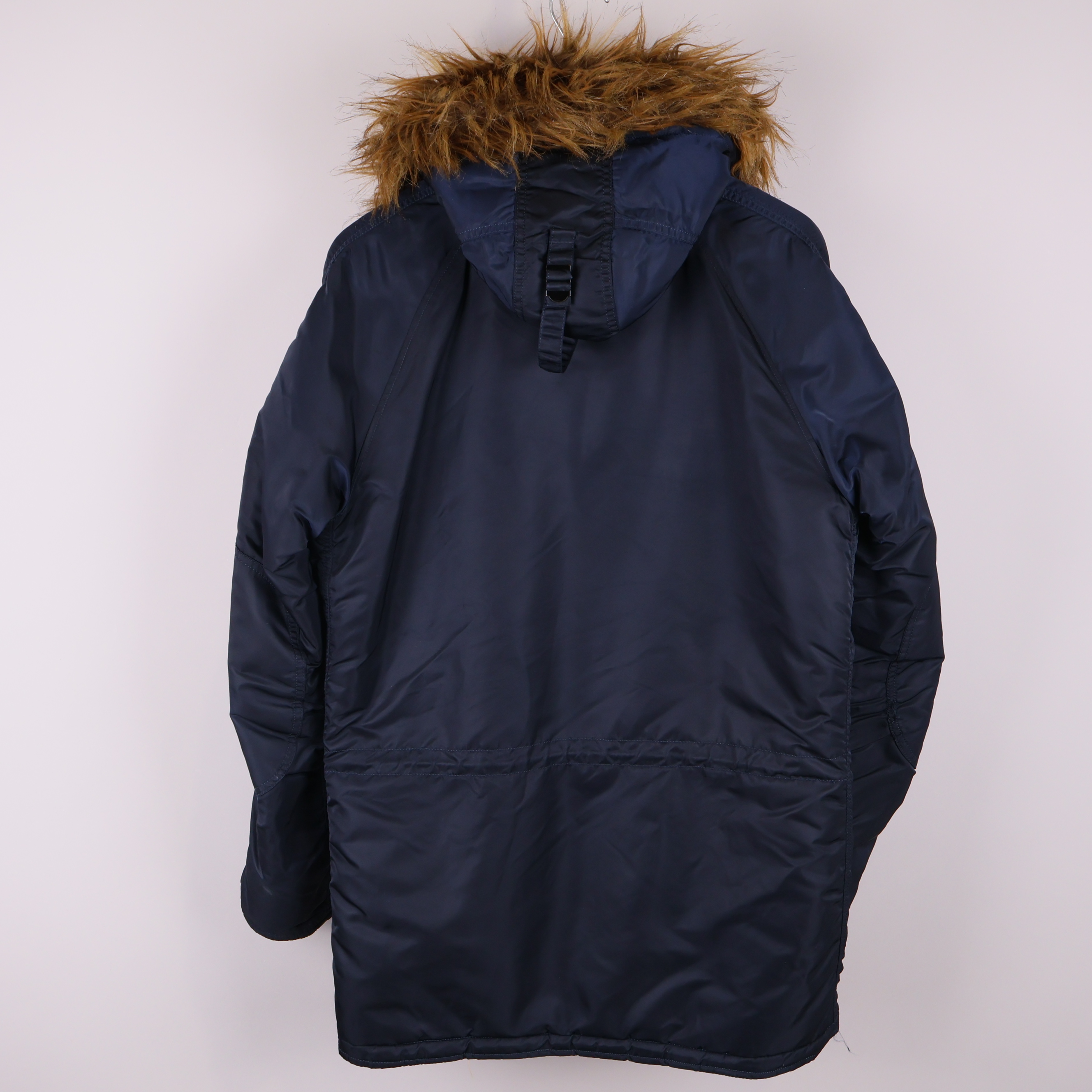 Parkas från Alpha Industries med mörkblå, vattenavvisande ytteryta och varm fuskpäls runt huvan. Jackan har klassisk parka-design, stora framfickor och slitstarkt material med detaljer i orange på insidan.