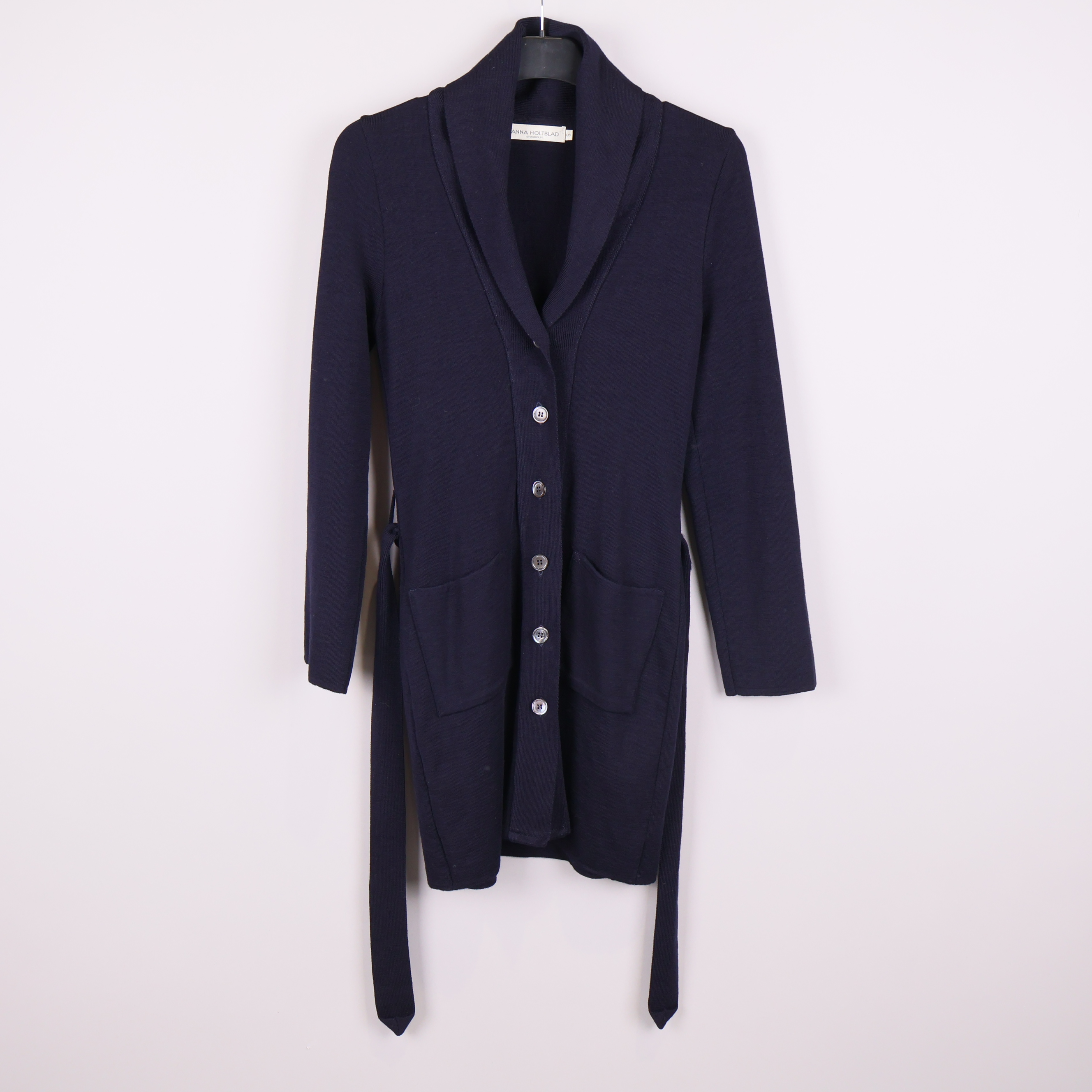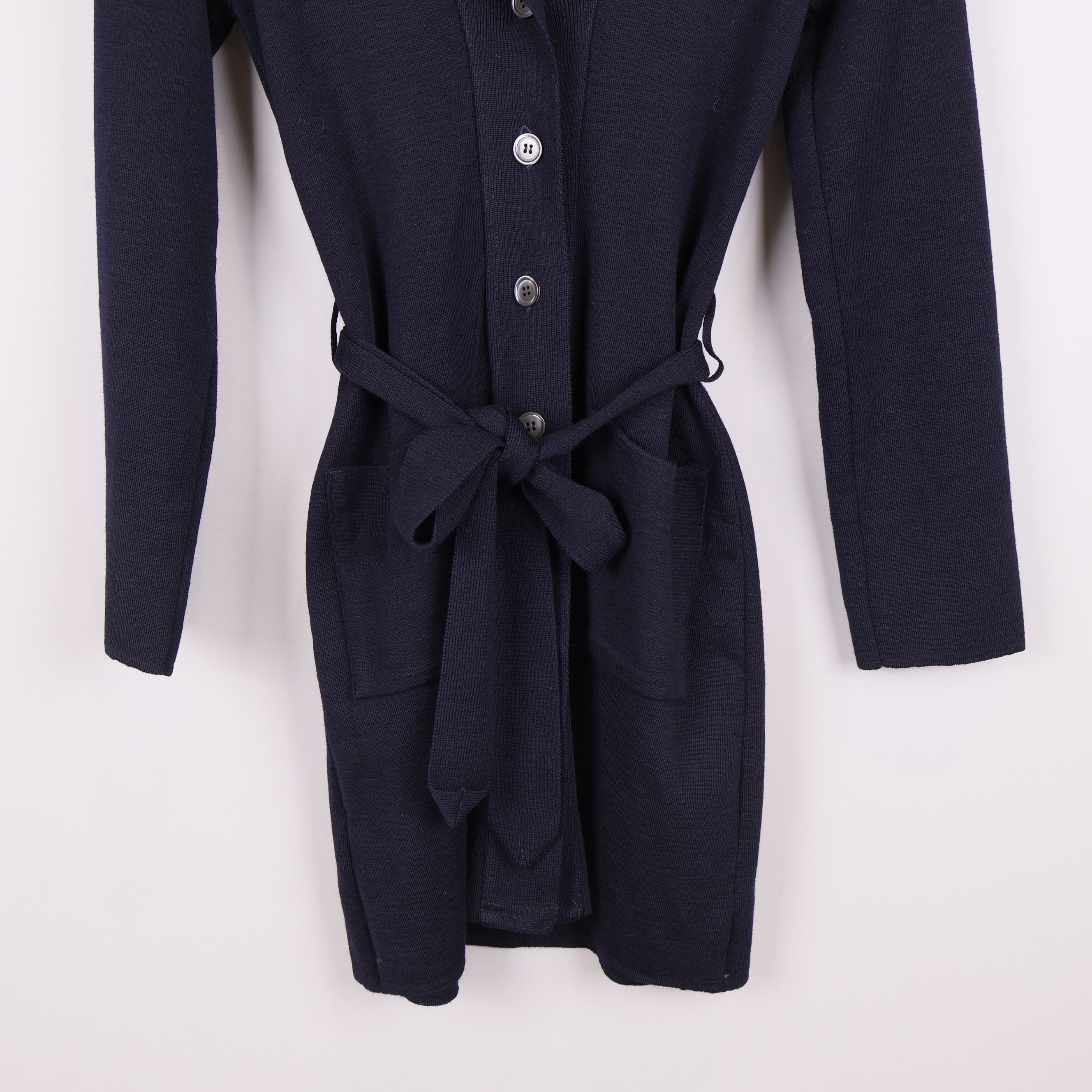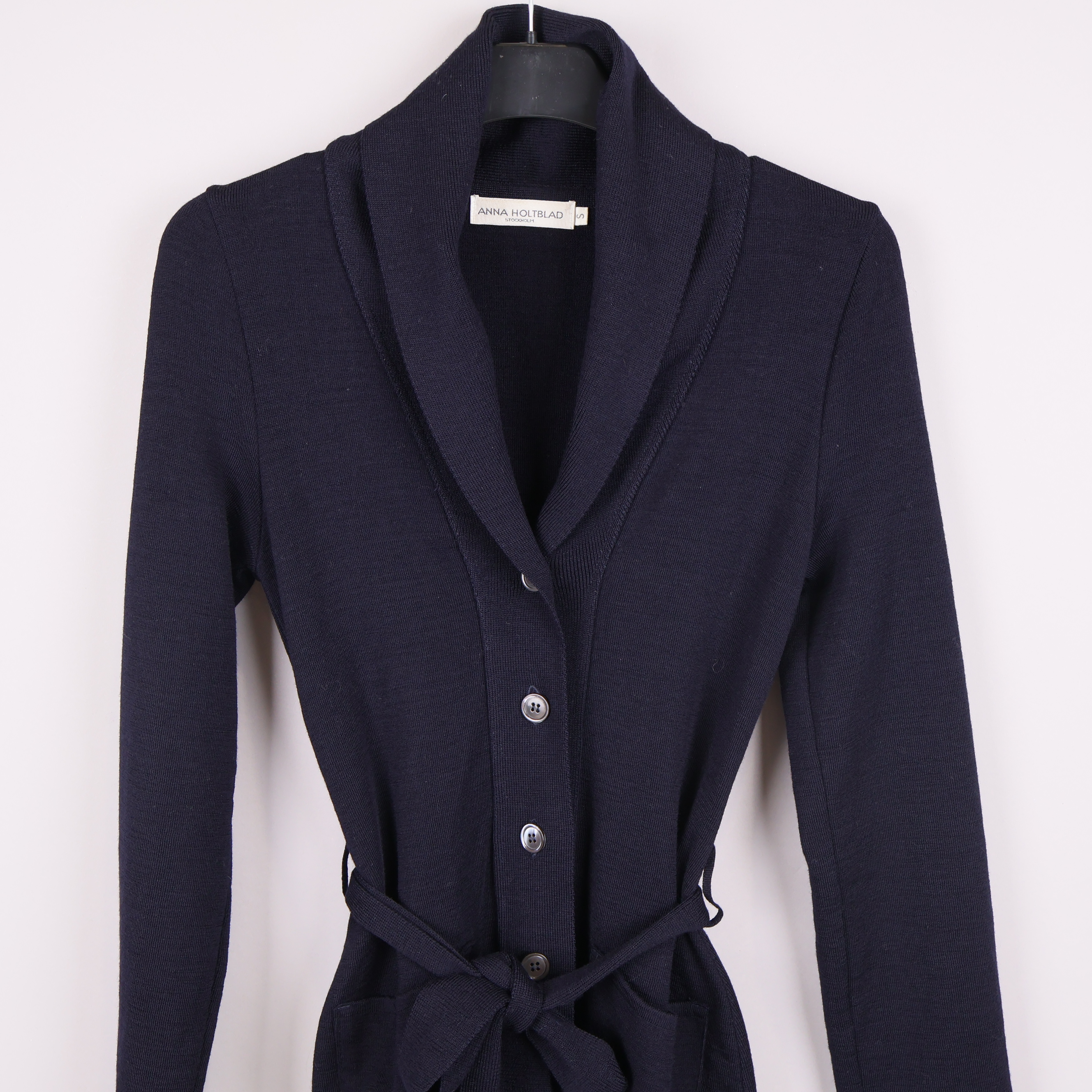 Stilren lång kofta i mörkblått med knappar framtill och avtagbart knytskärp i midjan. Koftan har två framfickor och en elegant sjalkrage för en tidlös och mjuk look. Tillverkad av 100% merinoull.