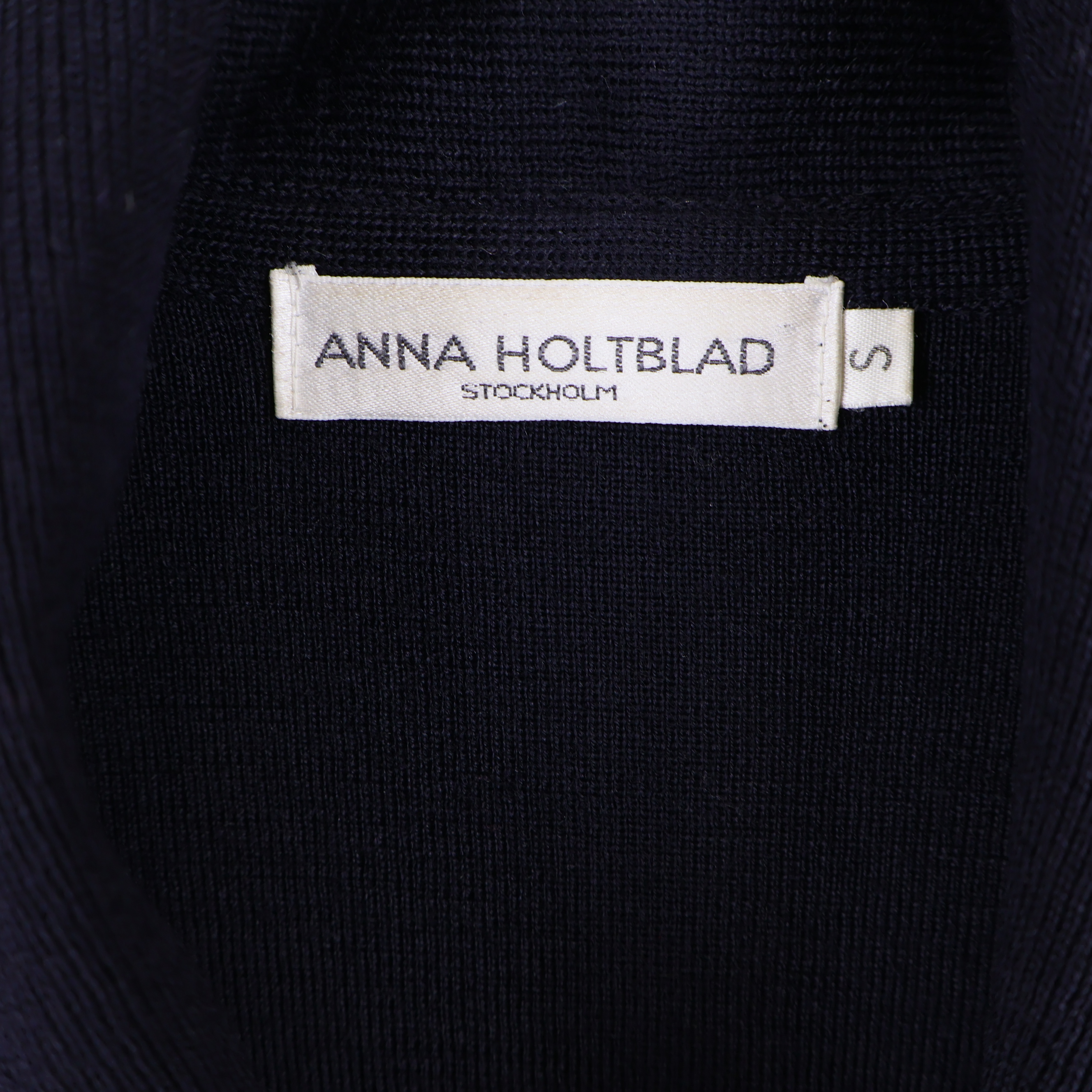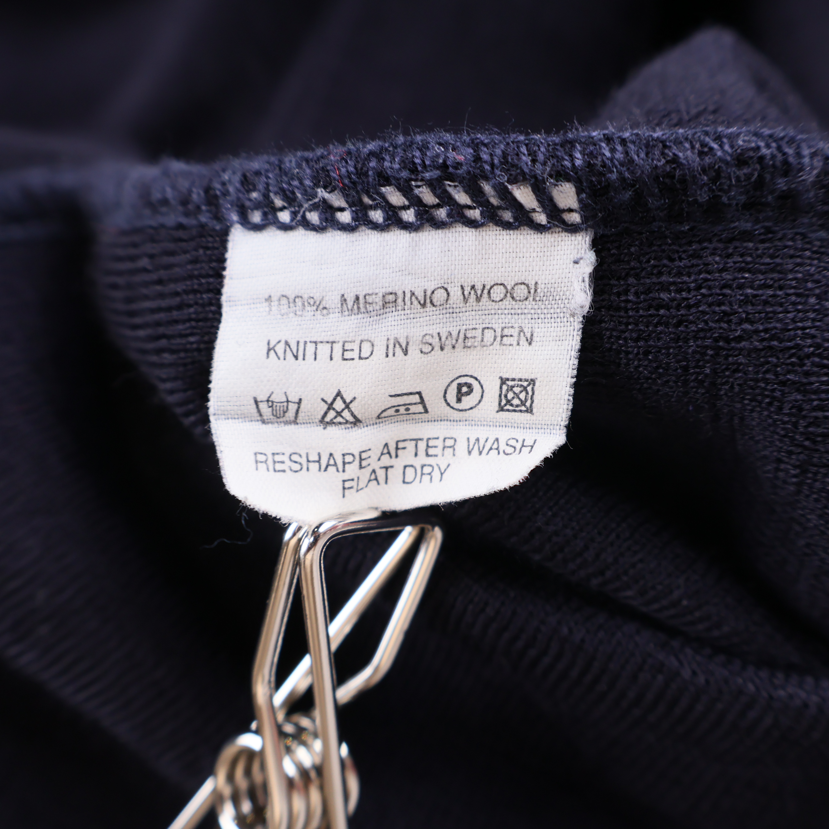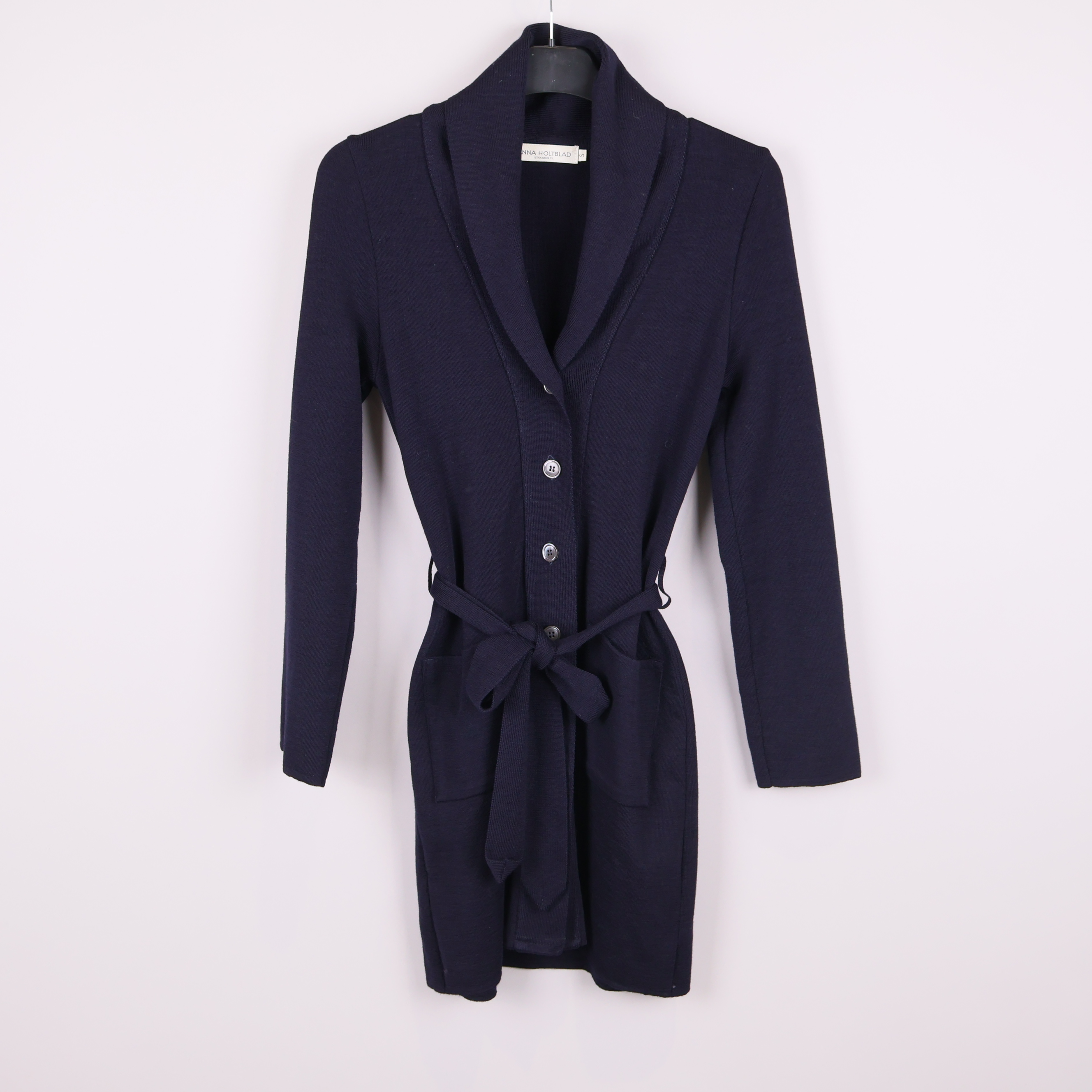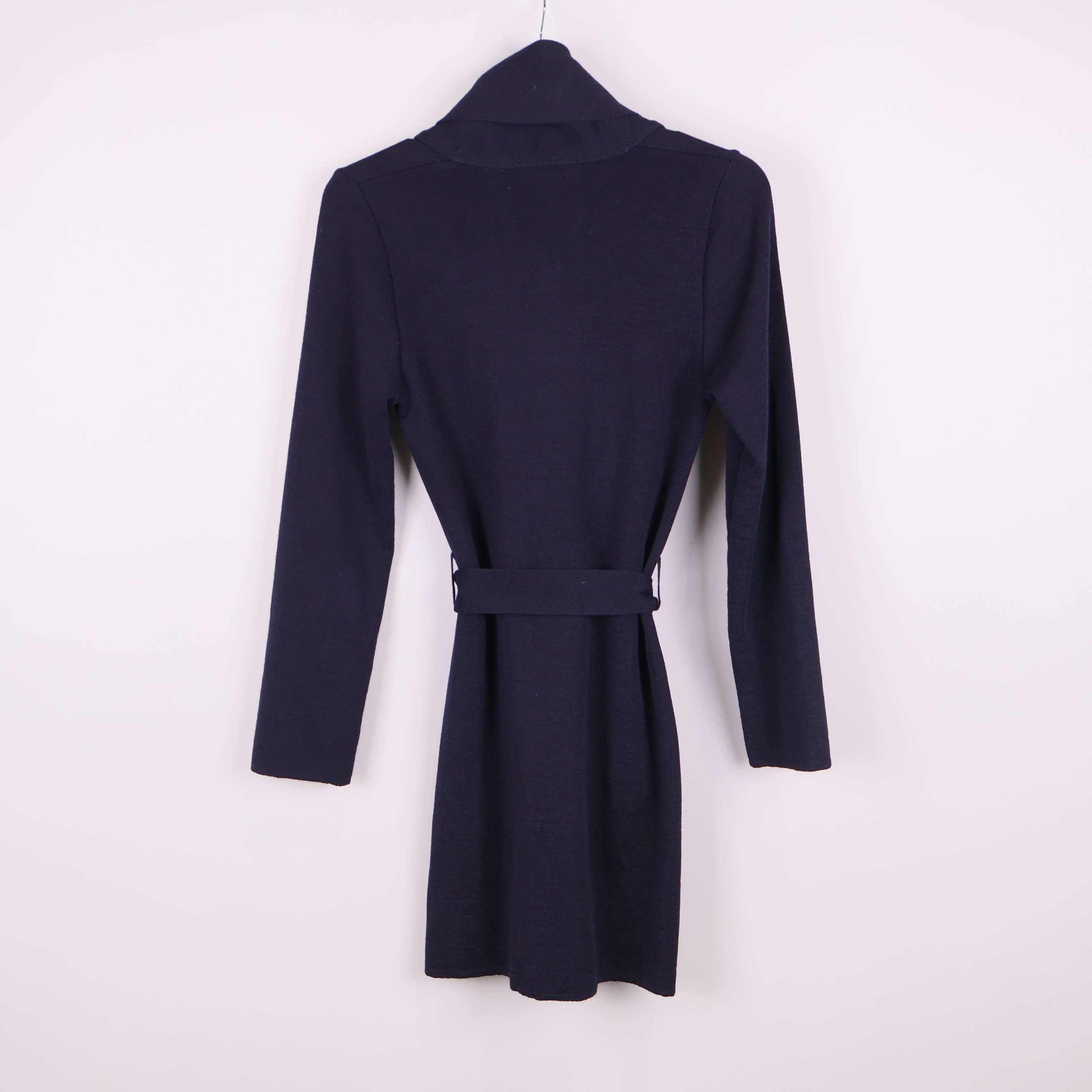 Stilren lång kofta i mörkblått med knappar framtill och avtagbart knytskärp i midjan. Koftan har två framfickor och en elegant sjalkrage för en tidlös och mjuk look. Tillverkad av 100% merinoull.