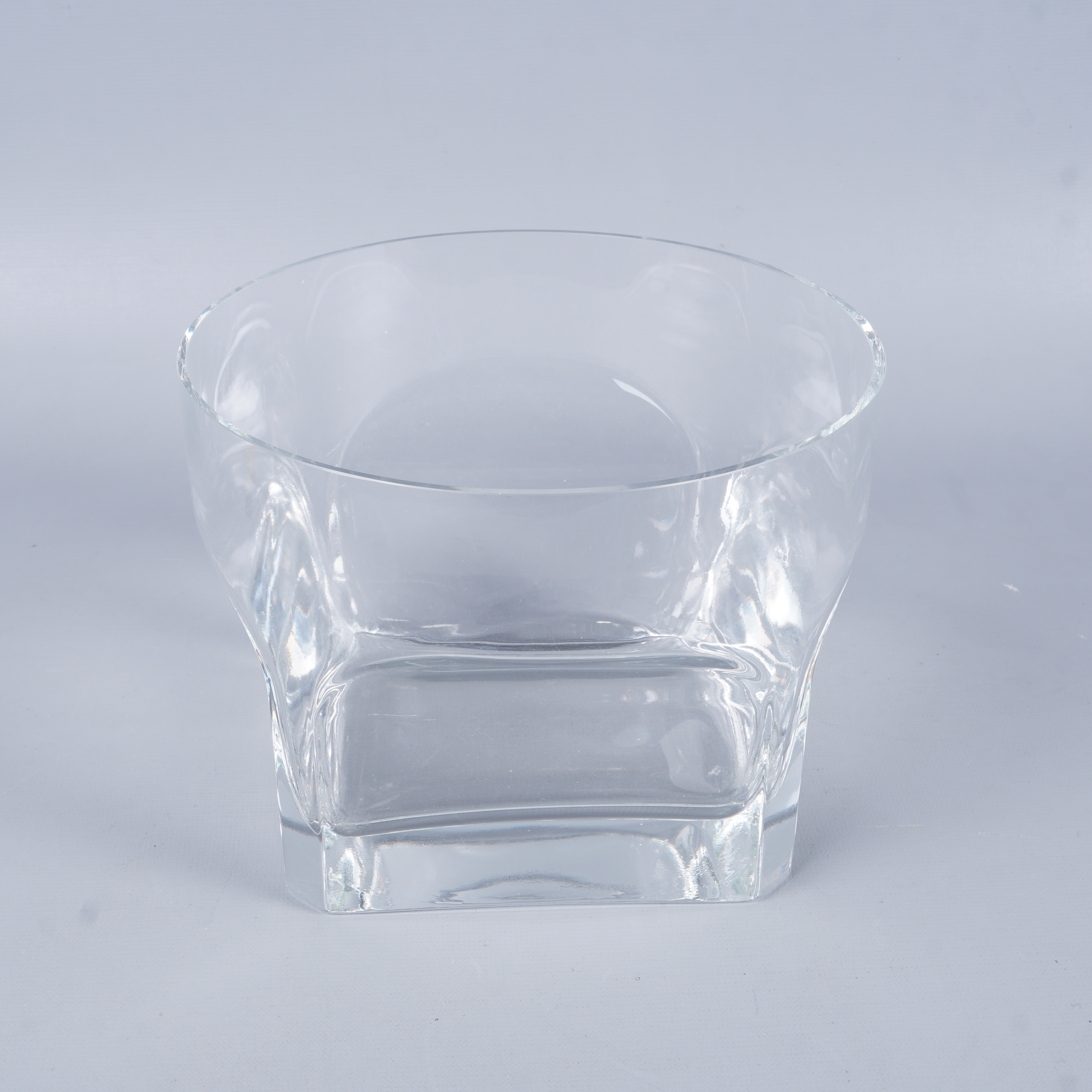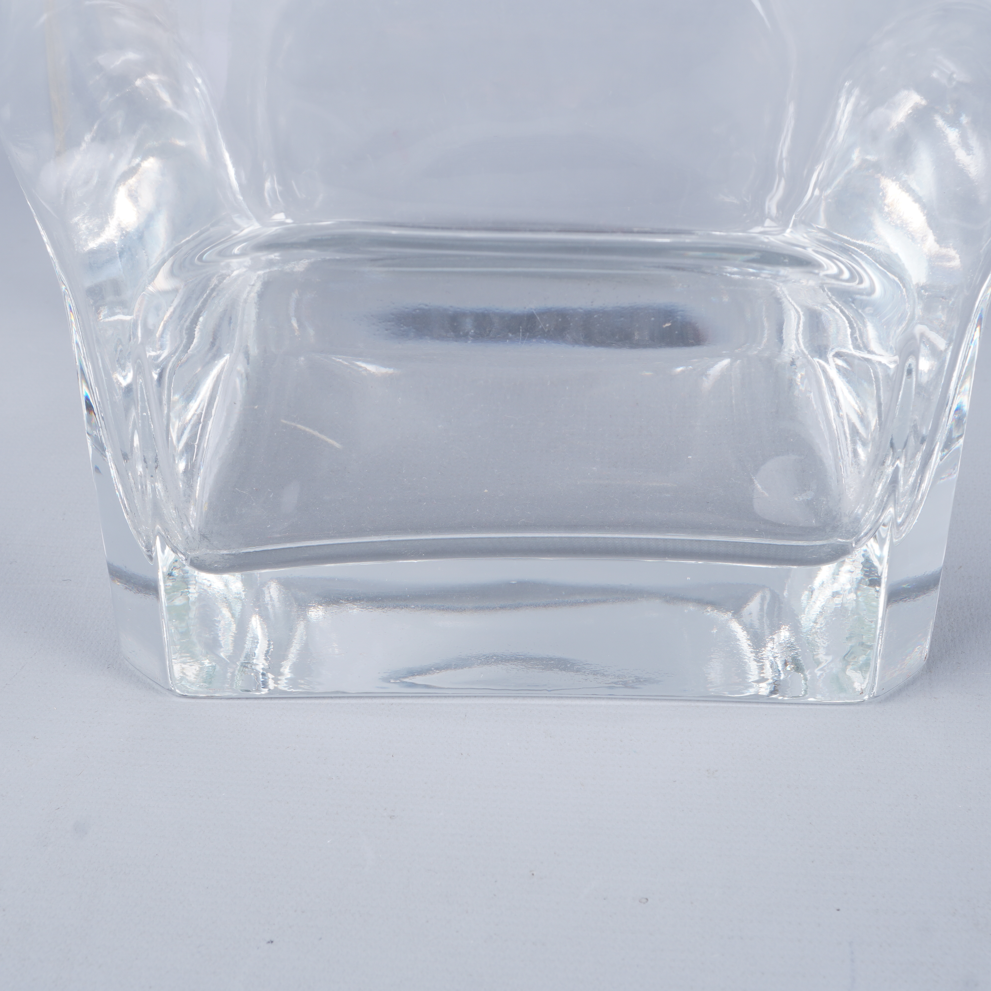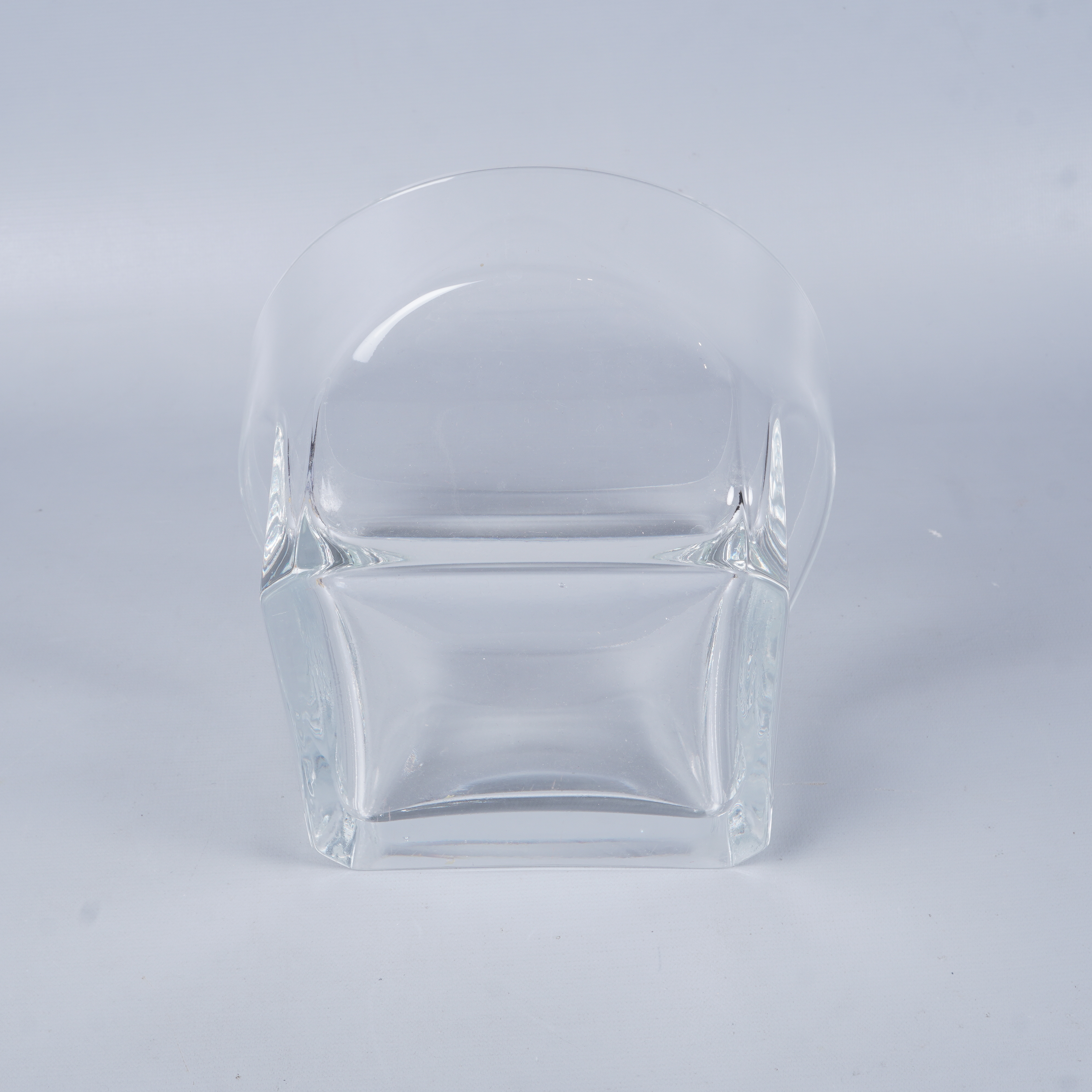 Arabia Nuutajärvi, designer Pentti Santalahti. Stilren glasskål med rundad topp och tydligt fyrkantig botten. Det genomskinliga glaset ger ett modernt och elegant uttryck.
