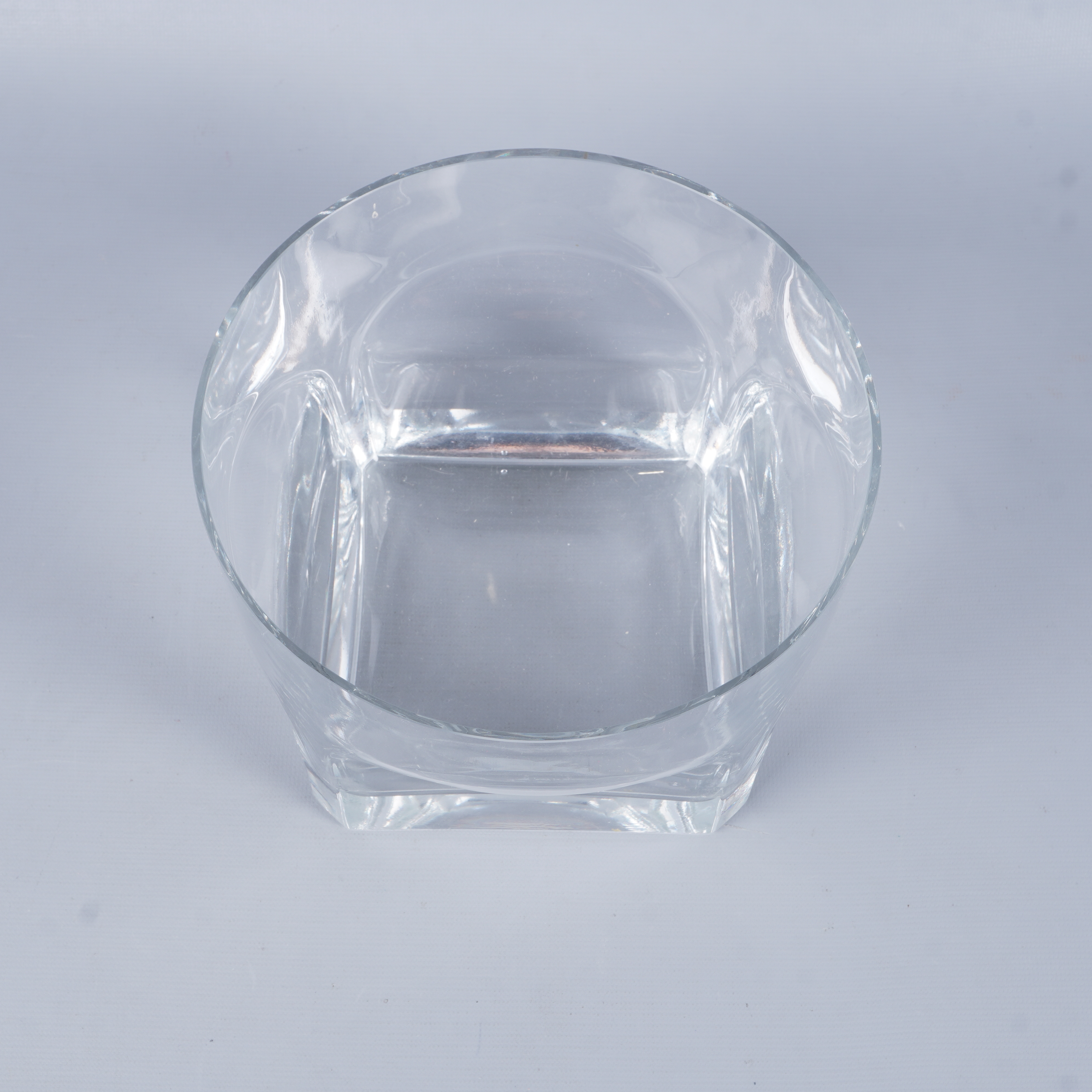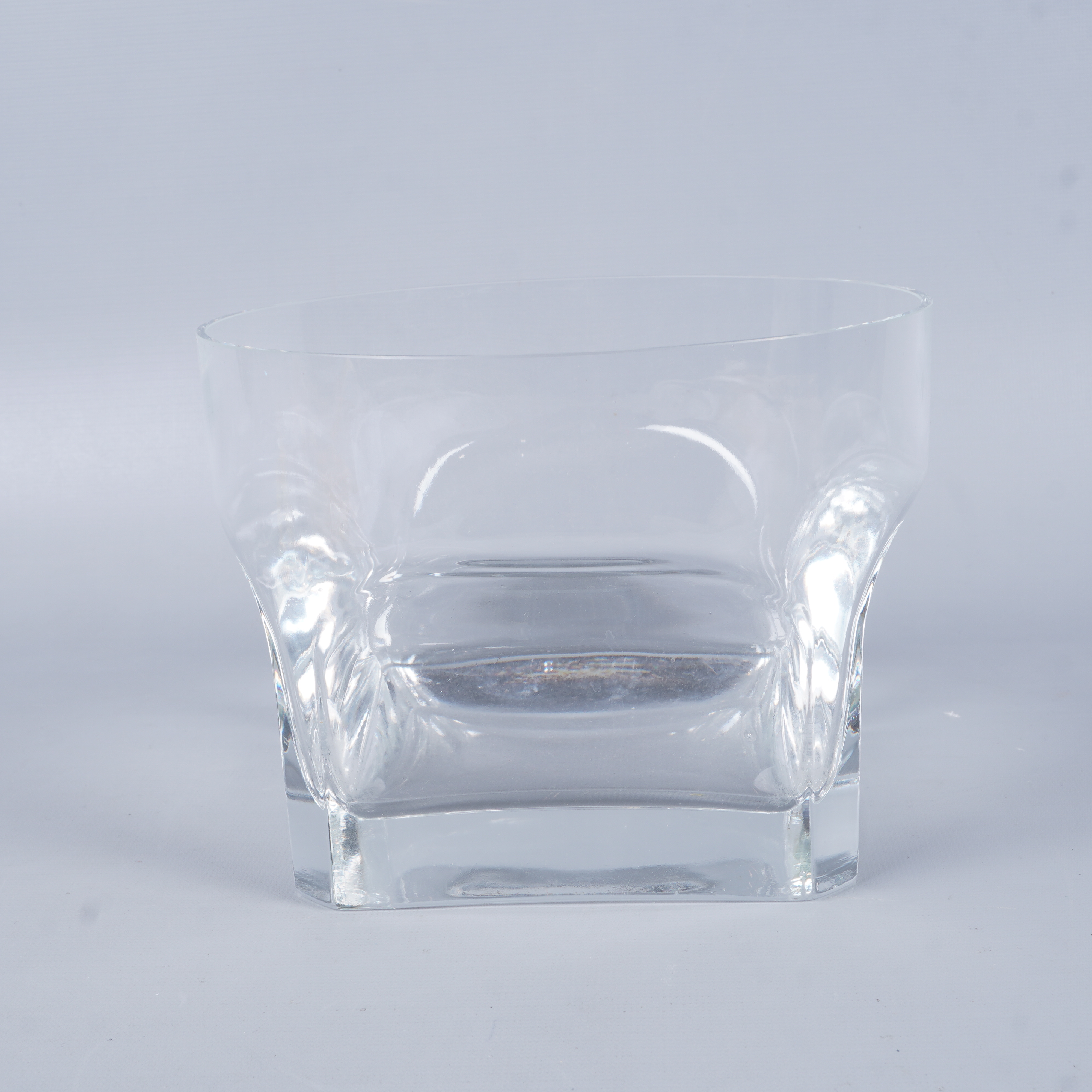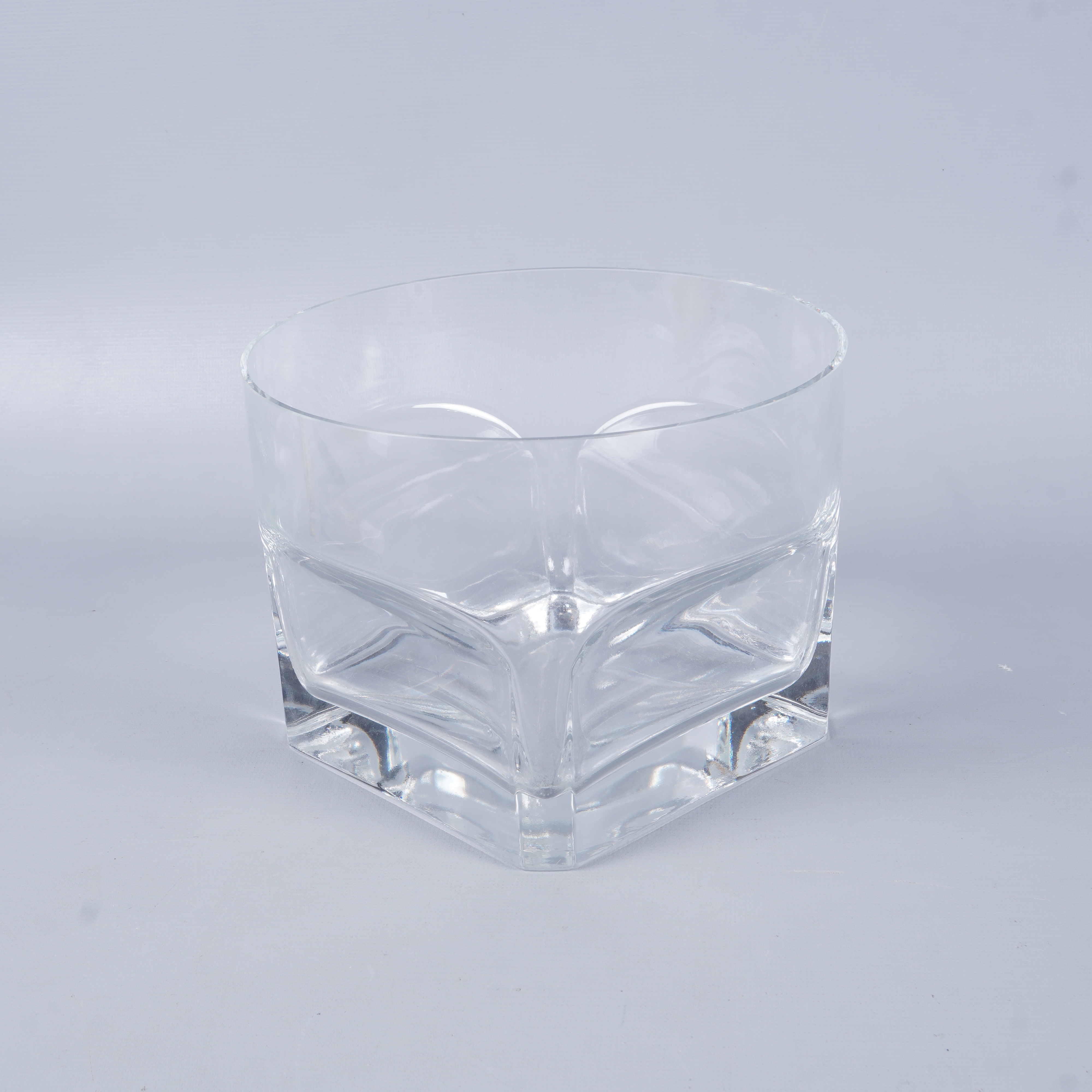 Arabia Nuutajärvi, designer Pentti Santalahti. Stilren glasskål med rundad topp och tydligt fyrkantig botten. Det genomskinliga glaset ger ett modernt och elegant uttryck.