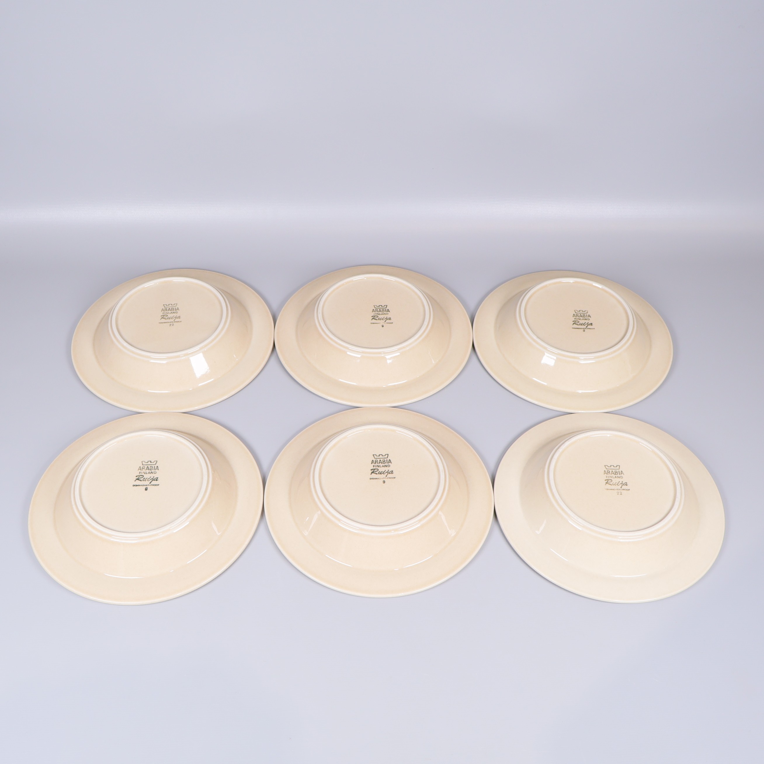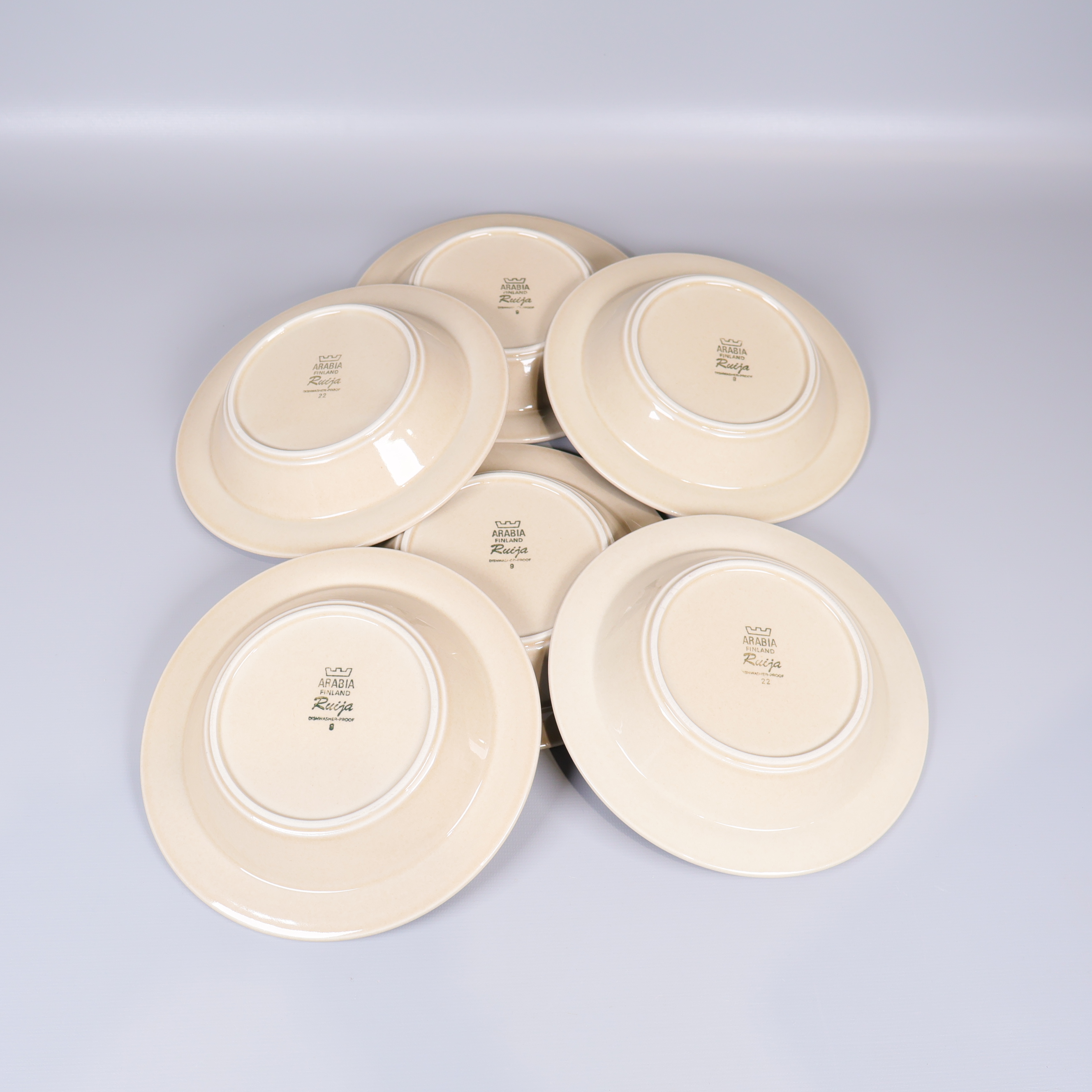 Arabia Finland Arabia - Ruija - Djupa tallrikar - 6st 249 kr Product variation Antal st Beskrivning Sats om sex djupa tallrikar med klassiskt retro-utseende från Arabia Finland. Visa all beskrivning Skick Gott skick Produkten har använts men är av fin kvalitet, det kan förekomma mindre förslitningar. Läs mer om hur vi bedömer Dimensions Ca Höjd: 3cm Diameter: 20cm Färg Beige Varumärke Arabia Finland Produkten är unik och finns enbart som 1 st i lager. Fri frakt på alla köp över 990 kr. 14 dagars ångerrät.