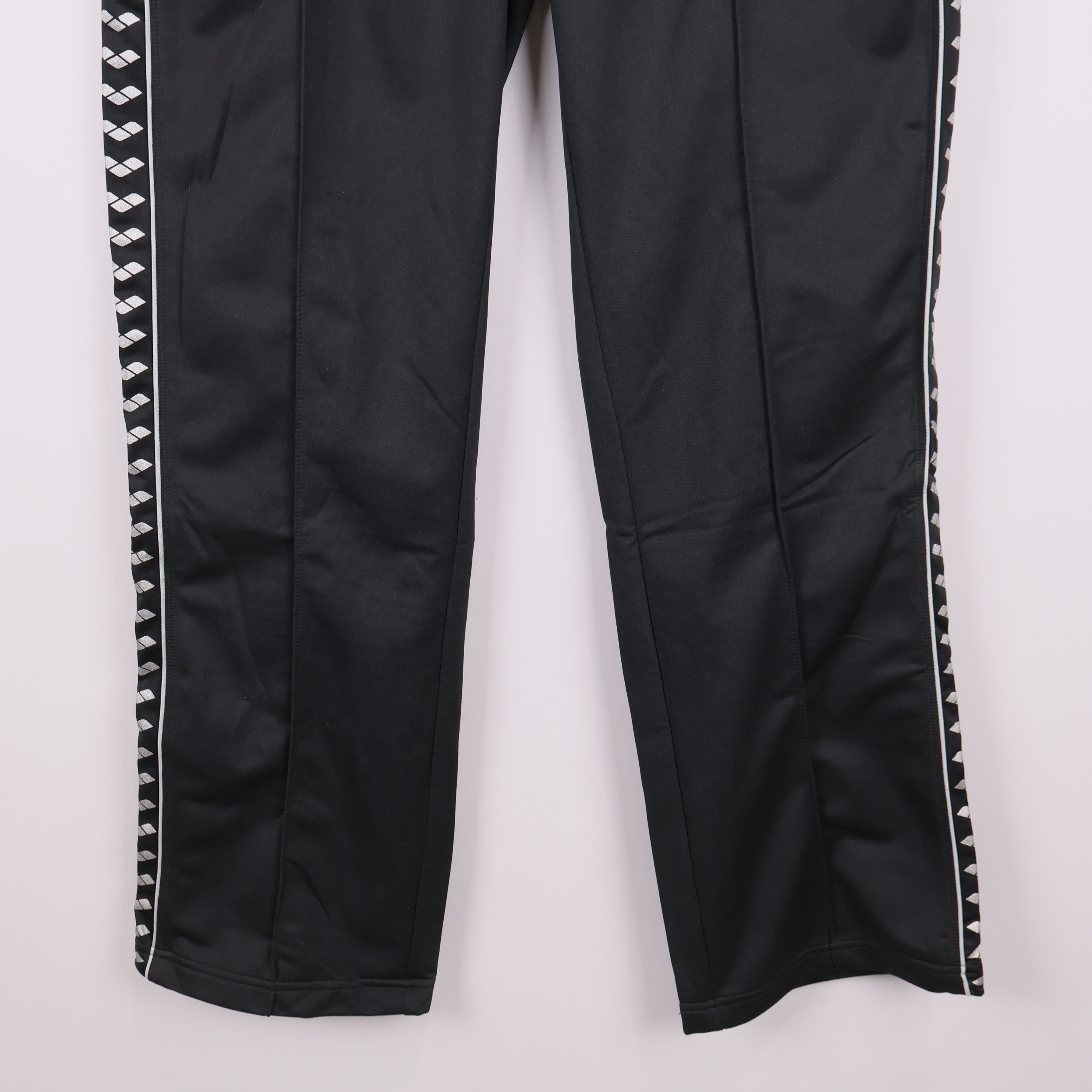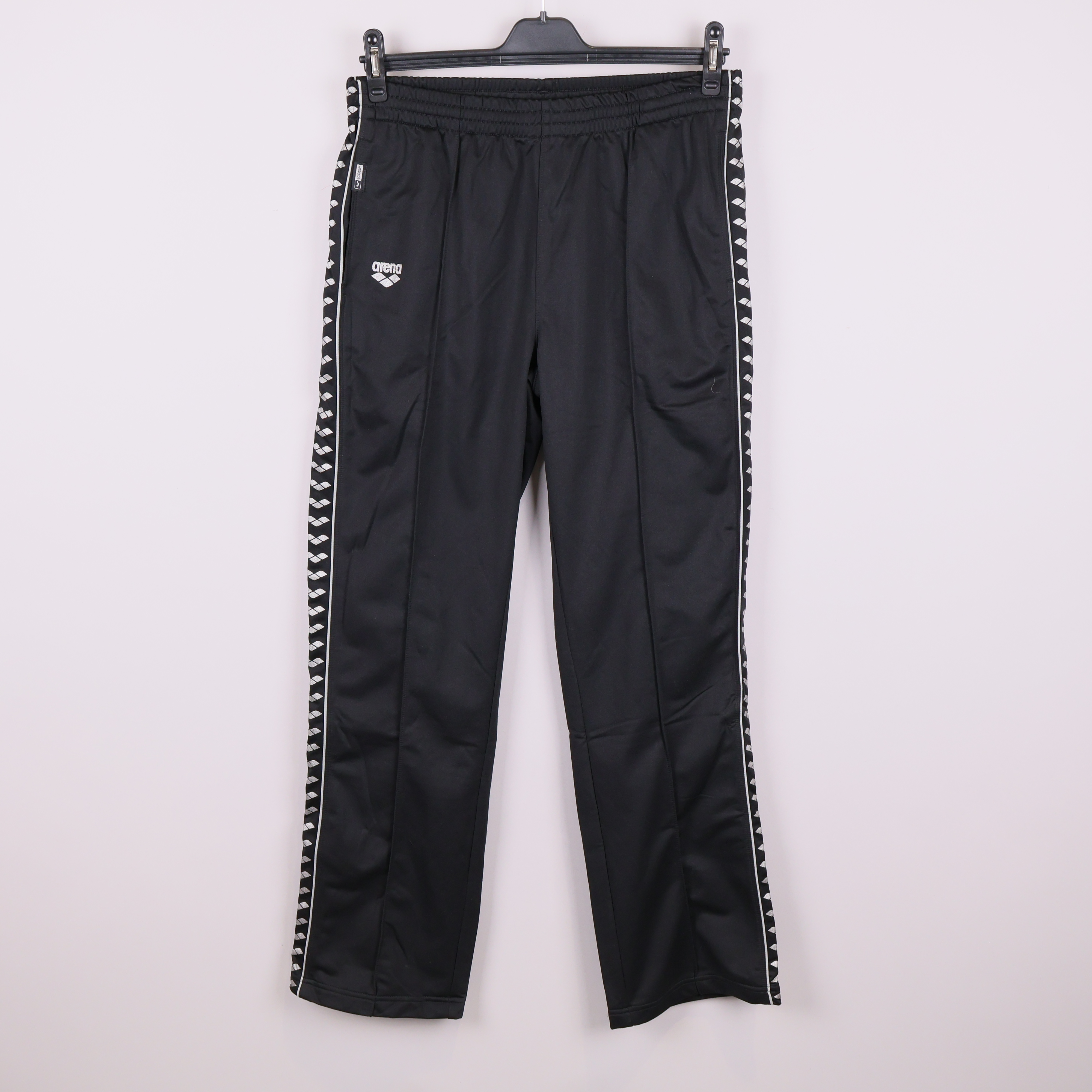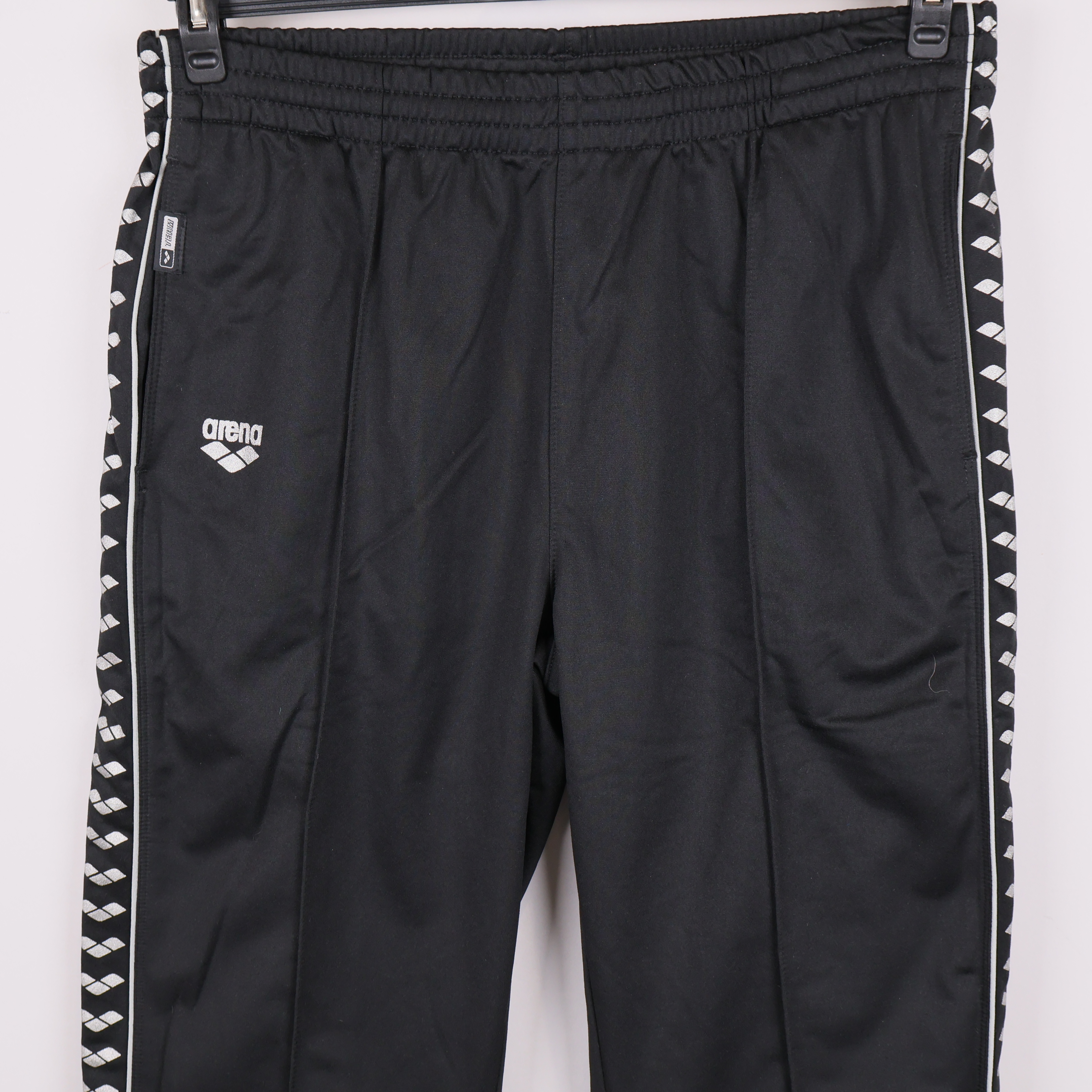 Sportiga svarta byxor från Arena med vita revärer längs sidorna och elastisk midja med dragsko.