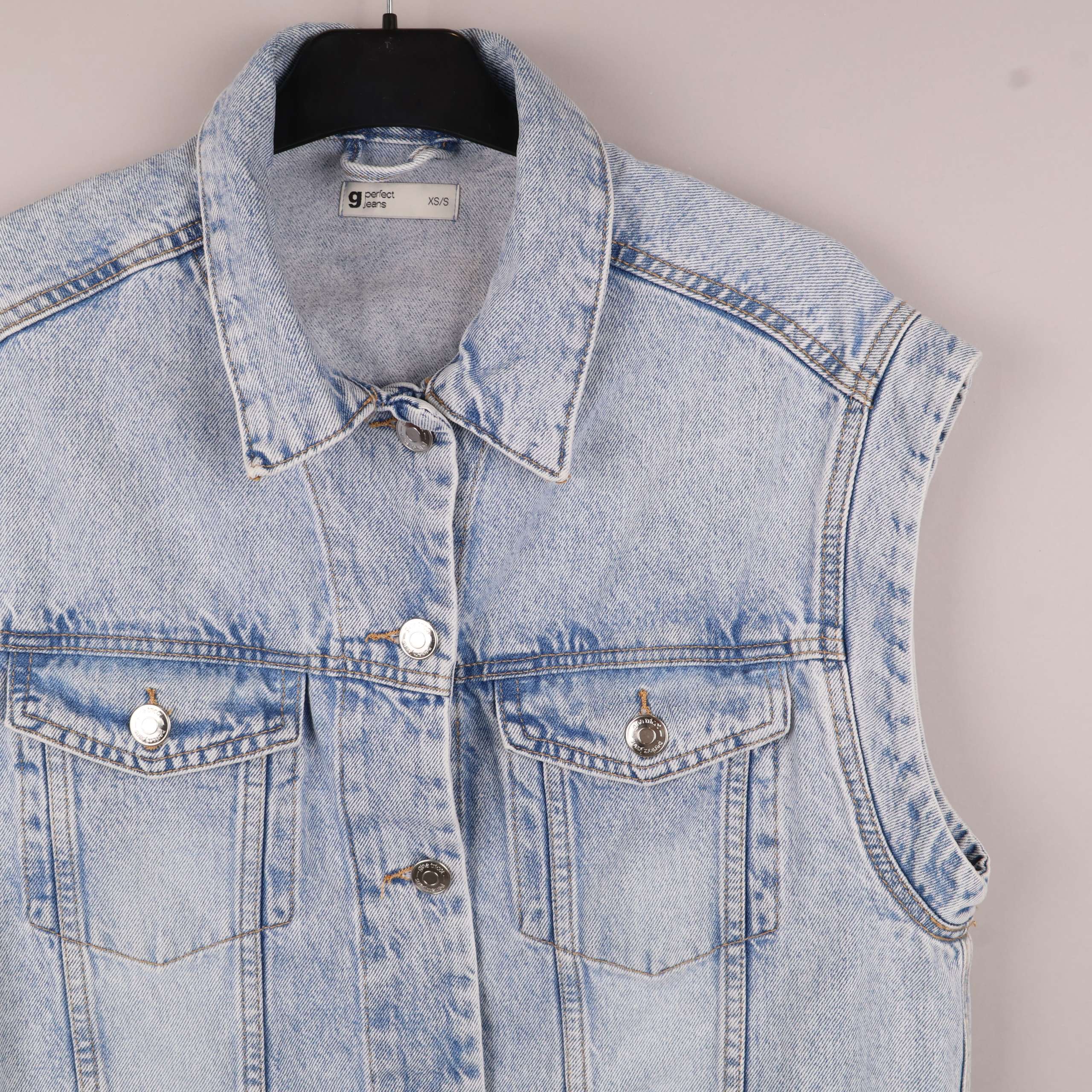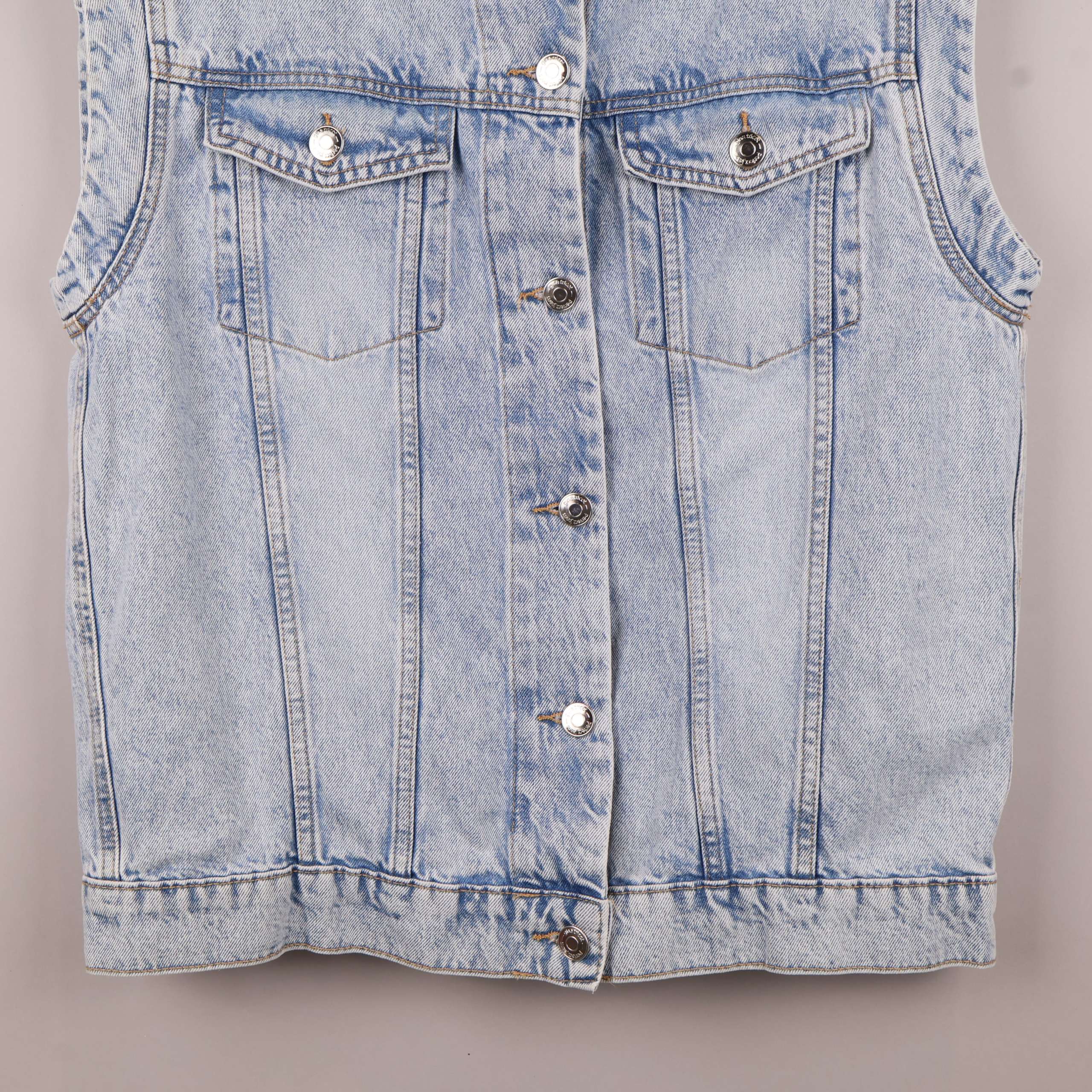 Klassisk ärmlös denimväst med en vintage vibe. Tillverkad i 100% bomull för en mjuk och slitstark känsla. Fyrknappslåsning och två framfickor med knapp stängning ger västen praktiska detaljer.