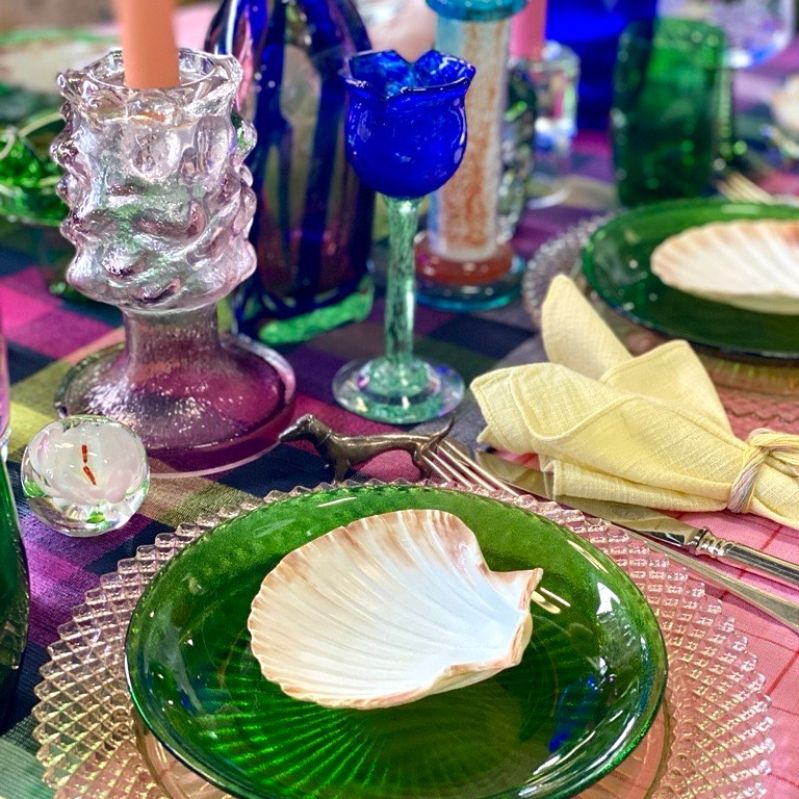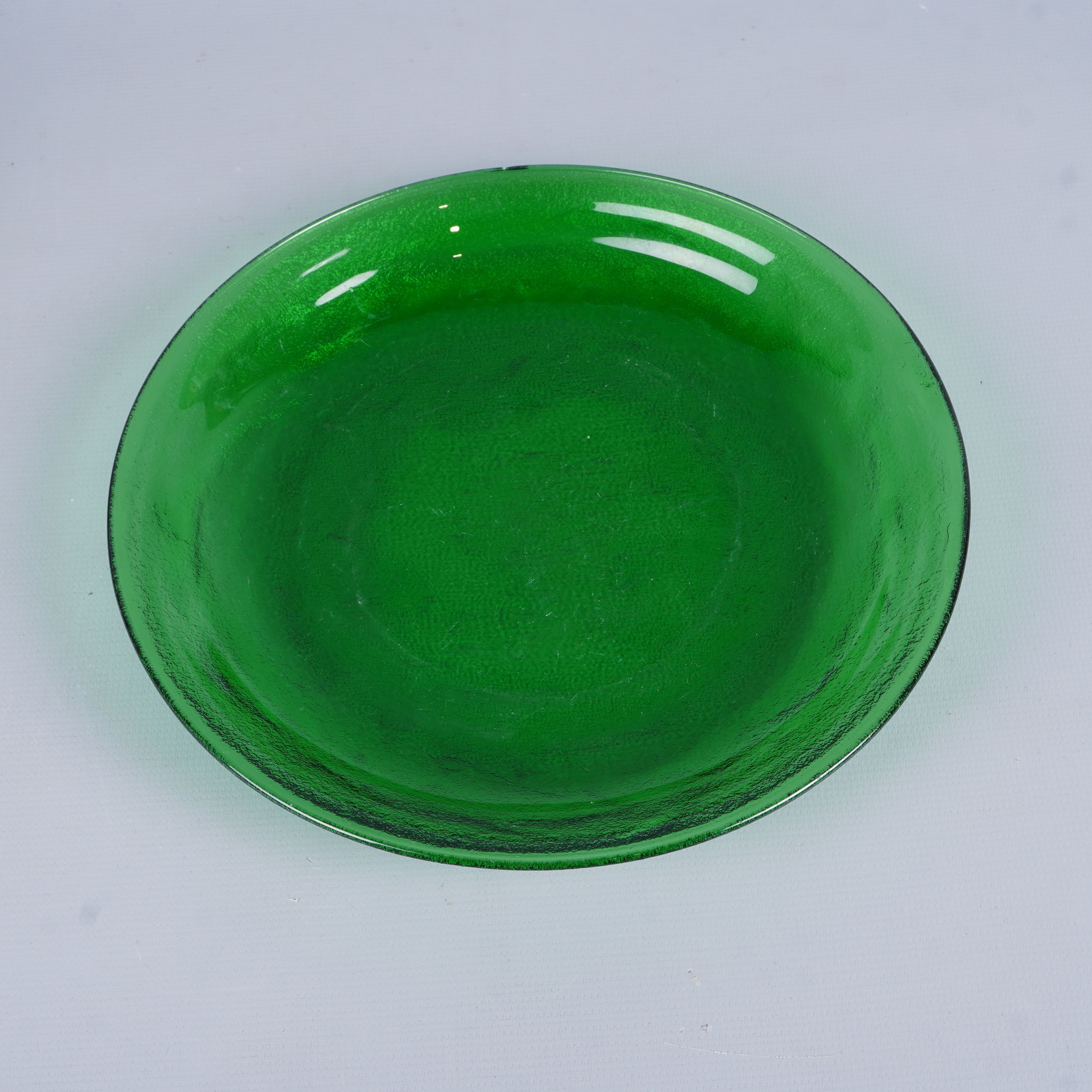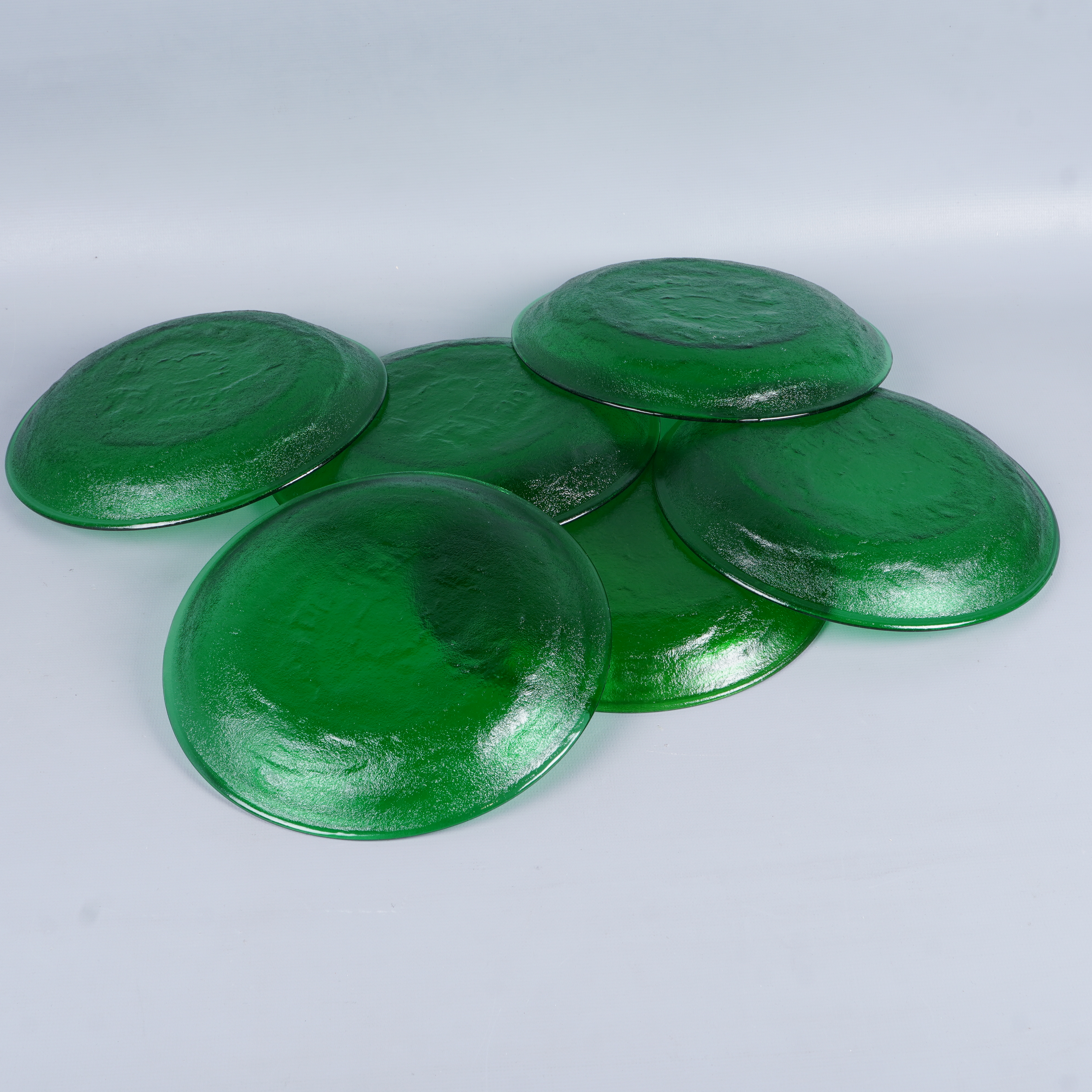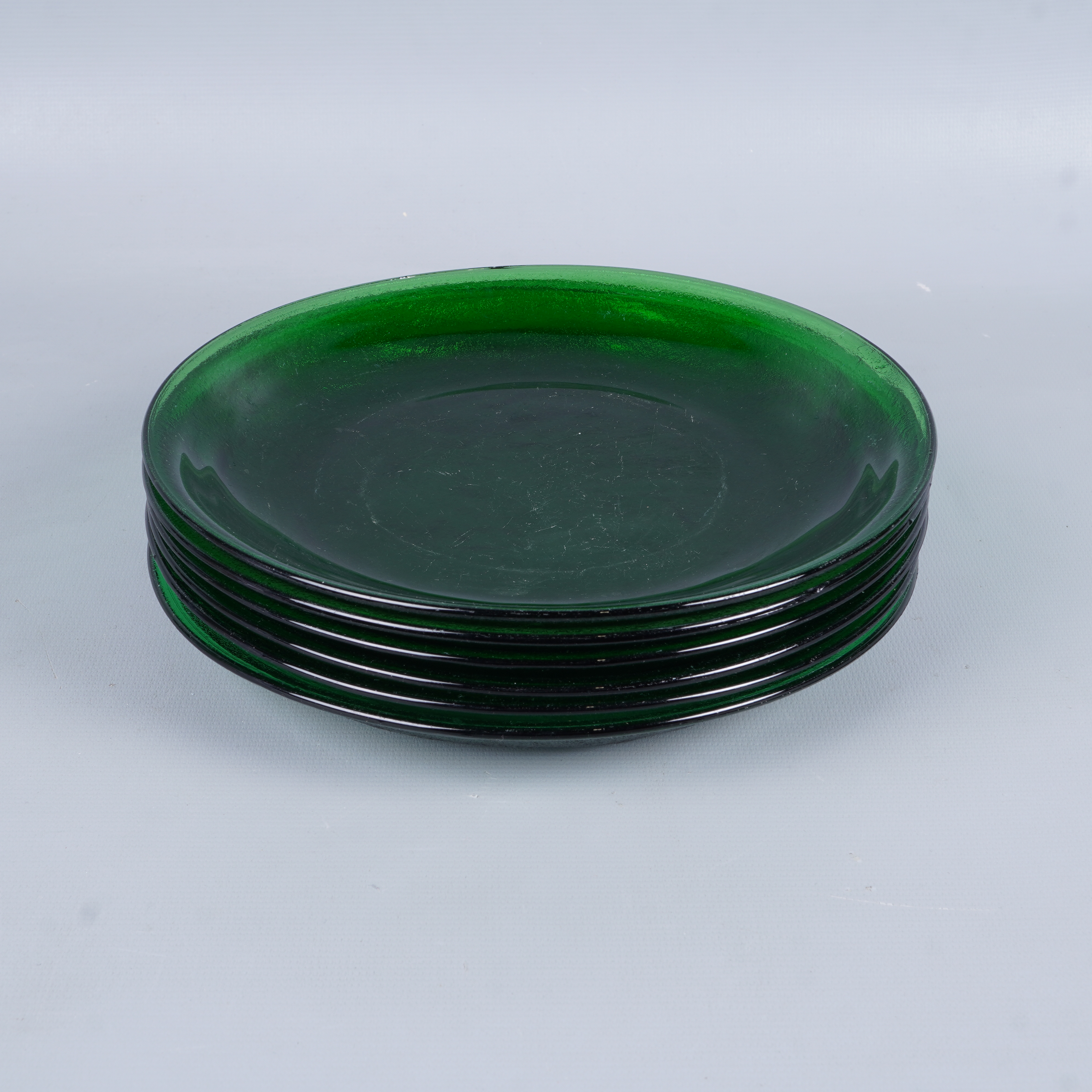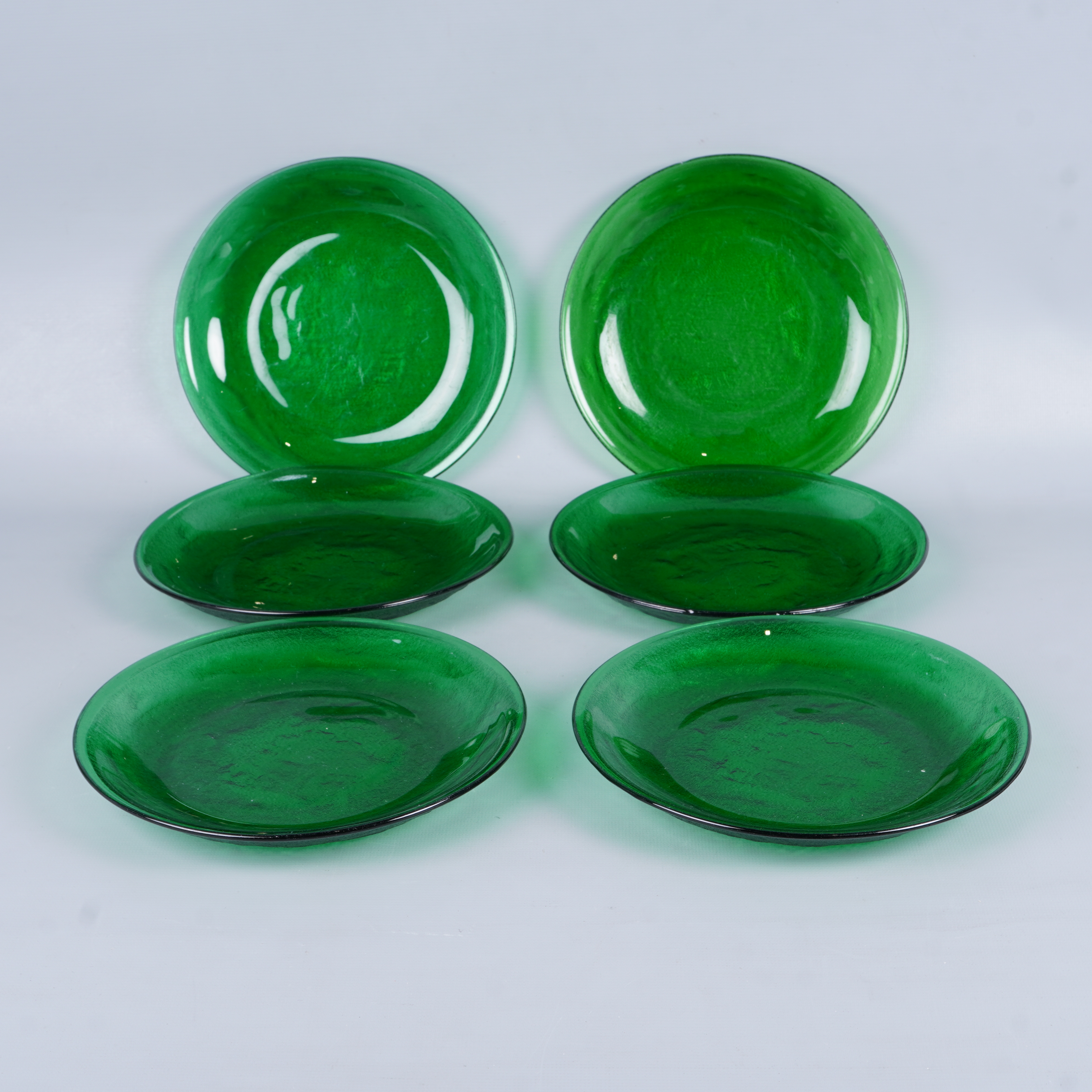 Sex gröna tallrikar i glas med en lätt strukturerad yta som ger en modern men tidlös känsla. Finishen är glänsande med tydlig djup grön färg. Perfekt för dig som uppskattar färgstark dukning och vill skapa en unik look på matbordet.