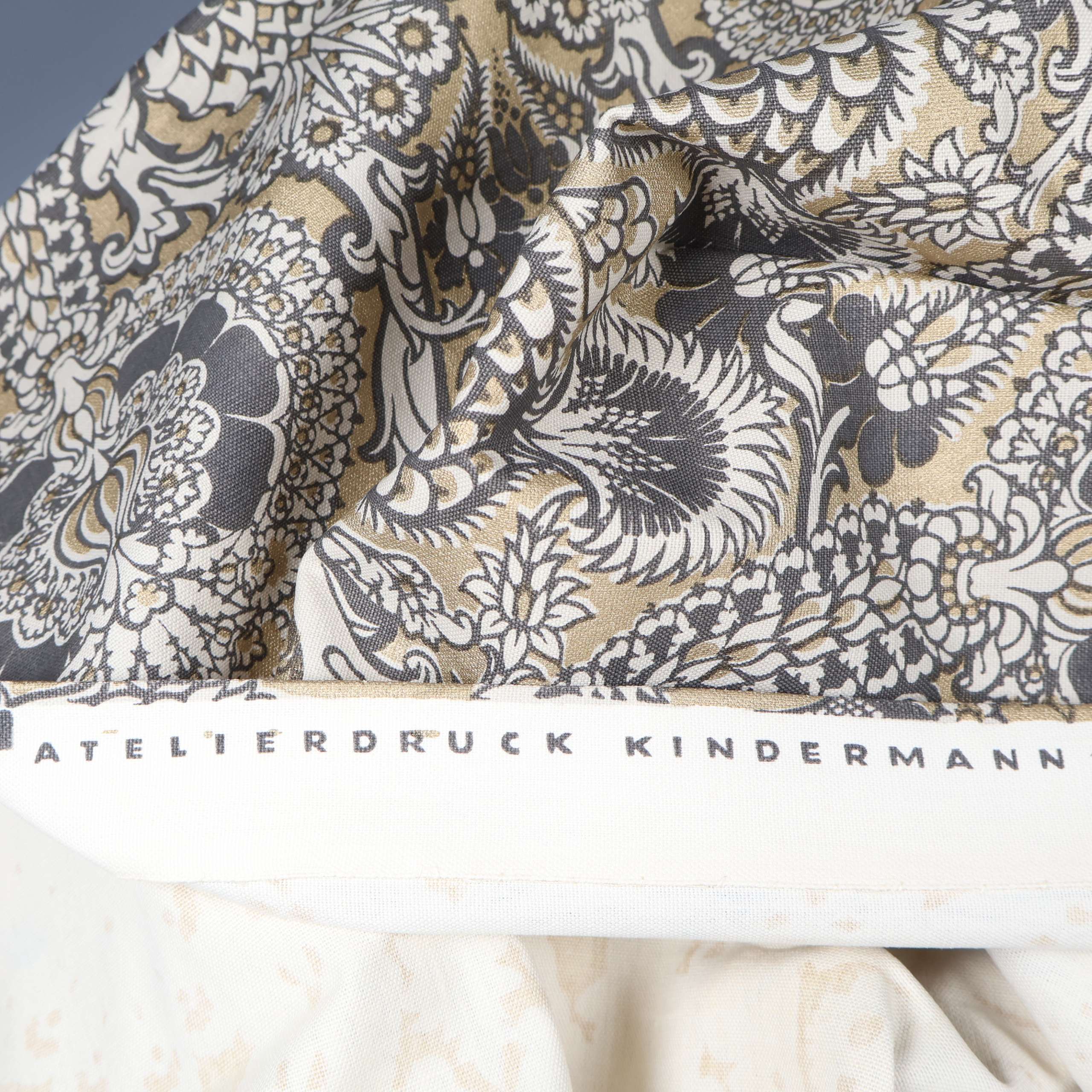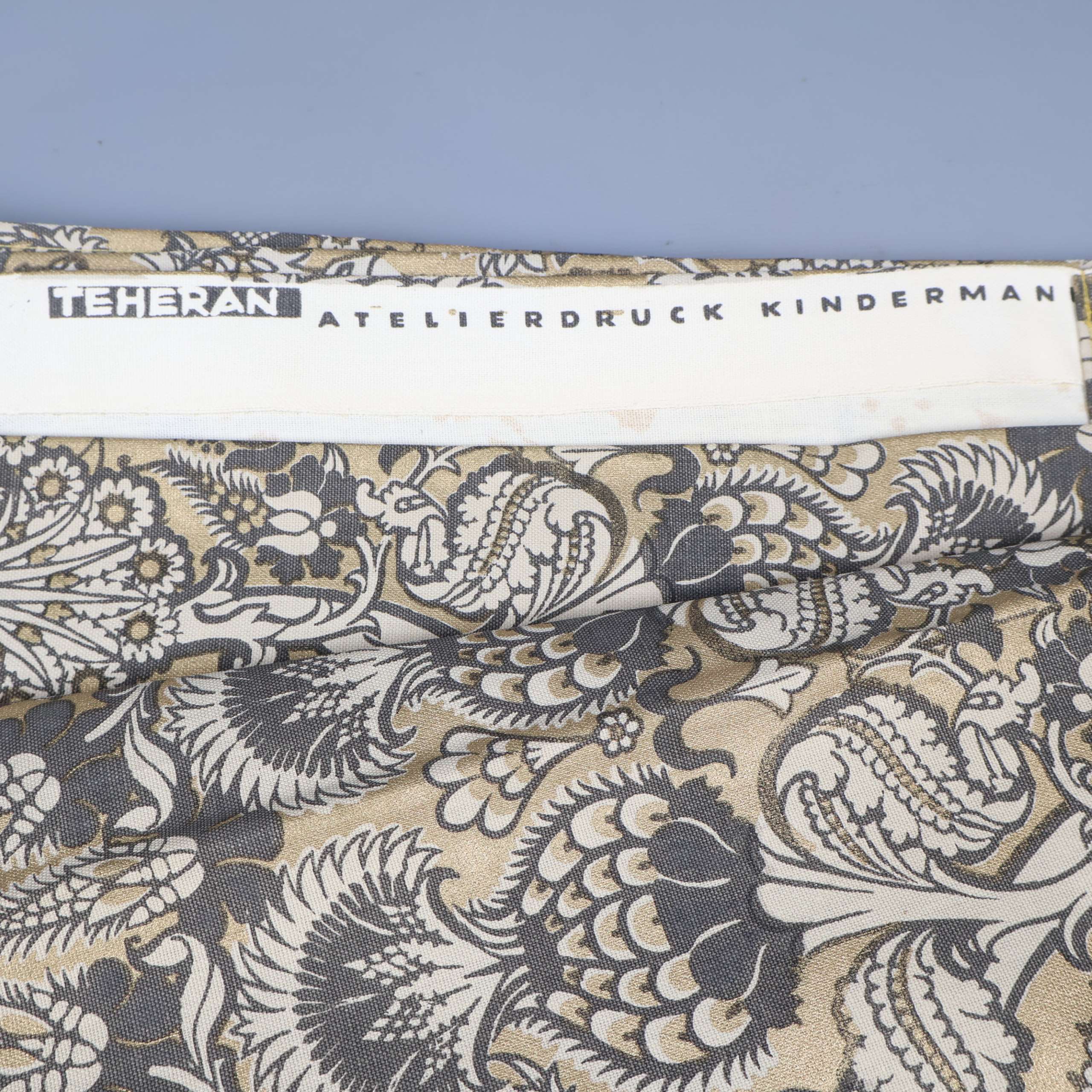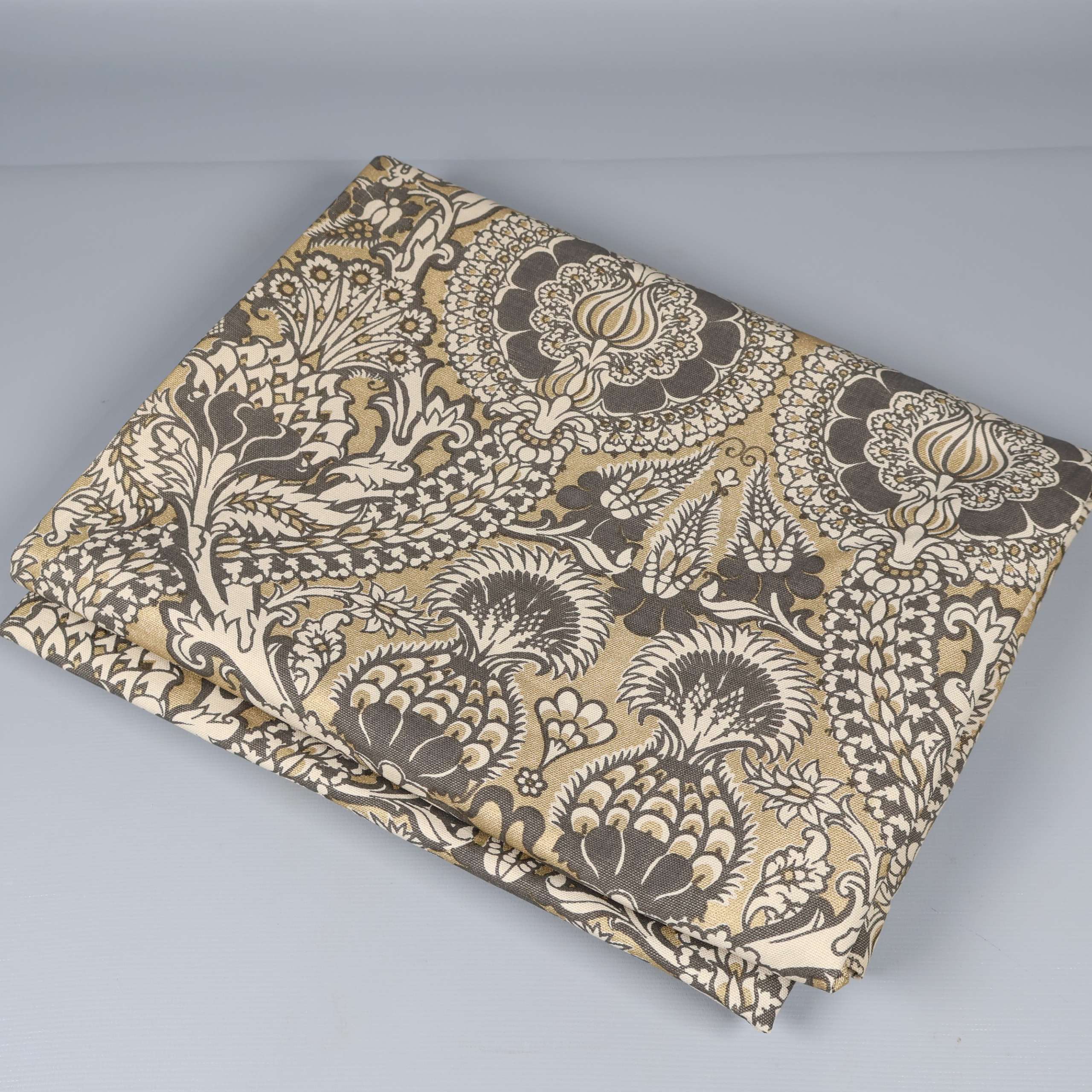Stilren duk med Teheran-mönster från Atelierdruck Kinderman. Tygstycket har ett dekorativt orientaliskt tryck i guld, beige och grågröna toner, vilket ger ett livfullt uttryck med vintage vibe. Perfekt för dig som vill skapa din egen inredningsstil. Kraftig bomull.