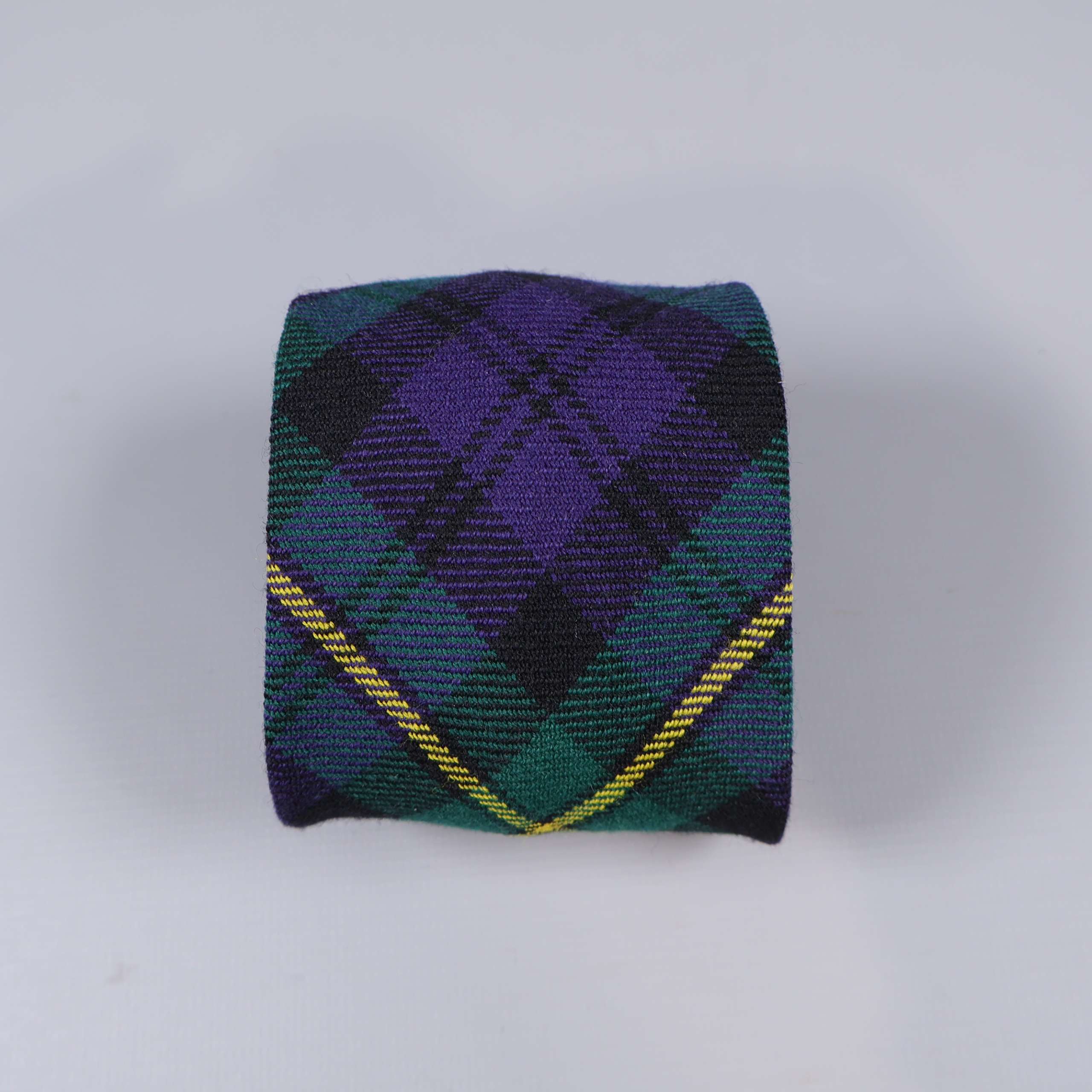 Stilren slips med klassiskt rutigt mönster i grönt, lila och gult, tillverkad helt i ull. Tidlös accessoar med skotskinspirerad design som passar både till formella och avslappnade outfits.