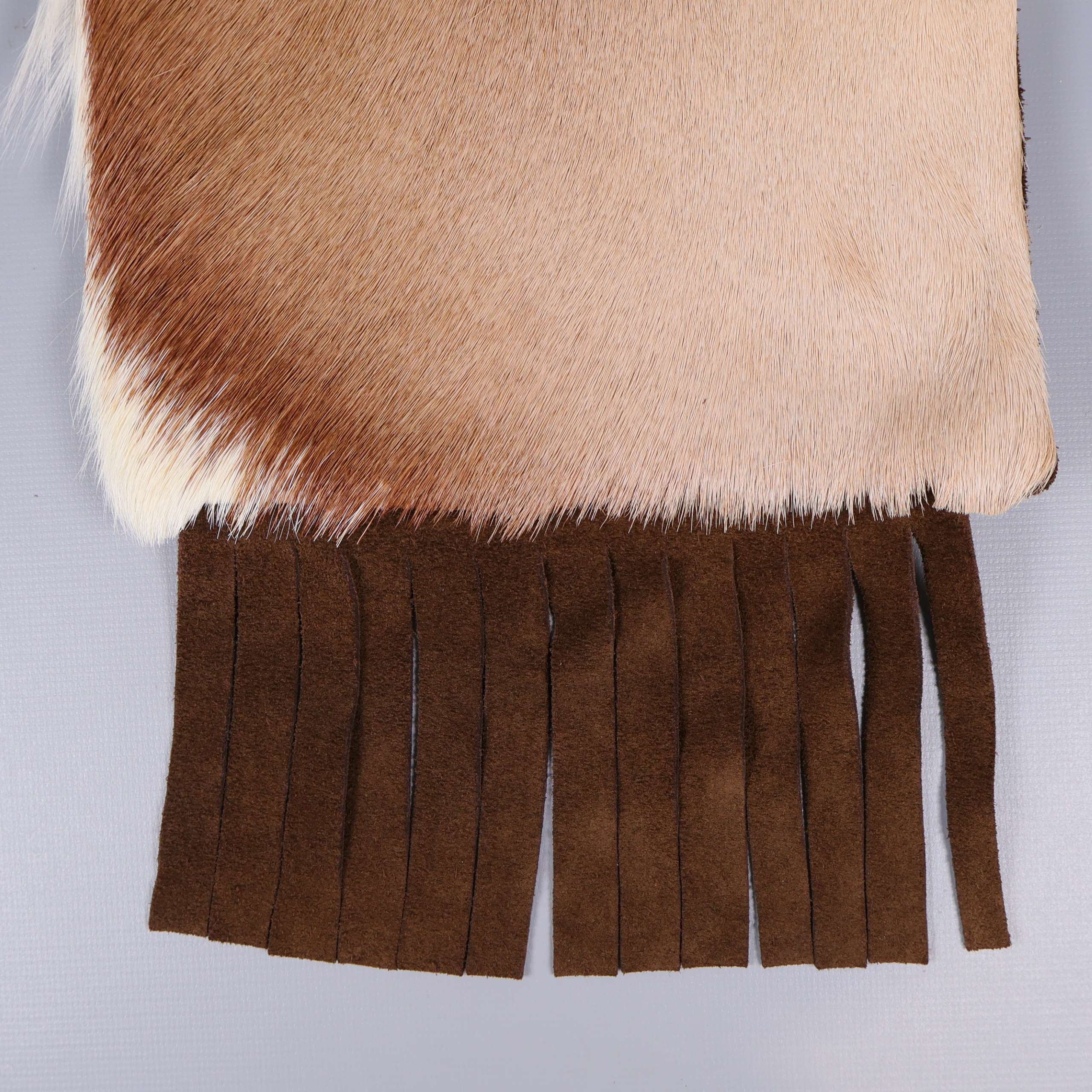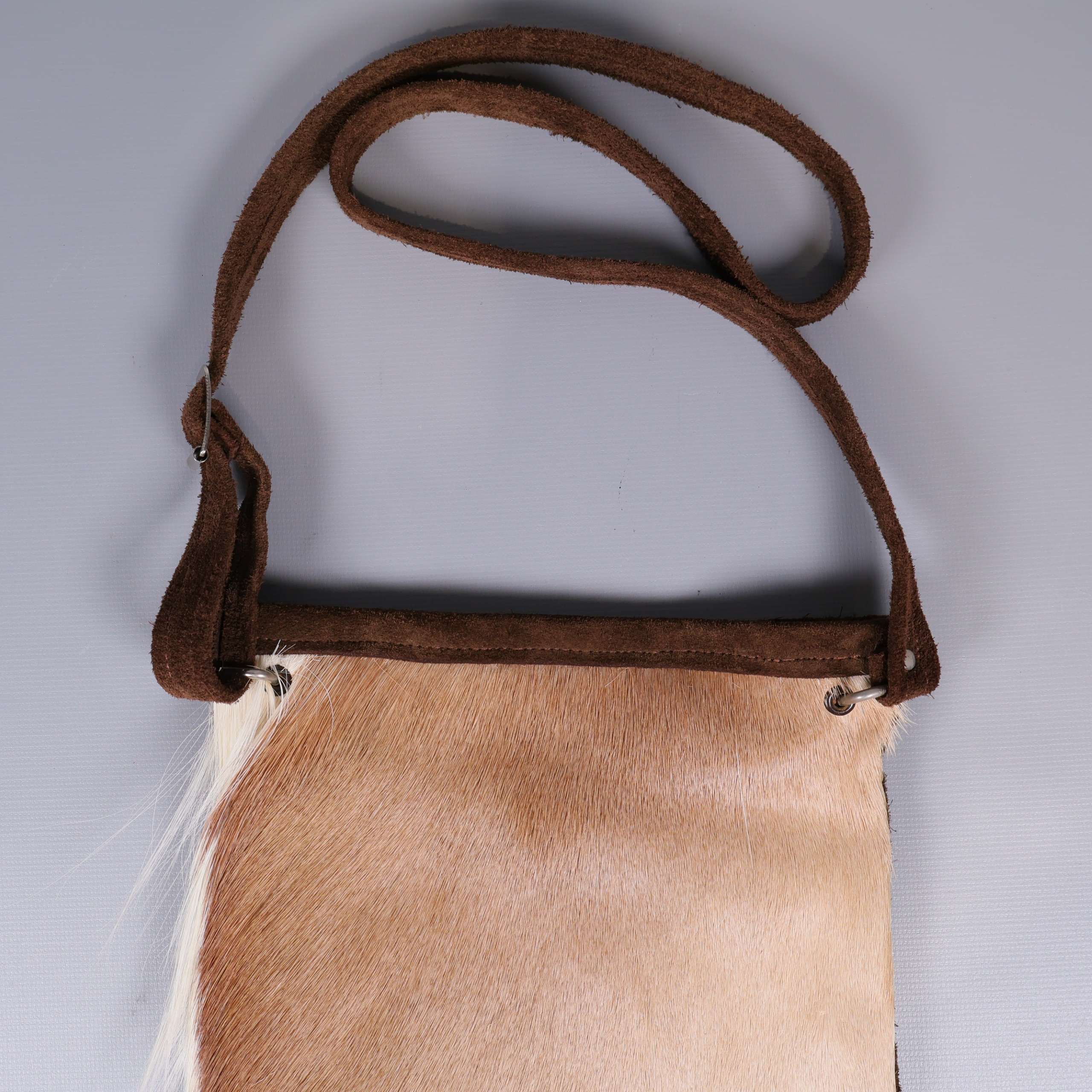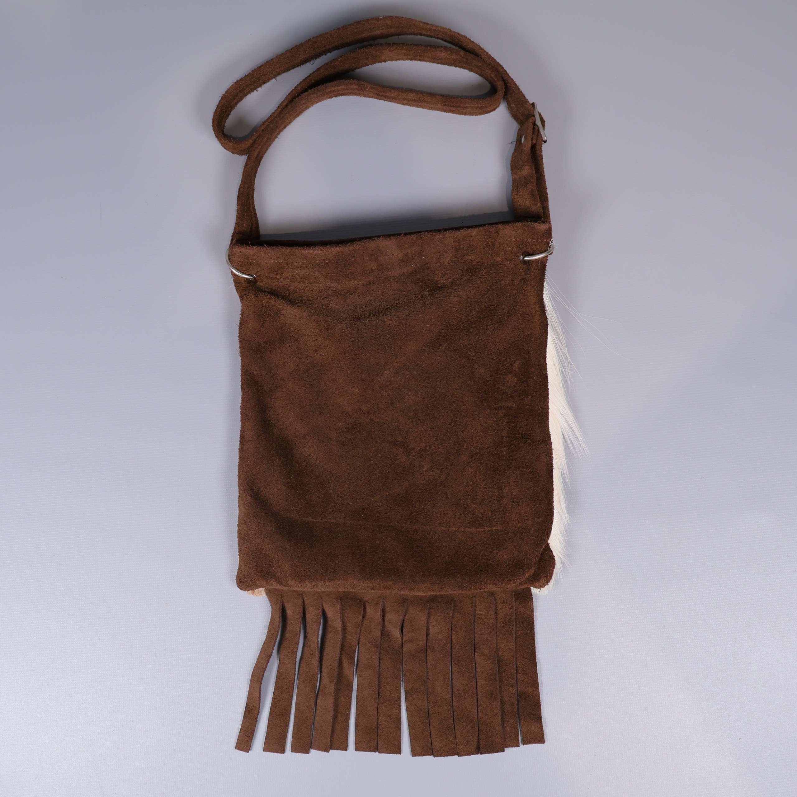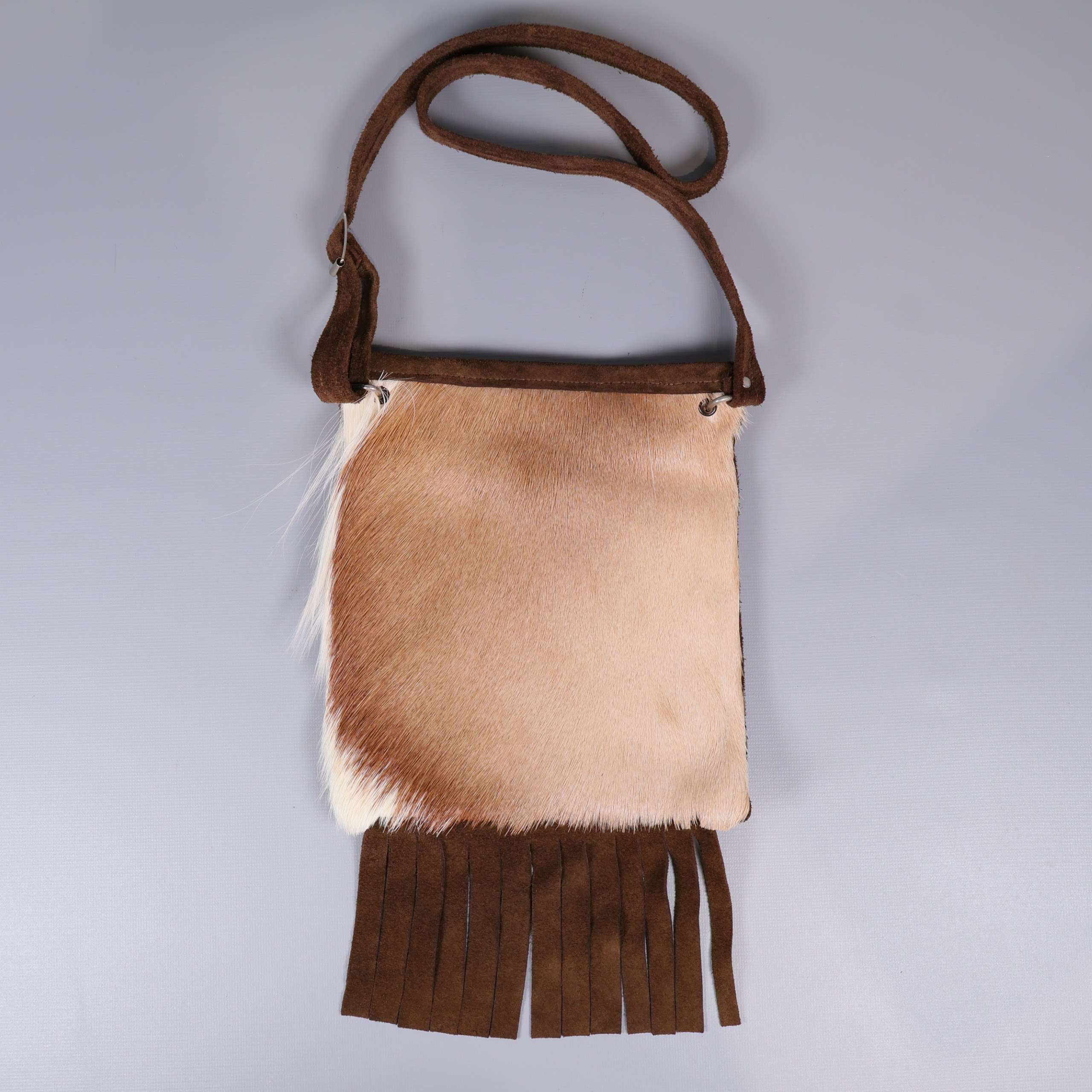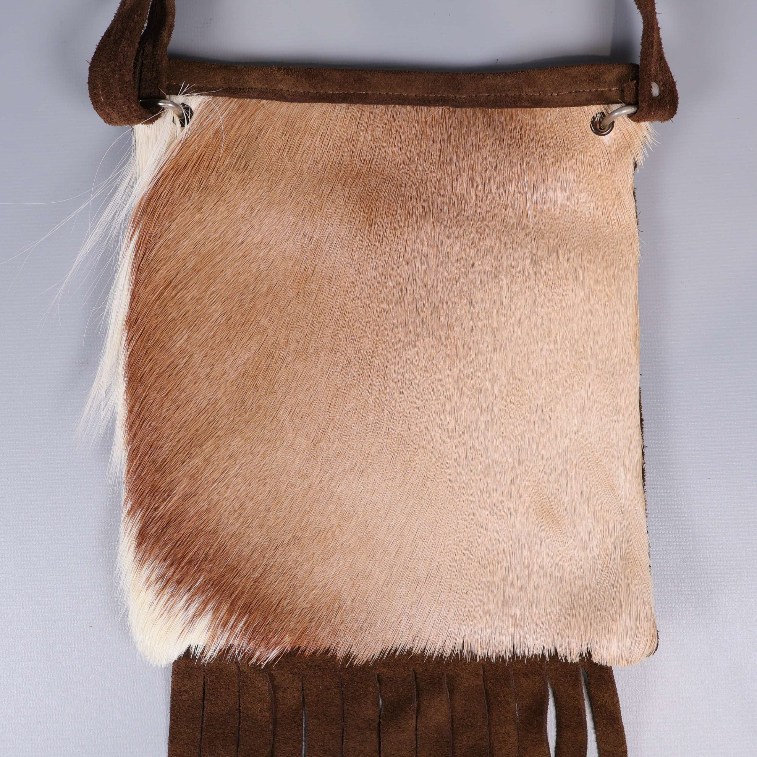Unik axelremsväska med en kombination av slät, ljus päls och mjuk brun mocka, dekorerad med långa fransar nedtill för en tydlig bohemian touch. Väskan har reglerbar rem som matchar modellens baksida. Mått: ca 22 x 24 cm