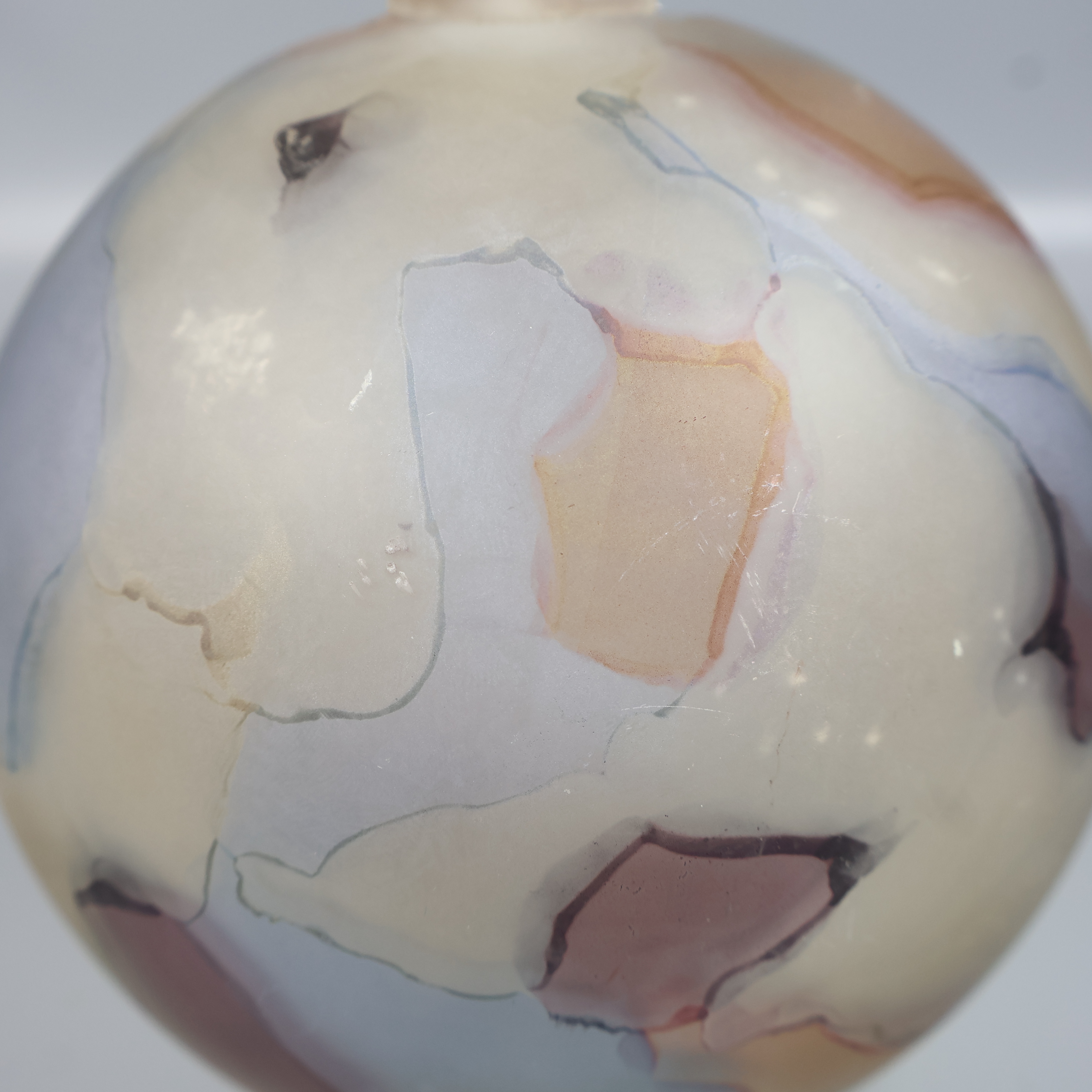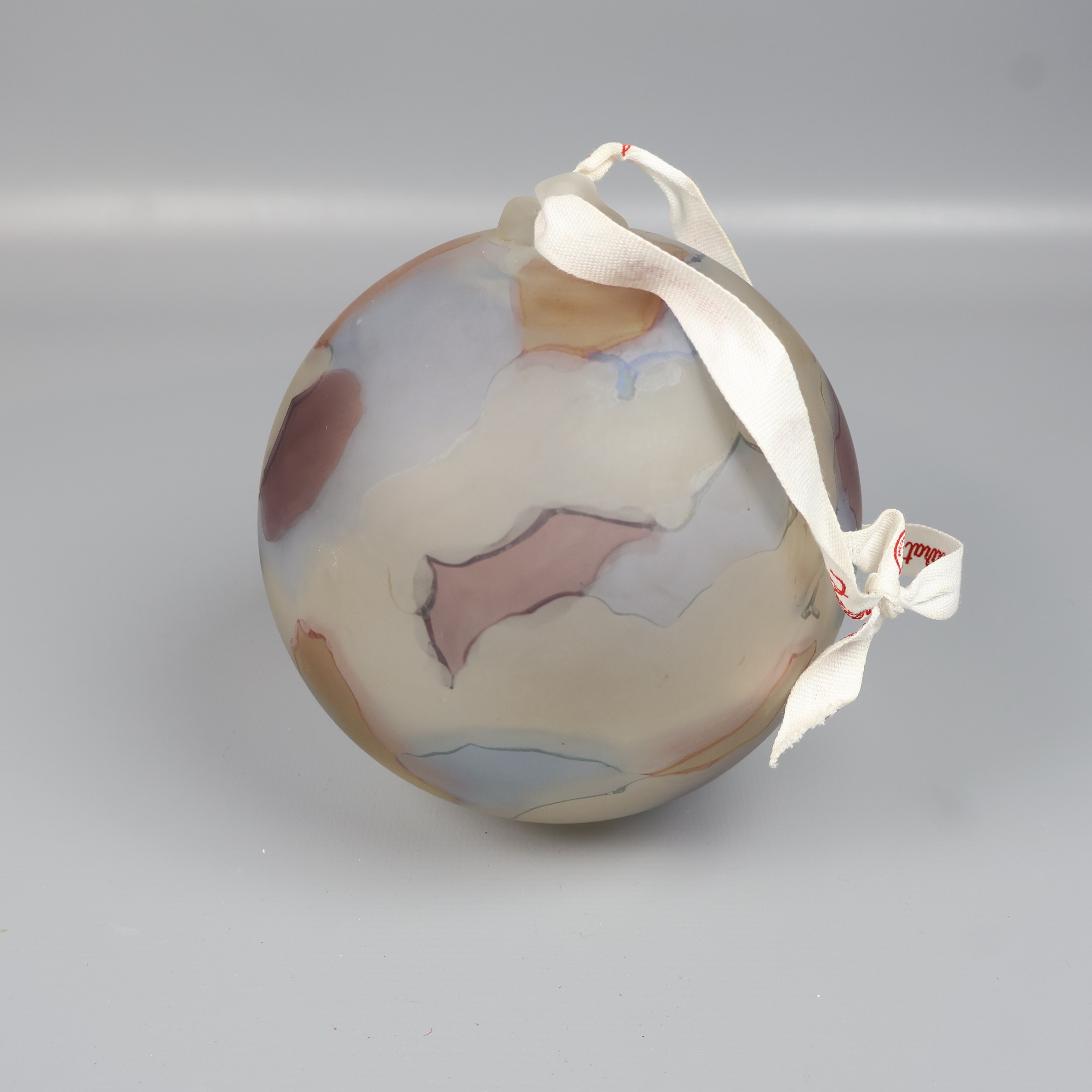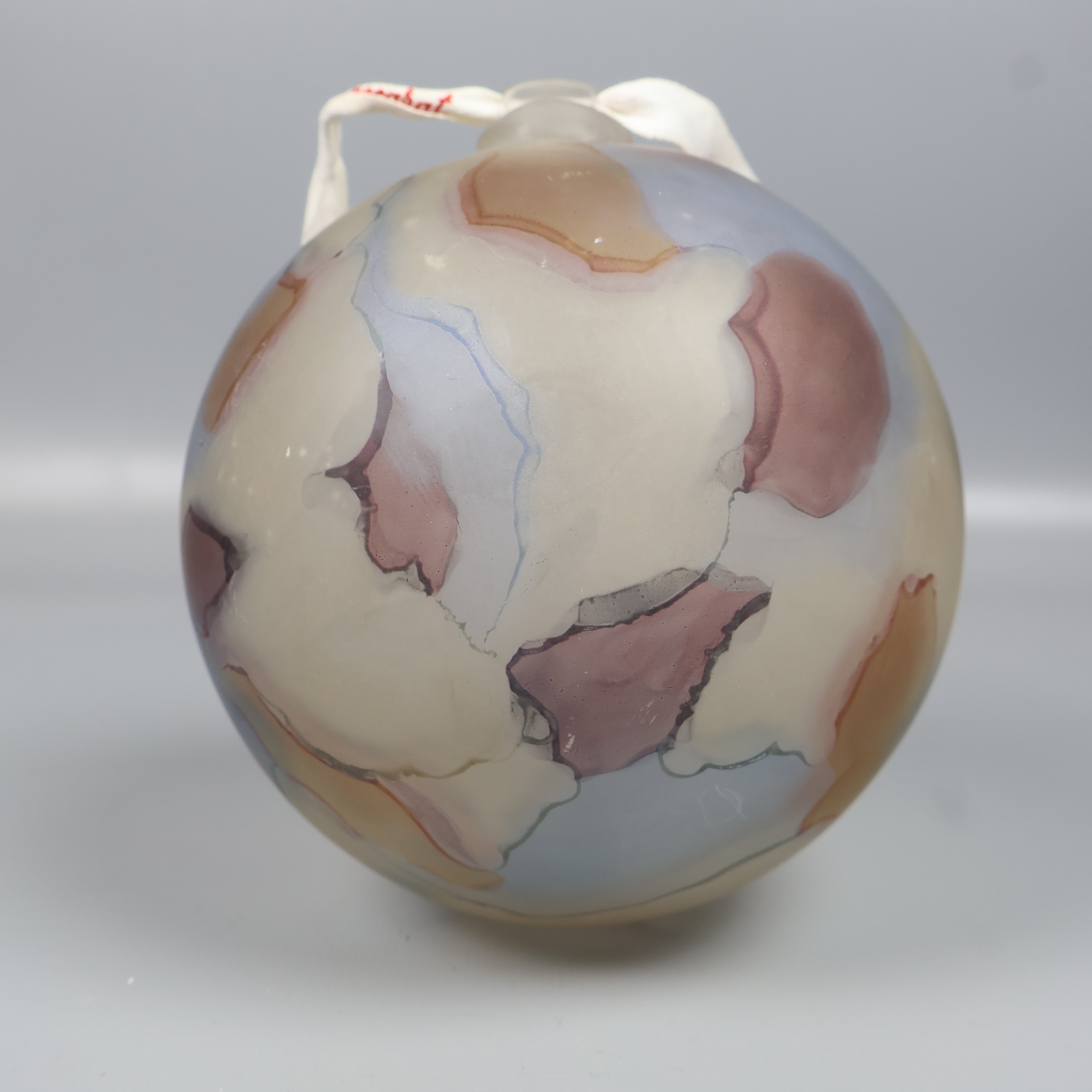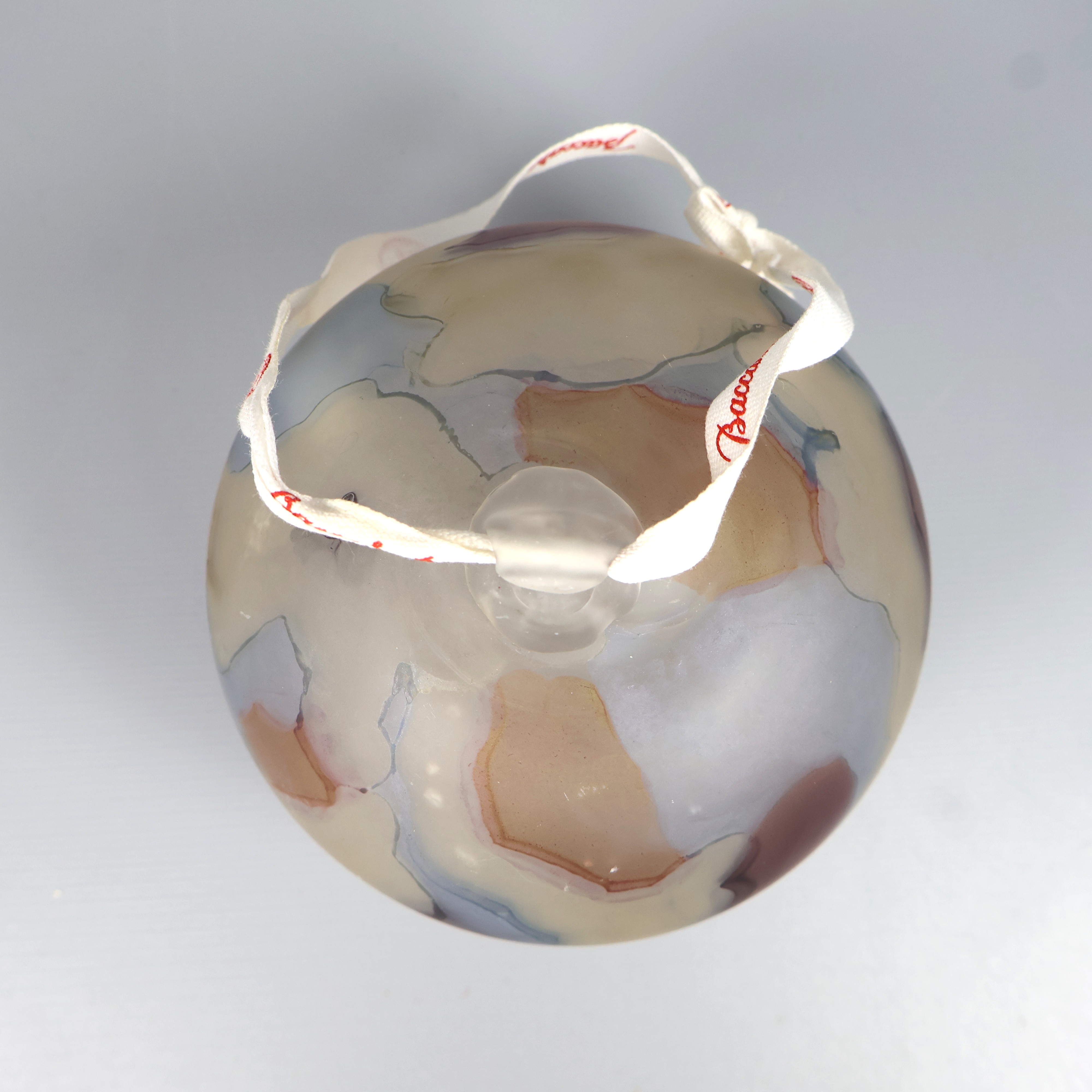 En unik glaskula med marmorerad yta i ljusa, dova toner och dekorativt band. Kulans konstnärliga mönster ger en exklusiv look som passar perfekt som dekoration året runt. Små märken kan förekomma och gör varje exemplar individuellt.