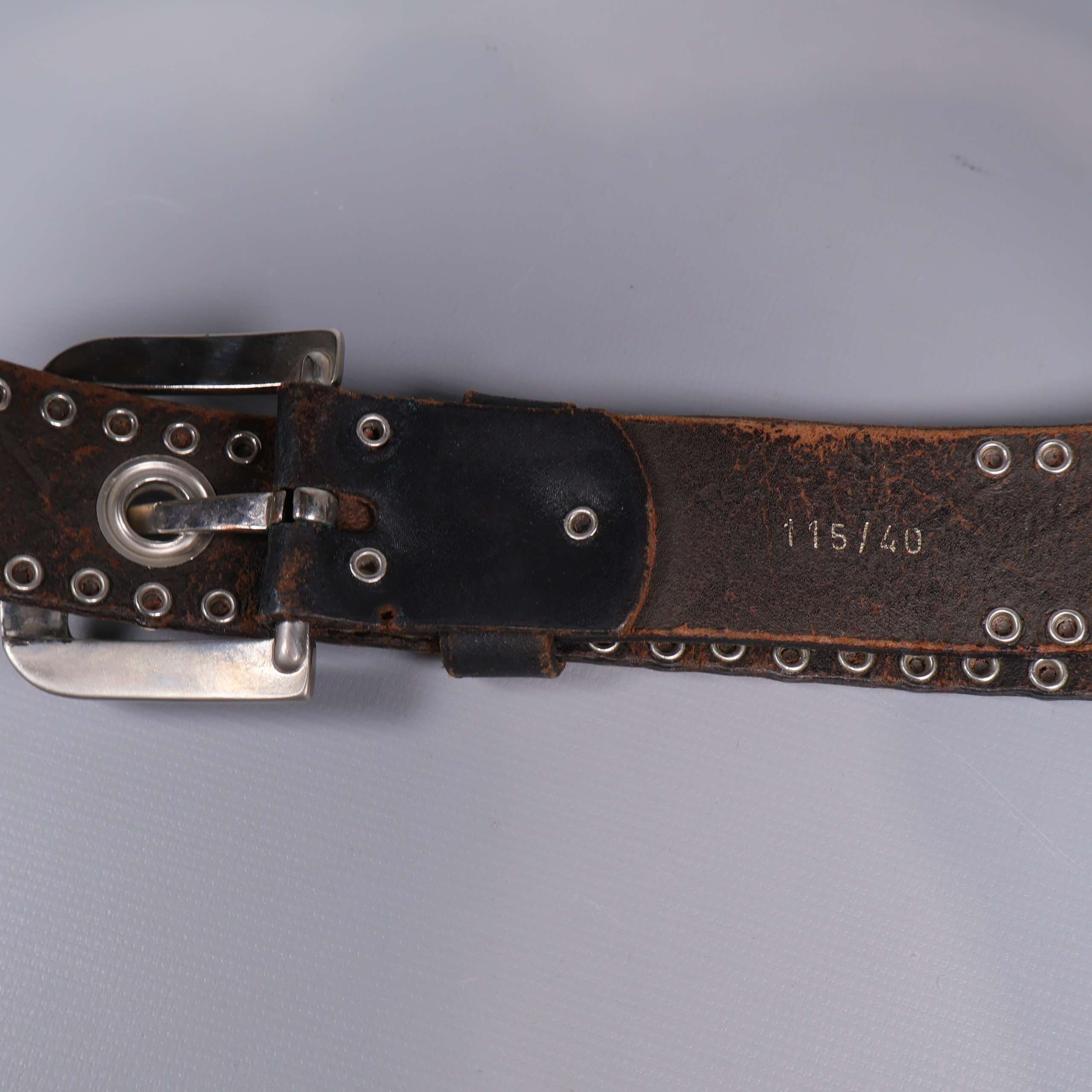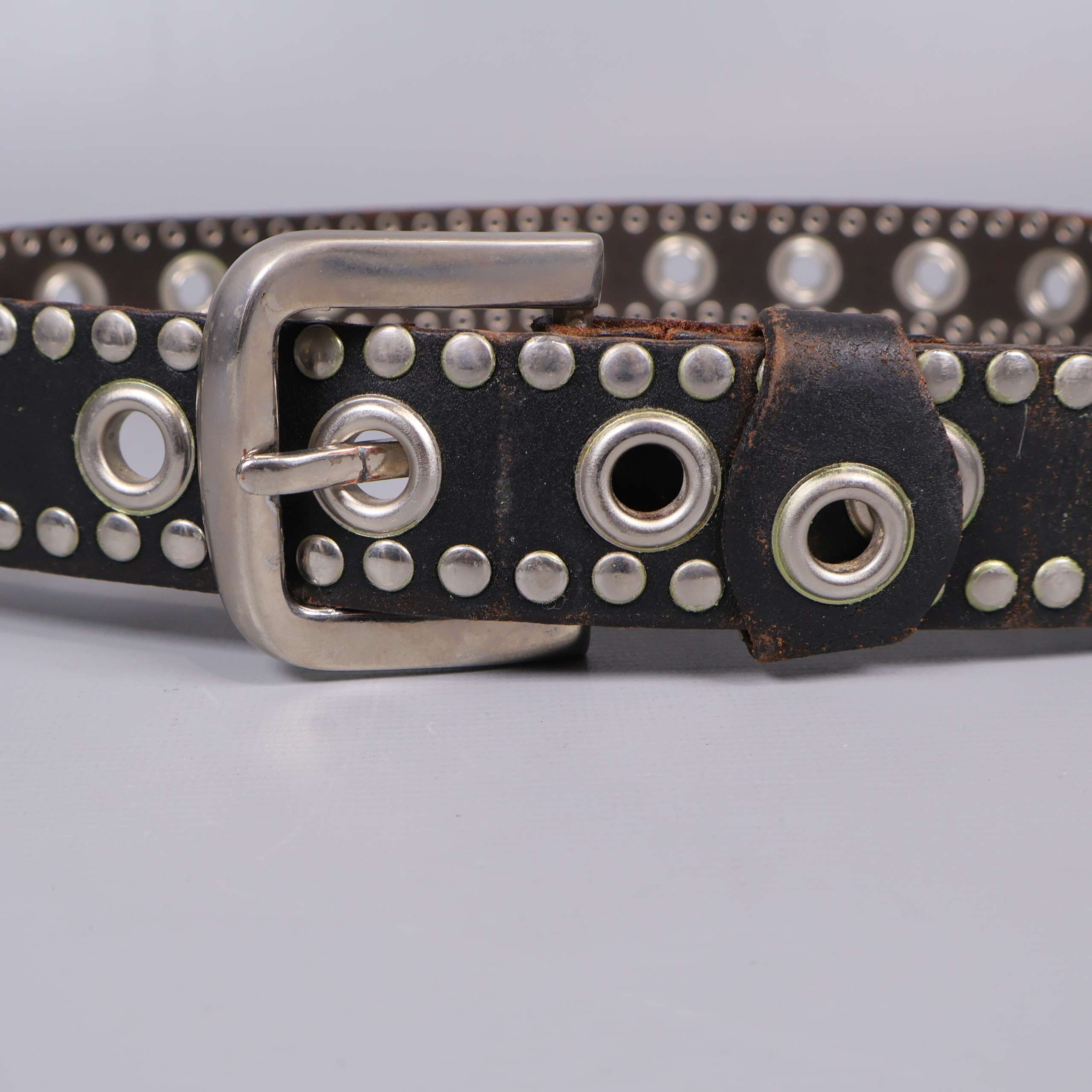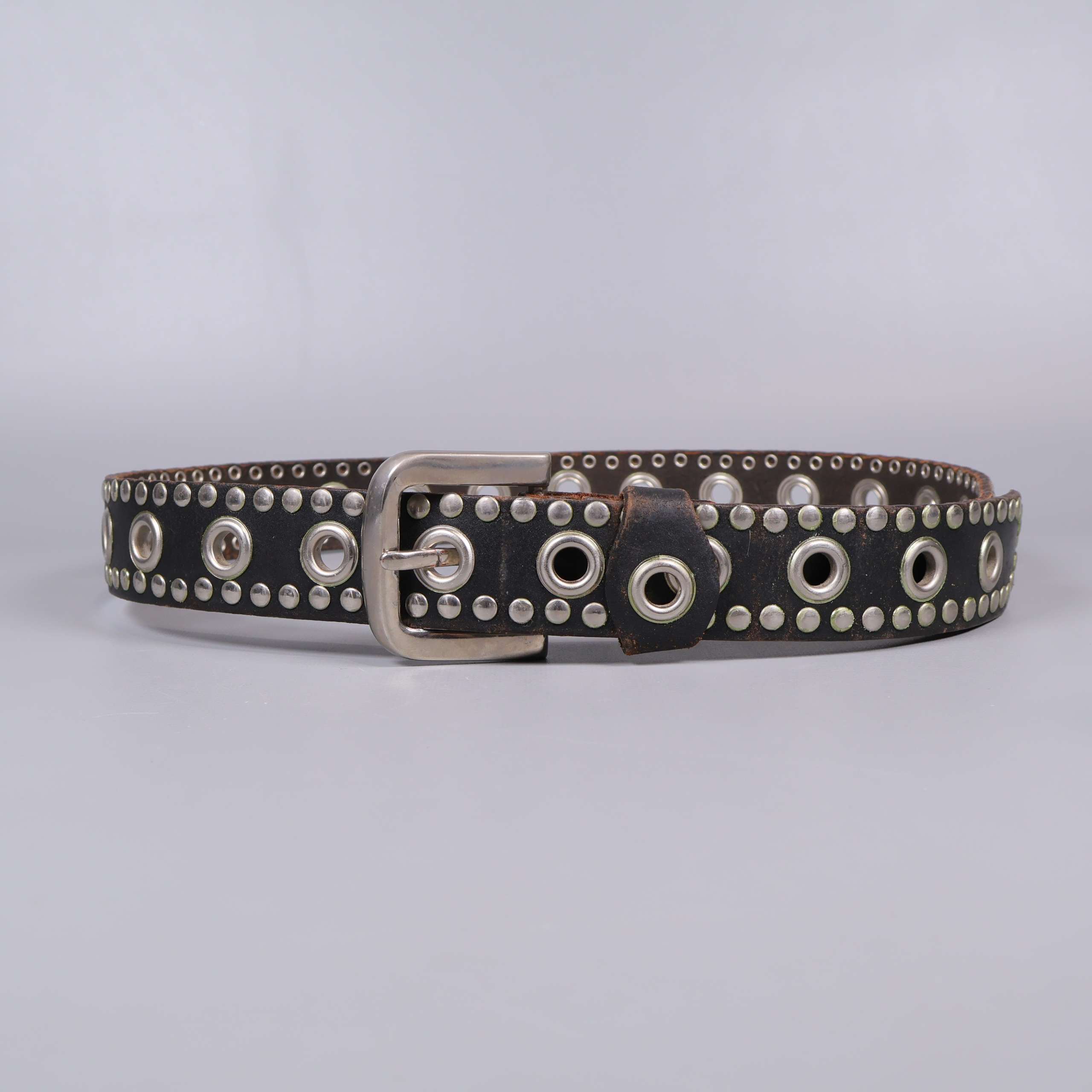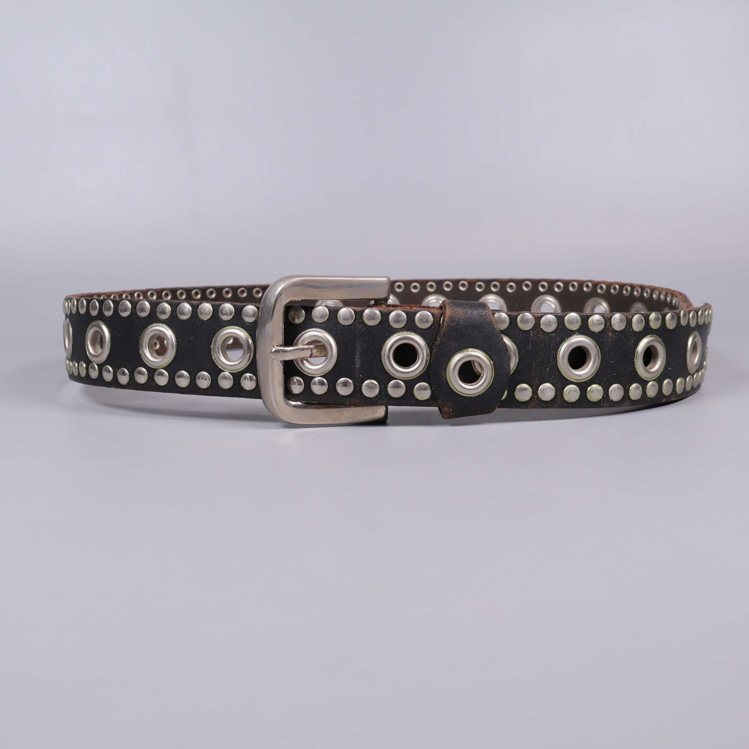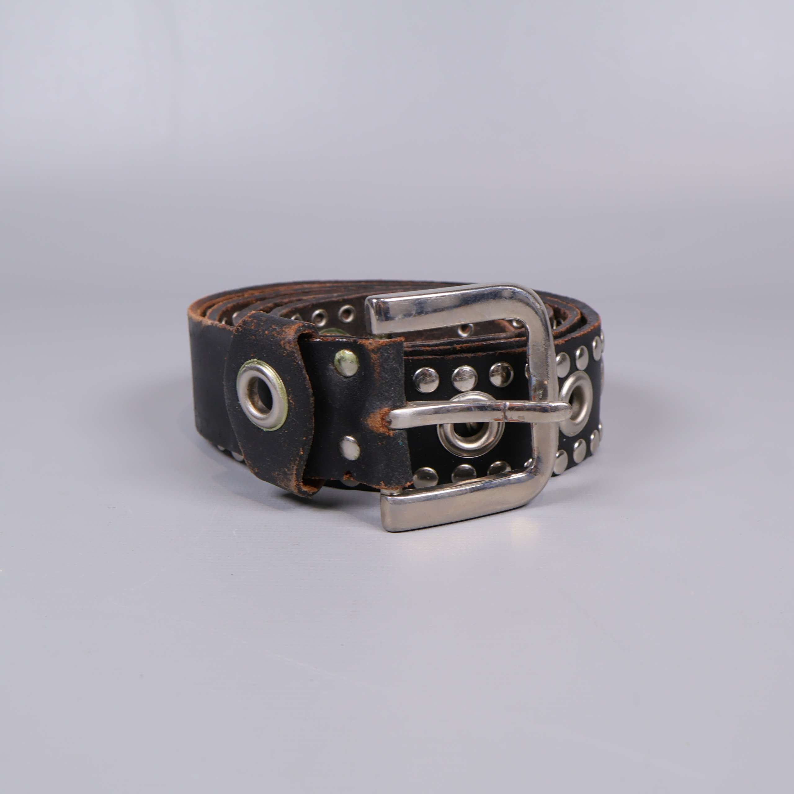 Bälte med en cool edge tack vare silverfärgade nitar och stora öljetter runt hela bandet. Mjukt, robust material med tydlig vintage vibe och slitna detaljer som ger karaktär. Klassiskt spänne i metall för enkel användning och personlig stil, perfekt att låta sticka ut som accessoar.