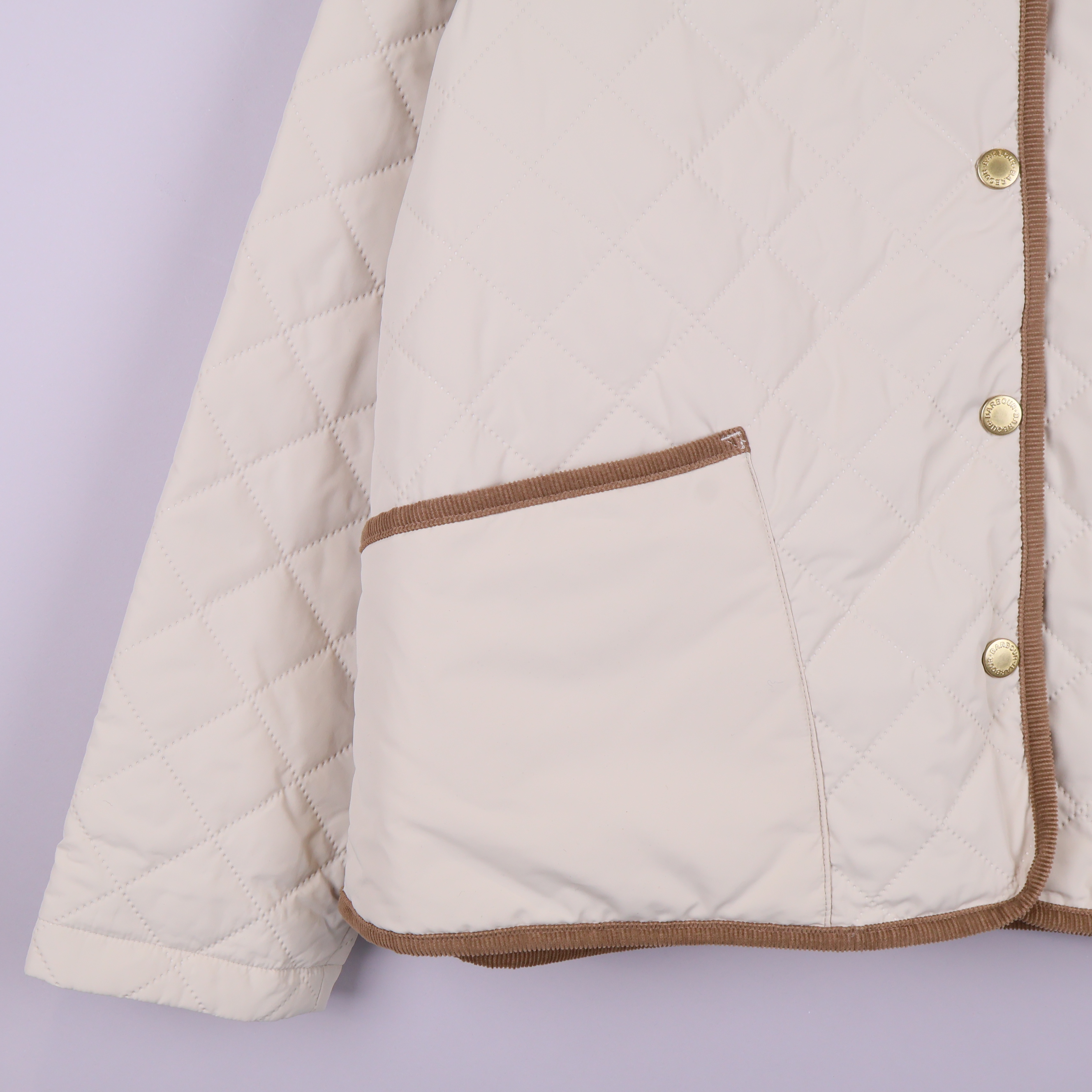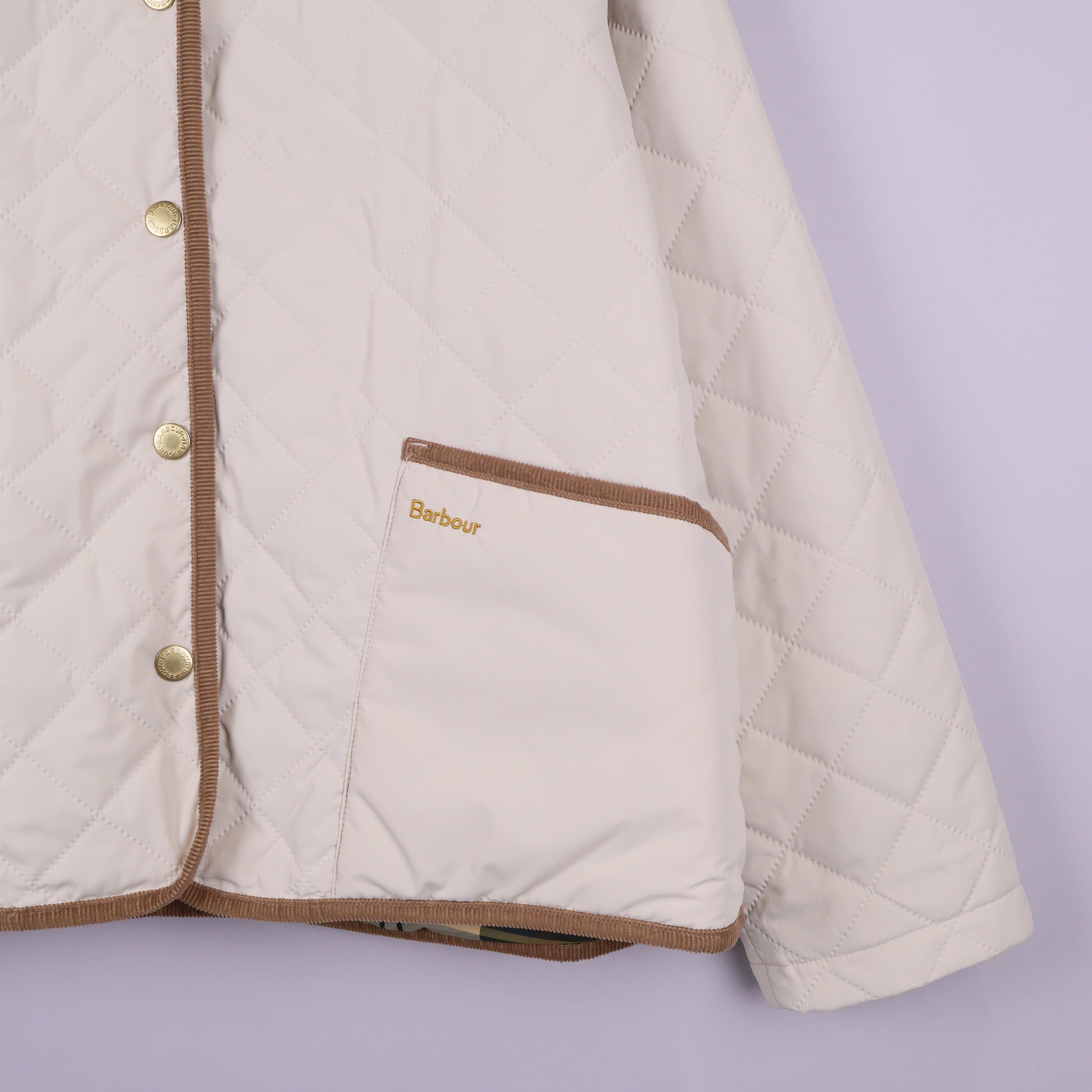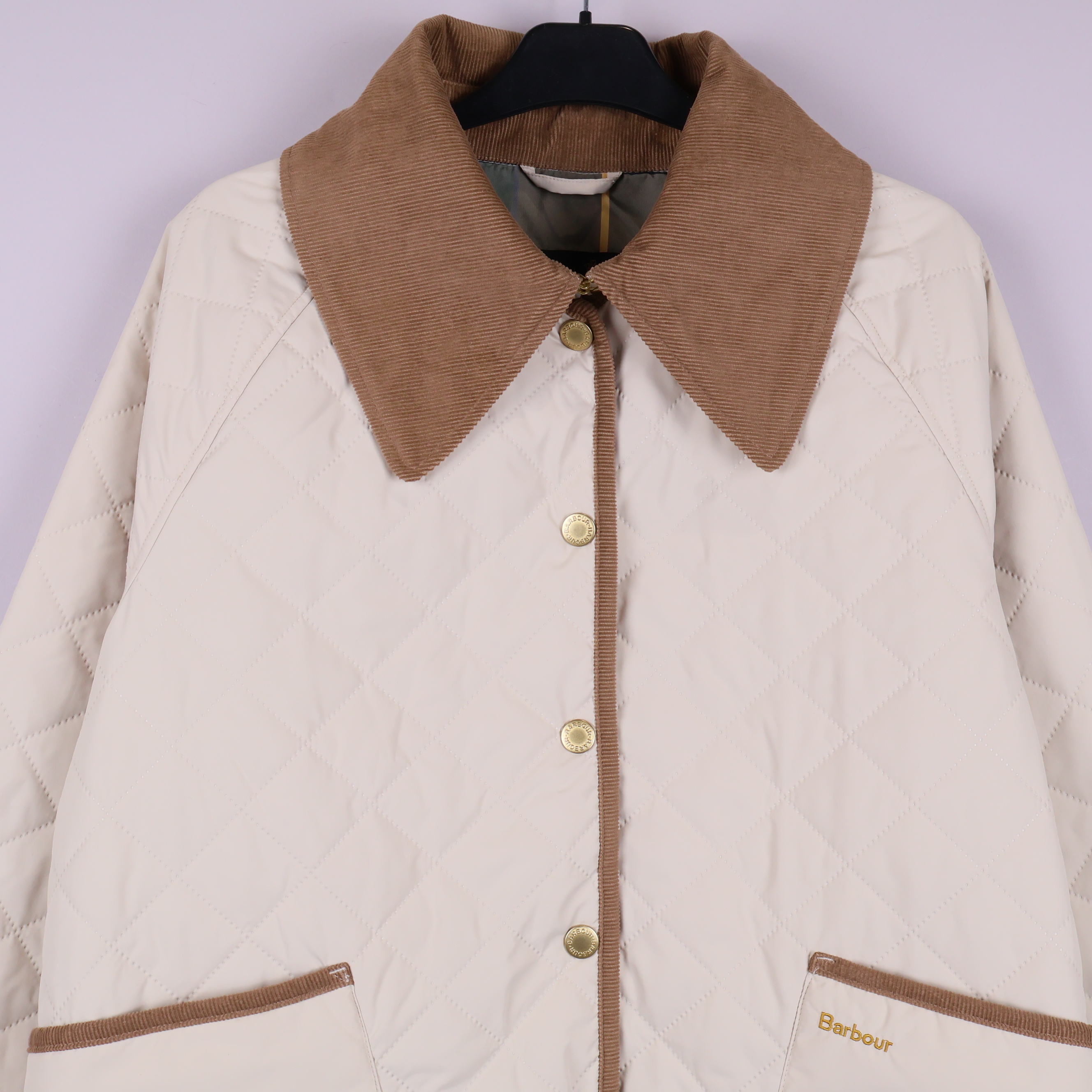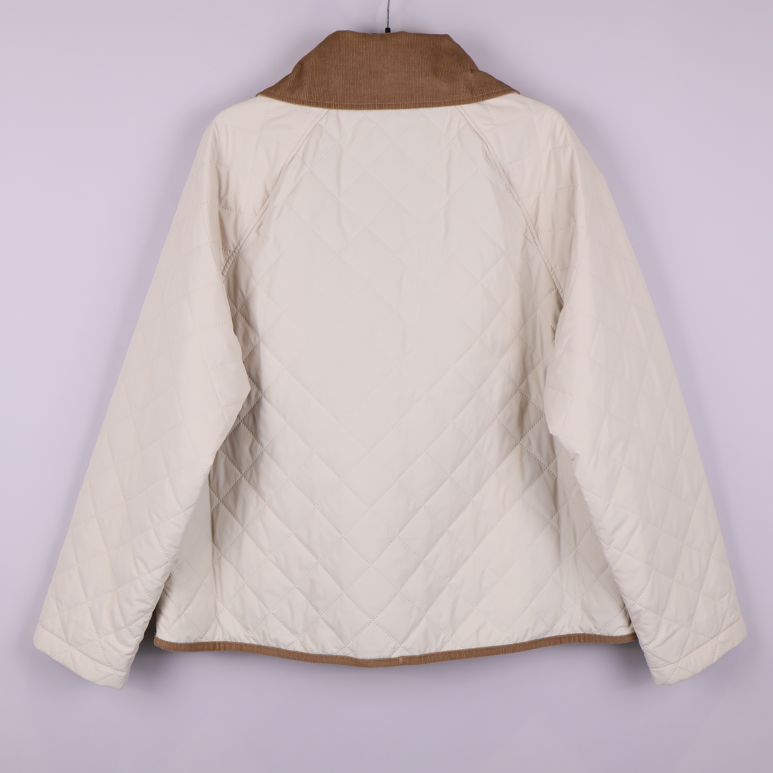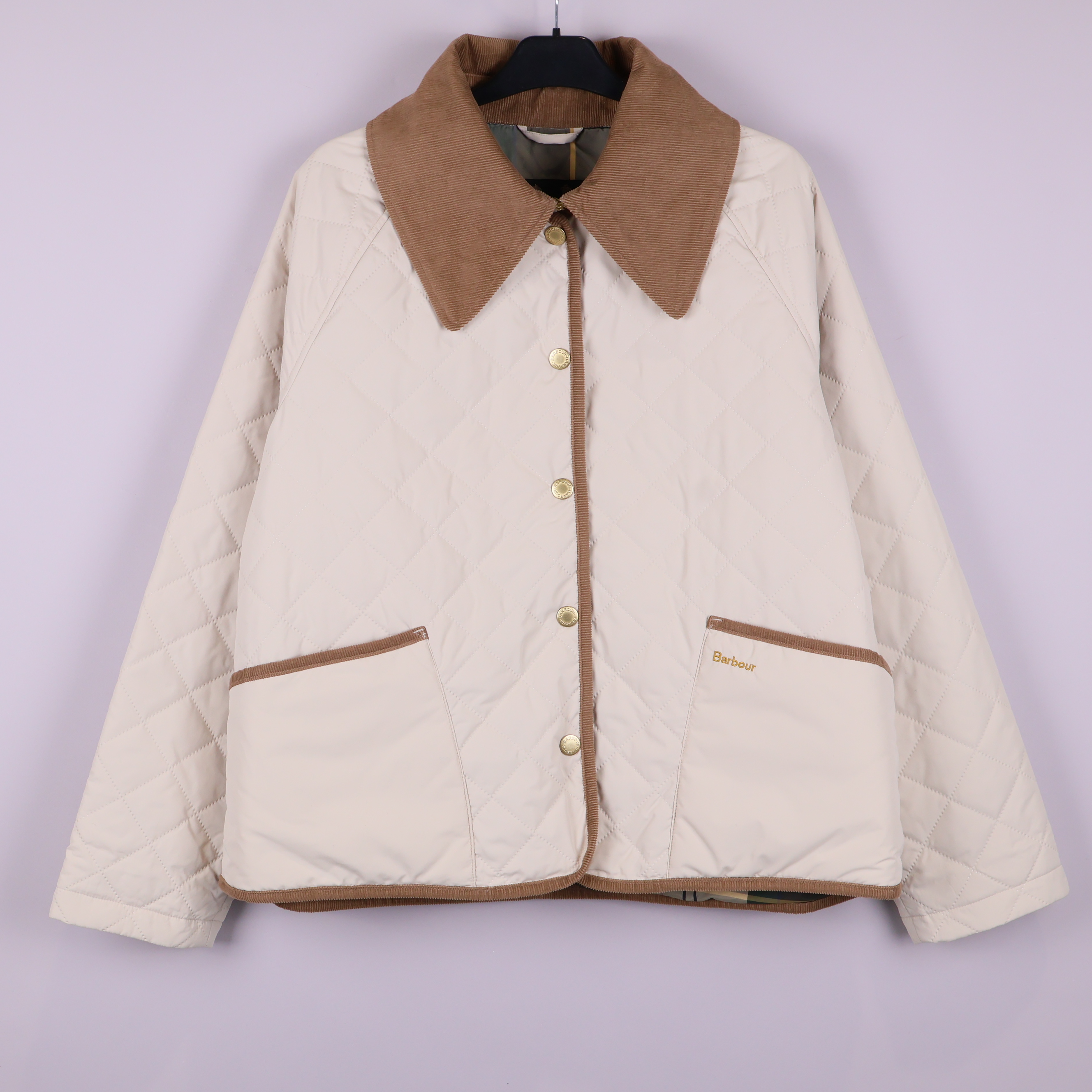 Jacka med quiltat mönster i ljus ton och detaljer i kontrasterande beige/brunt tyg. Klassisk design med mjuk, bred krage i manchestertyg och guldfärgade knappar fram. Praktiska fickor framtill och dekorativ logga på ena fickan. Jackan har en avslappnad och tidlös look som passar året runt.