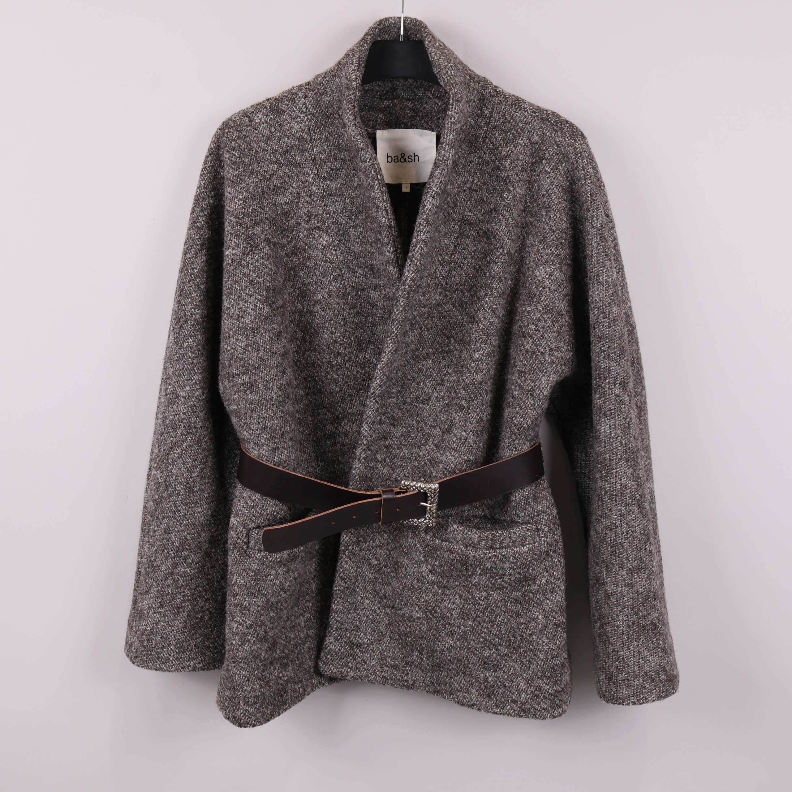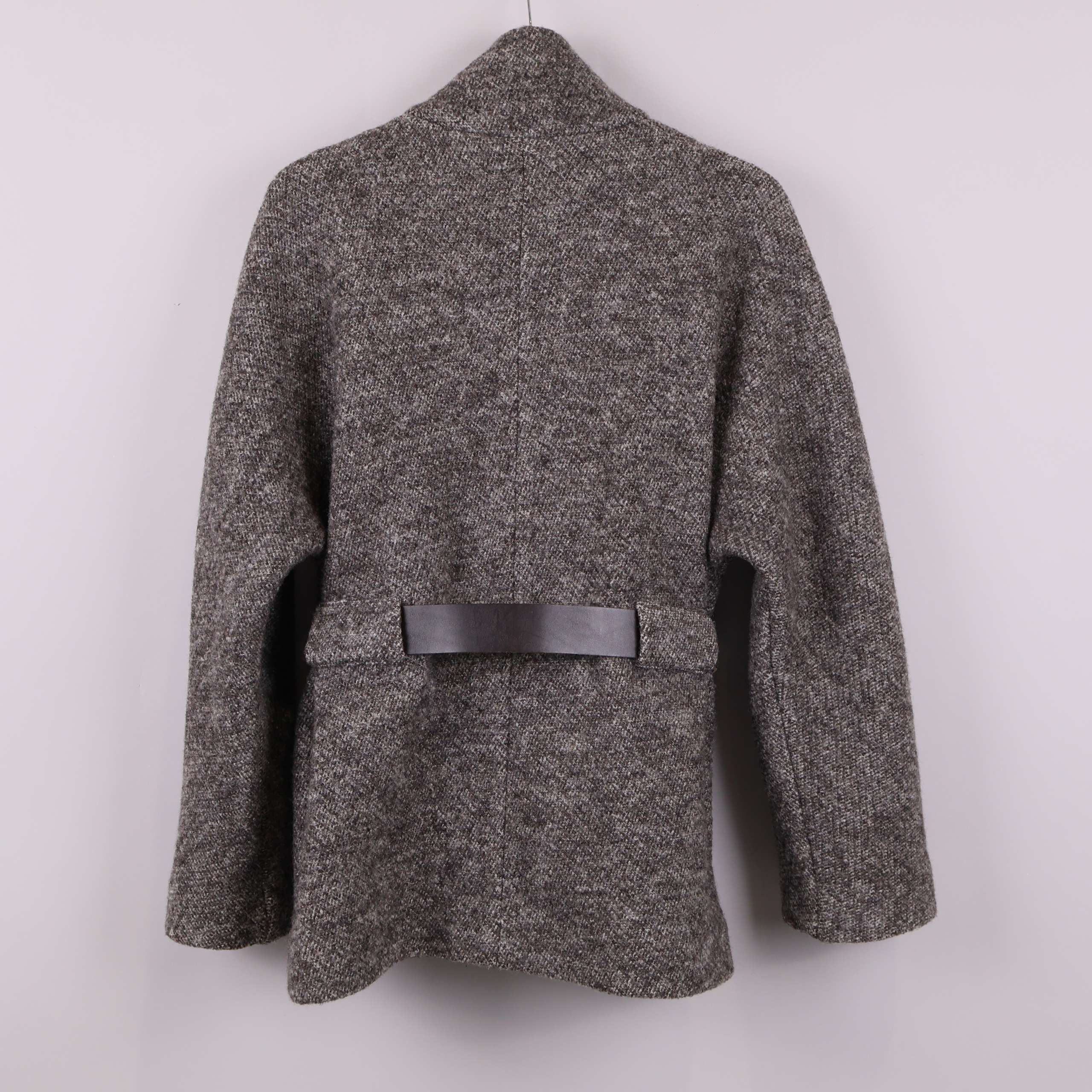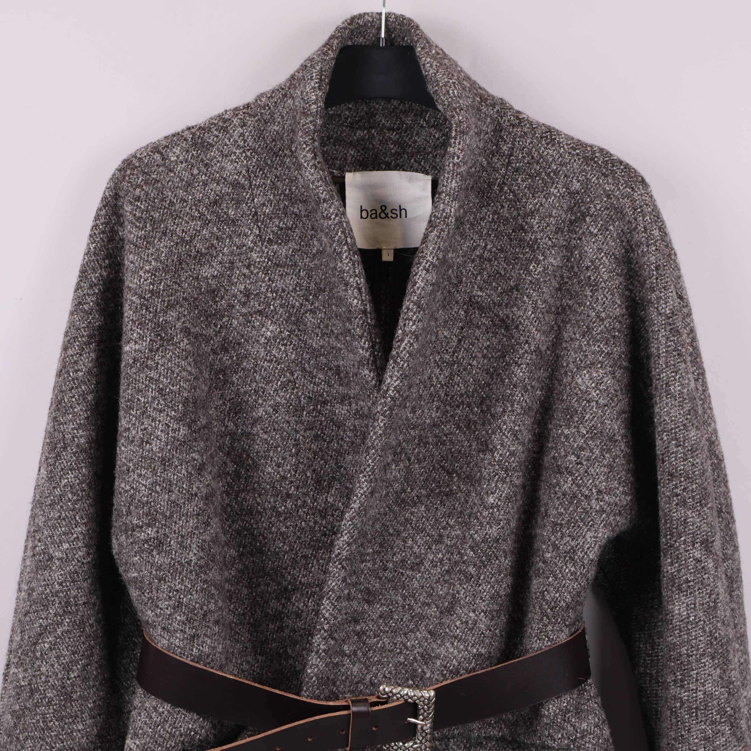 Mjuk och stilren kofta med markerat bälte i mörkt läder och dekorativt spänne. Materialet har en melerad brungrå ton med tydlig struktur, och plagget har en avslappnad passform utan krage.