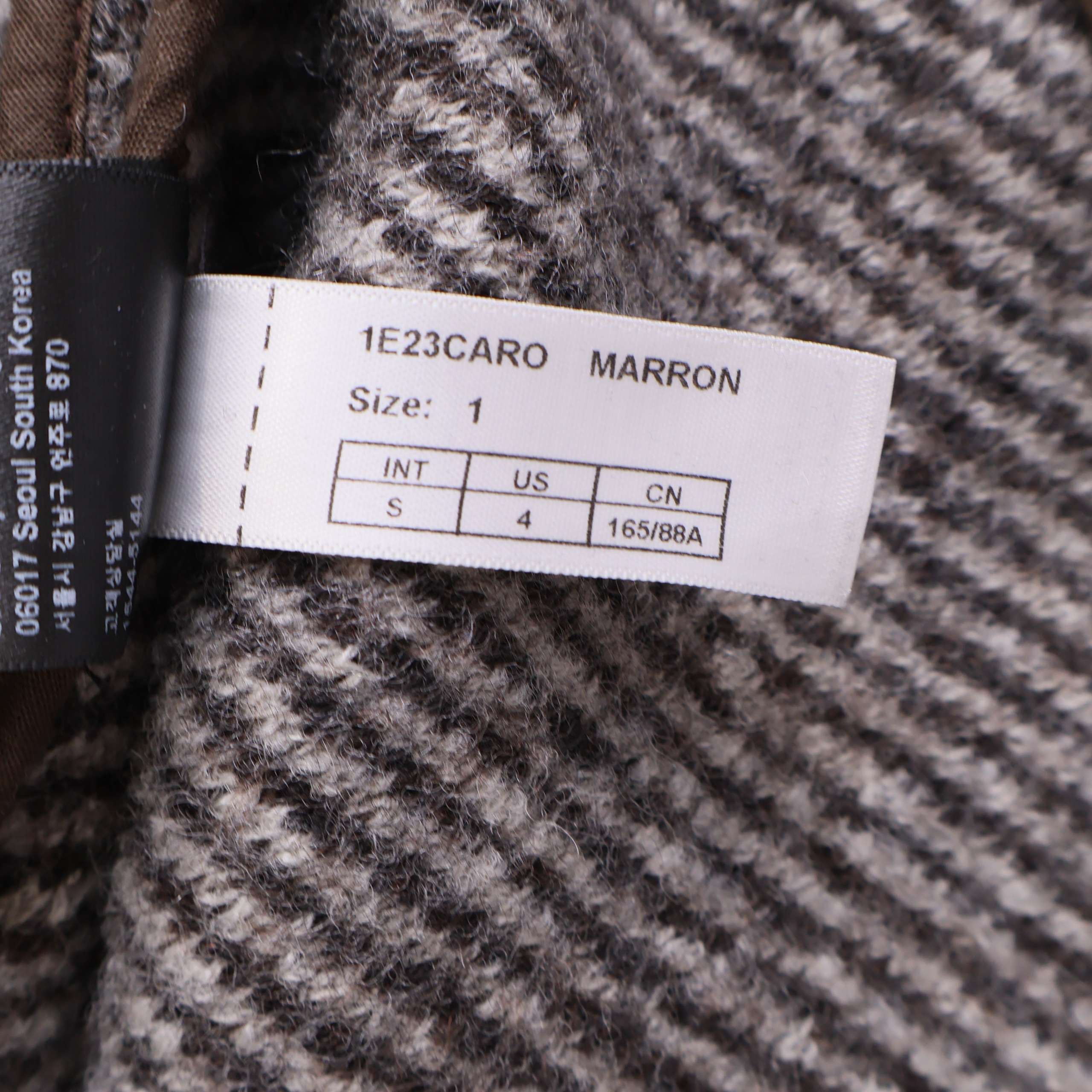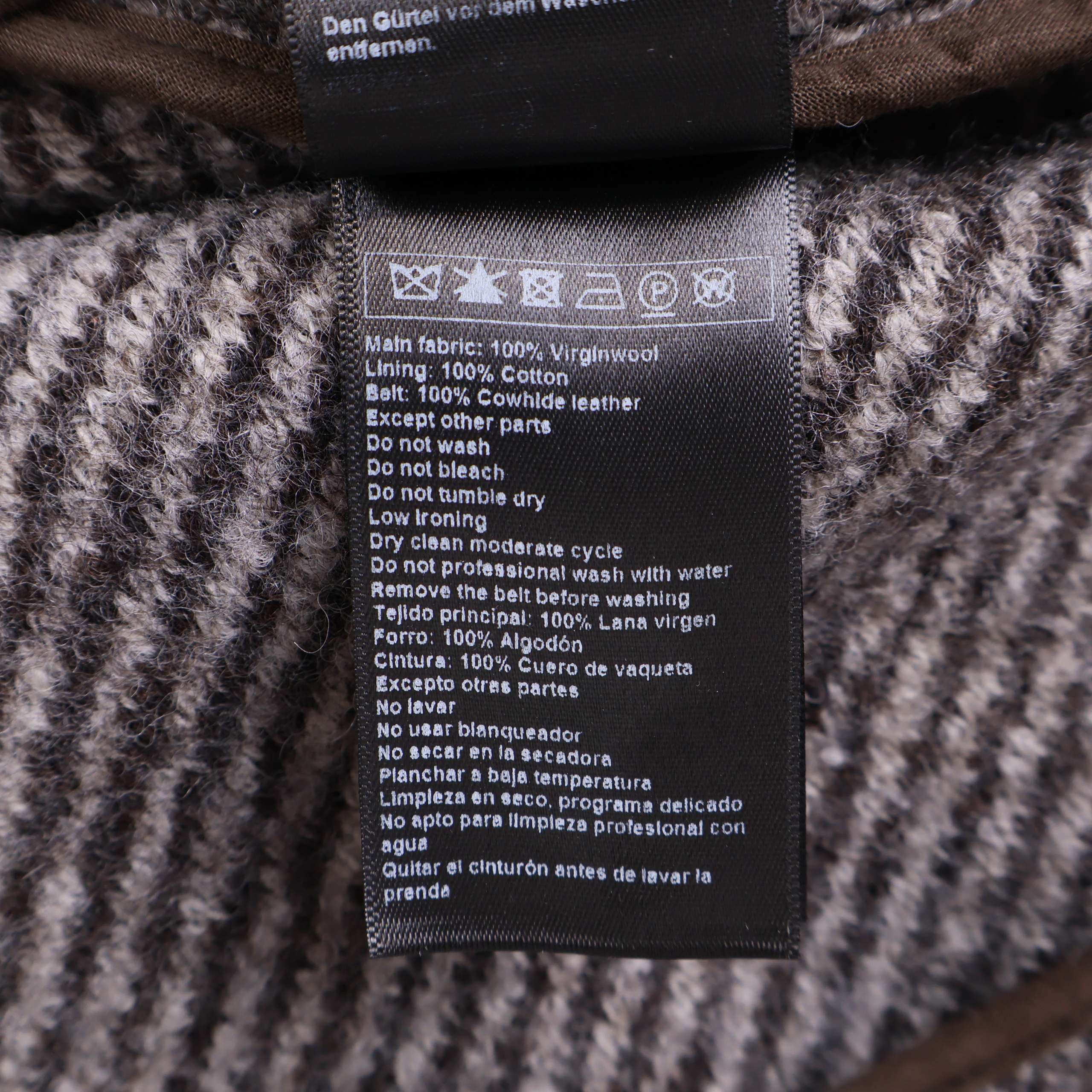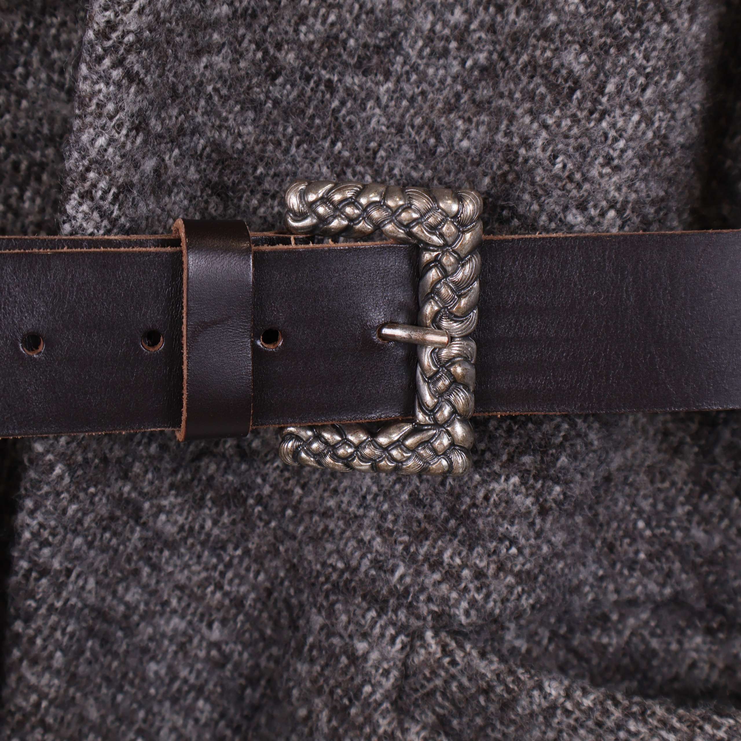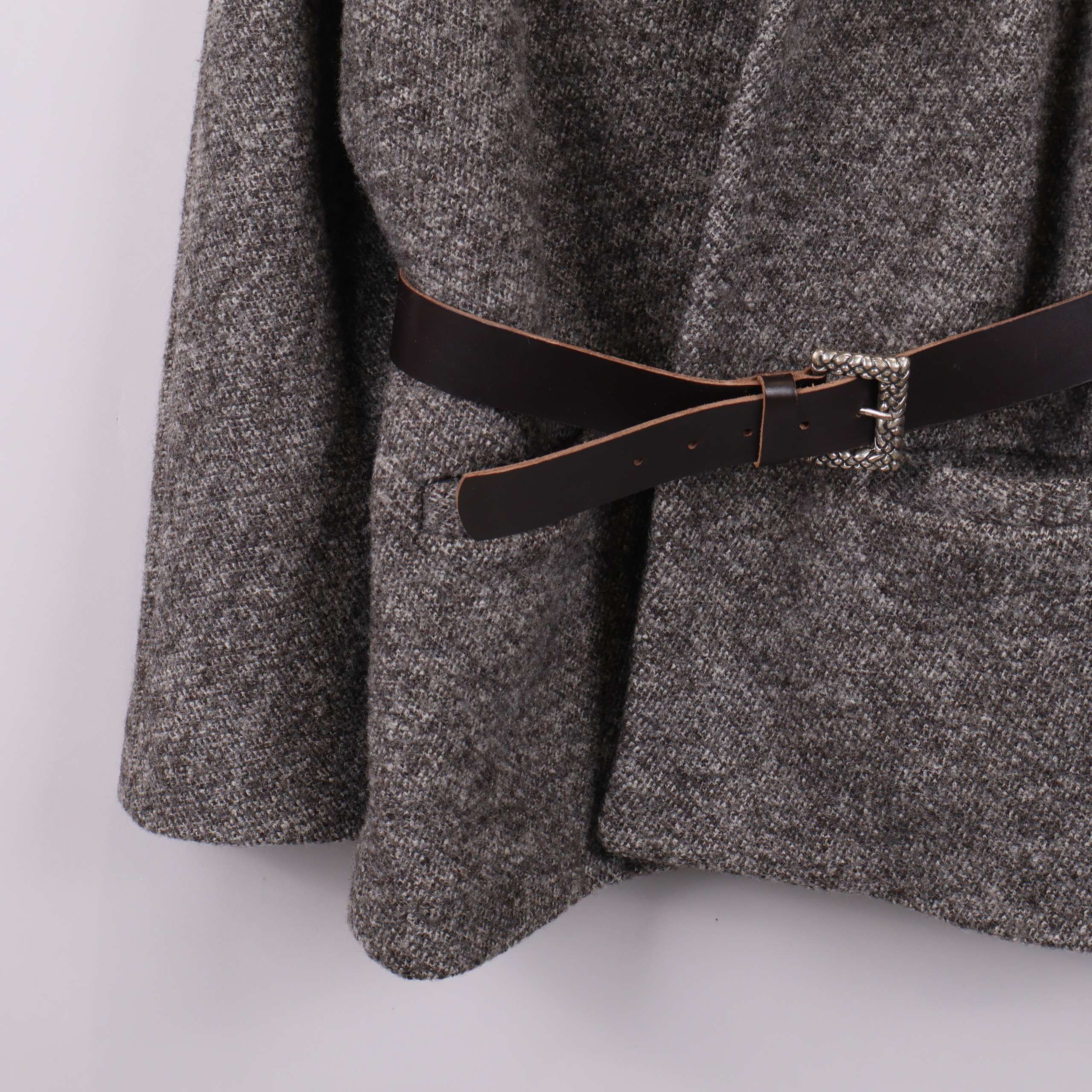 Mjuk och stilren kofta med markerat bälte i mörkt läder och dekorativt spänne. Materialet har en melerad brungrå ton med tydlig struktur, och plagget har en avslappnad passform utan krage.