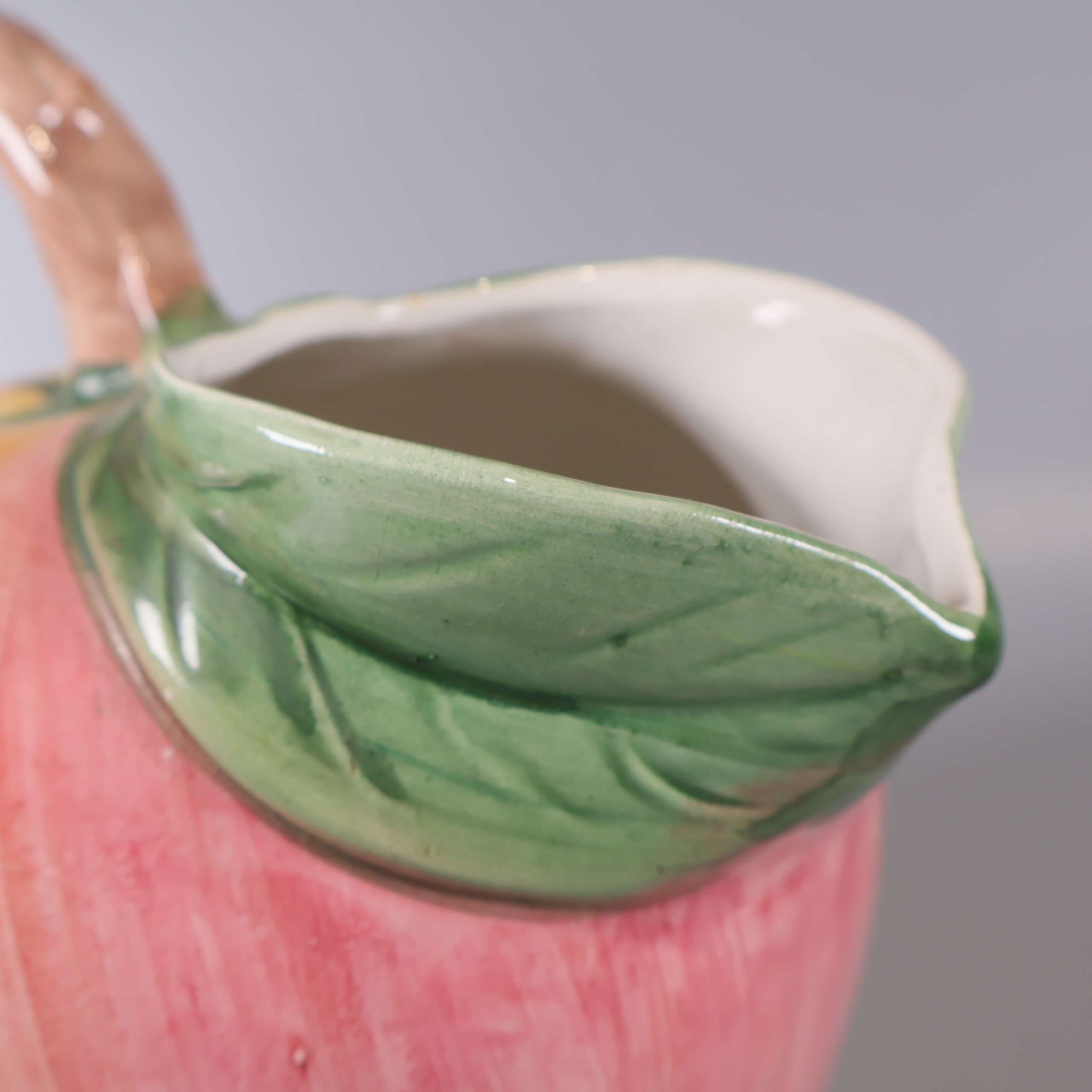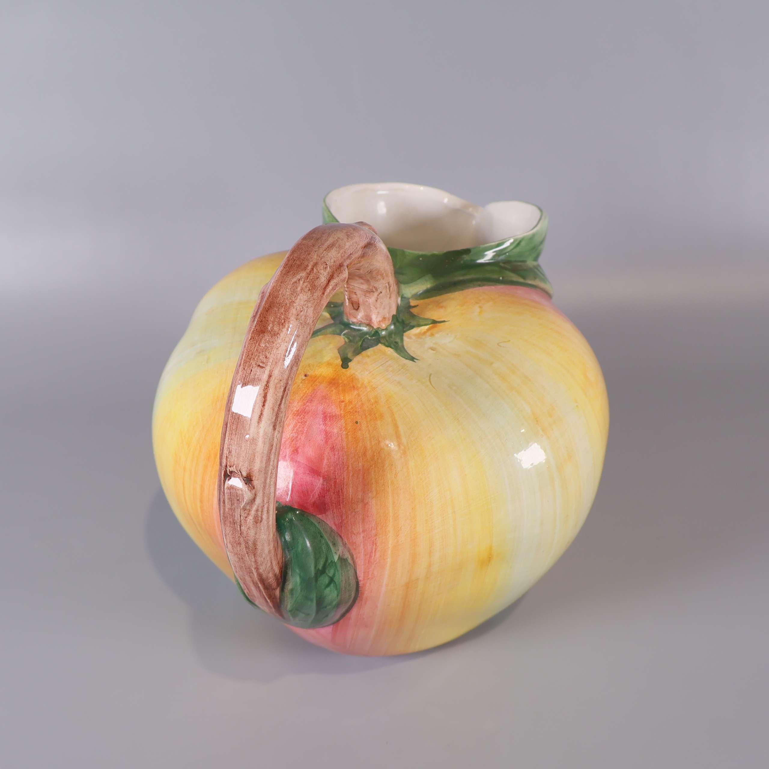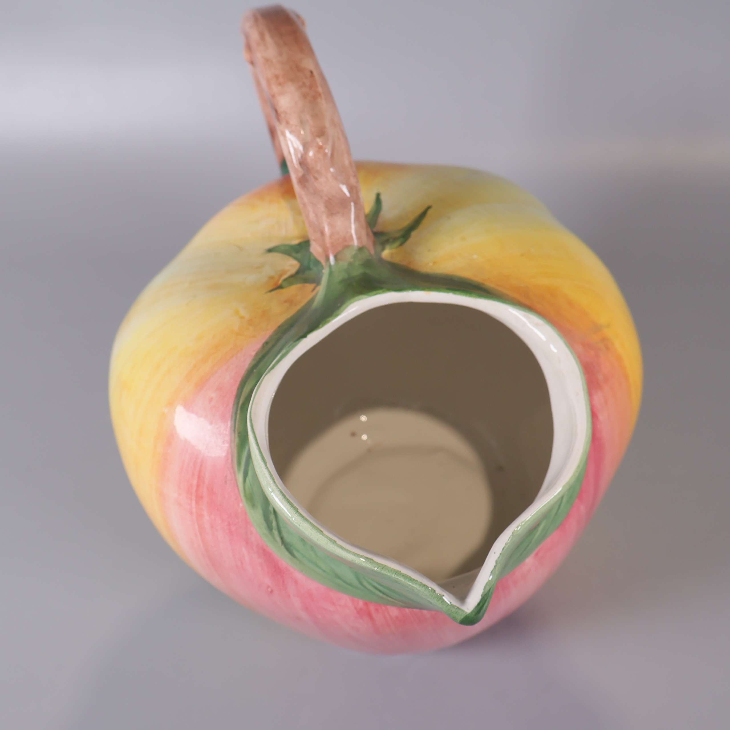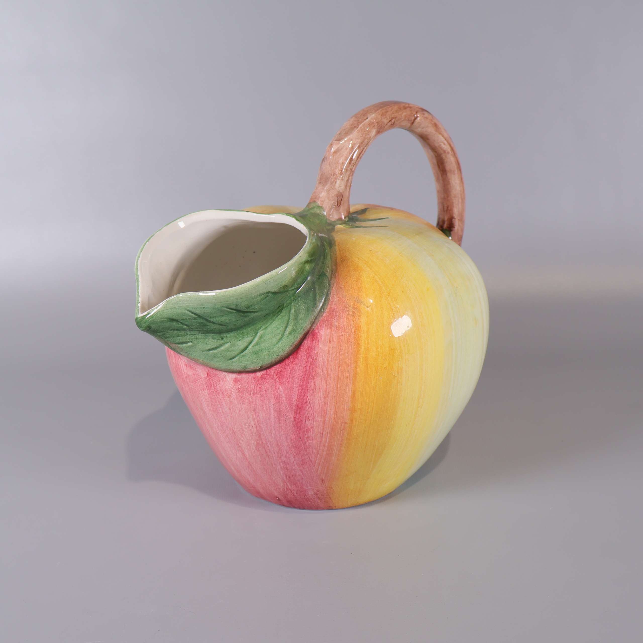 Färgstark kanna i keramik med ett lekfullt äppel-inspirerat utseende. Mjuka övergångar mellan rosa, gult och grönt skapar en unik vintage vibe, och det detaljerade handtaget efterliknar en kvist. Perfekt detalj på bordet för dig som gillar det lilla extra.