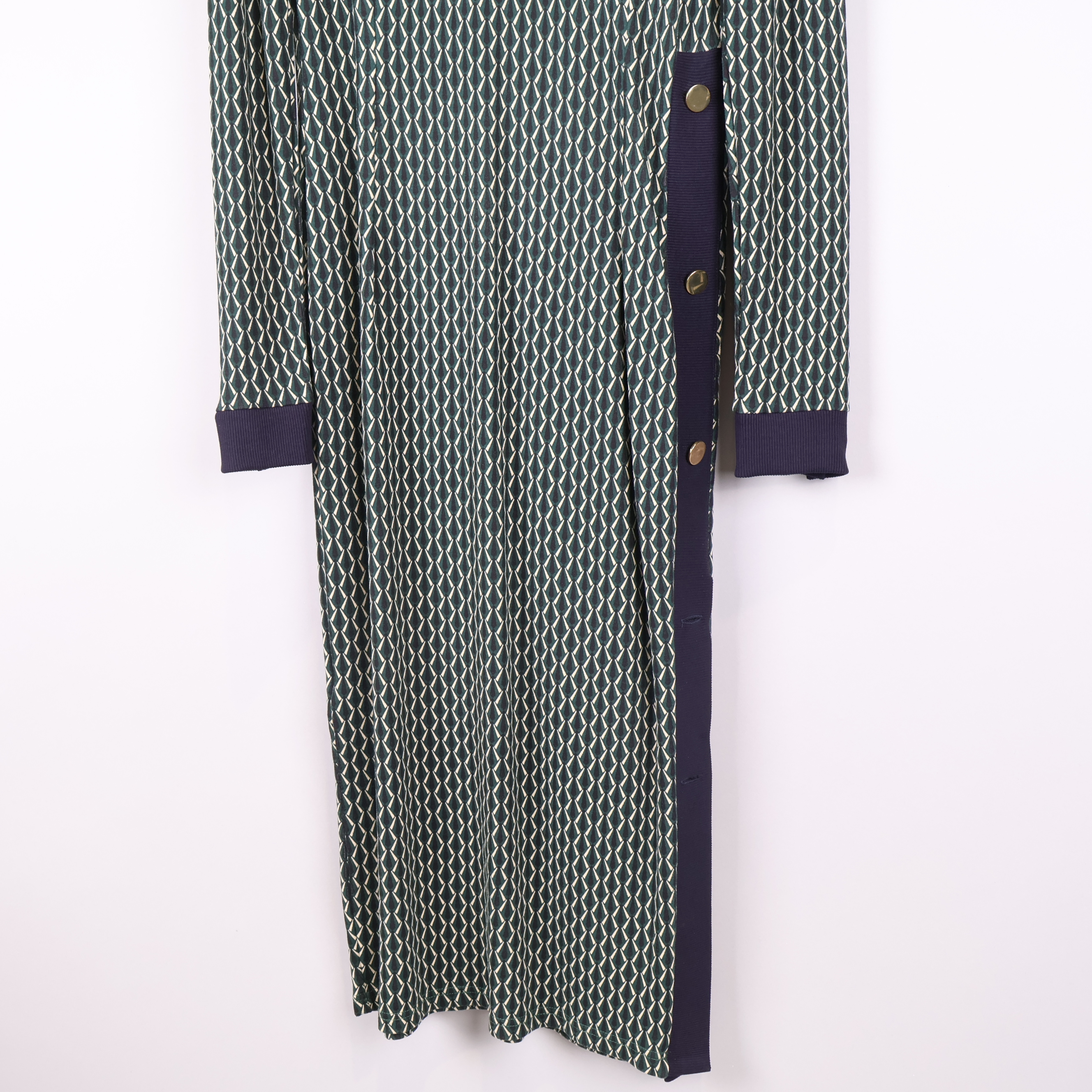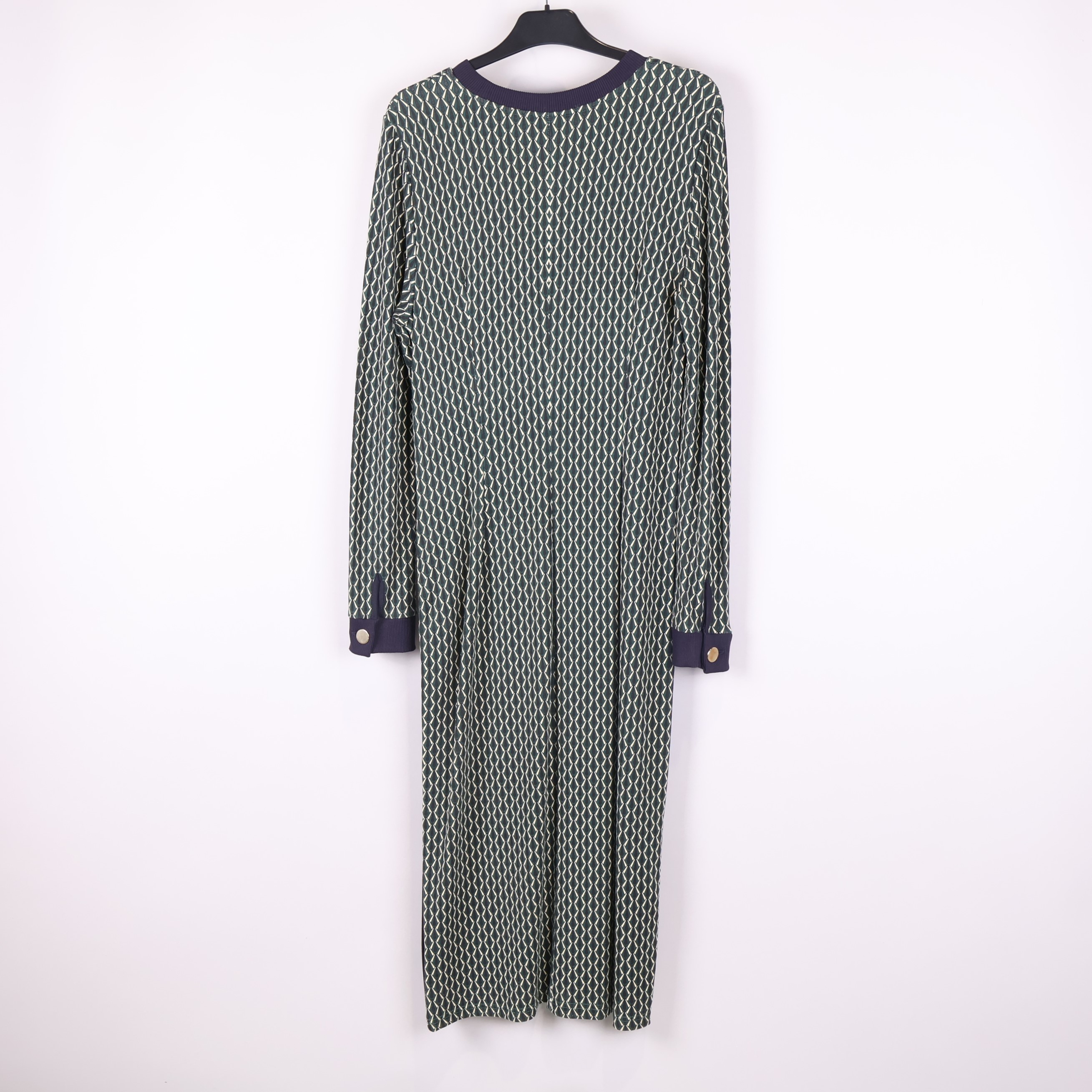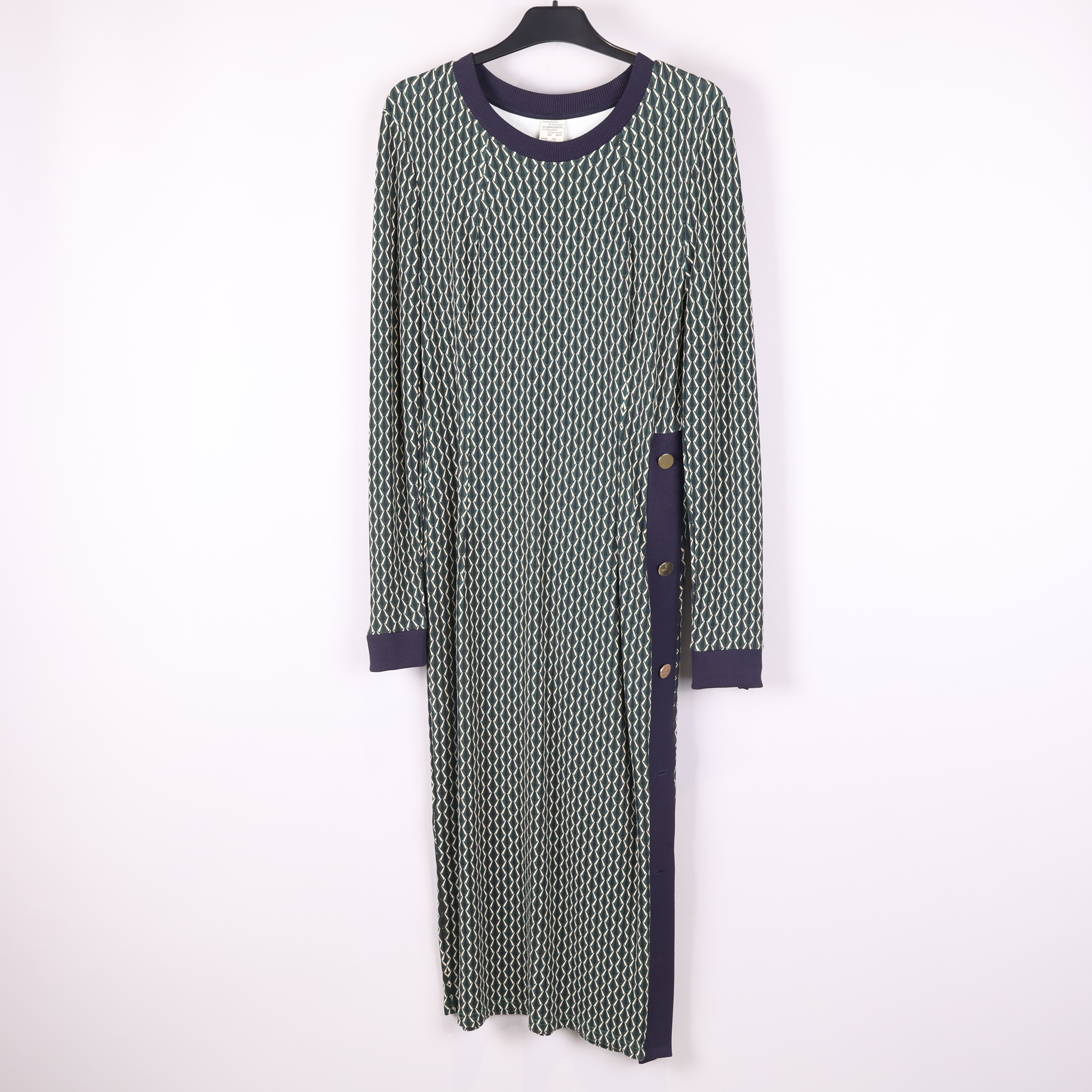 Denna långklänning har ett grafiskt mönster i gröna och blå nyanser med kontrasterande mörkblå ribbade muddar vid halsringning och ärmslut. Sidan pryds av dekorativa knappar som ger extra detalj. Klänningen är tillverkad i en stretchig, mjuk mix av viskos, polyester och elastan för skön vardagskomfort.