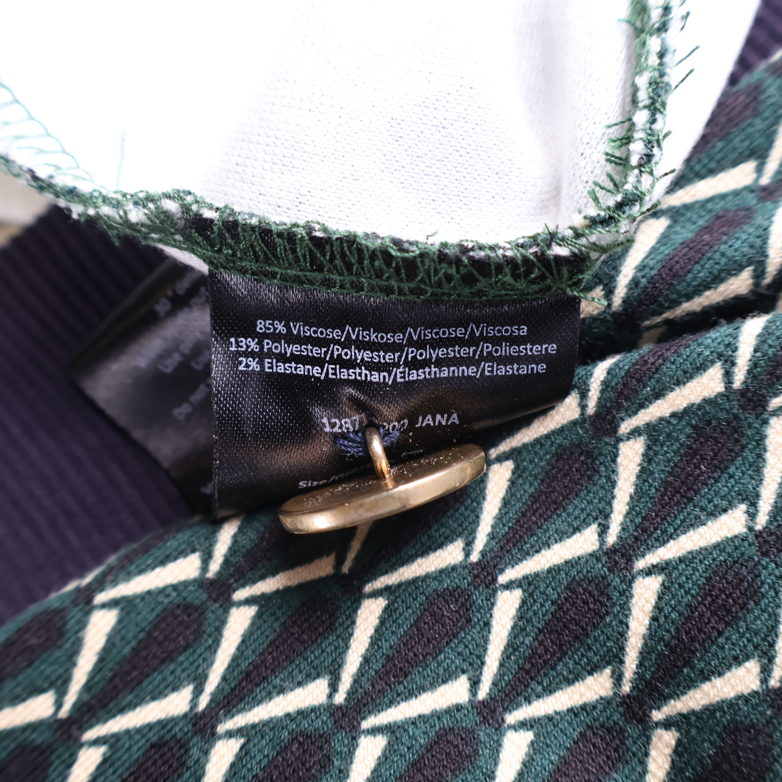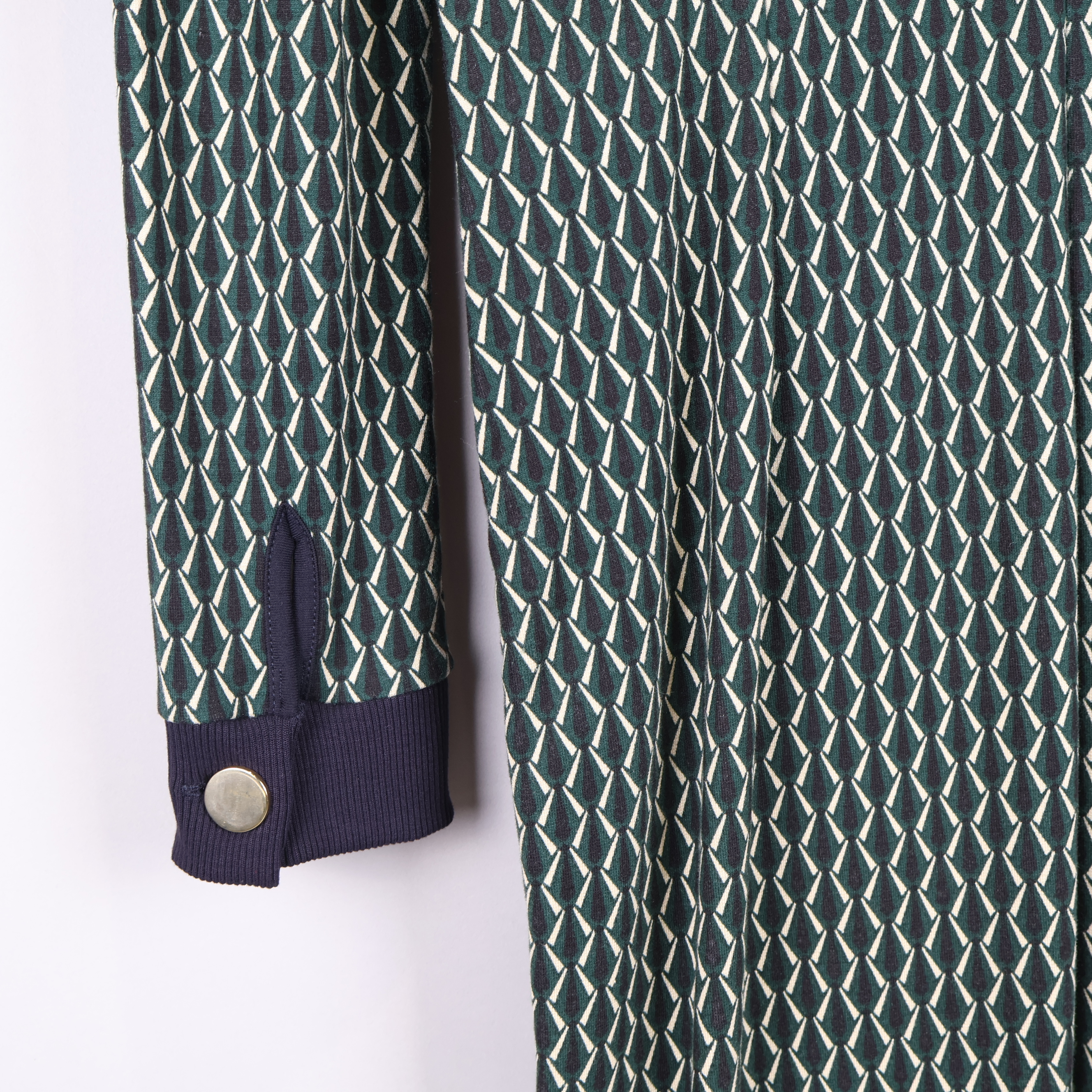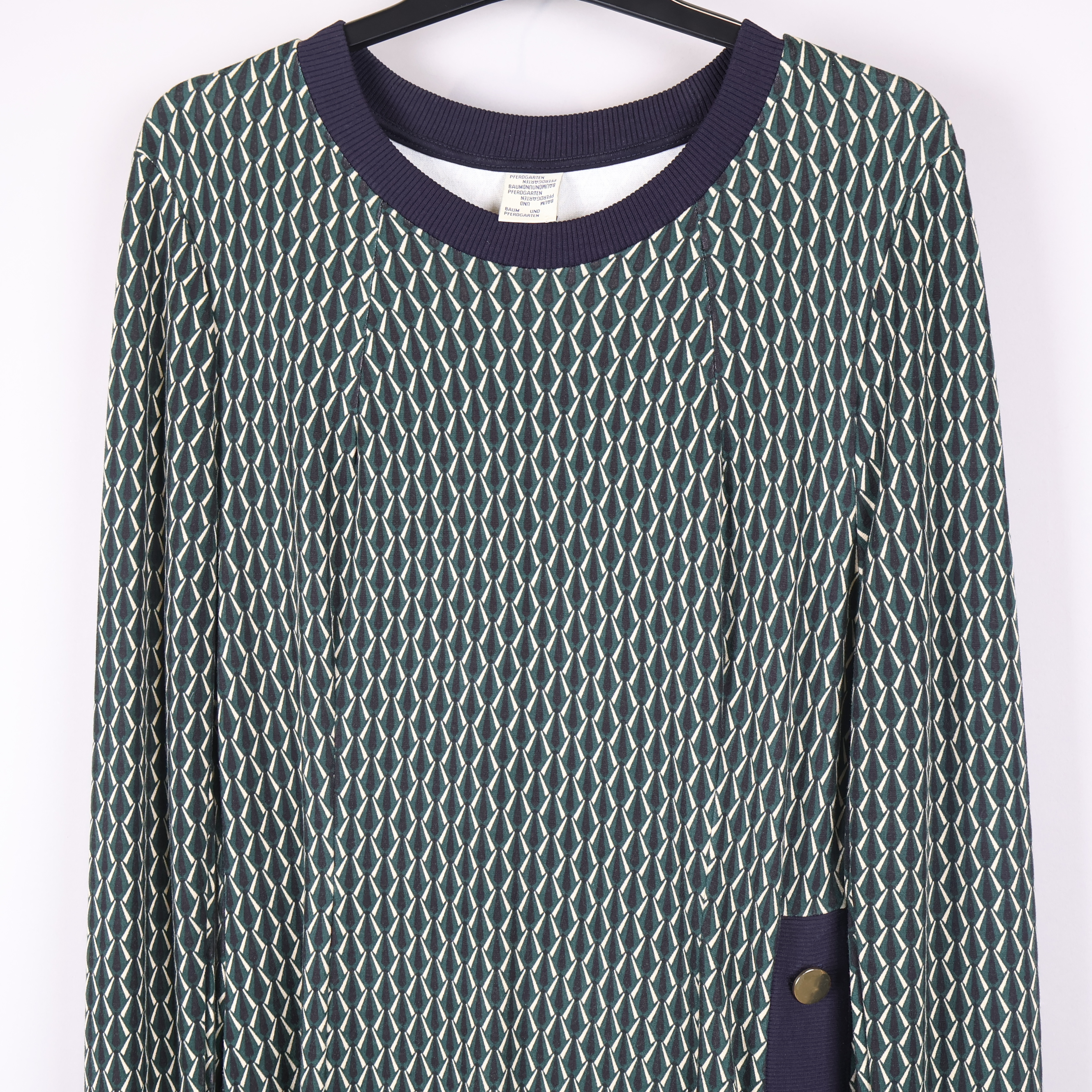 Denna långklänning har ett grafiskt mönster i gröna och blå nyanser med kontrasterande mörkblå ribbade muddar vid halsringning och ärmslut. Sidan pryds av dekorativa knappar som ger extra detalj. Klänningen är tillverkad i en stretchig, mjuk mix av viskos, polyester och elastan för skön vardagskomfort.