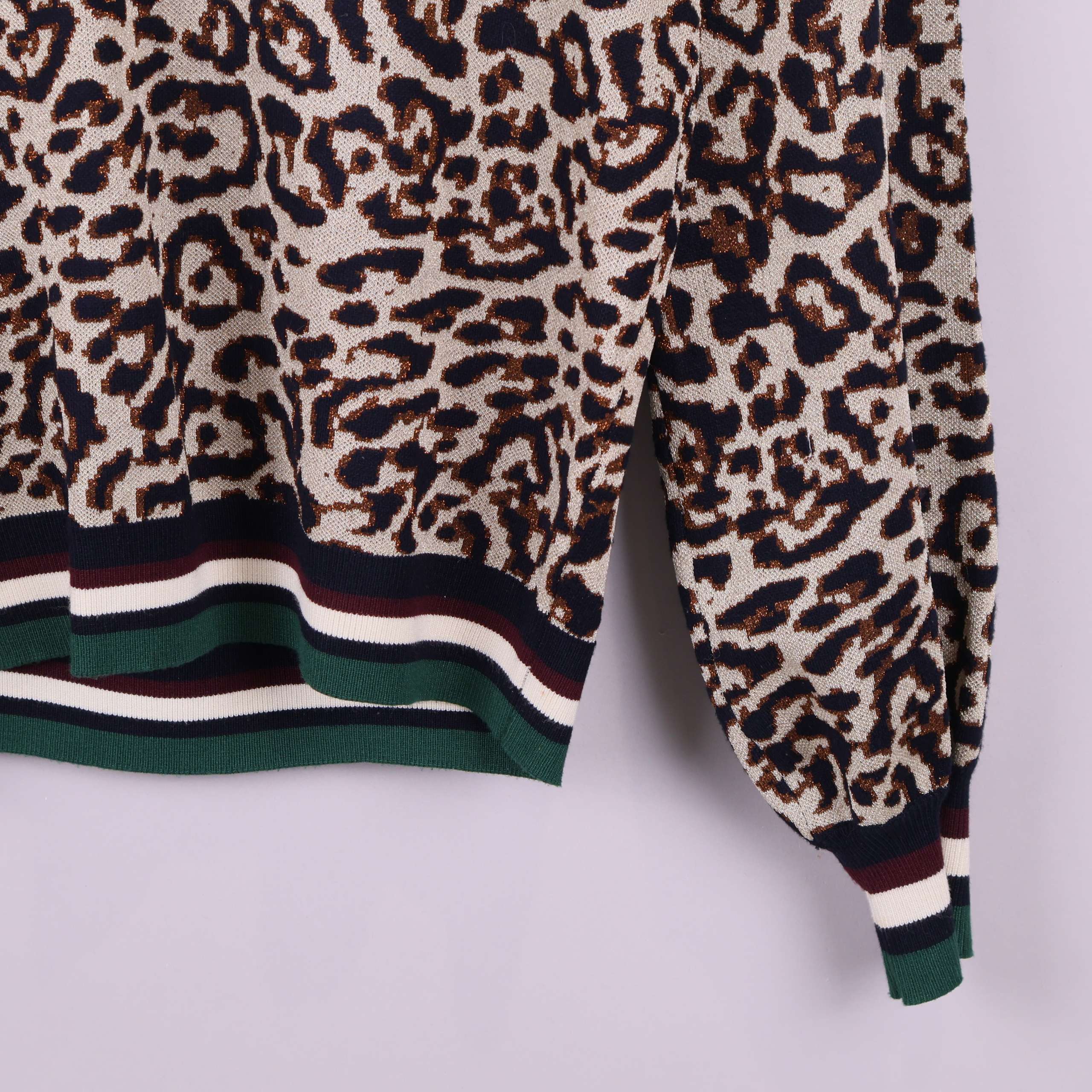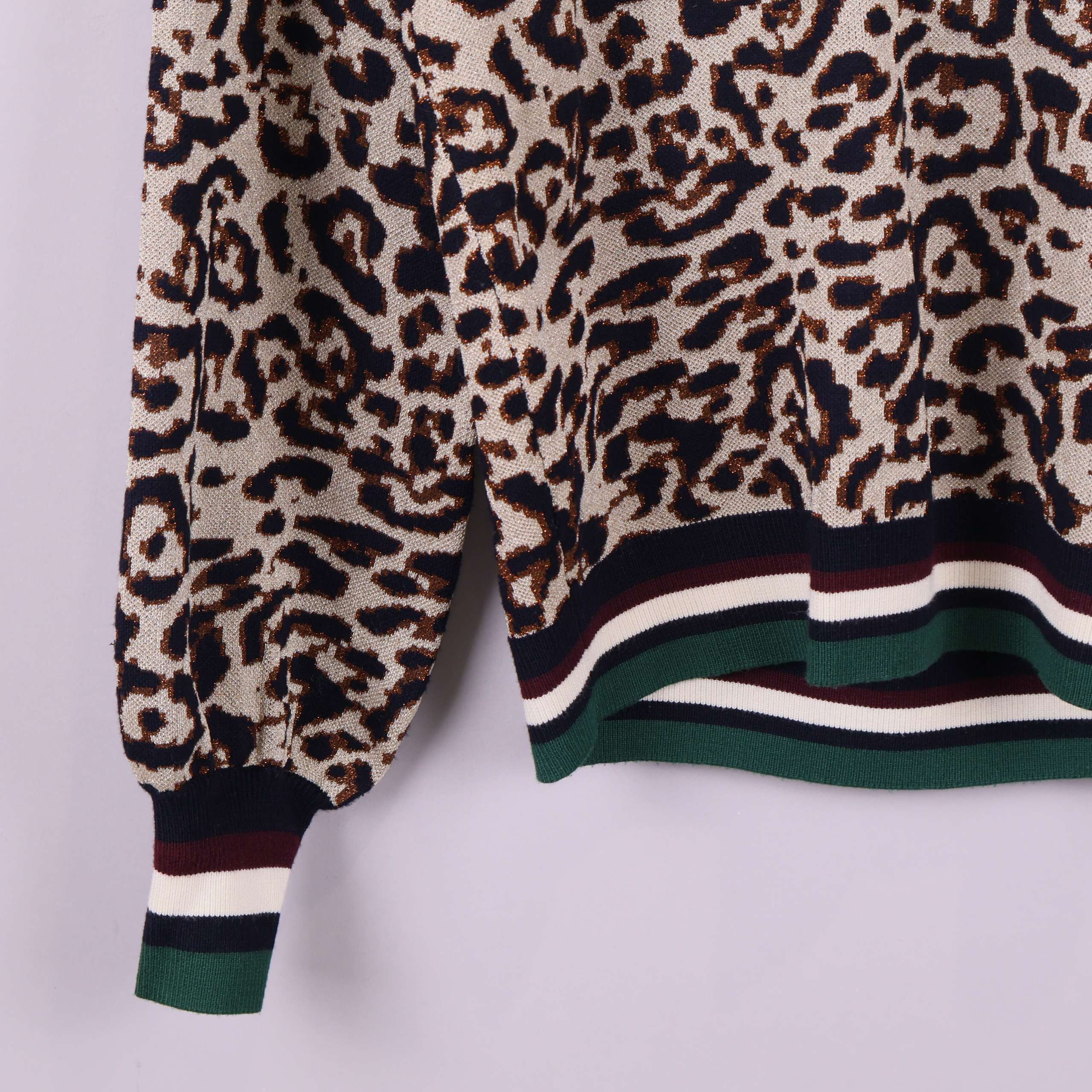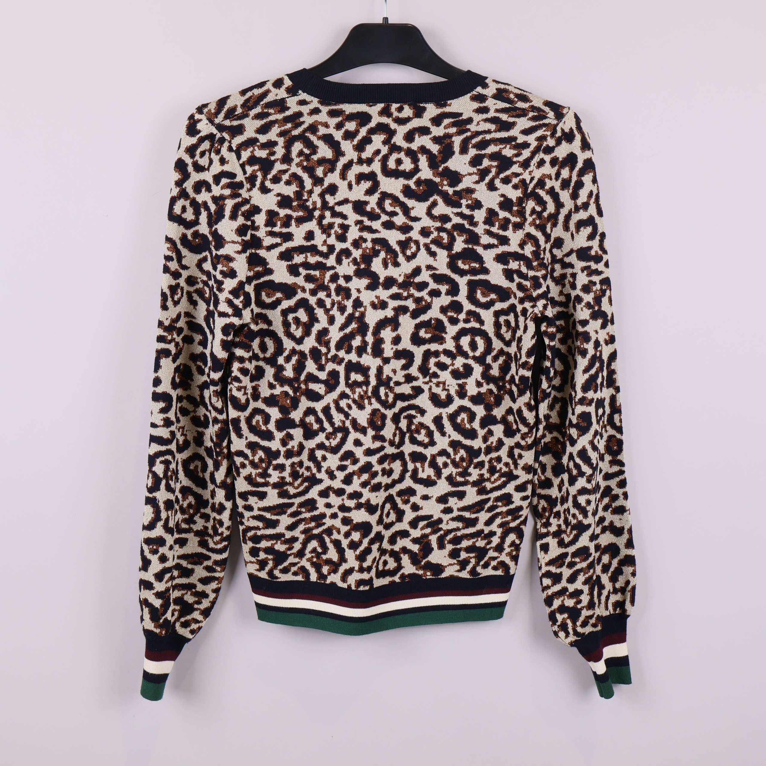 Mönstrad tröja med djurmönster i klassisk leopardstil. Ribbstickade muddar och nederkant i grönt, vinrött, svart och vitt ger en sportig touch.