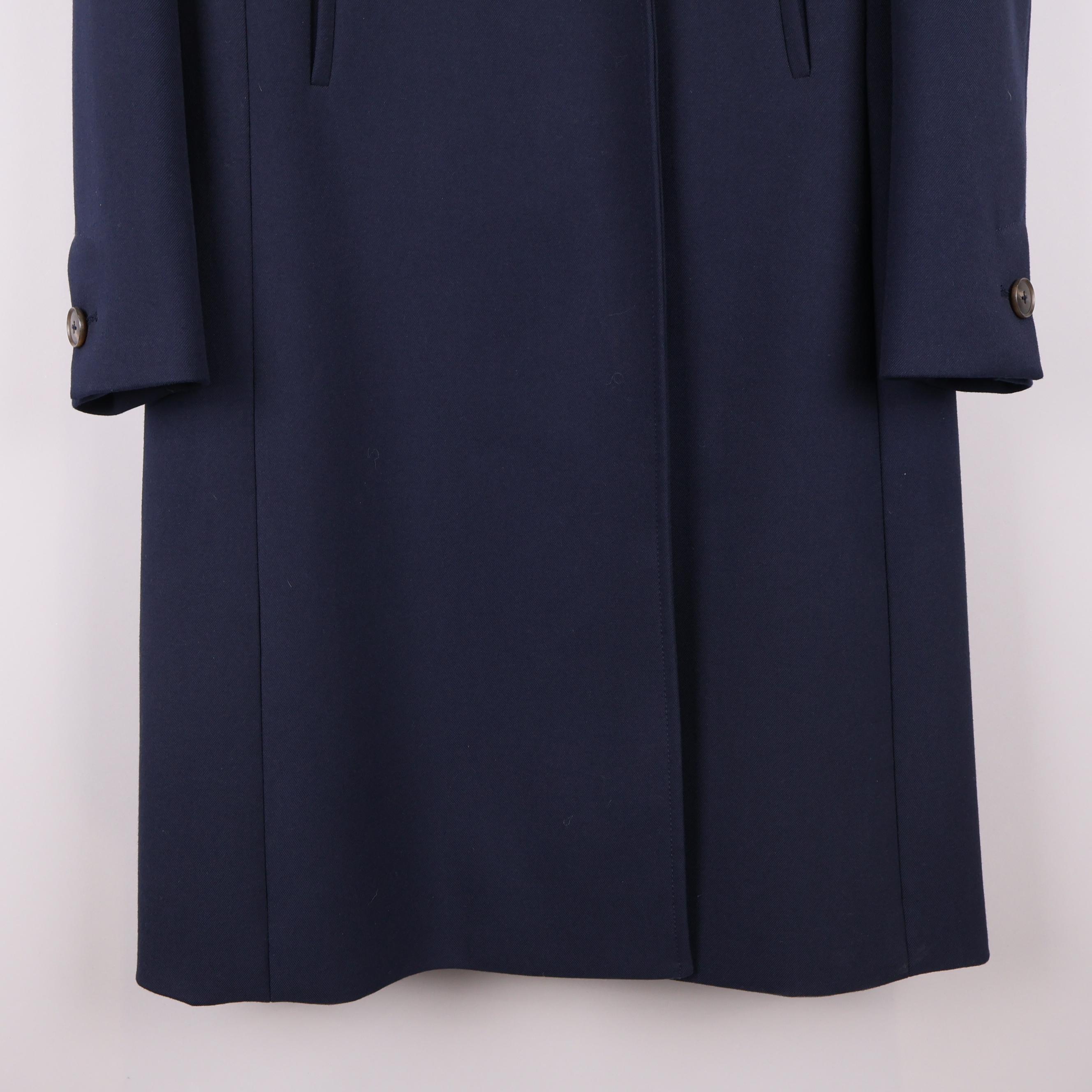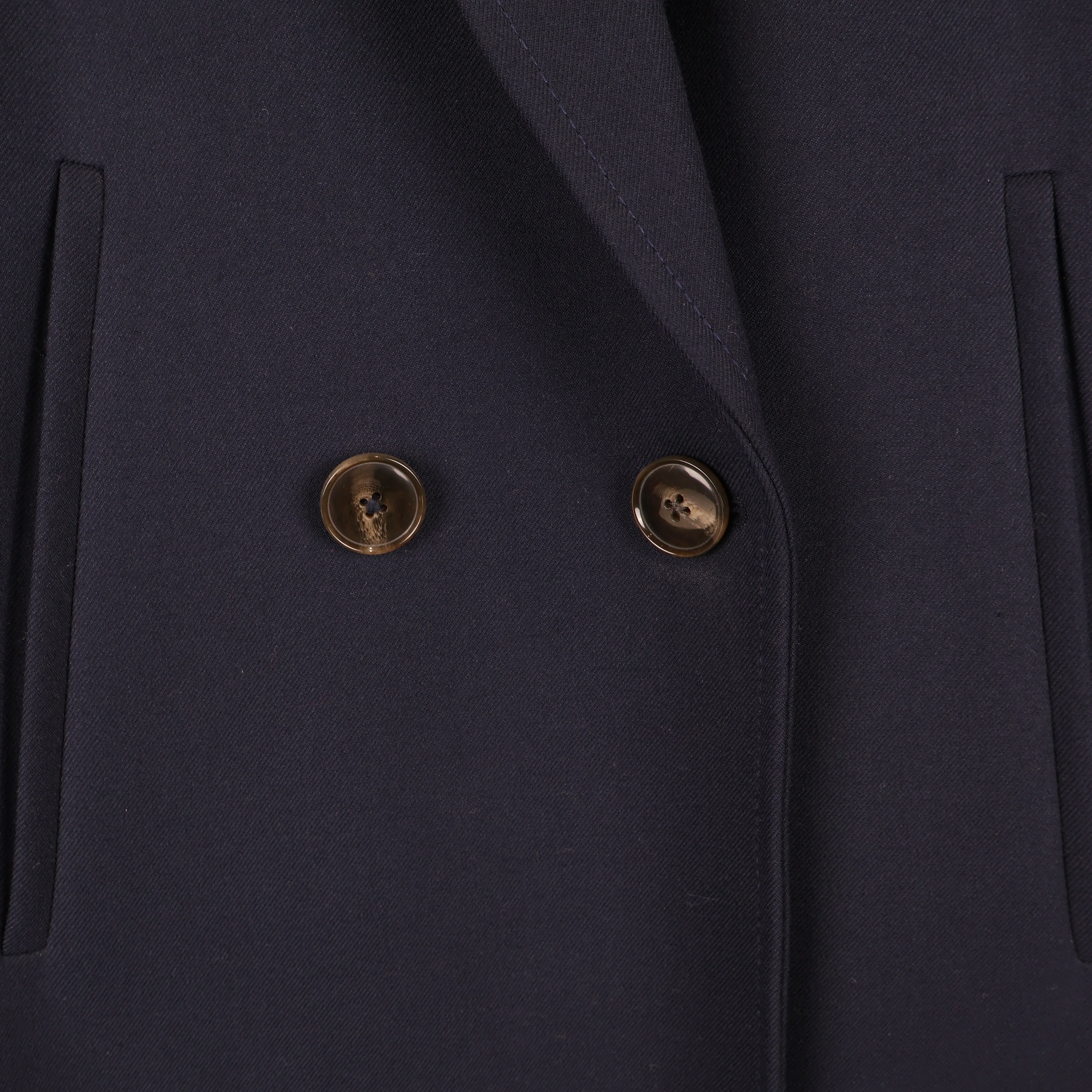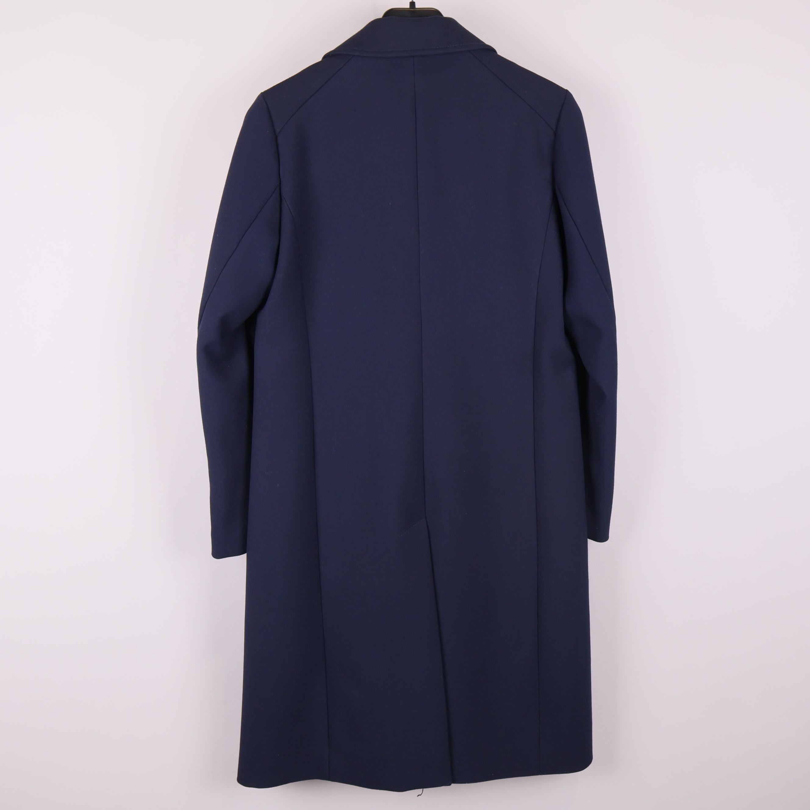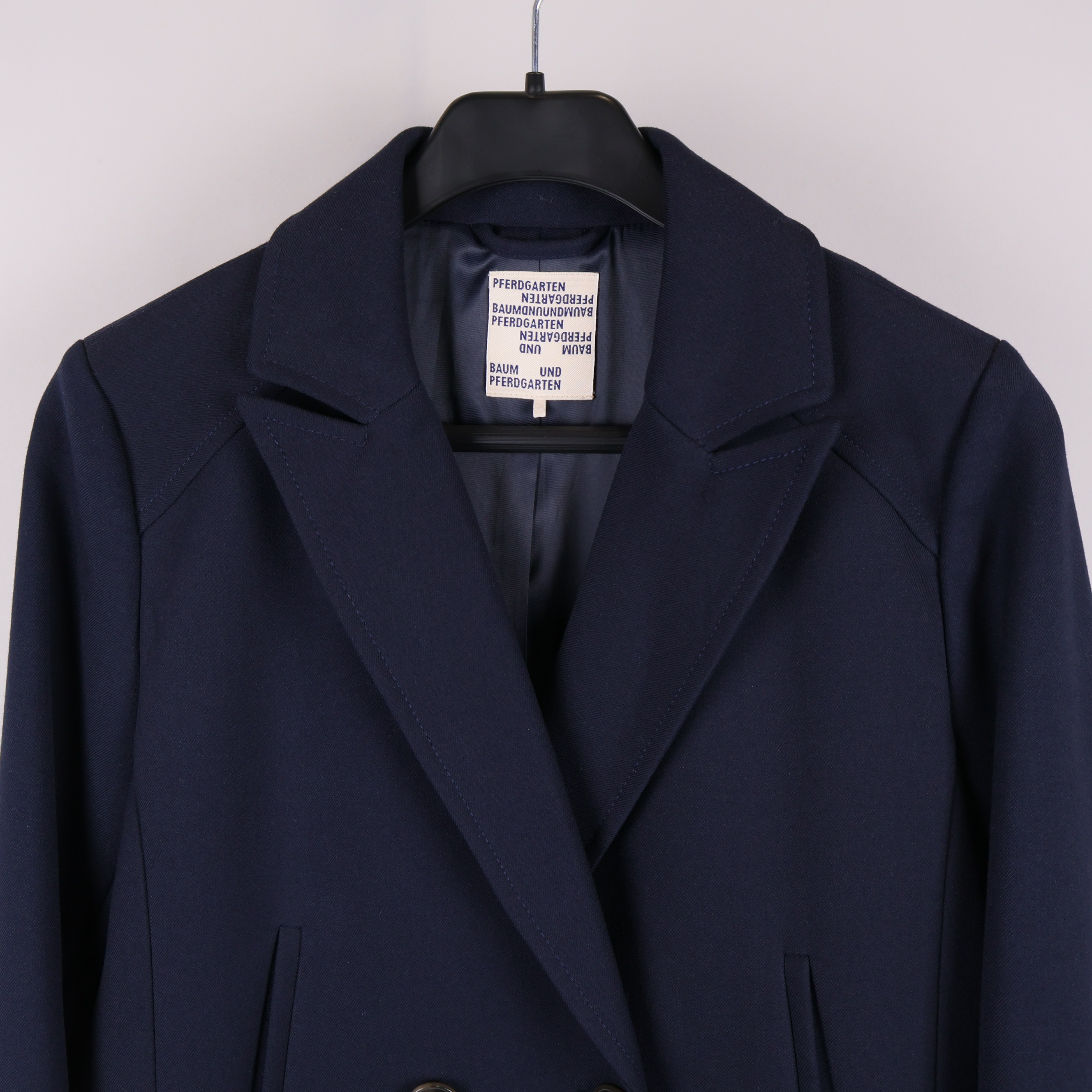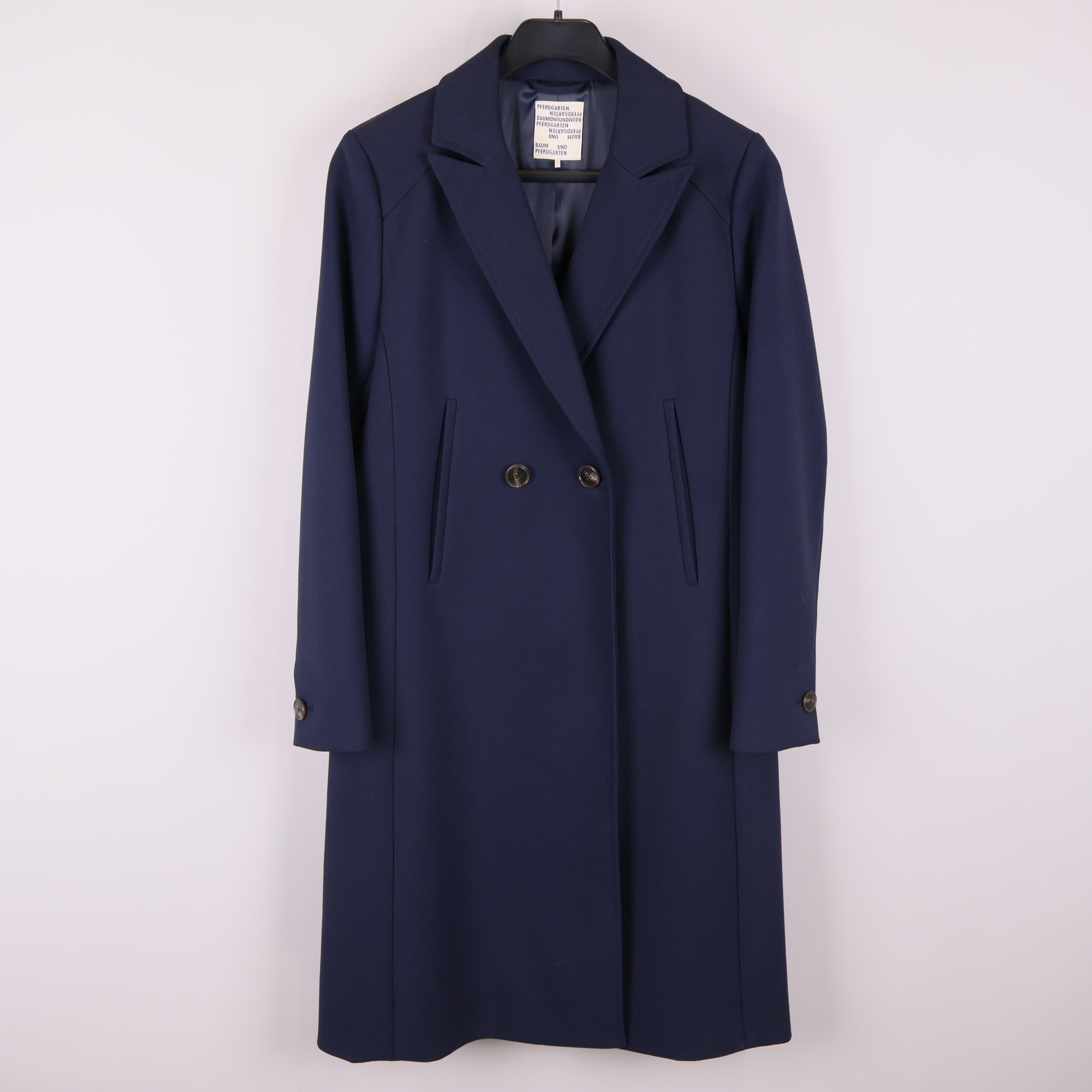Stilren dubbelknäppt kappa i marinblått med klassisk krage och dekorativa knappar framtill. Dolda sidfickor ger ett cleant intryck och den släta ytan ger en tidlös och elegant känsla. Perfekt längd och skärning för en modern och dressad look.