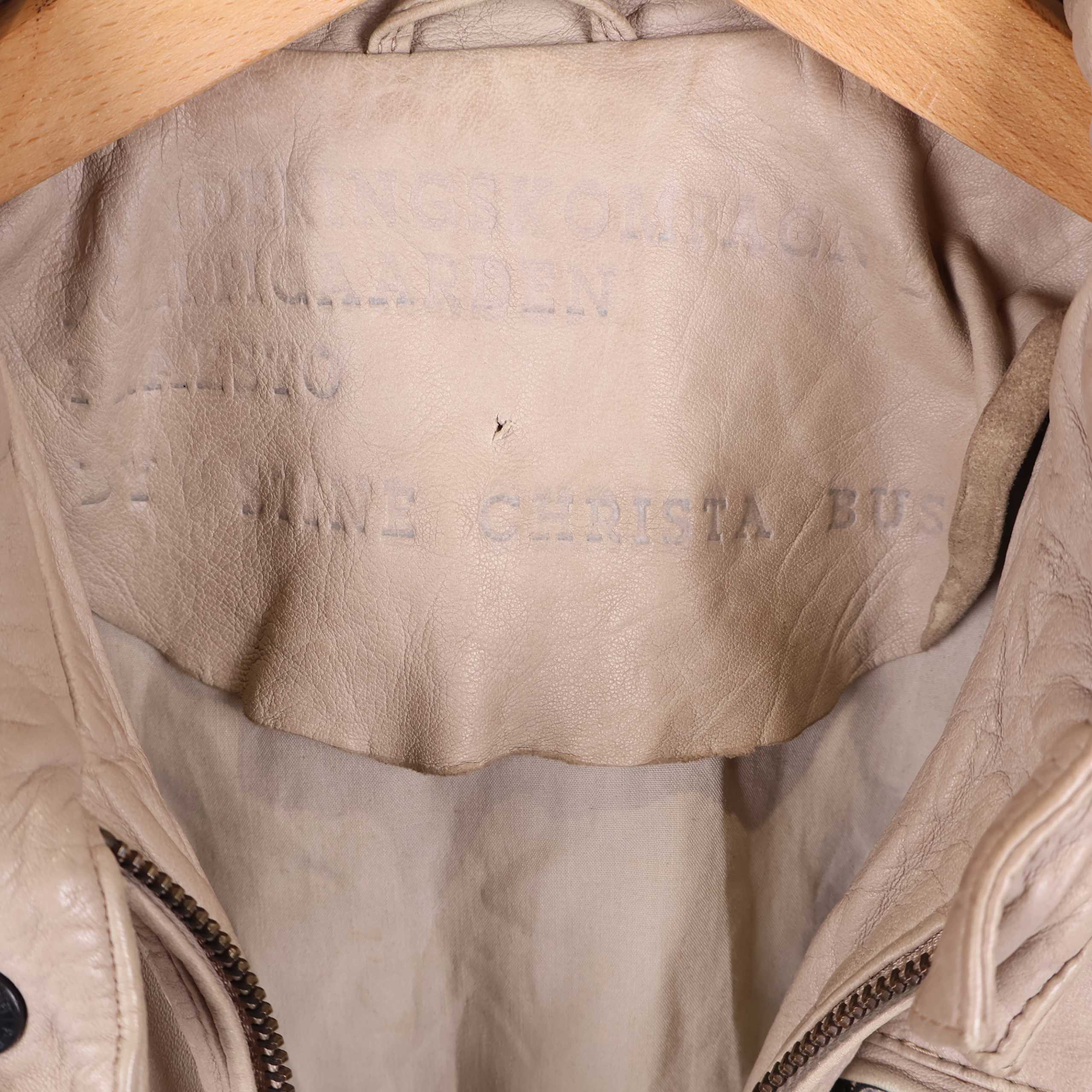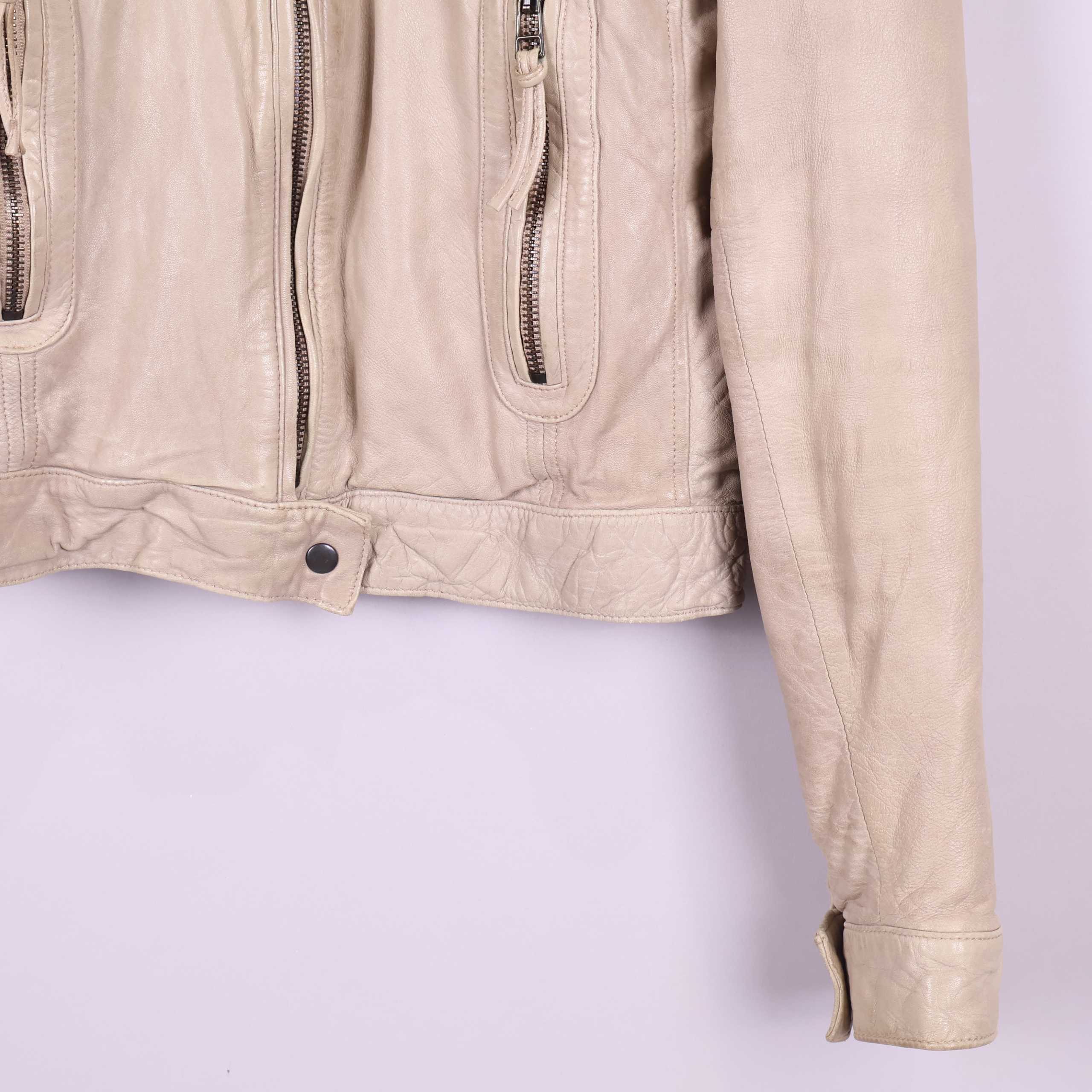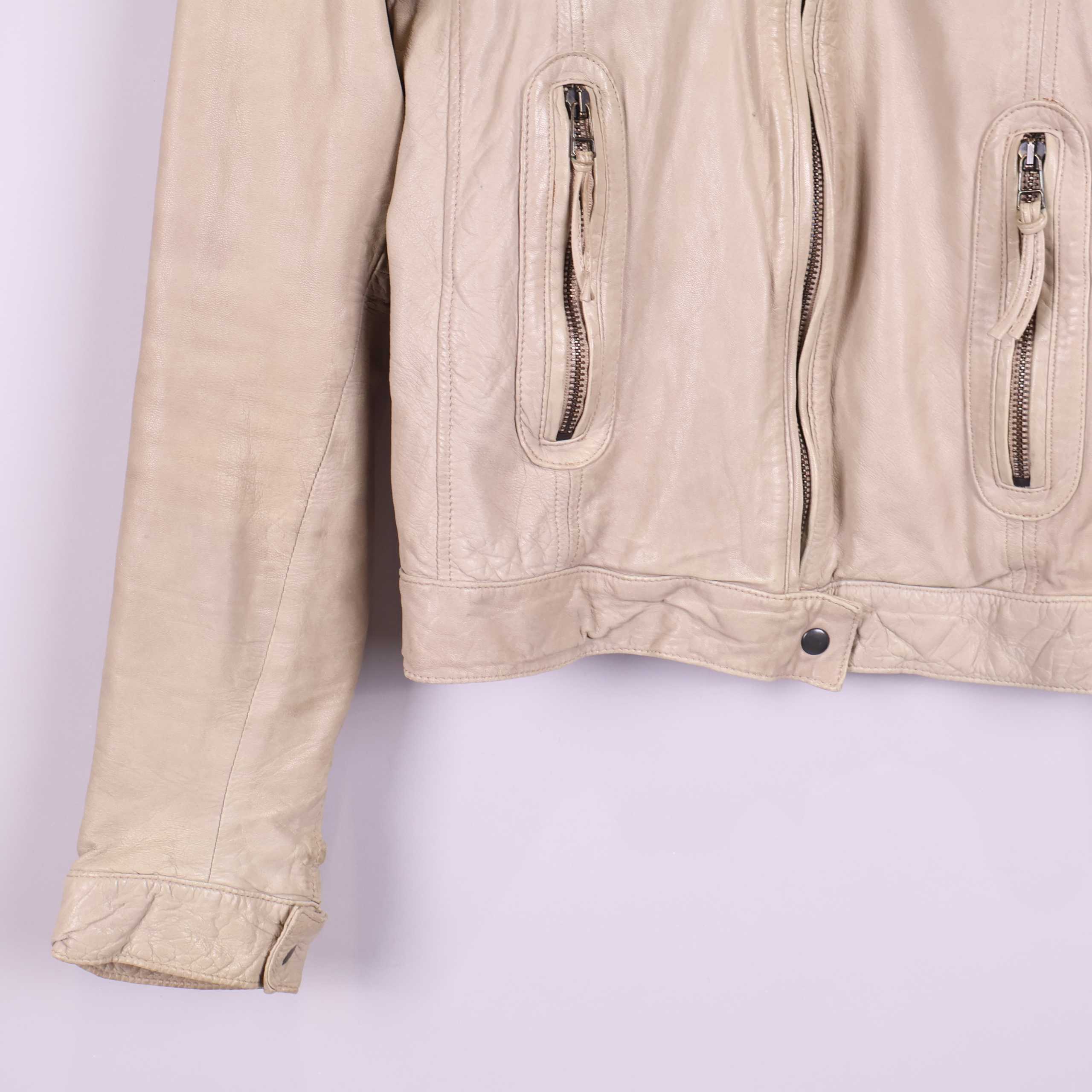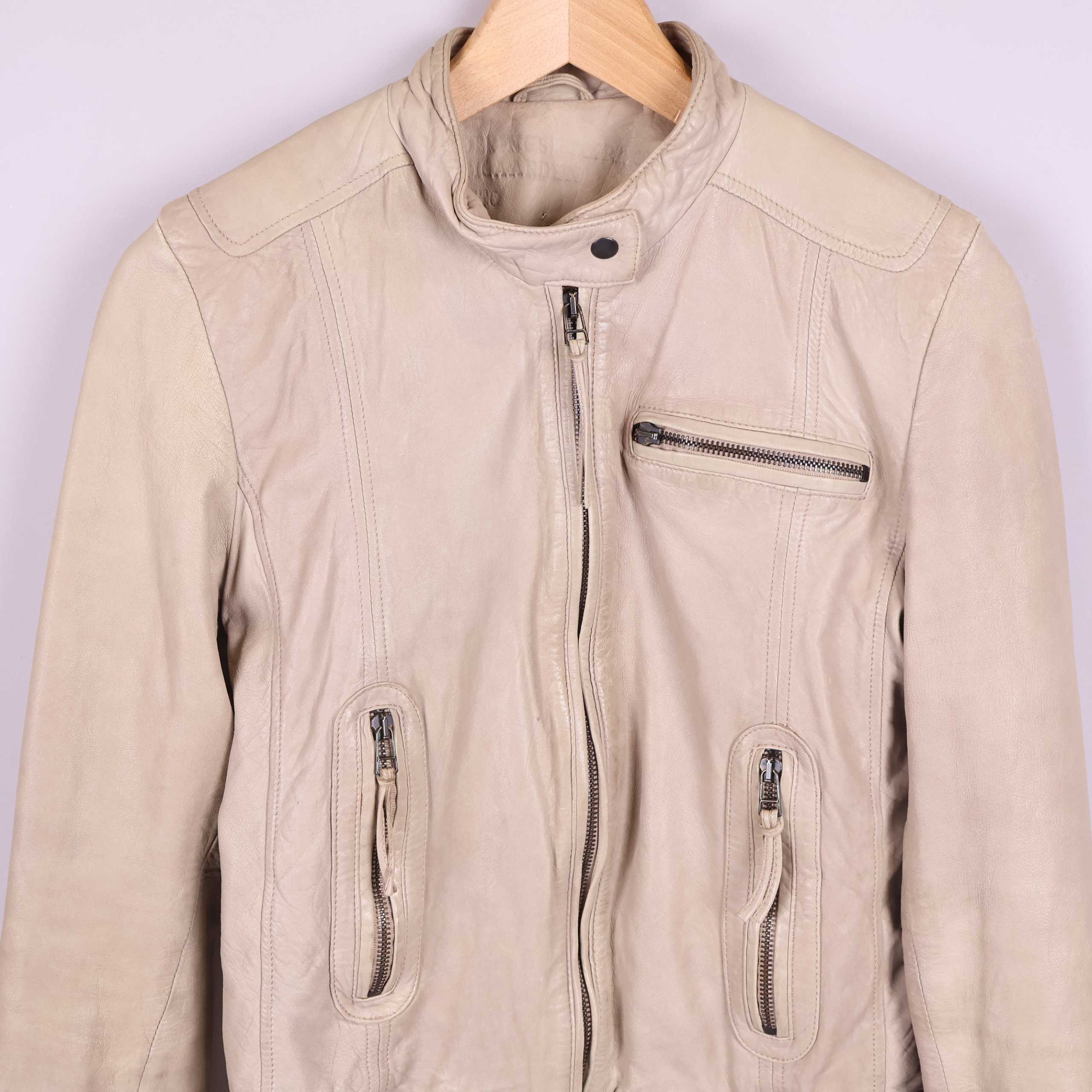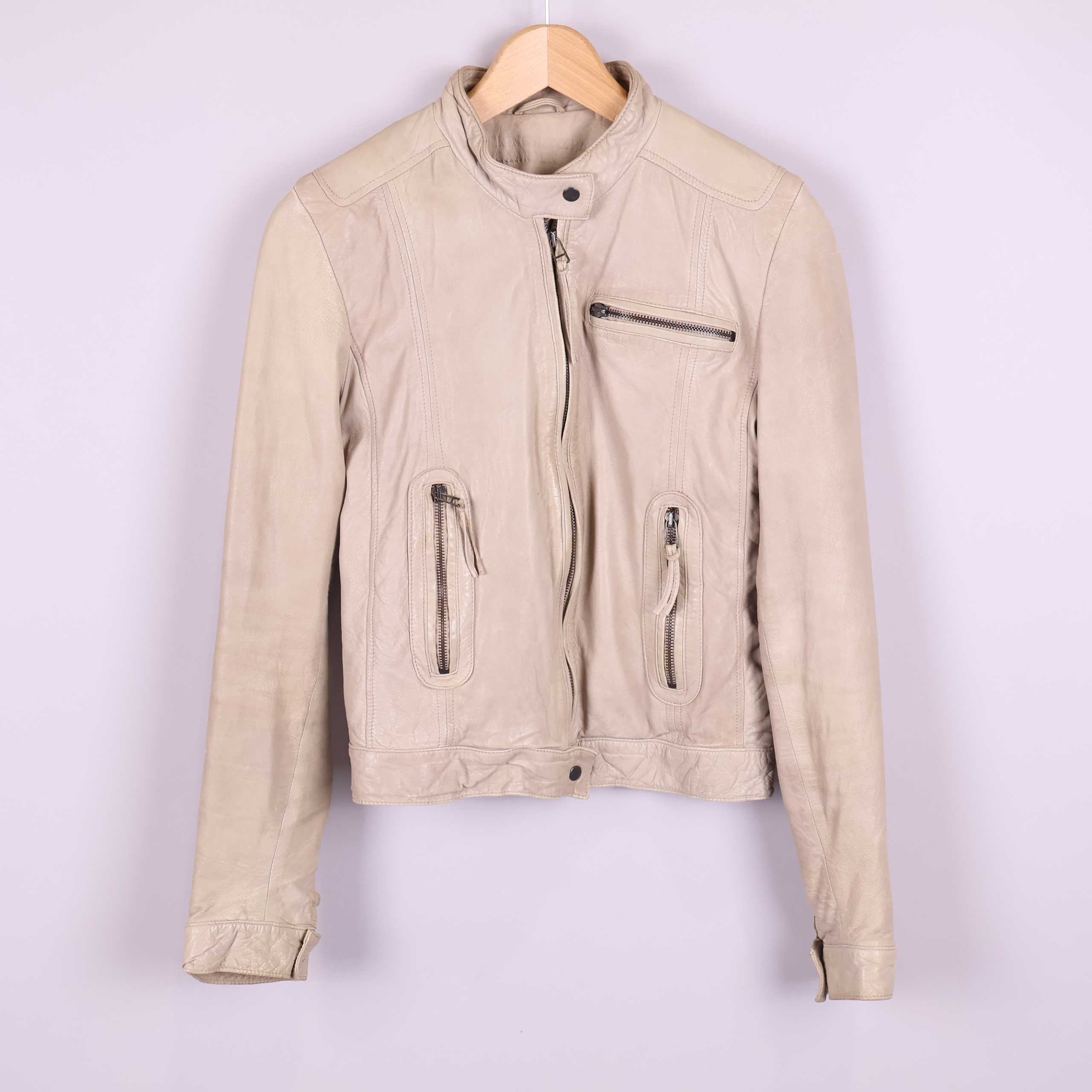 Beige jacka med bikerinspirerad design och skinnlook. Modellen har raka linjer, dragkedjor framtill och på fickor samt knapp i hals och ärmslut. Slät baksida och detaljerad sömnad för modern känsla. Jackan har en neutral ton och passar till många olika stilar.