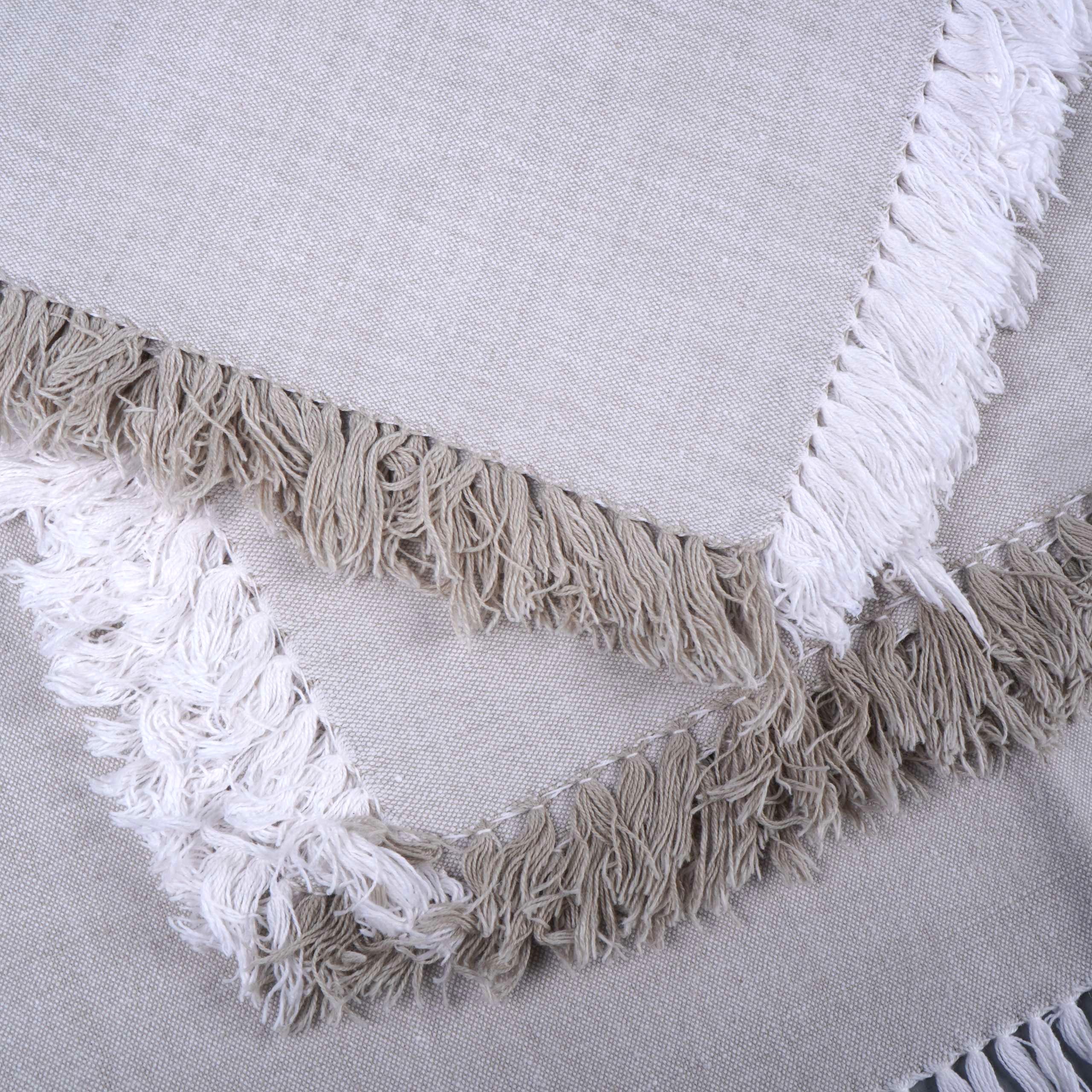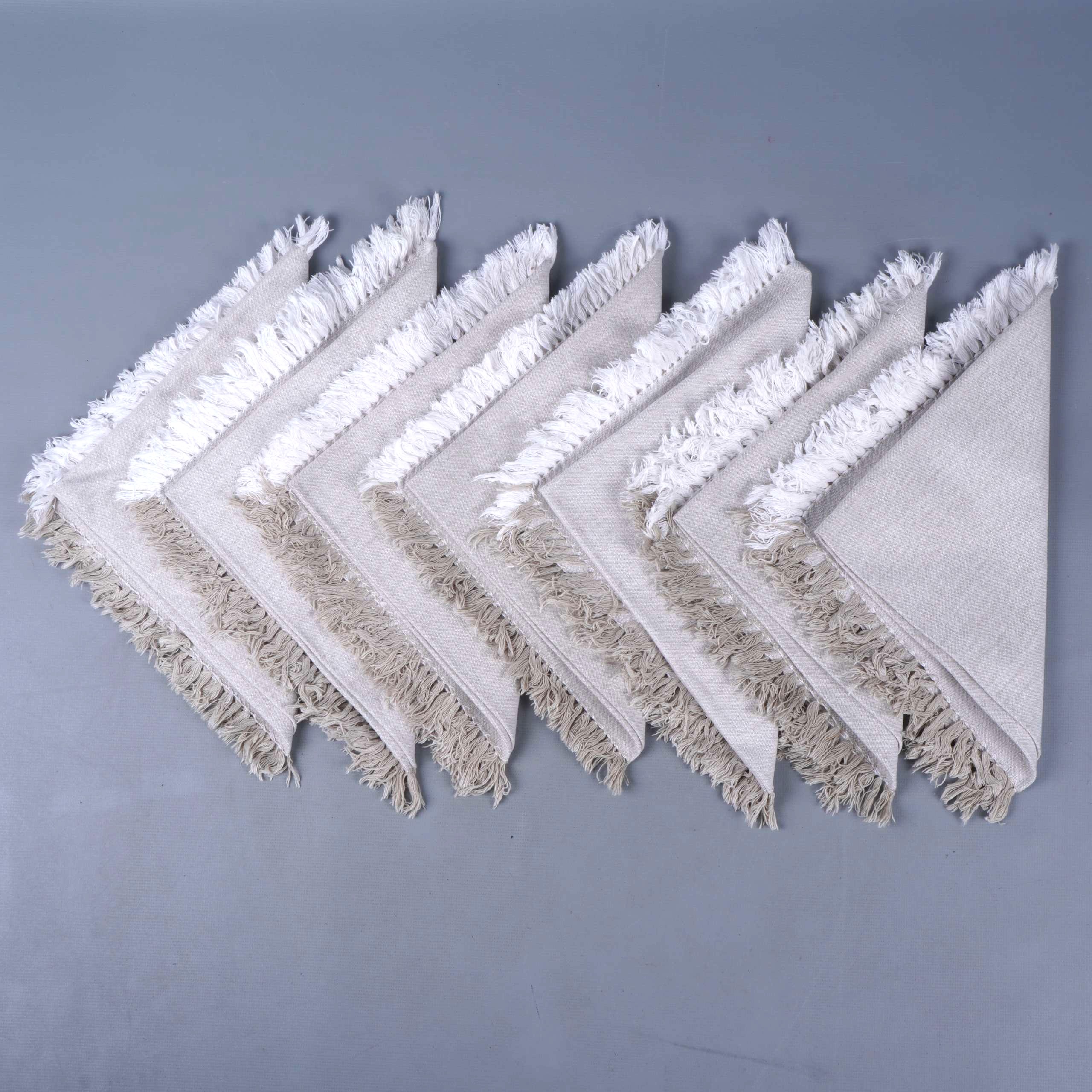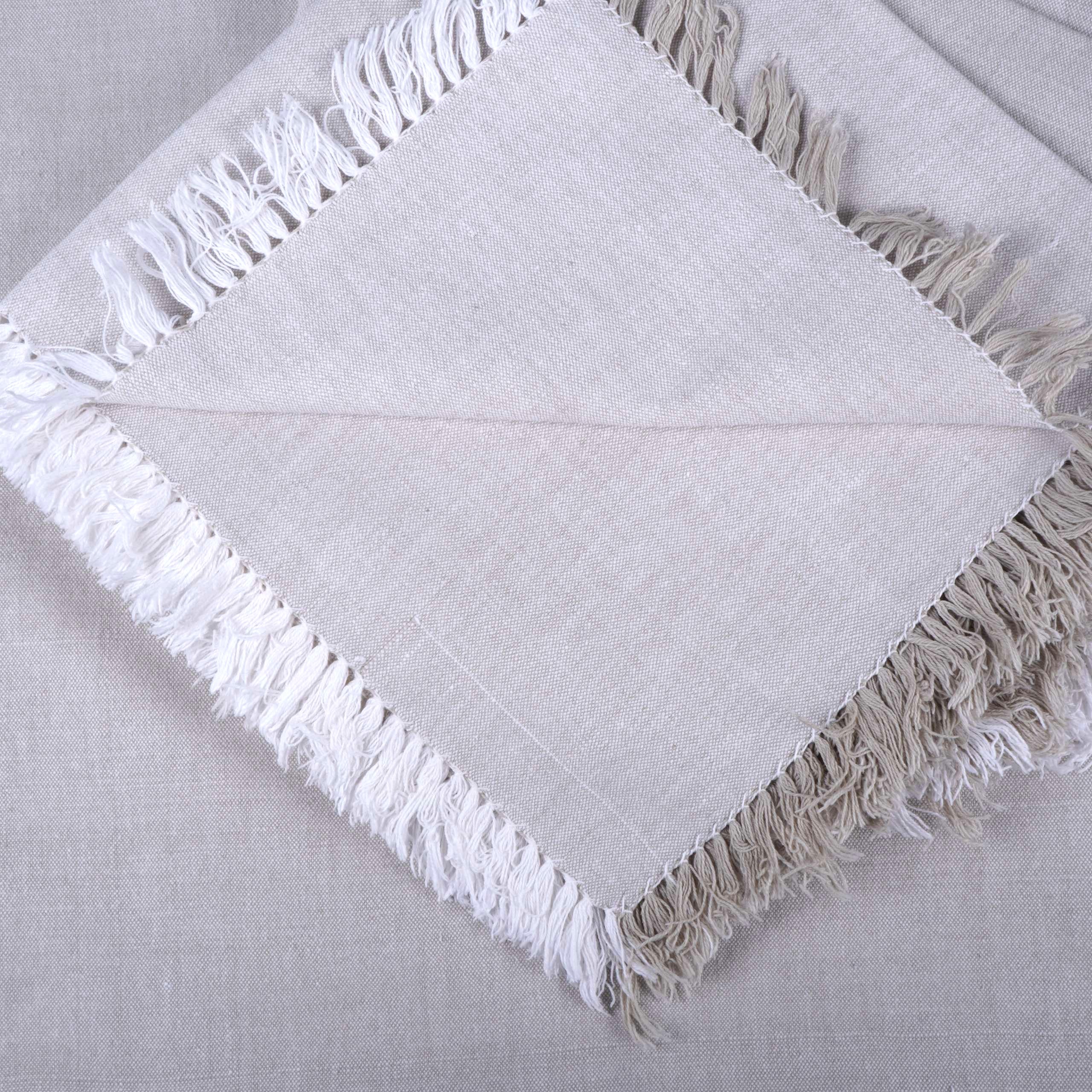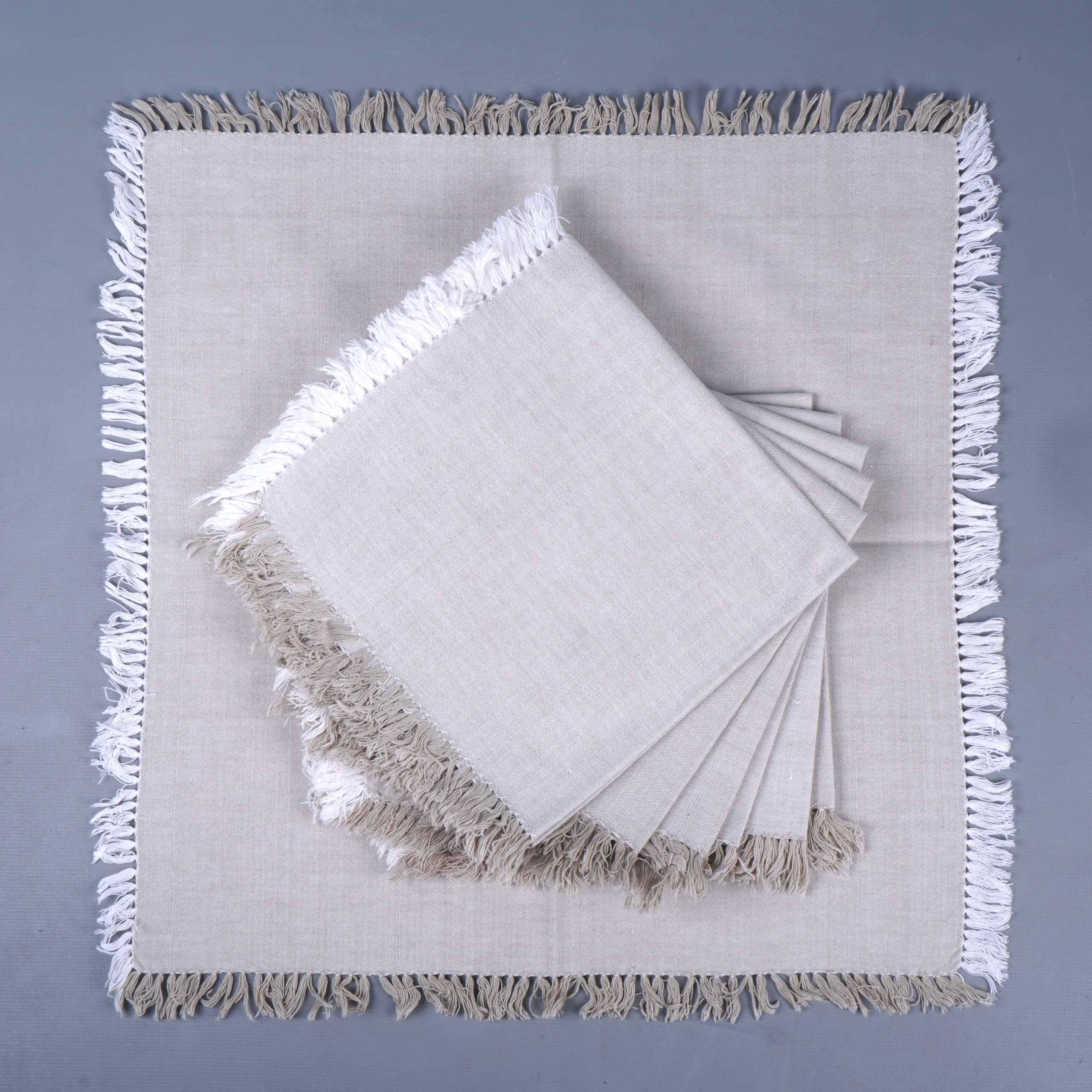 Set med åtta linneservetter i en mjuk beige ton med dekorativa fransar i vitt och beige runt kanterna. Textilen ger en naturlig känsla och passar lika bra till vardag som till fest. Tidlös design med en clean och avslappnad look.