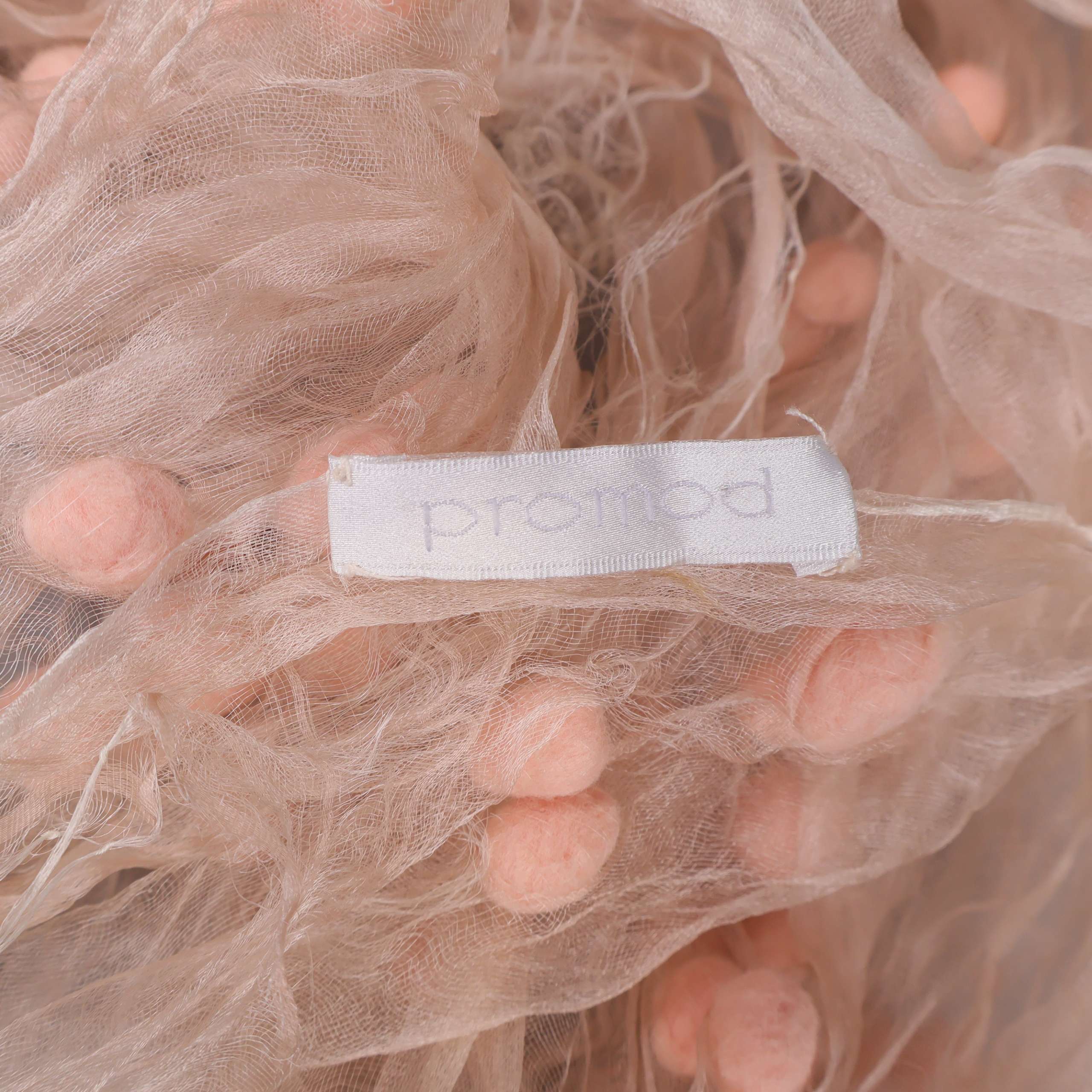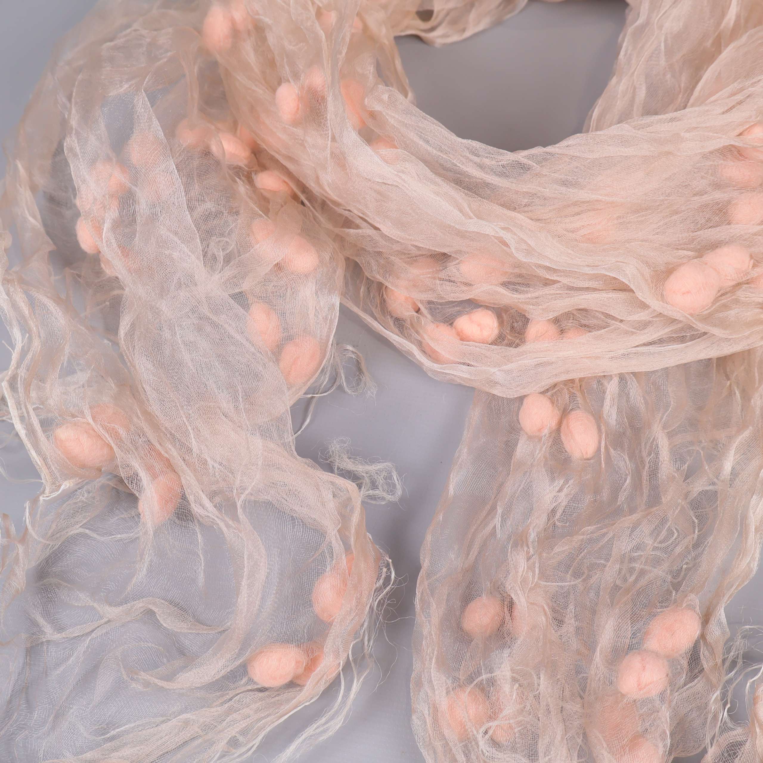 Lätt och luftig sjal med unikt utseende tack vare små, mjuka pompoms över hela tyget. Den transparenta och krusiga strukturen ger ett modernt och kreativt intryck. Perfekt som accessoar för att lyfta din stil med en lekfull och avslappnad känsla.