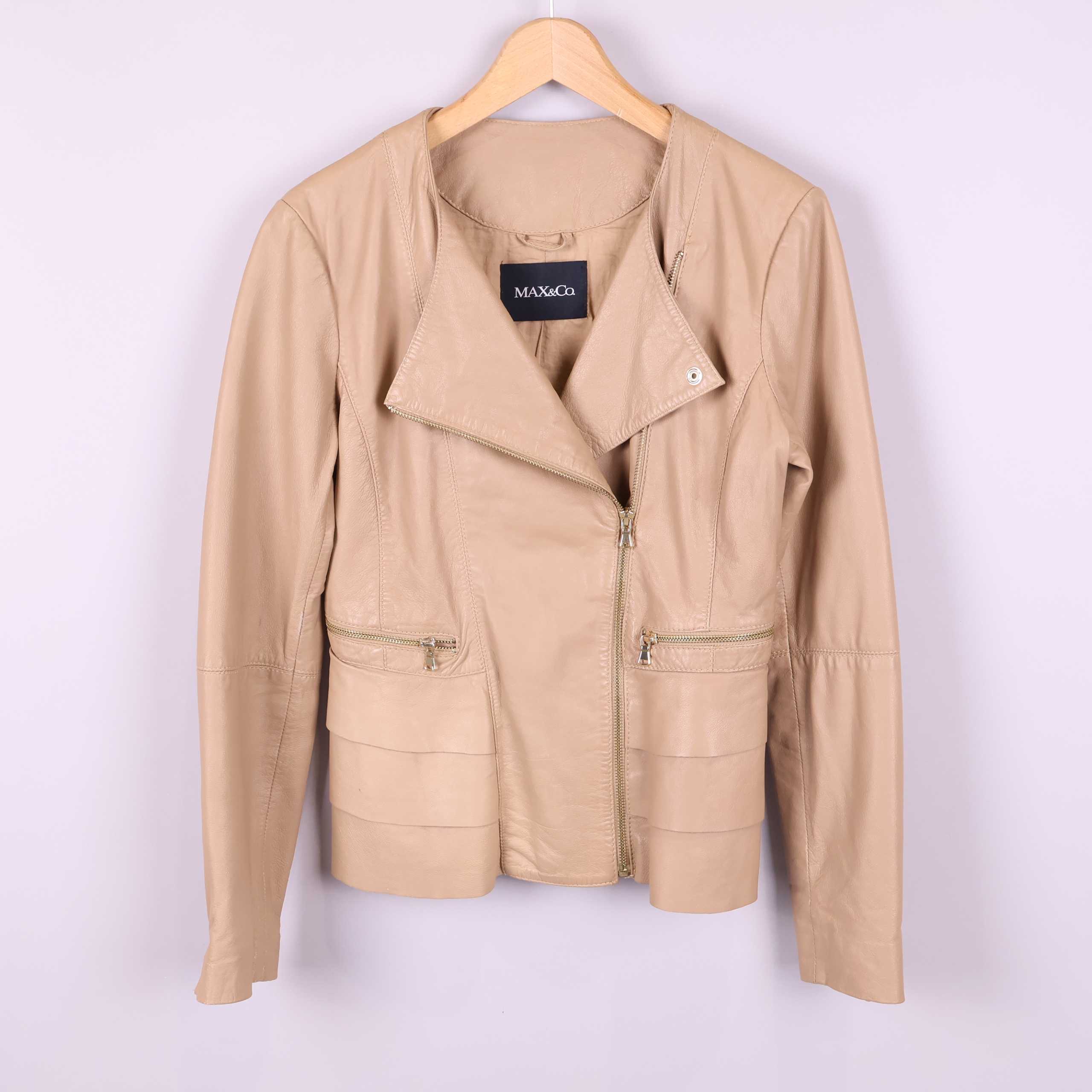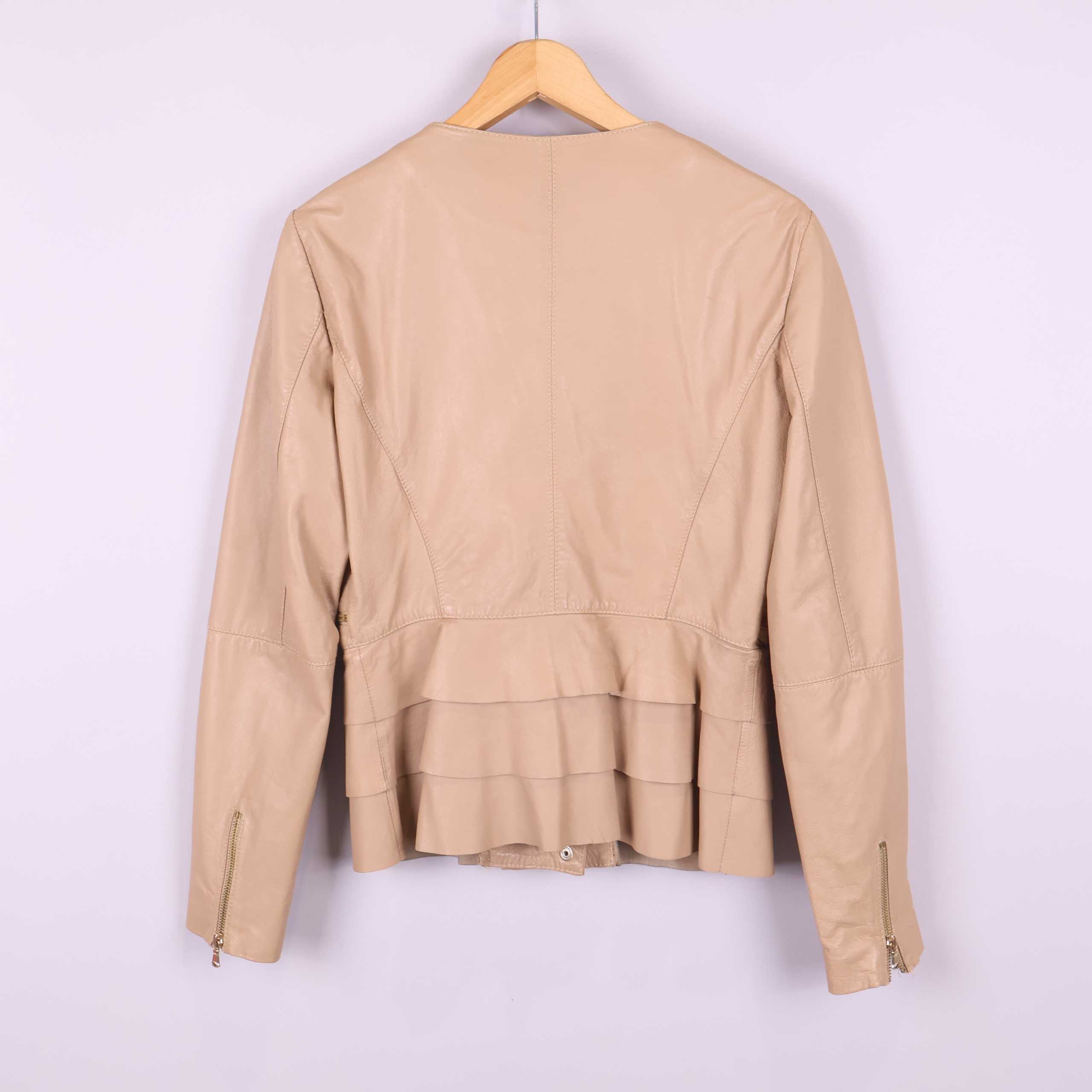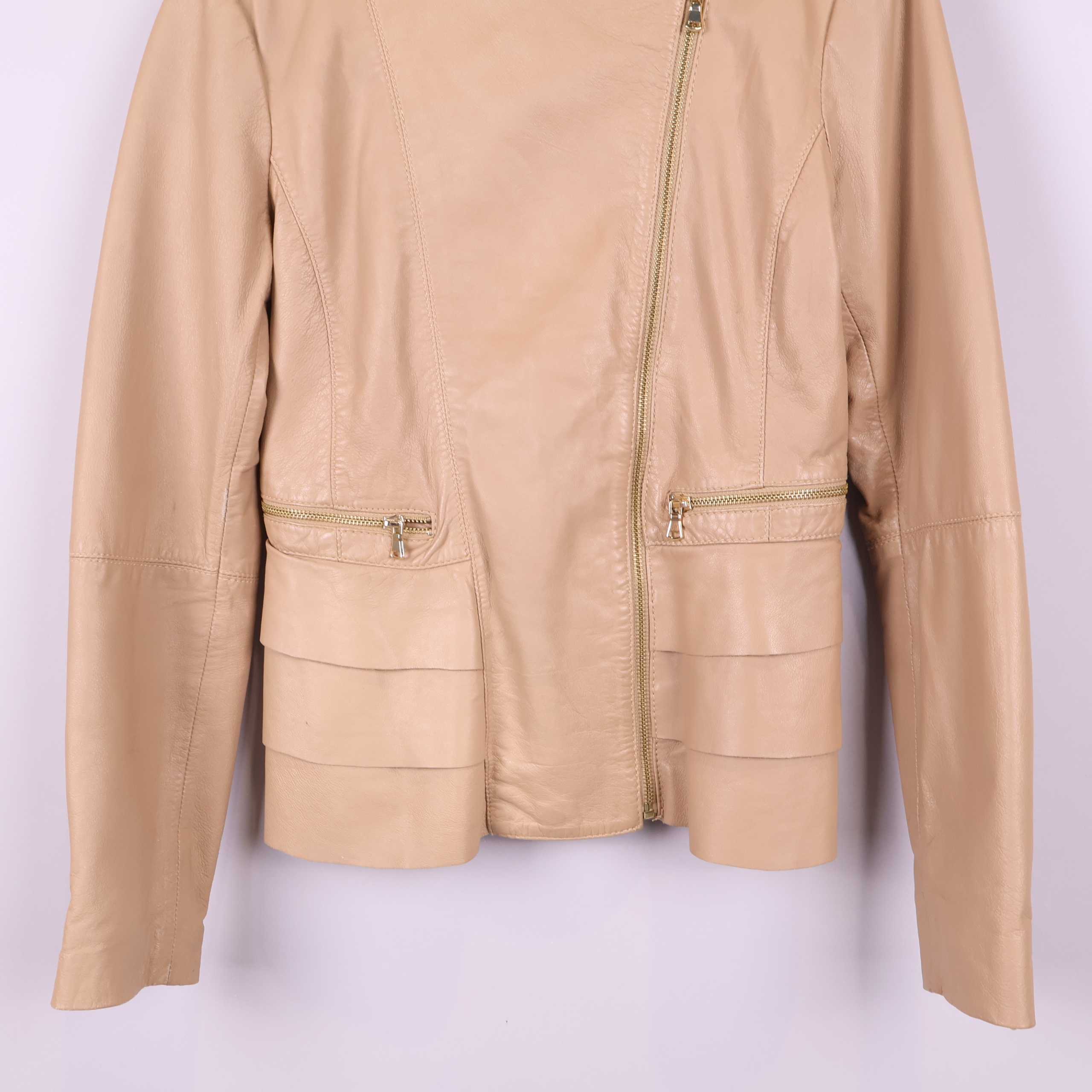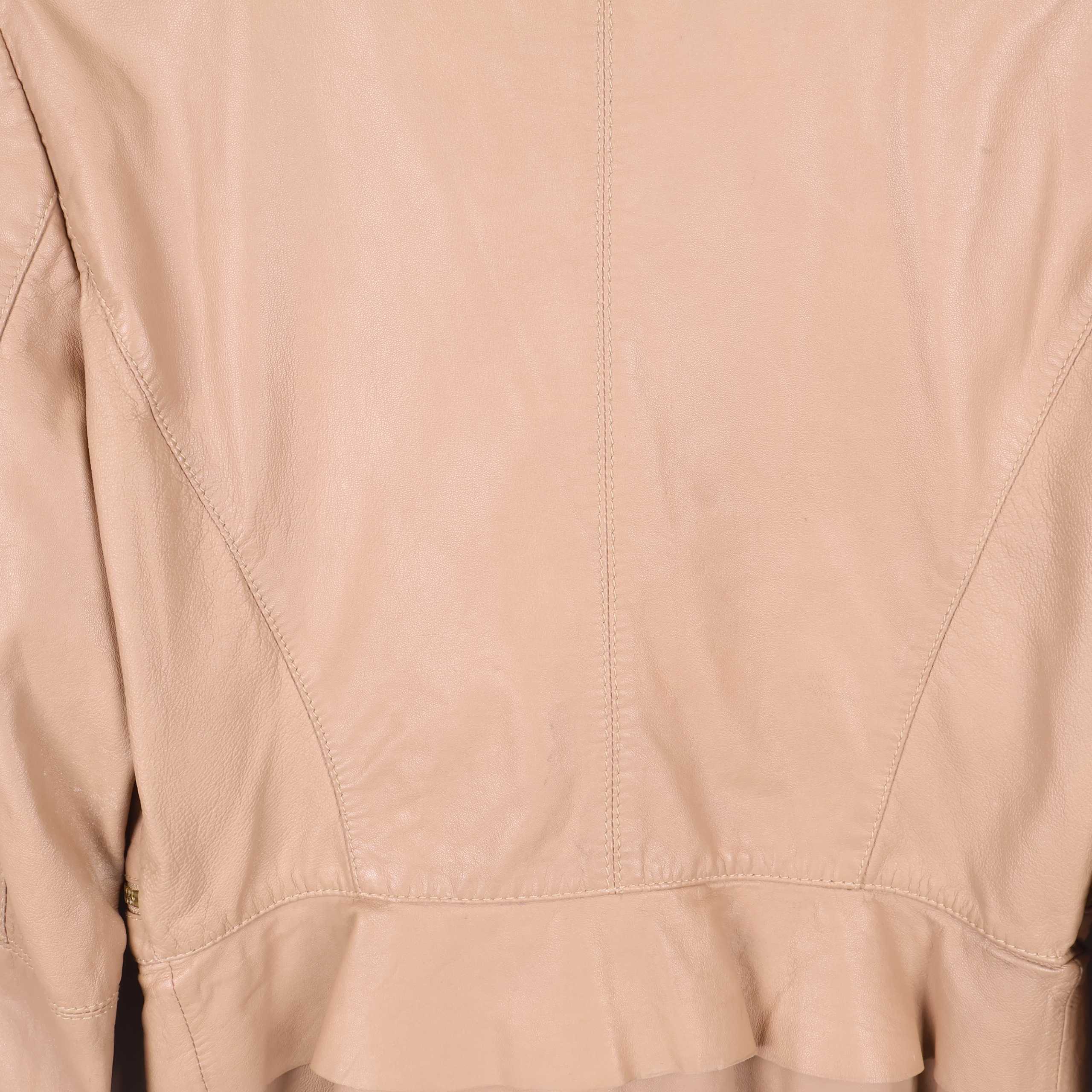 Modern och stilren skinnjacka i beige nyans med asymmetrisk dragkedja och dekorativa detaljer. Utrustad med framfickor med dragkedja och strukturerade sömmar som ger extra karaktär. Lätt figursydd passform och diskret volangdetalj baktill för en tidlös och elegant look.