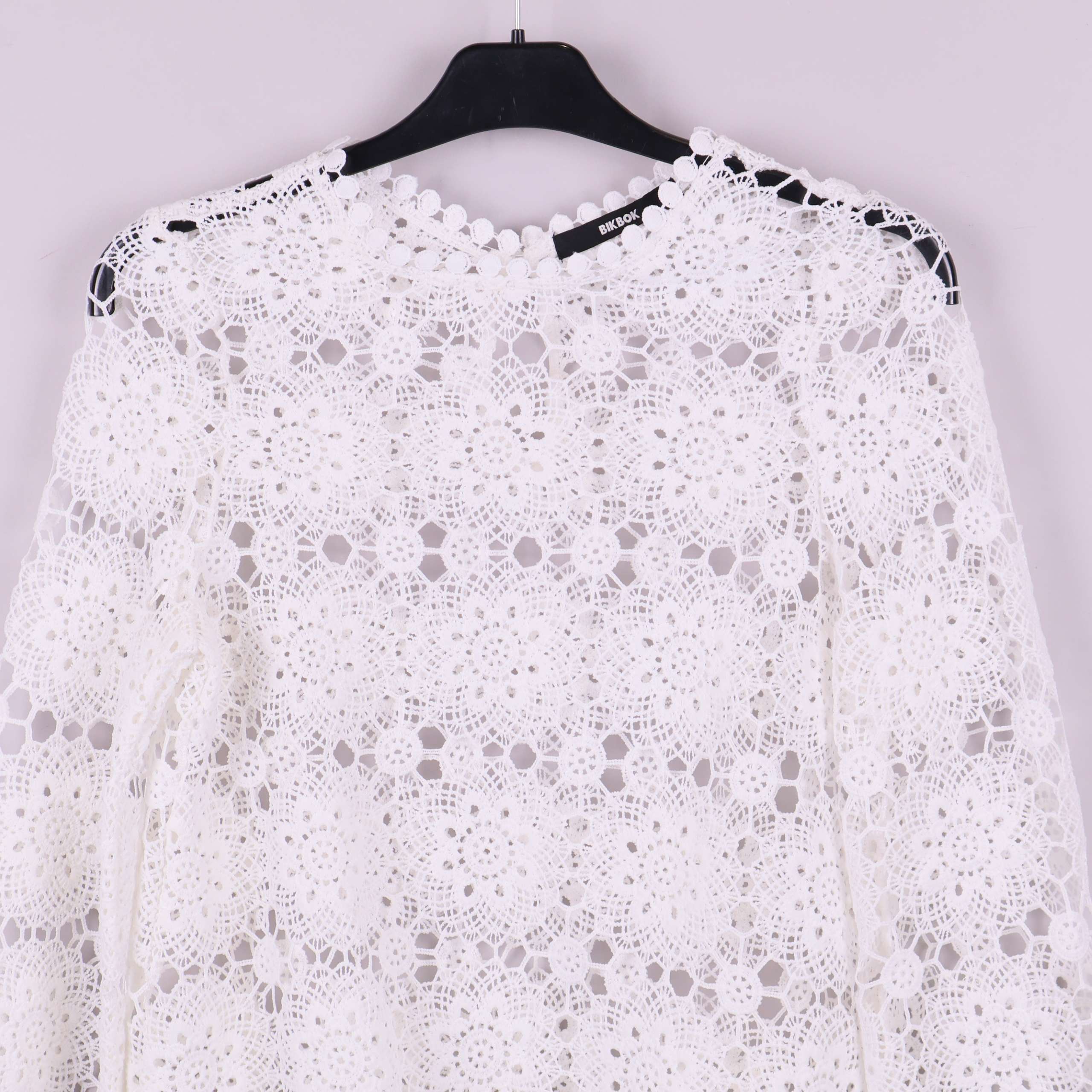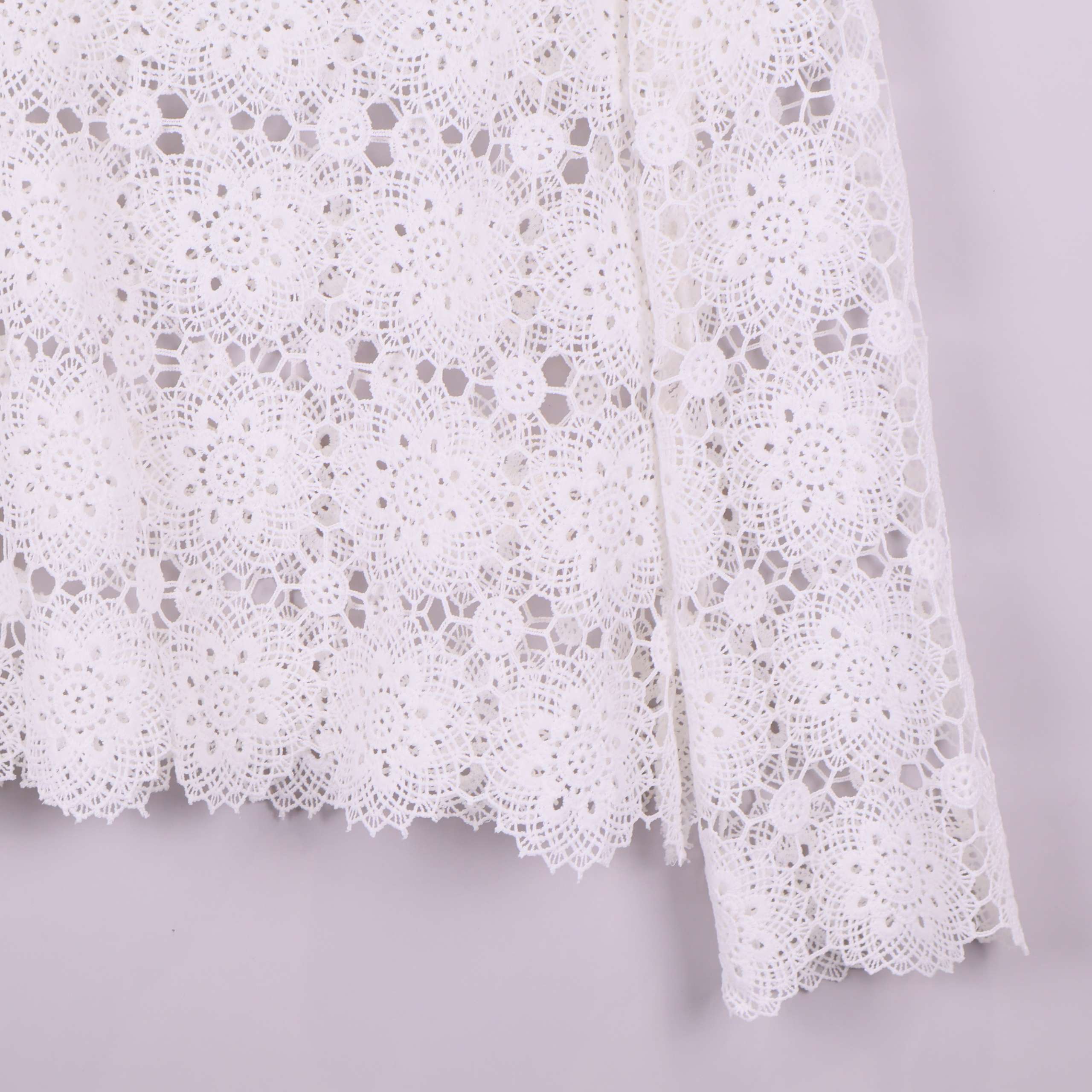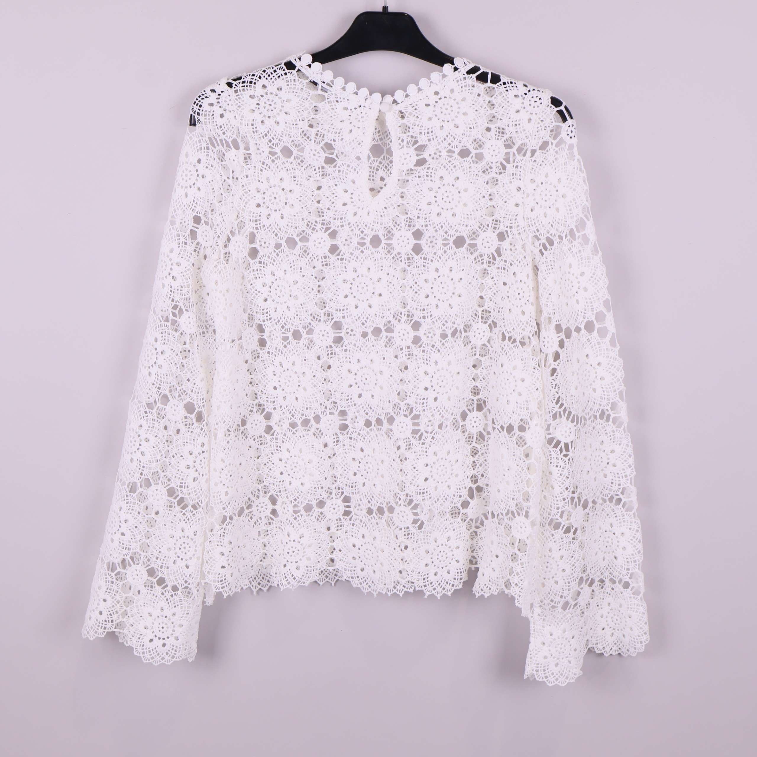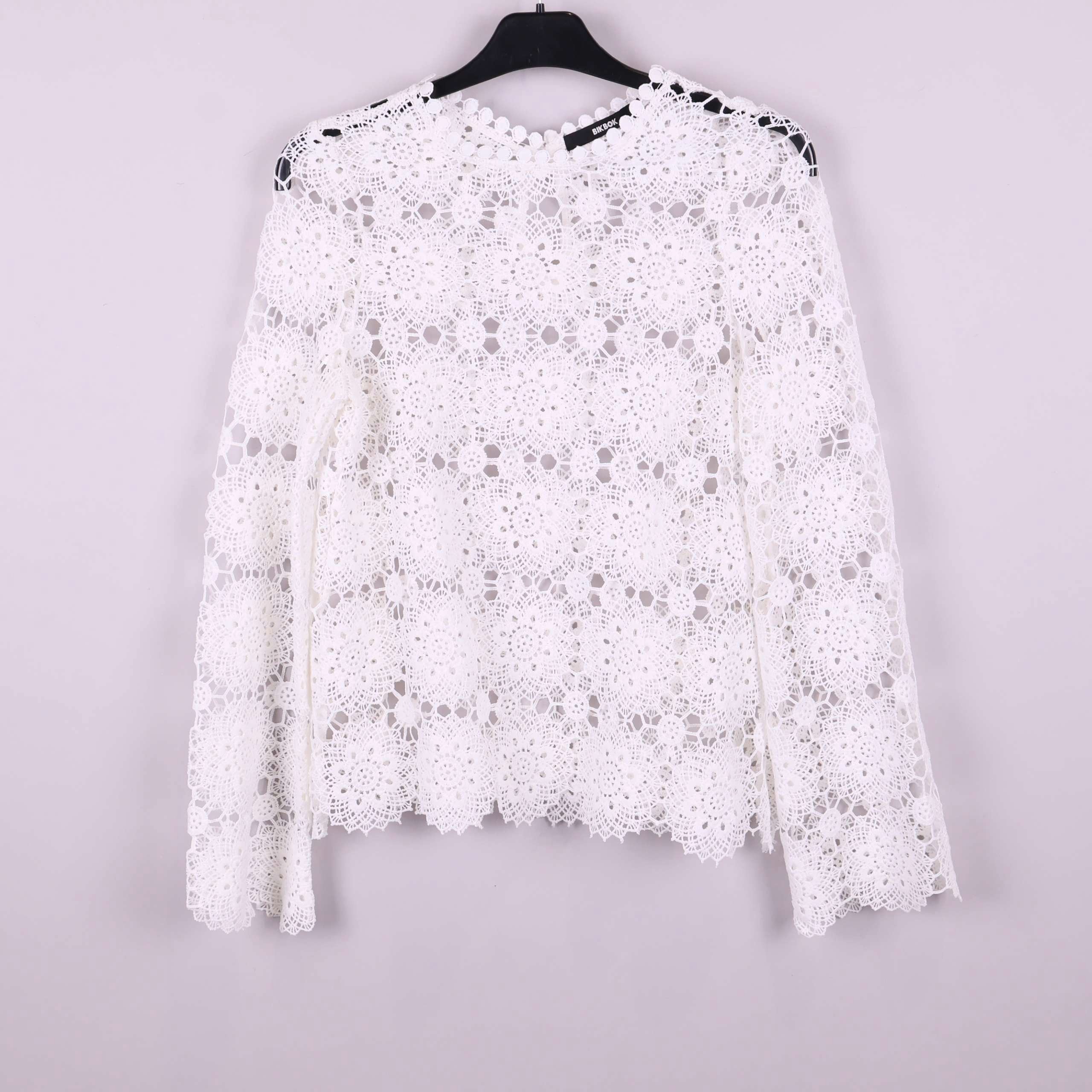 Topp i vacker spets med fint cirkelformat mönster, lång ärm och rund halsringning. Detaljerade kanter och genombruten design ger ett luftigt och stilrent intryck. Blusen har en lätt a-linjeform och öppning bak vid nacken med knapp. Perfekt för dig som gillar en romantisk look med modern twist.