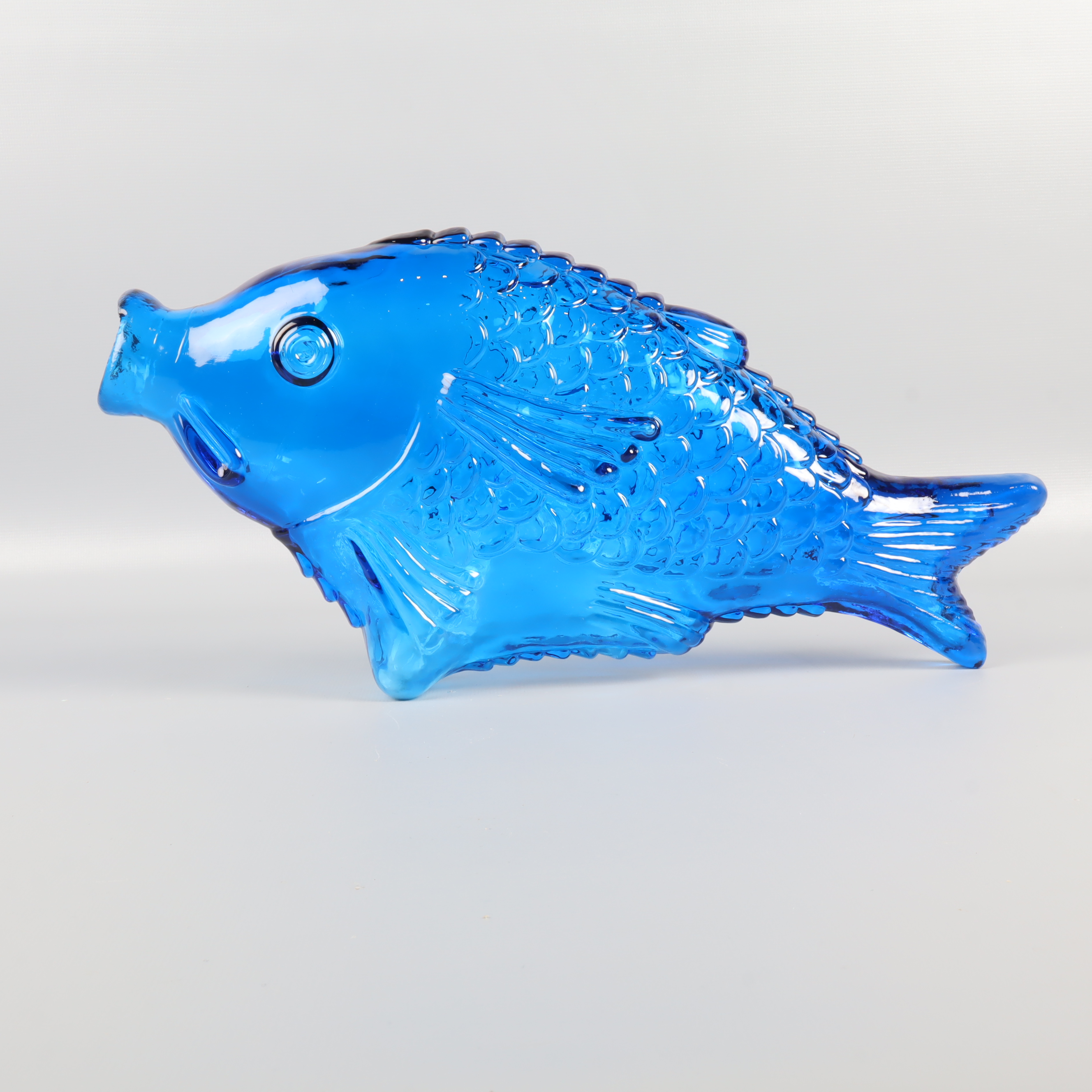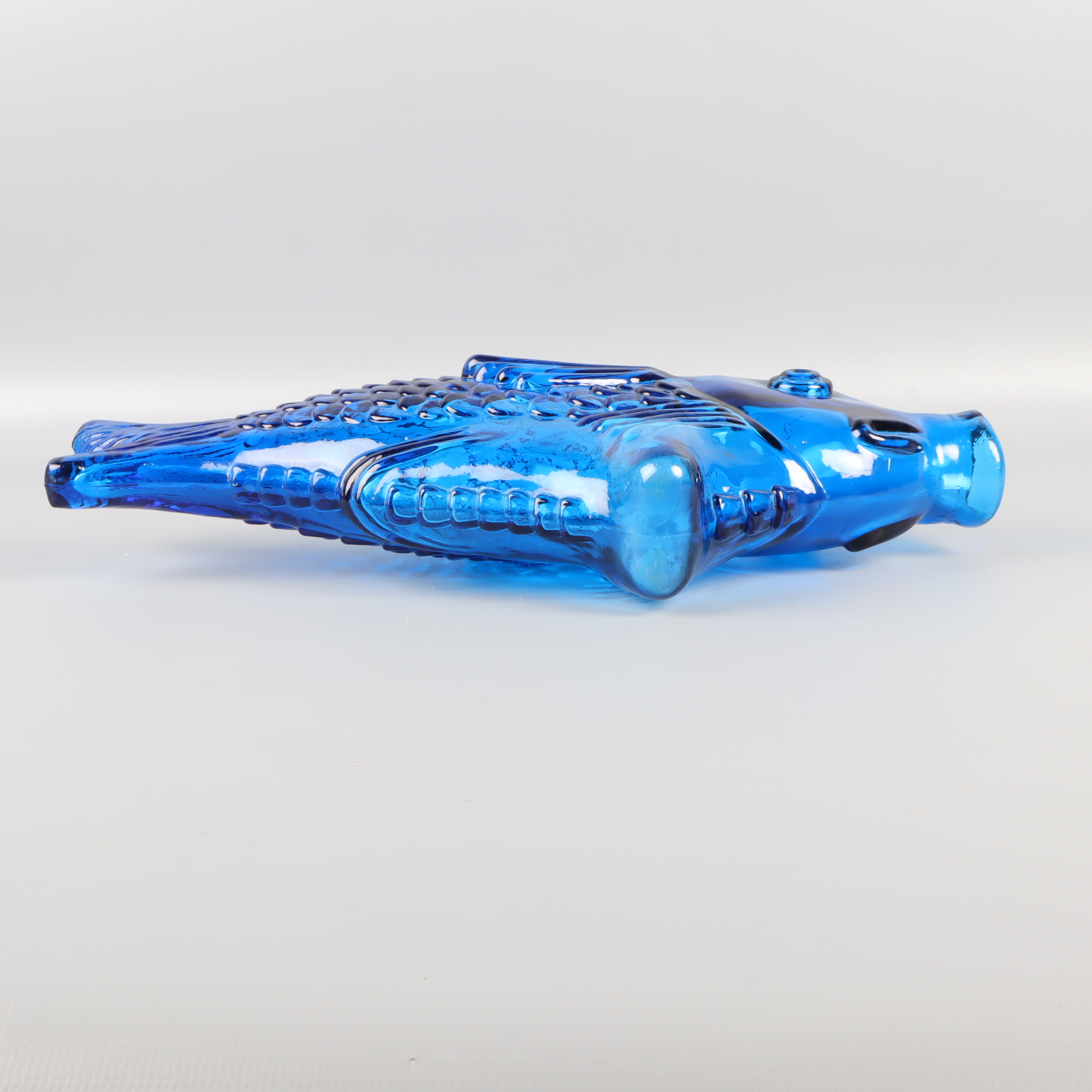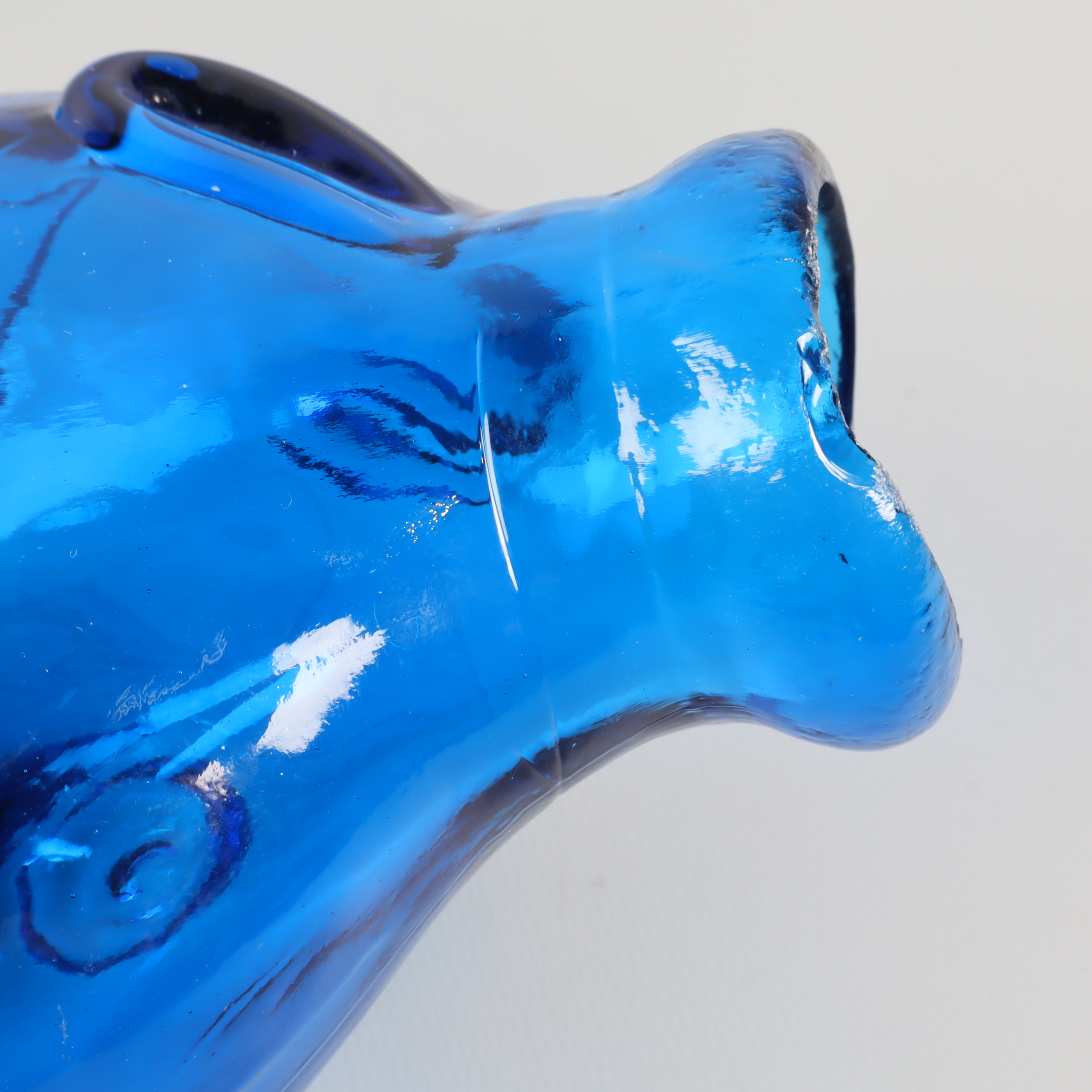 En blå fiskformad vas eller flaska i glas med detaljerat mönster och lekfull design. Passar perfekt som dekorationsdetalj och skapar en färgstark accent i vilket rum som helst. Har konstglas-känsla och ger en unik touch till din inredning. Munnen har ett nagg på ena sidan, se bild 7
