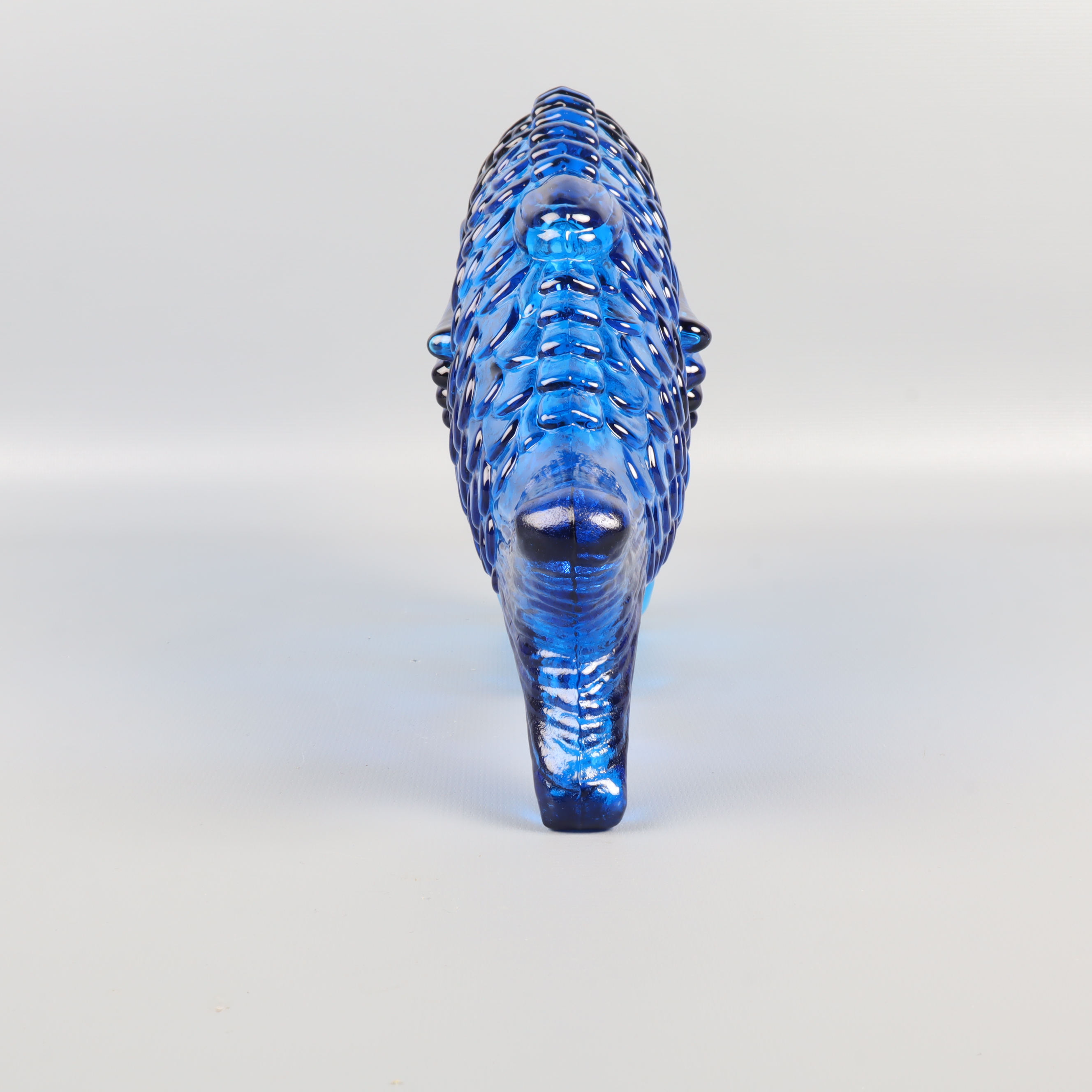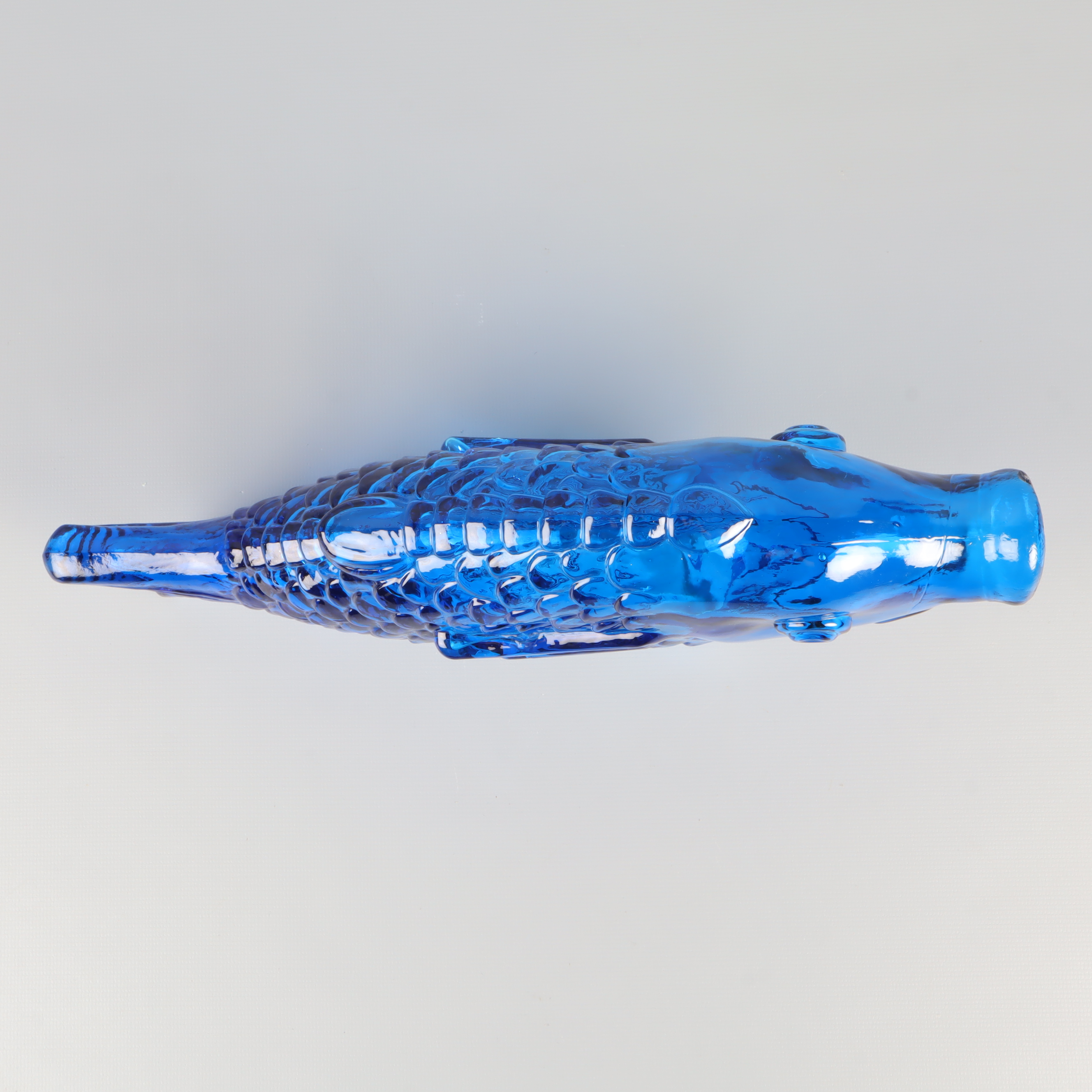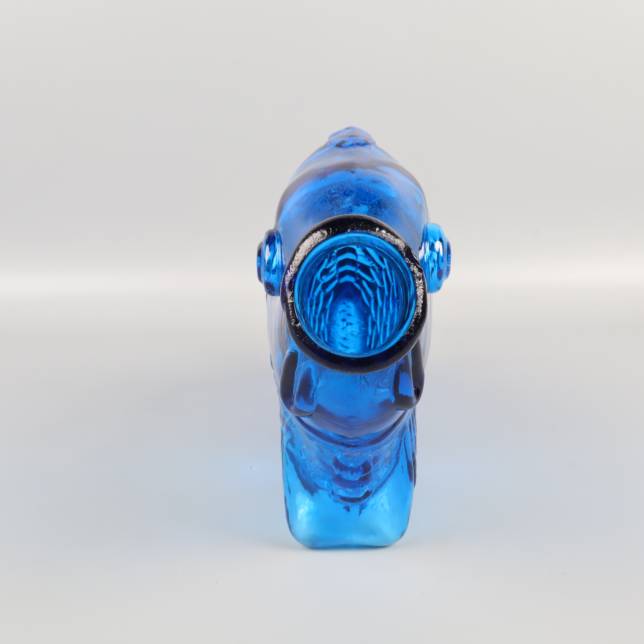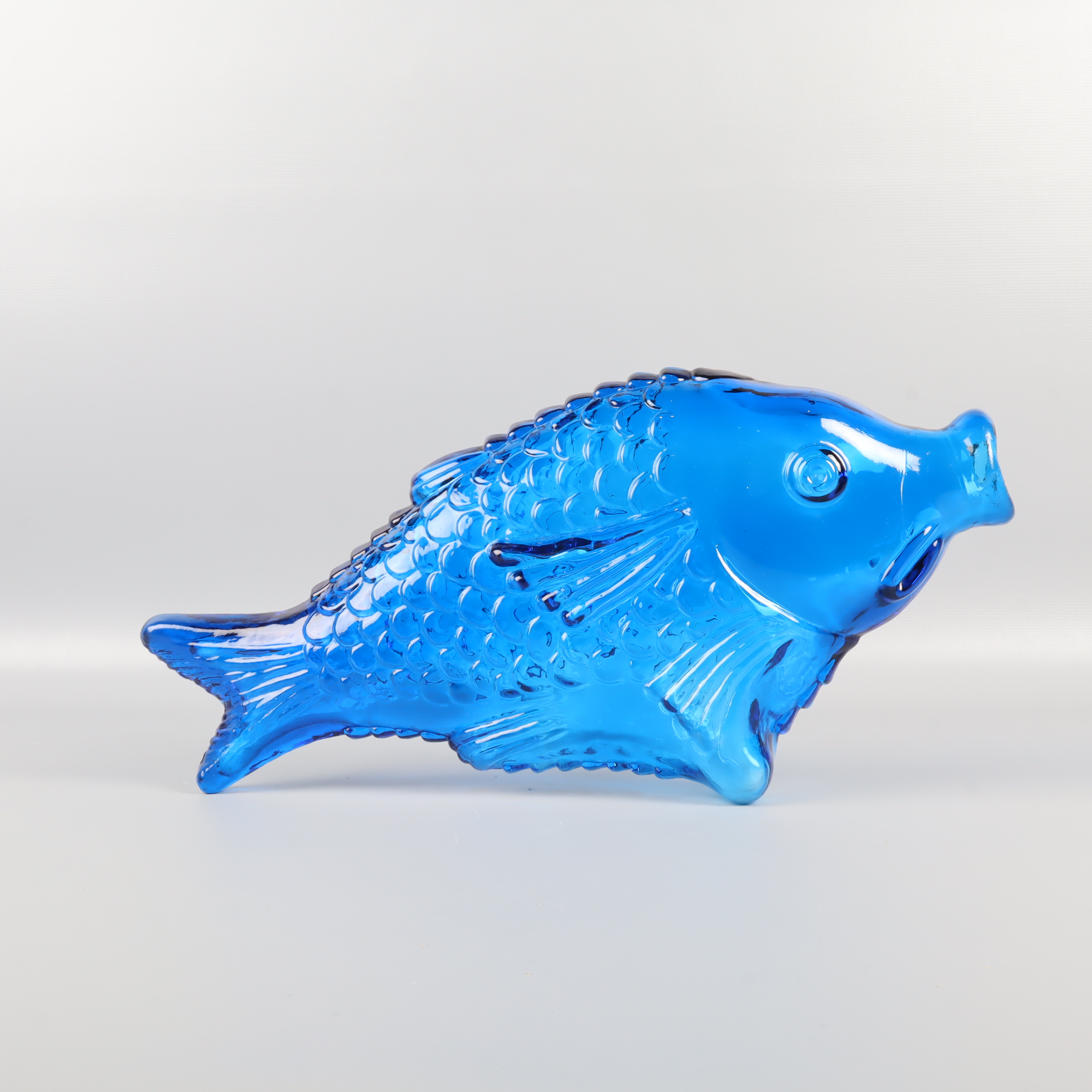 En blå fiskformad vas eller flaska i glas med detaljerat mönster och lekfull design. Passar perfekt som dekorationsdetalj och skapar en färgstark accent i vilket rum som helst. Har konstglas-känsla och ger en unik touch till din inredning. Munnen har ett nagg på ena sidan, se bild 7