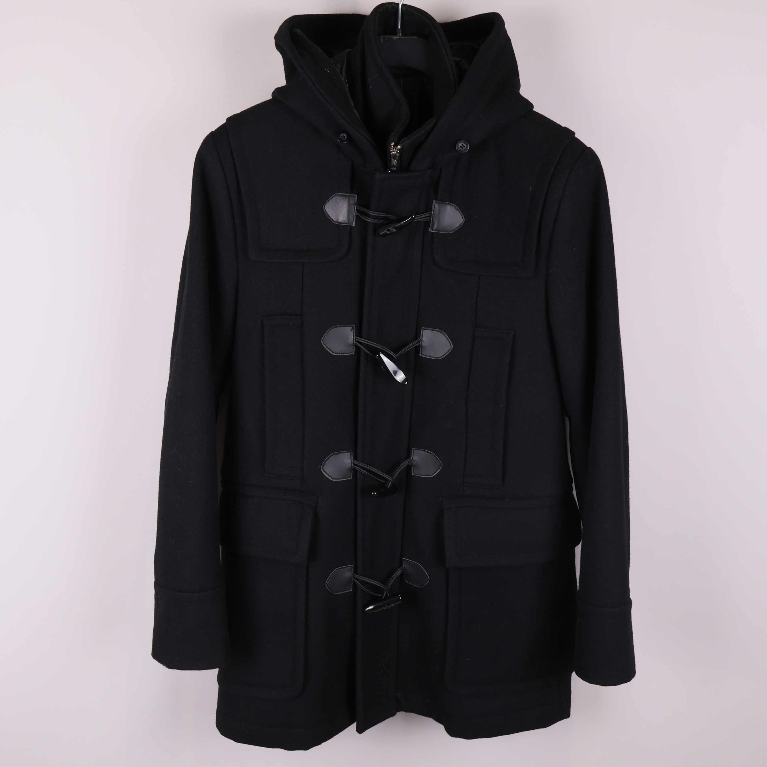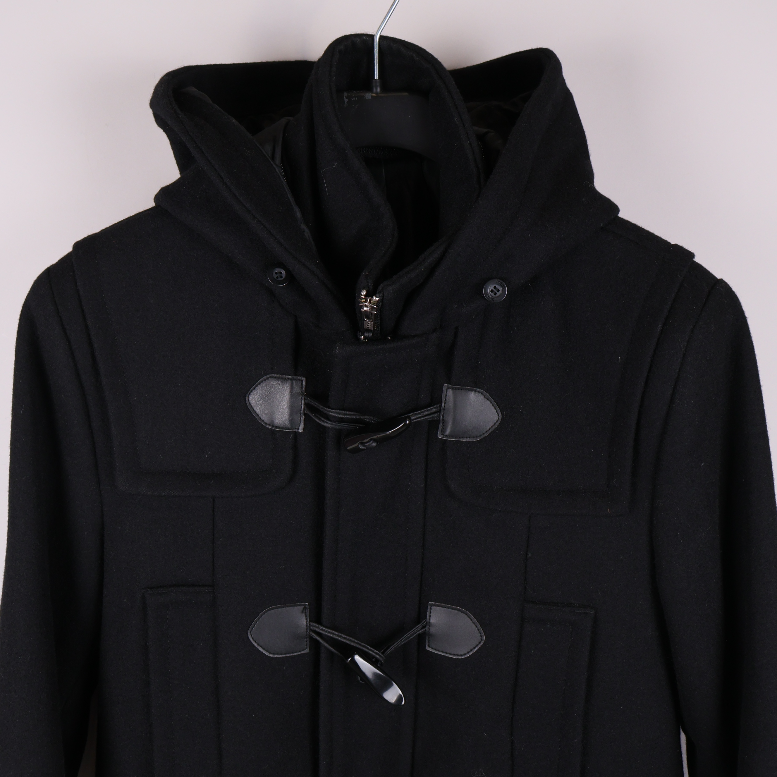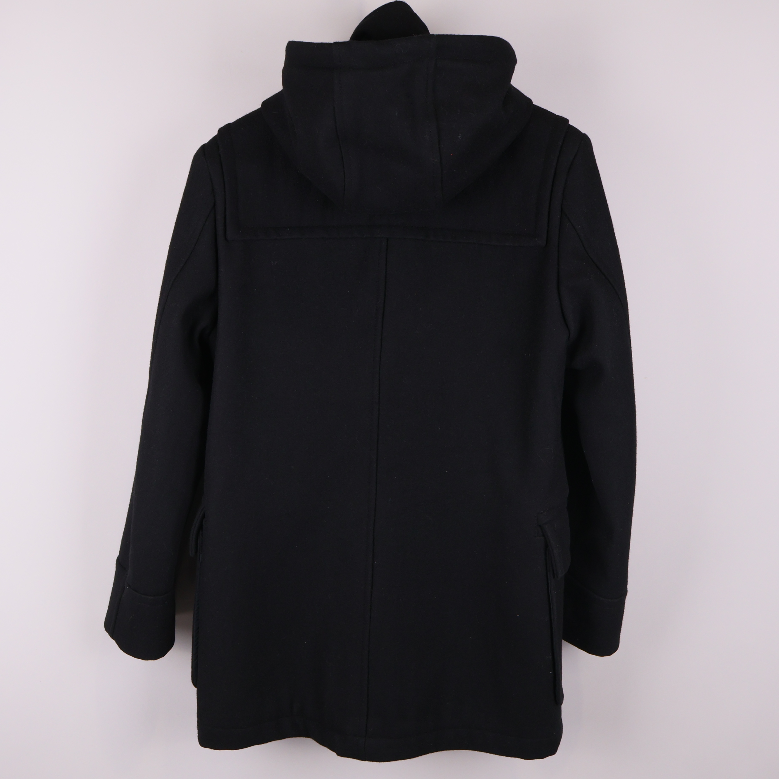 Stilren duffeljacka i svart med huva och klassiska knäppningar framtill. Jackan har flera praktiska fickor och mjukt, quiltat foder för extra komfort.