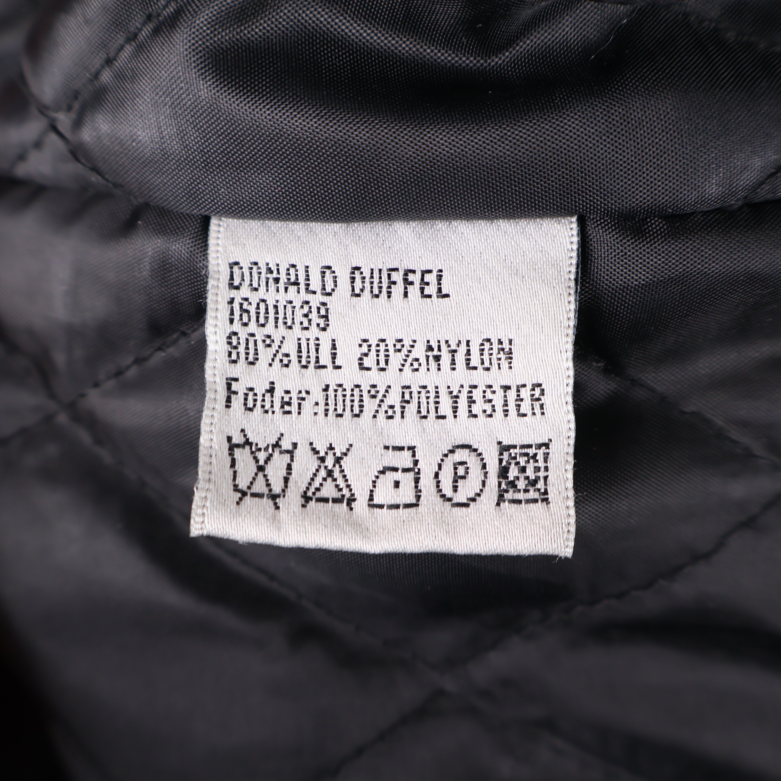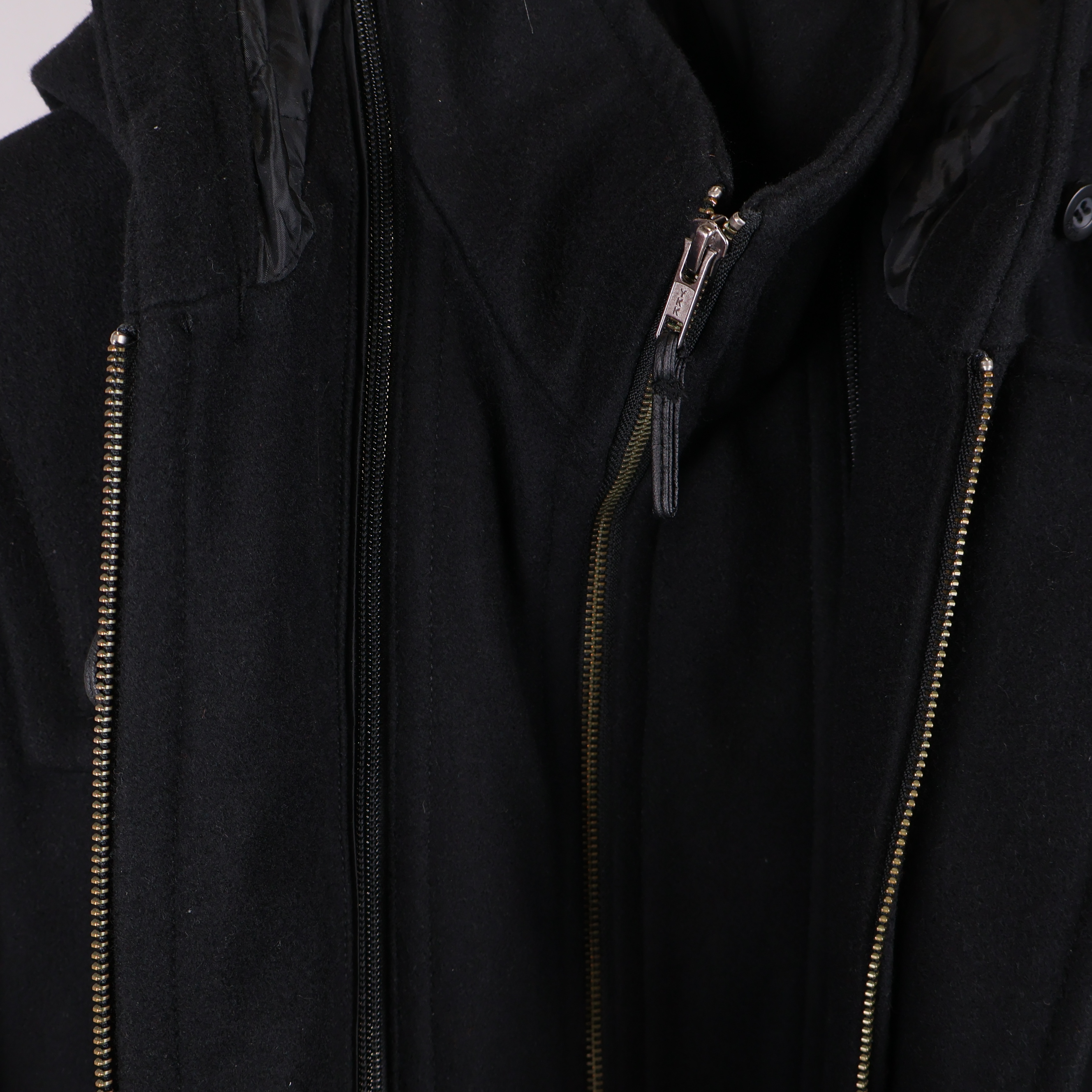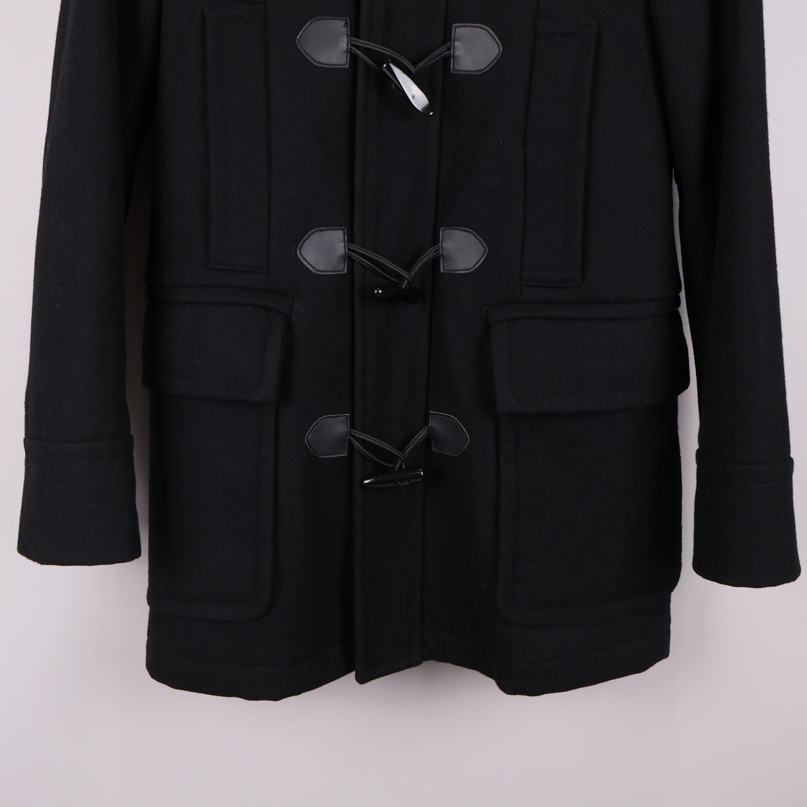 Stilren duffeljacka i svart med huva och klassiska knäppningar framtill. Jackan har flera praktiska fickor och mjukt, quiltat foder för extra komfort.