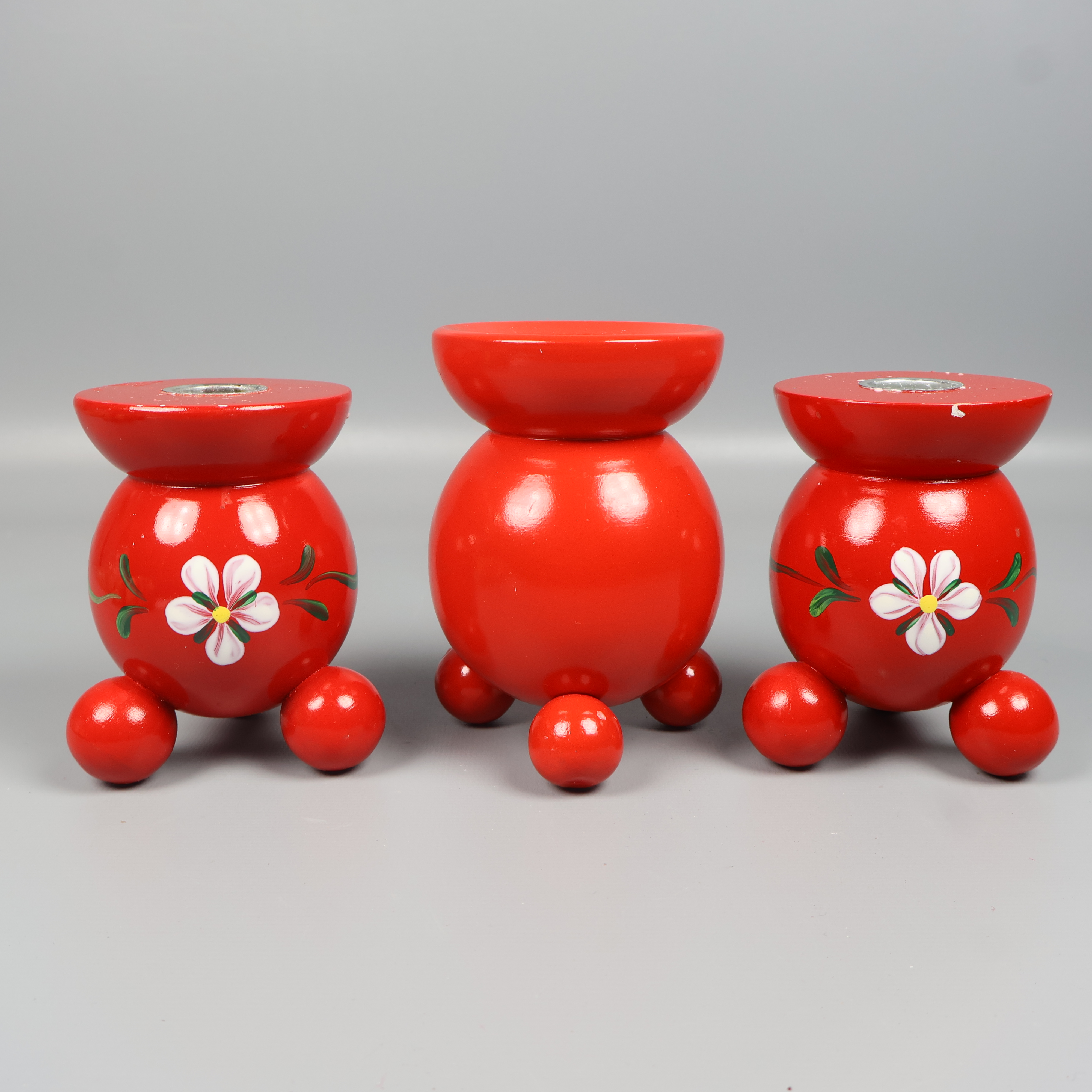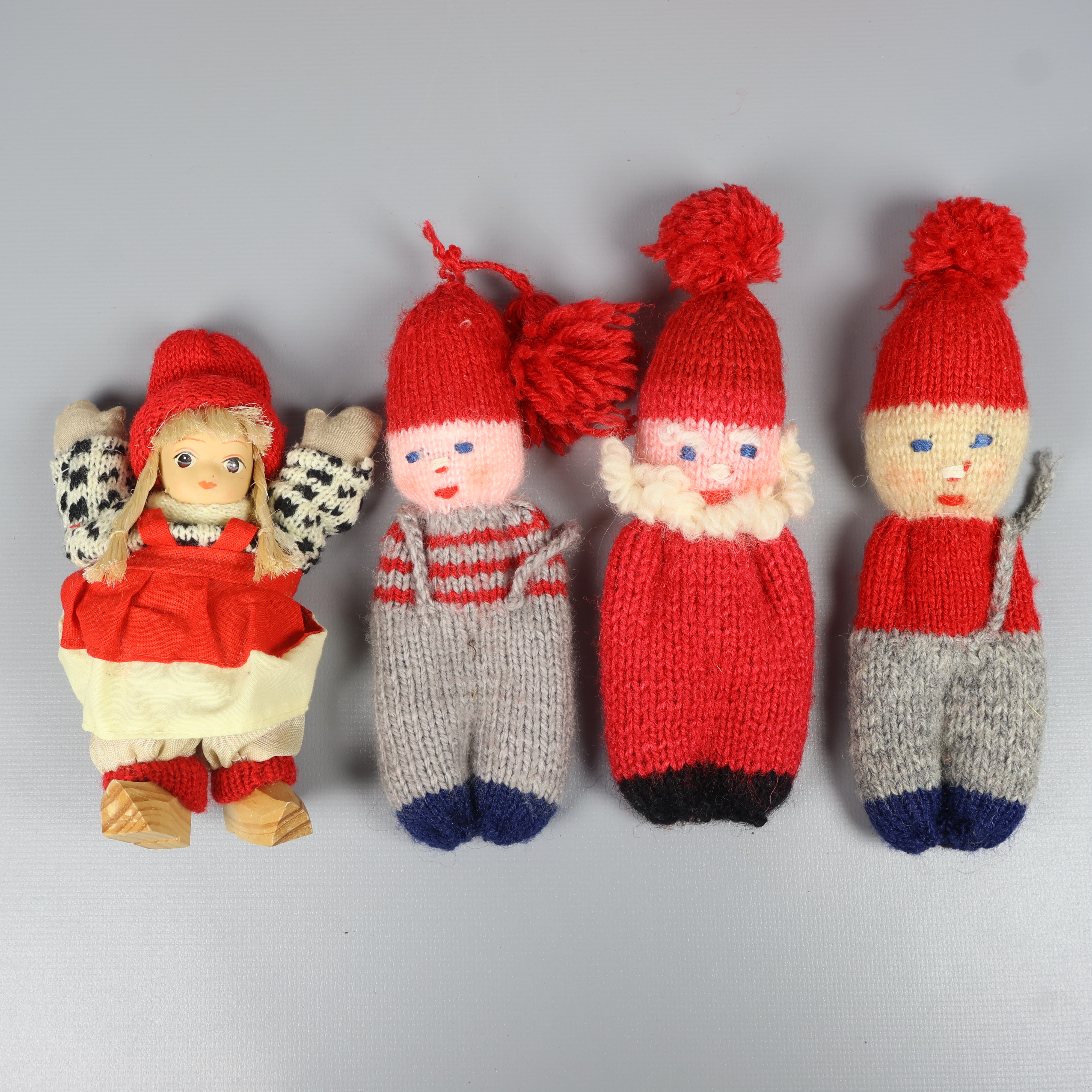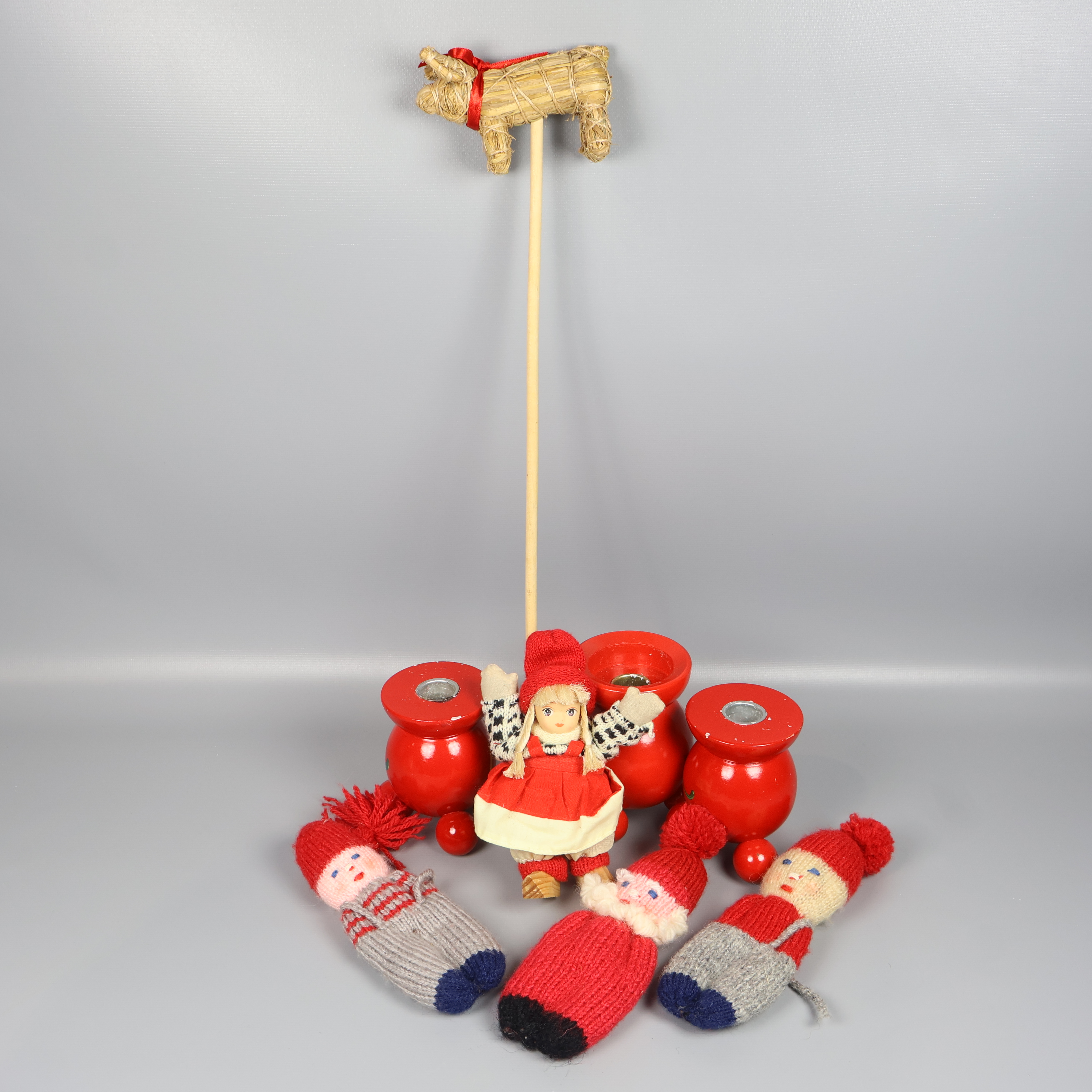 Charmigt set med handgjorda juldekorationer, inklusive stickade tomtar, halmbock på pinne och röda ljusstakar i trä med blommönster. Skön vintage vibe och lekfull design som ger extra värme till julpyntet. Perfekt för dig som gillar personlig och traditionell känsla.