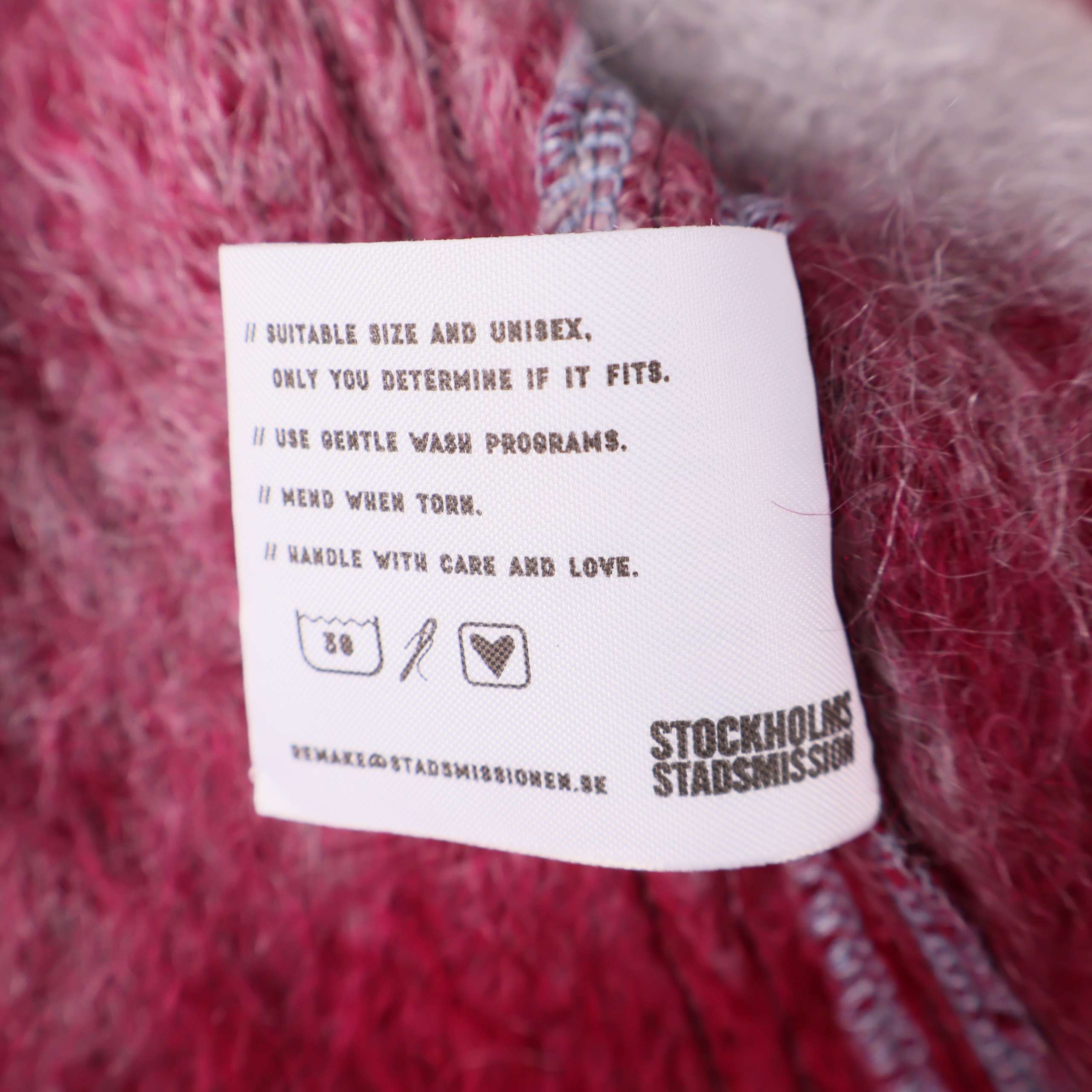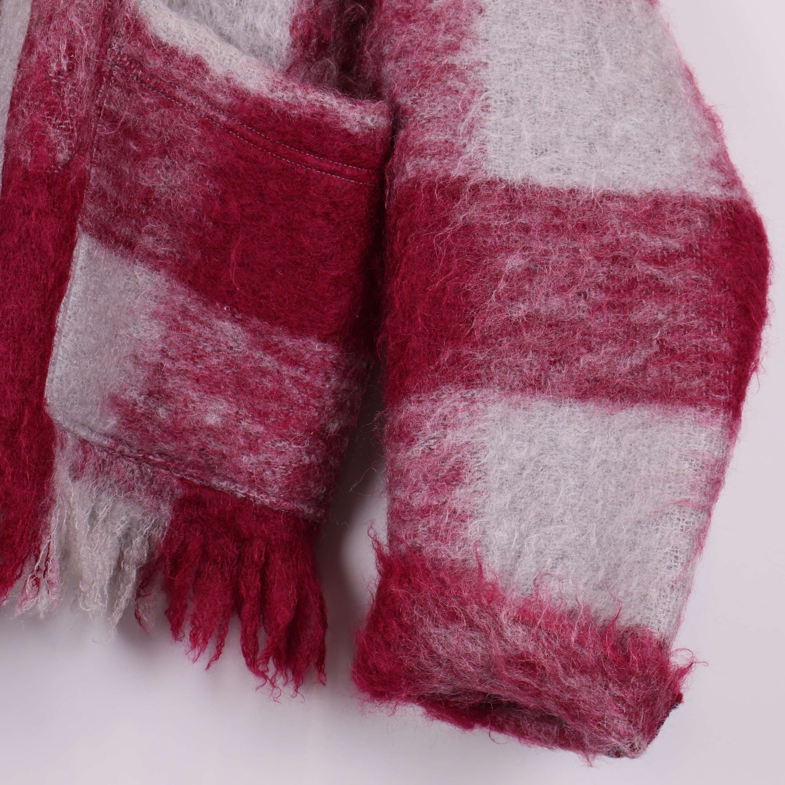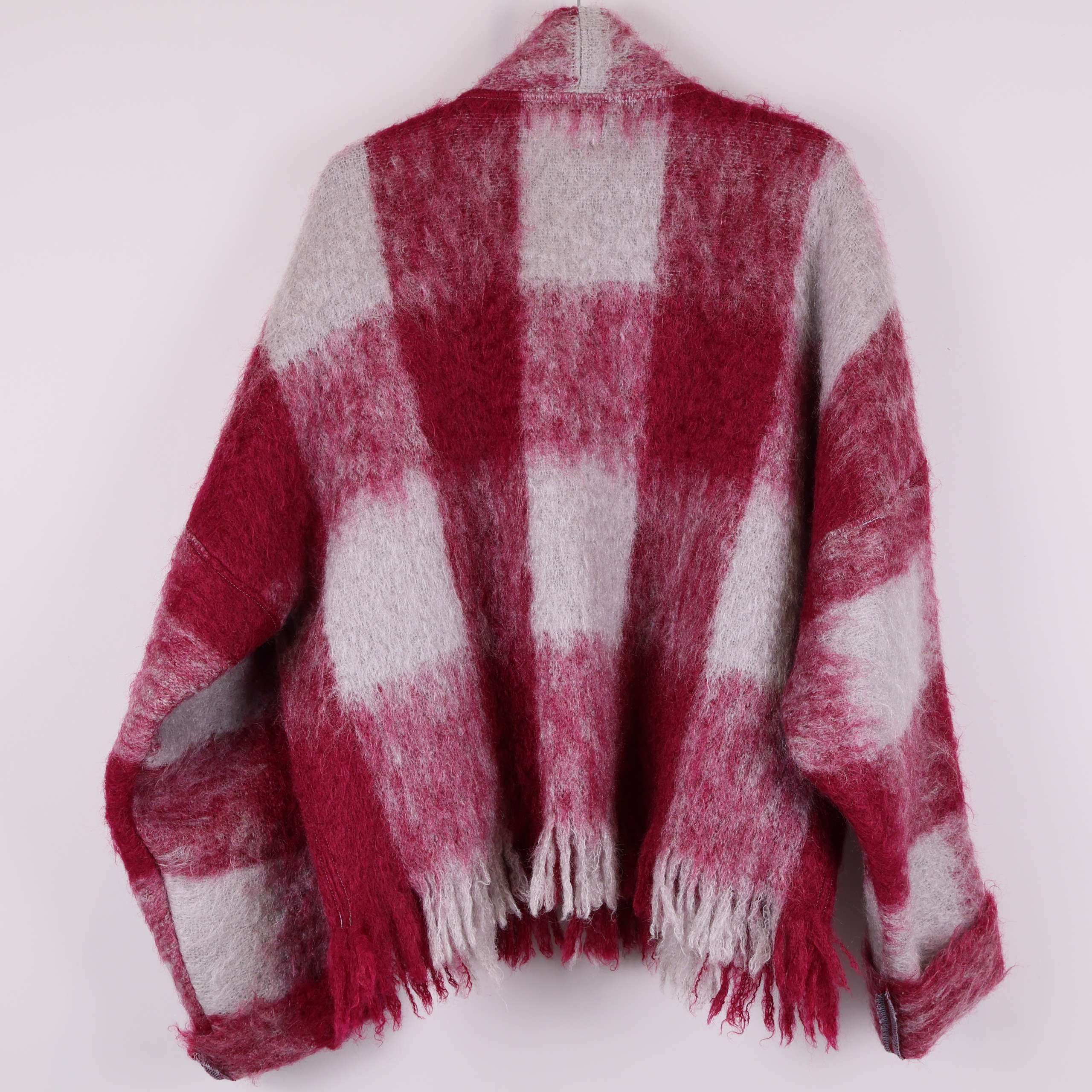 Jacket made from wool blankets donated to Stockholms Stadsmission. The color palette features shades of pink and gray, with the traditional blanket fringe used as the hemline. Each style is carefully cut and sewn to make full use of the blanket’s material. The design is kimono-inspired with two front pockets and long sleeves.