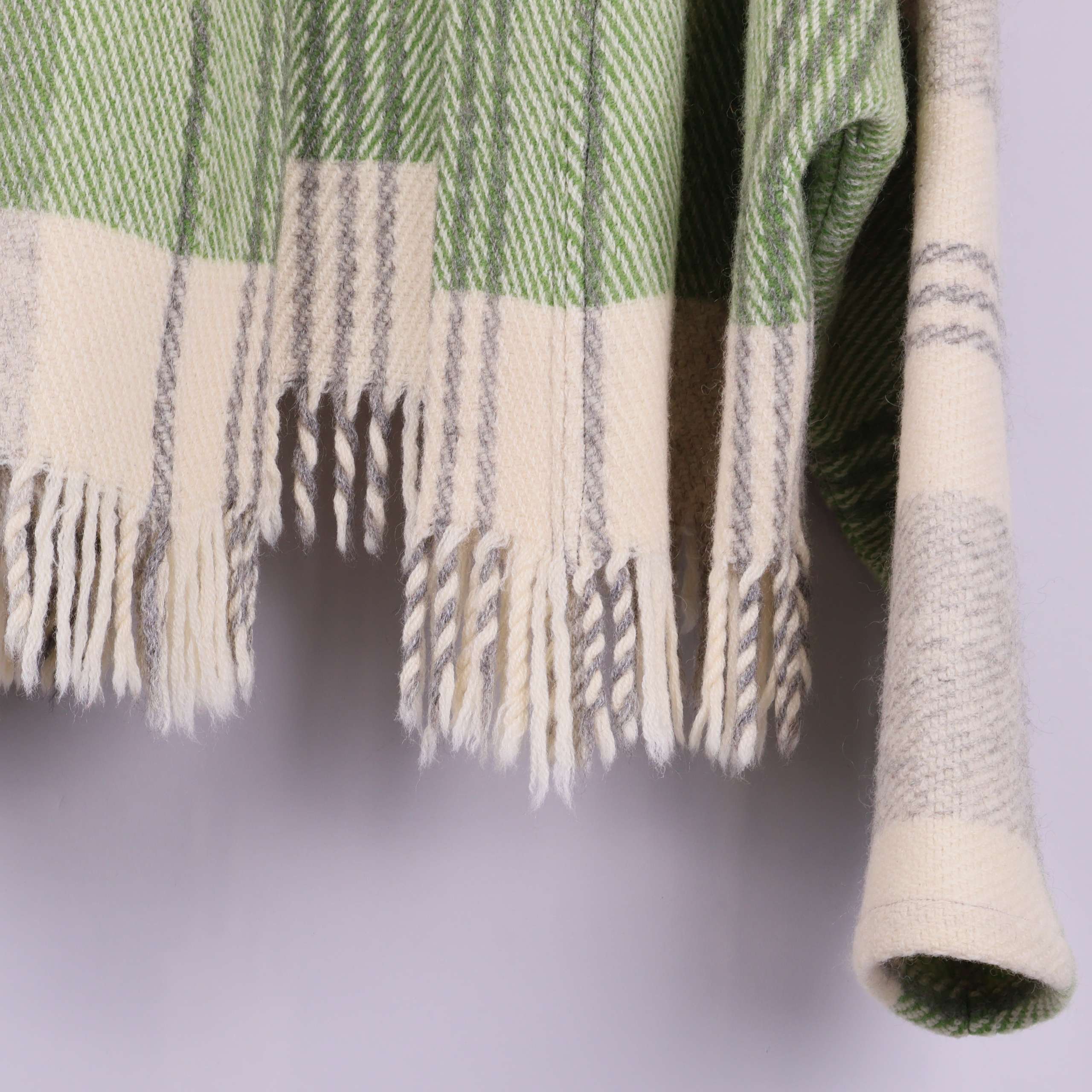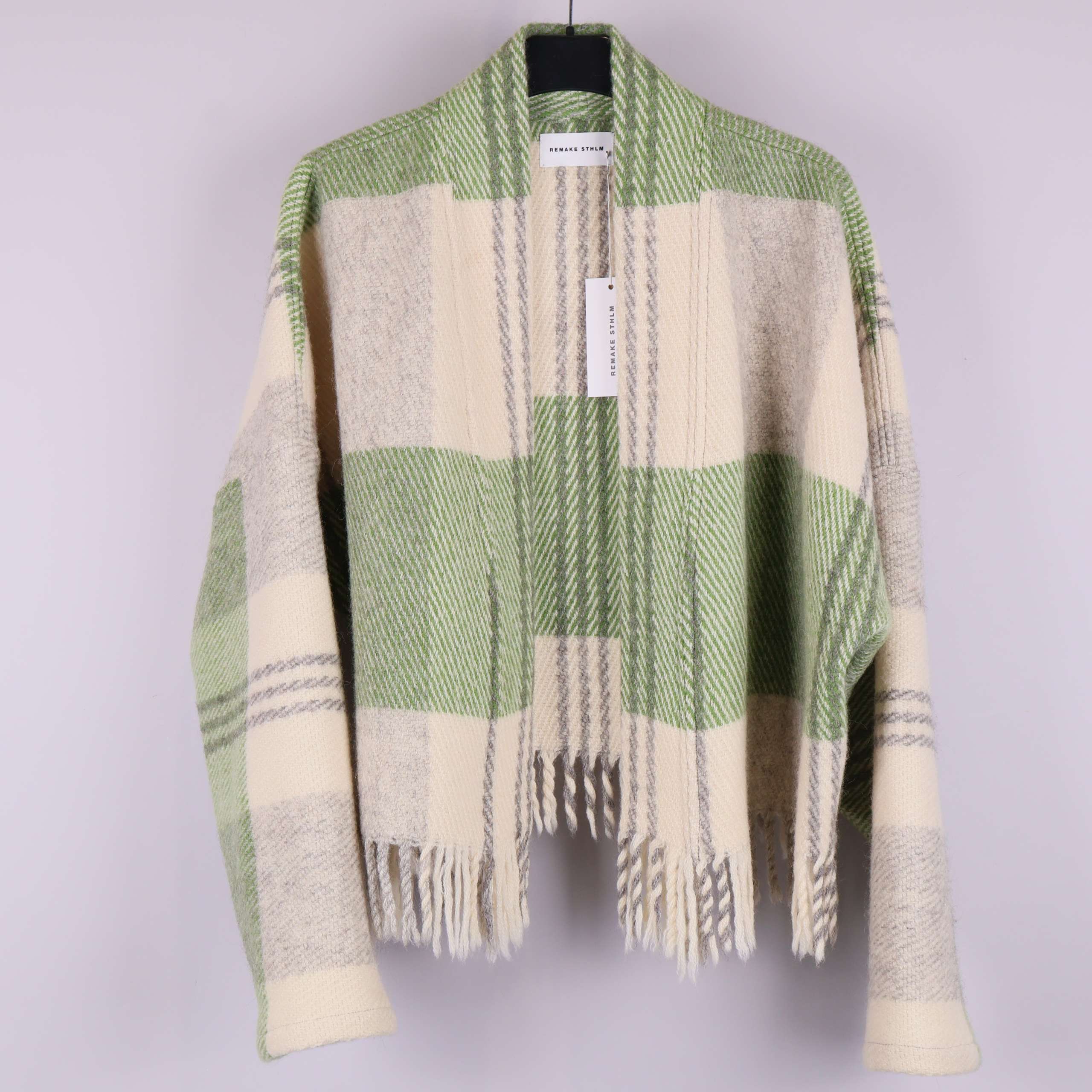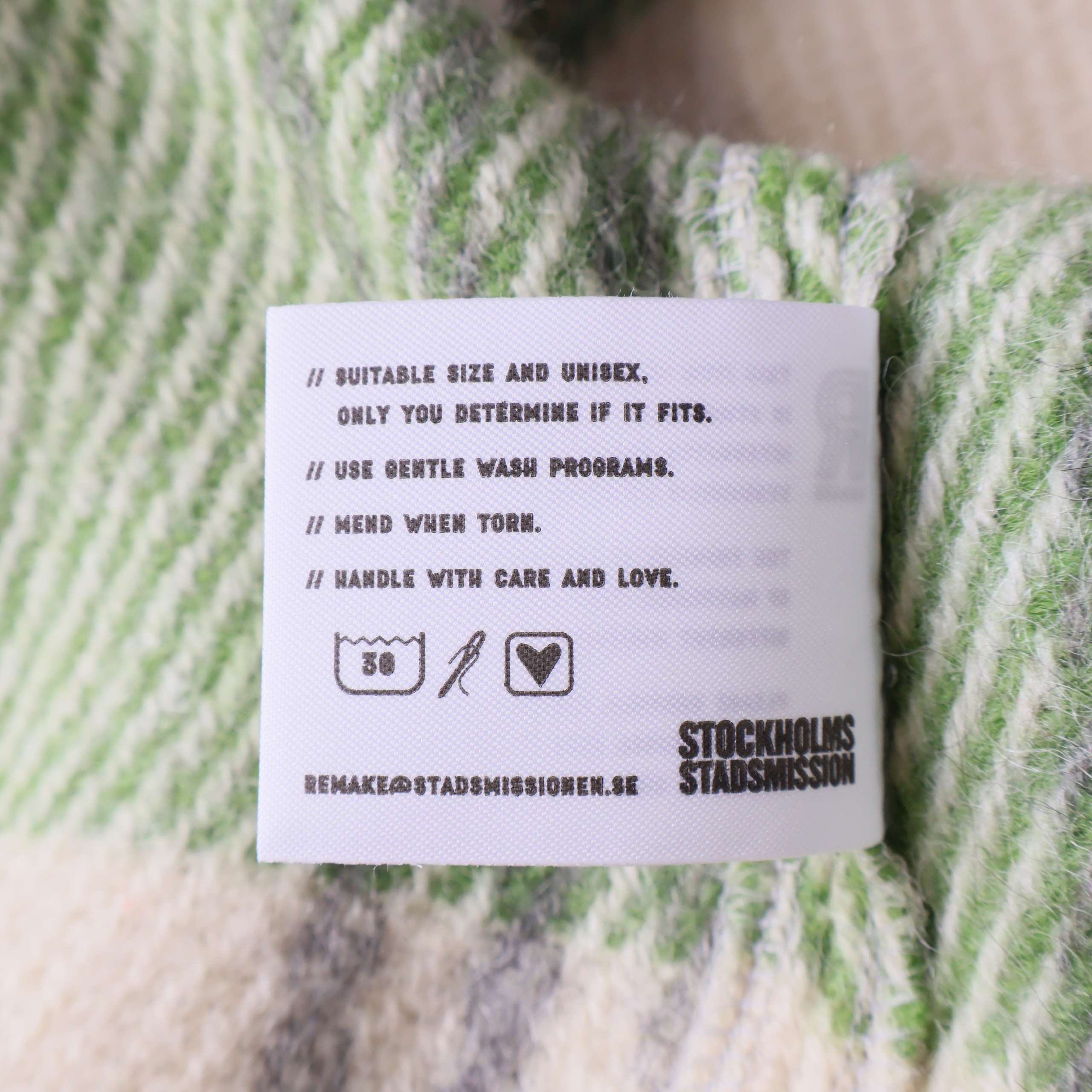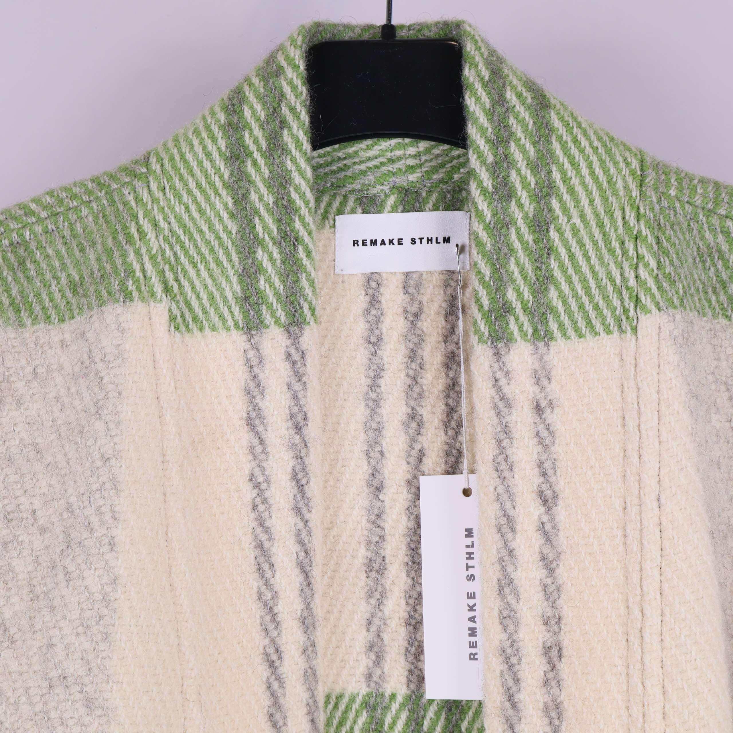 Jacket made from wool blankets donated to Stockholms Stadsmission. The color palette features shades of green, white and gray, with the traditional blanket fringe used as the hemline. Each style is carefully cut and sewn to make full use of the blanket’s material. The design is kimono-inspired.