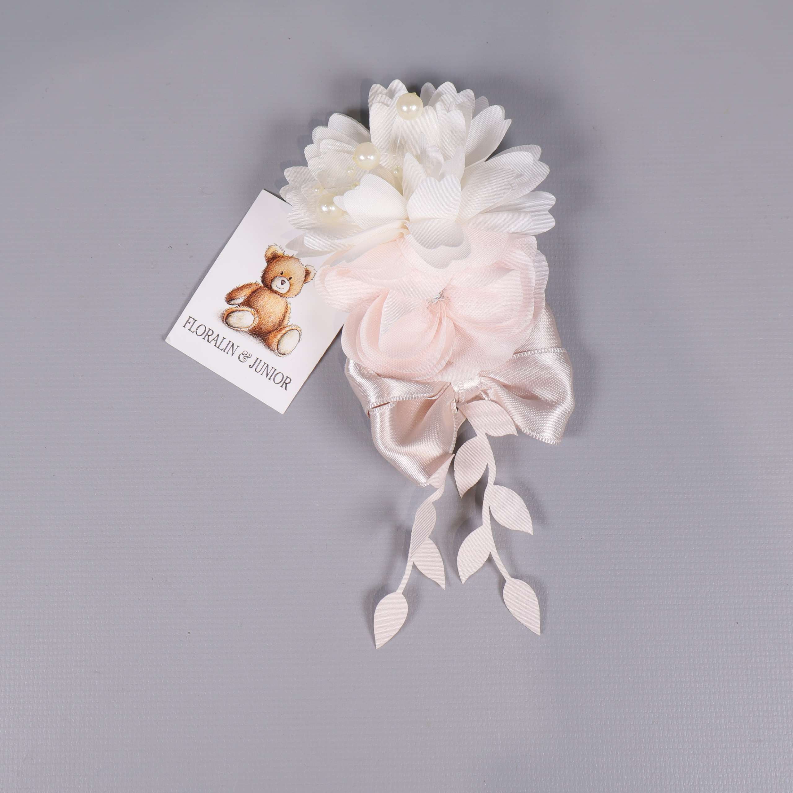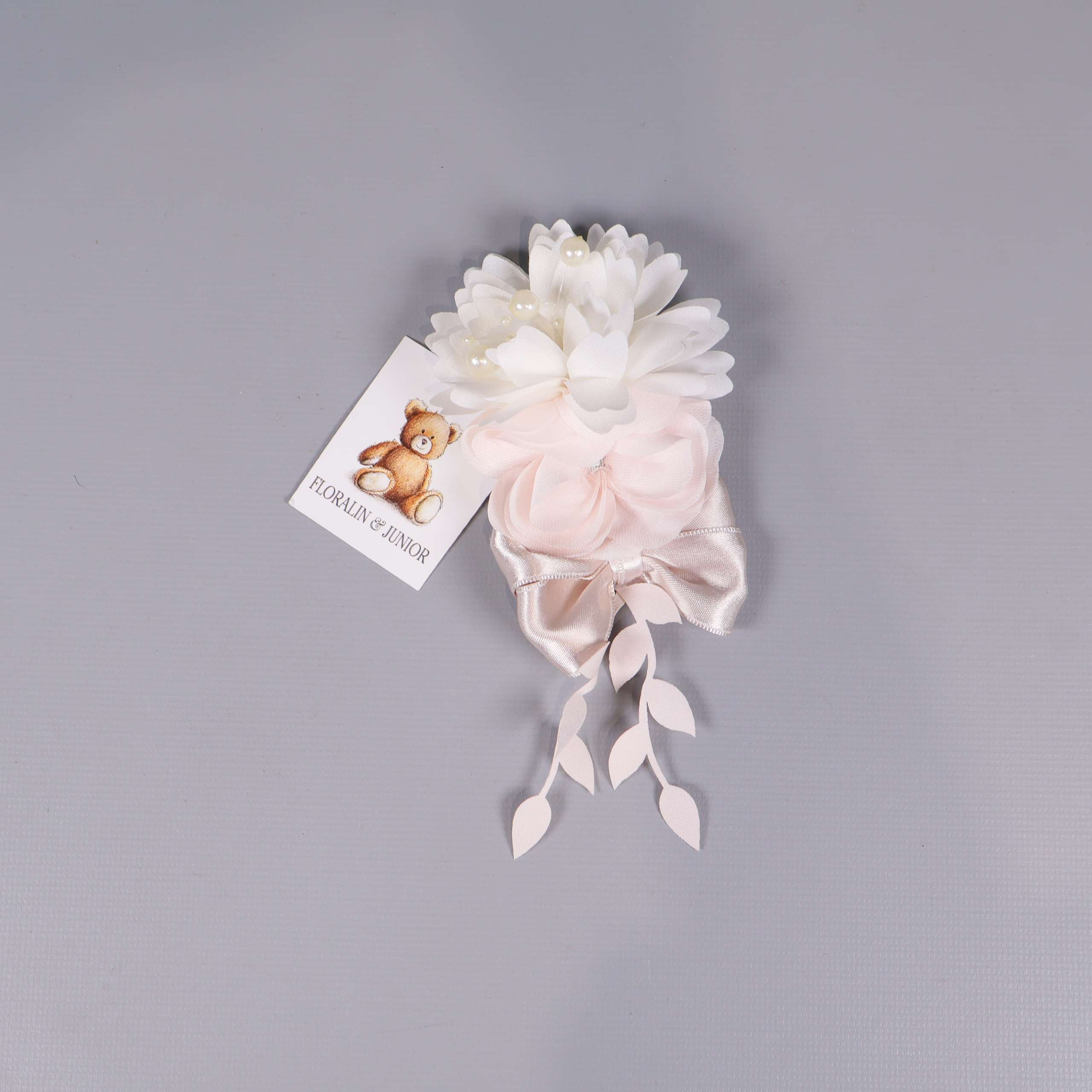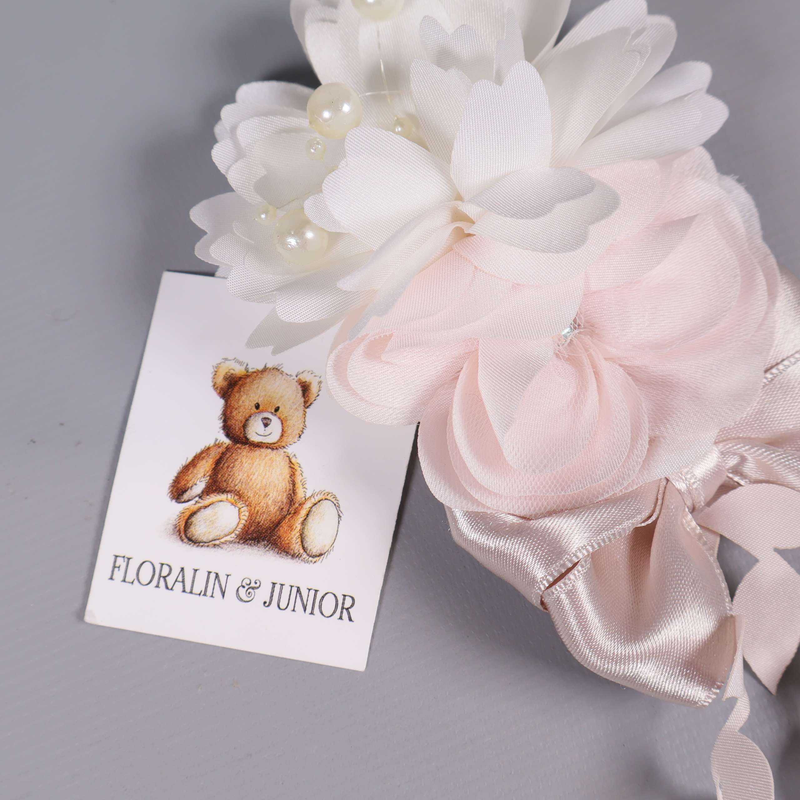 Mått: 8 x 17 cm. OBS! Saknar spänne. Elegant blomdekor med mjuka kronblad i vitt och ljusrosa, dekorerad med pärlor och satinliknande rosett. Långa band med bladformade detaljer skapar en festlig och romantisk känsla, perfekt som accessoar för olika tillfällen. Ger en charmig och dekorativ touch med sin nätta form och harmoniska färgskala.