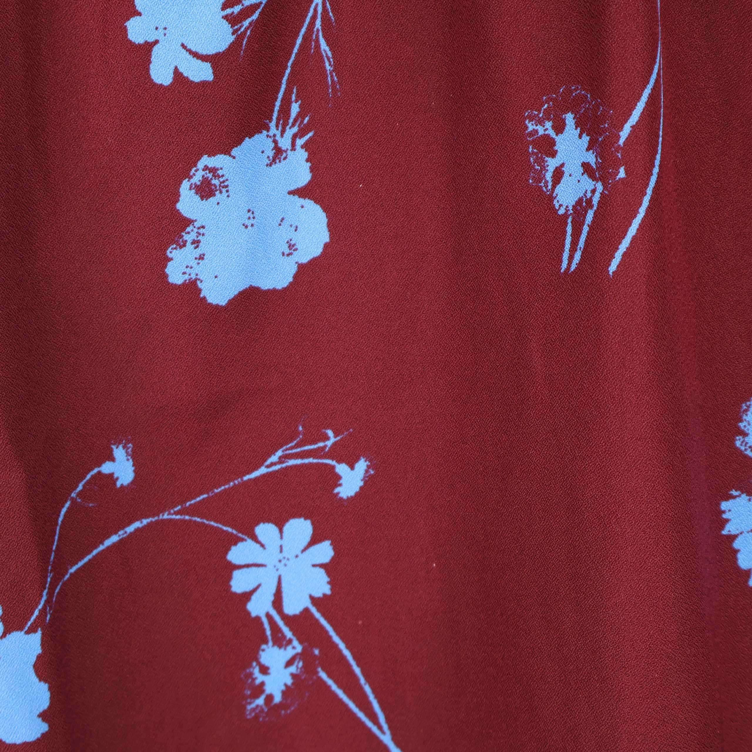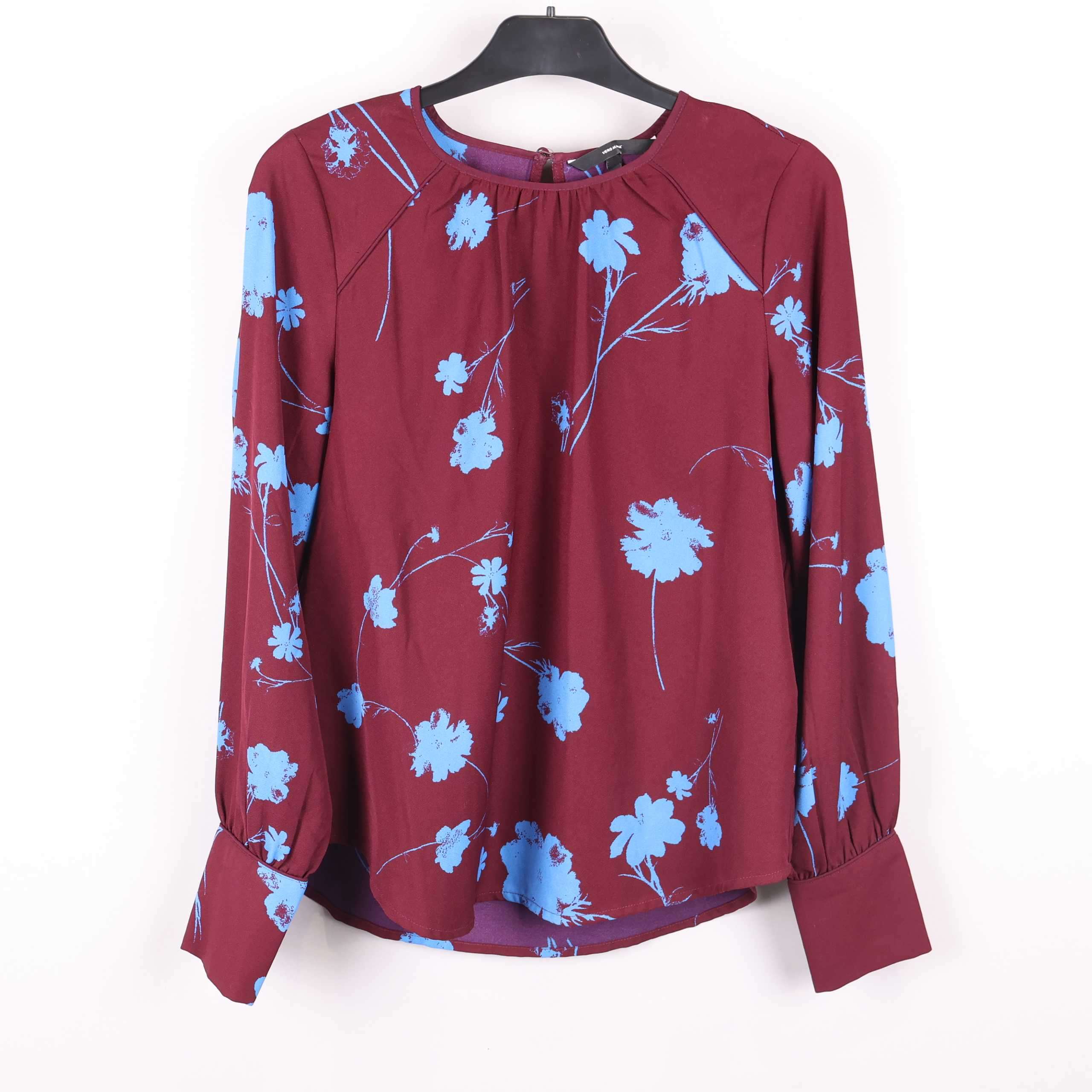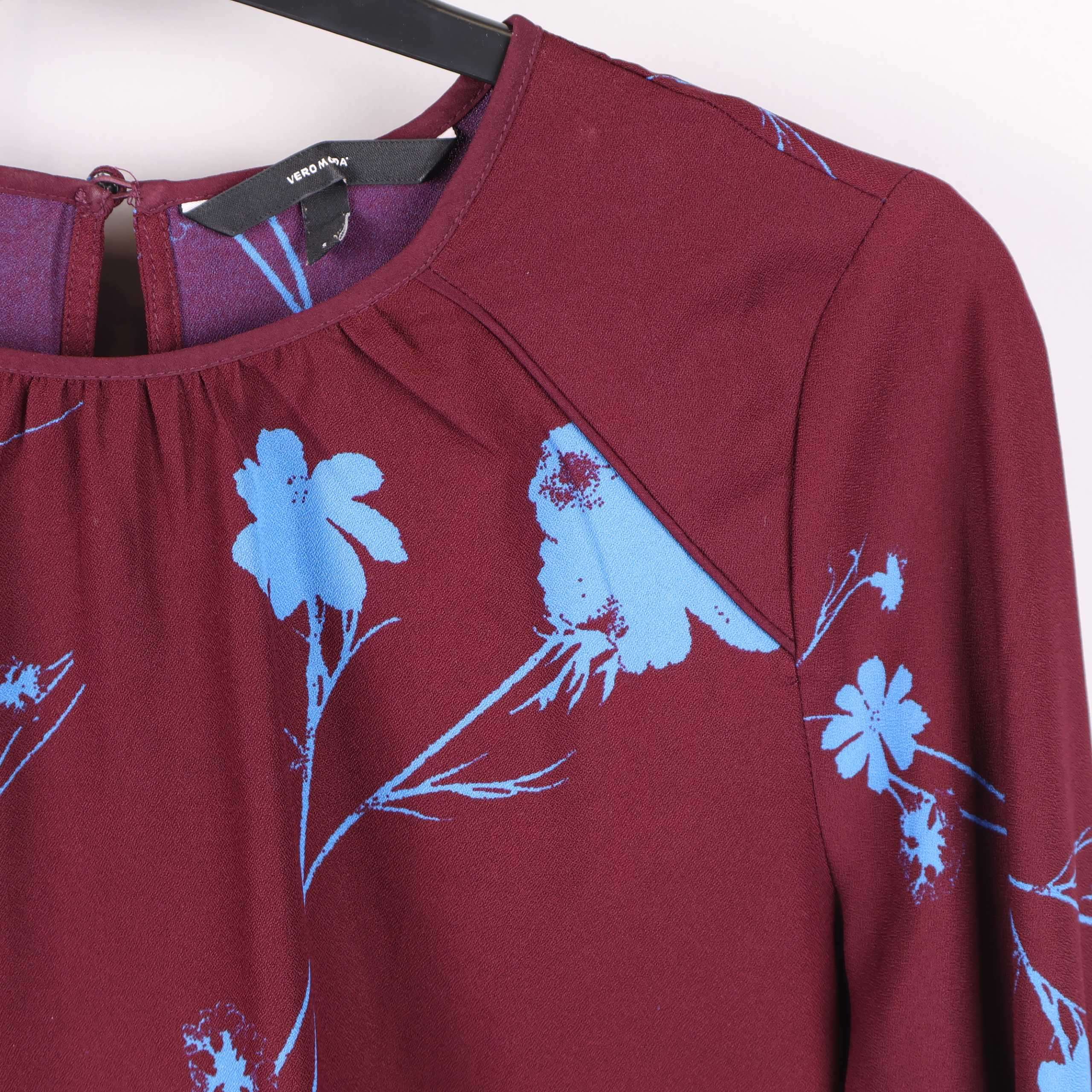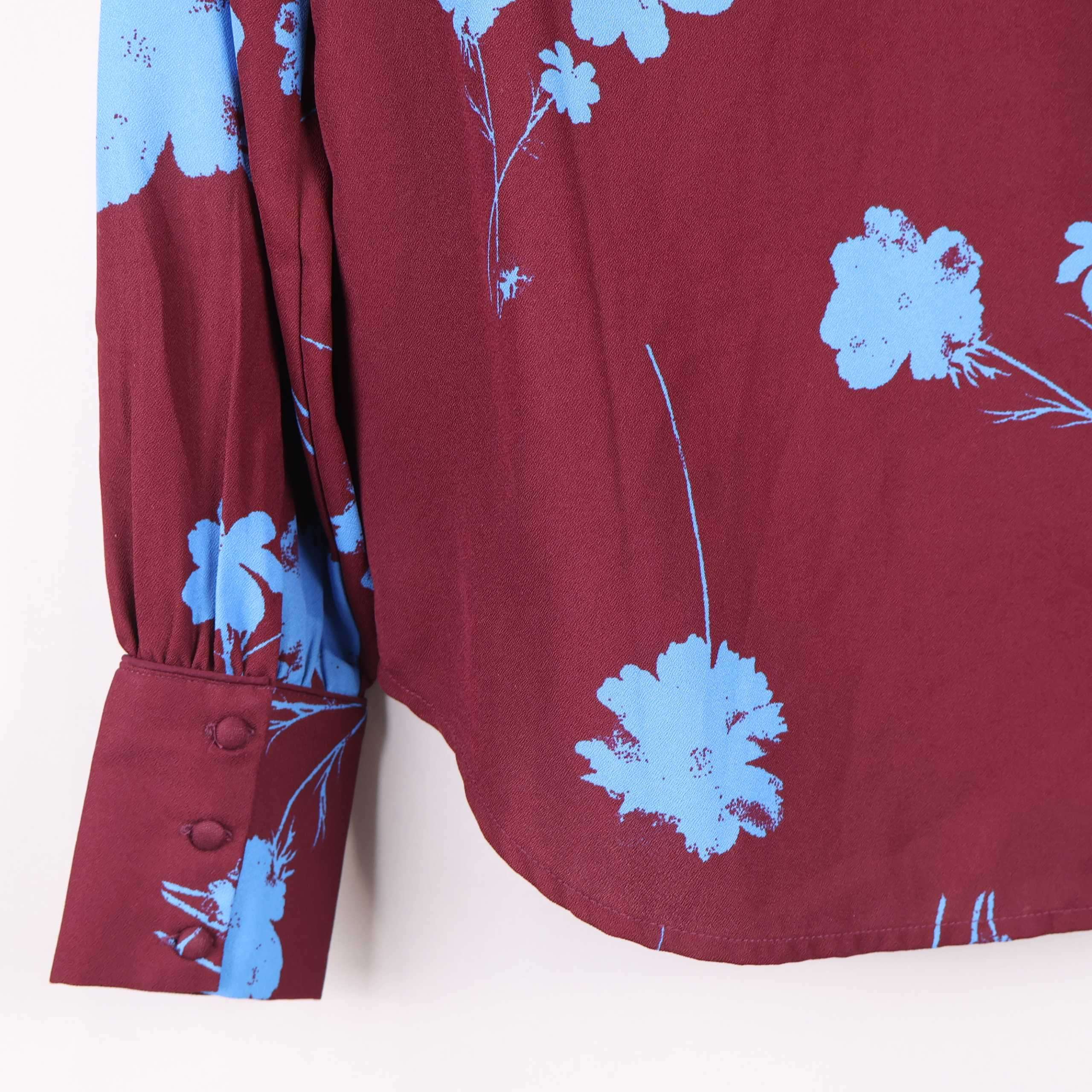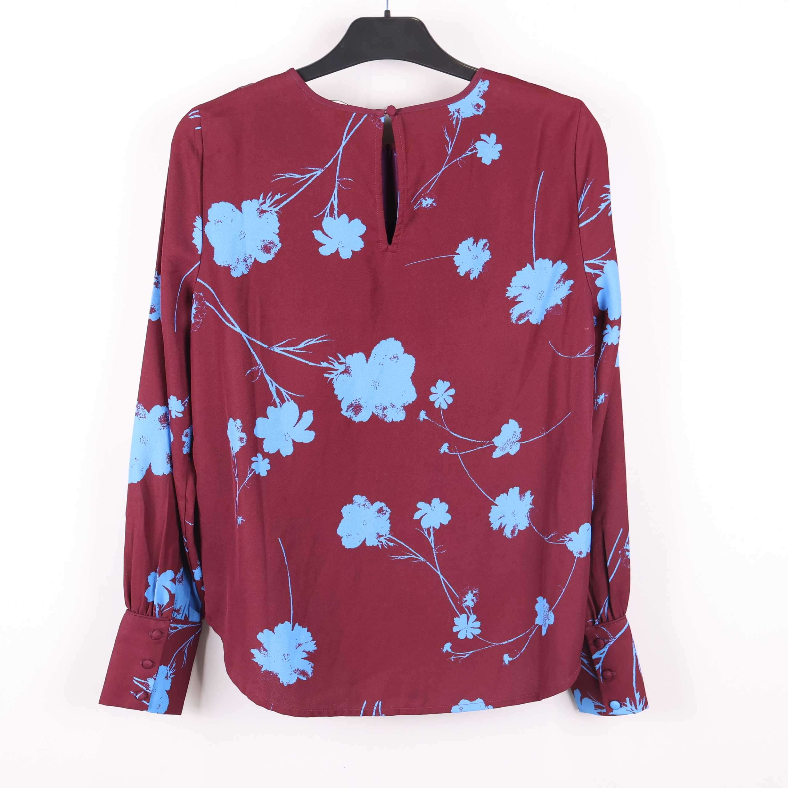 Blus med vinröd botten och blått blommönster som ger en lekfull och modern känsla. Mjukt, lätt material och vida ärmar med manschett och knappar framtill ger en elegant touch. Avslappnad passform med liten urringning och knapp i nacken. Perfekt när du vill addera lite färg och mönster i din garderob.
