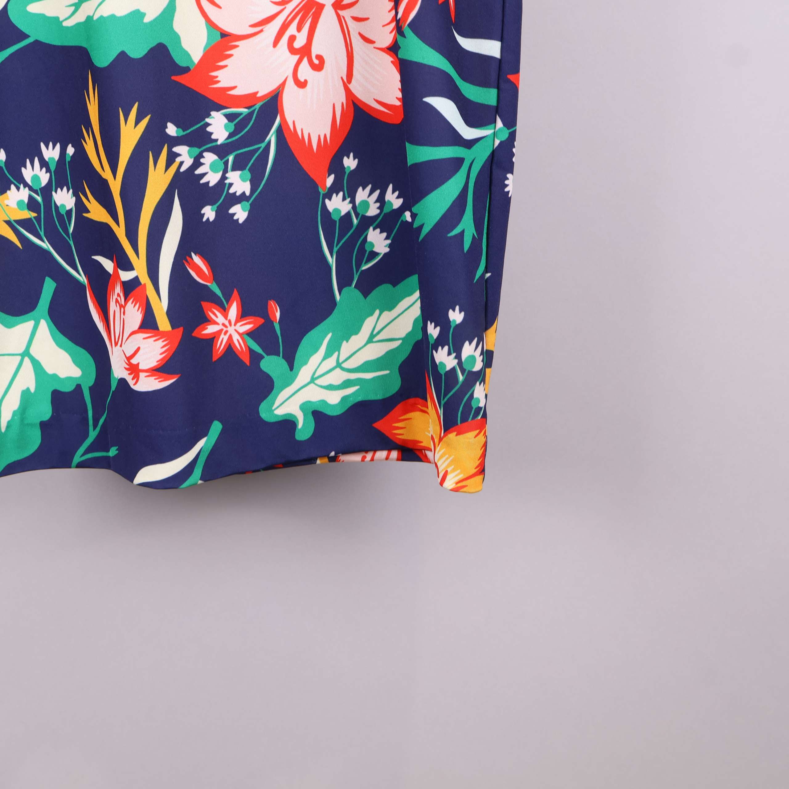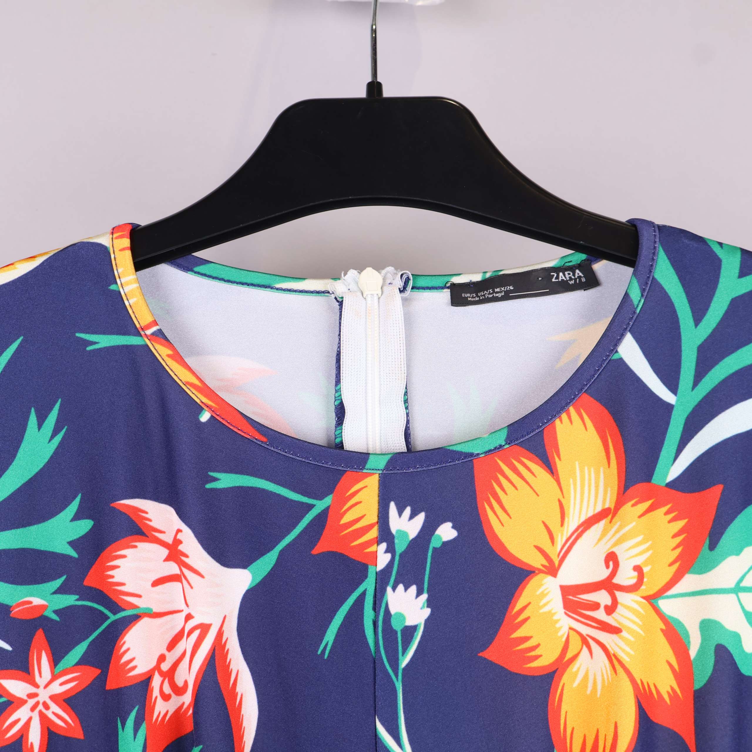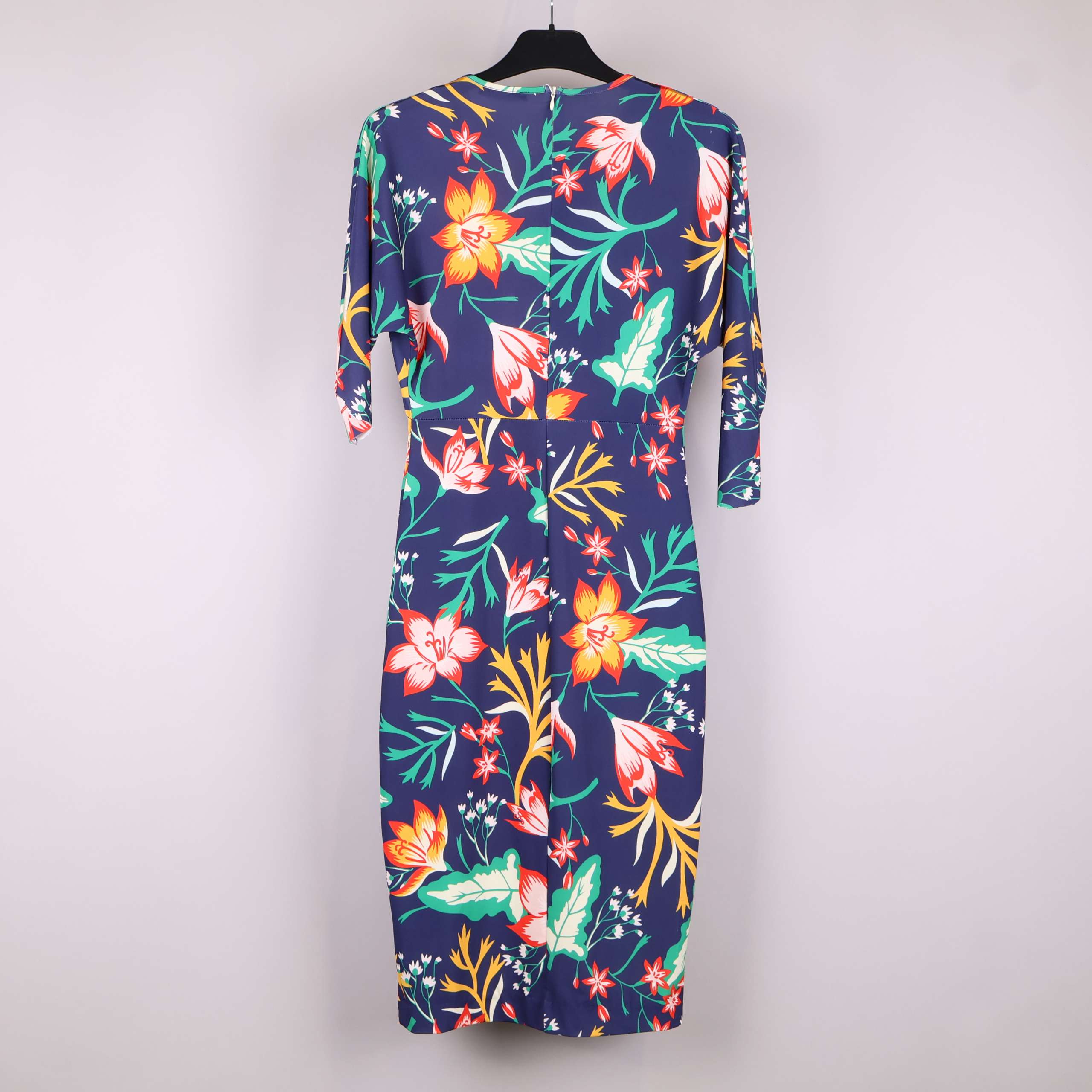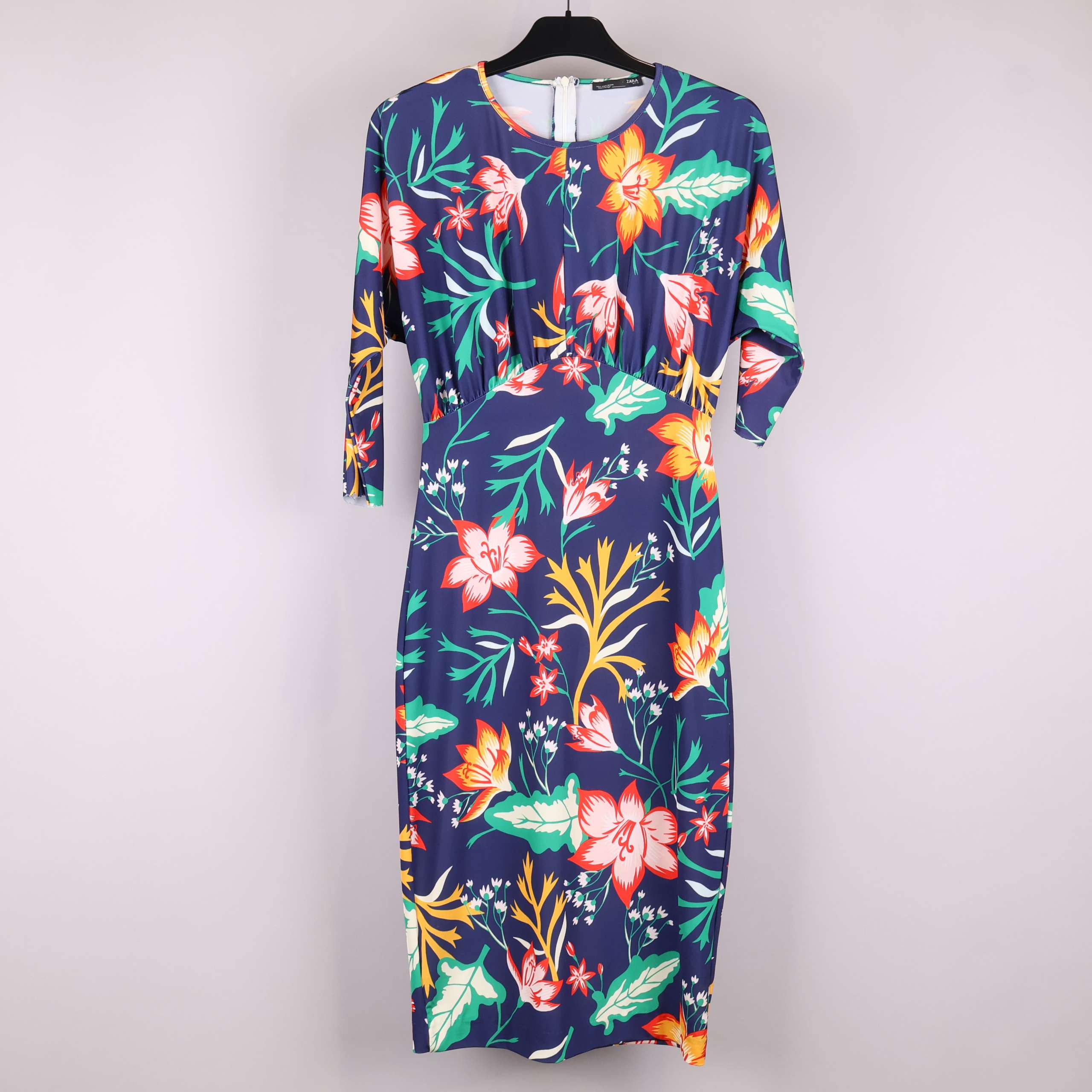 Färgglad klänning med tropiskt blommönster och halvärmade ärmar. Dragkedja i ryggen för enkel påtagning.